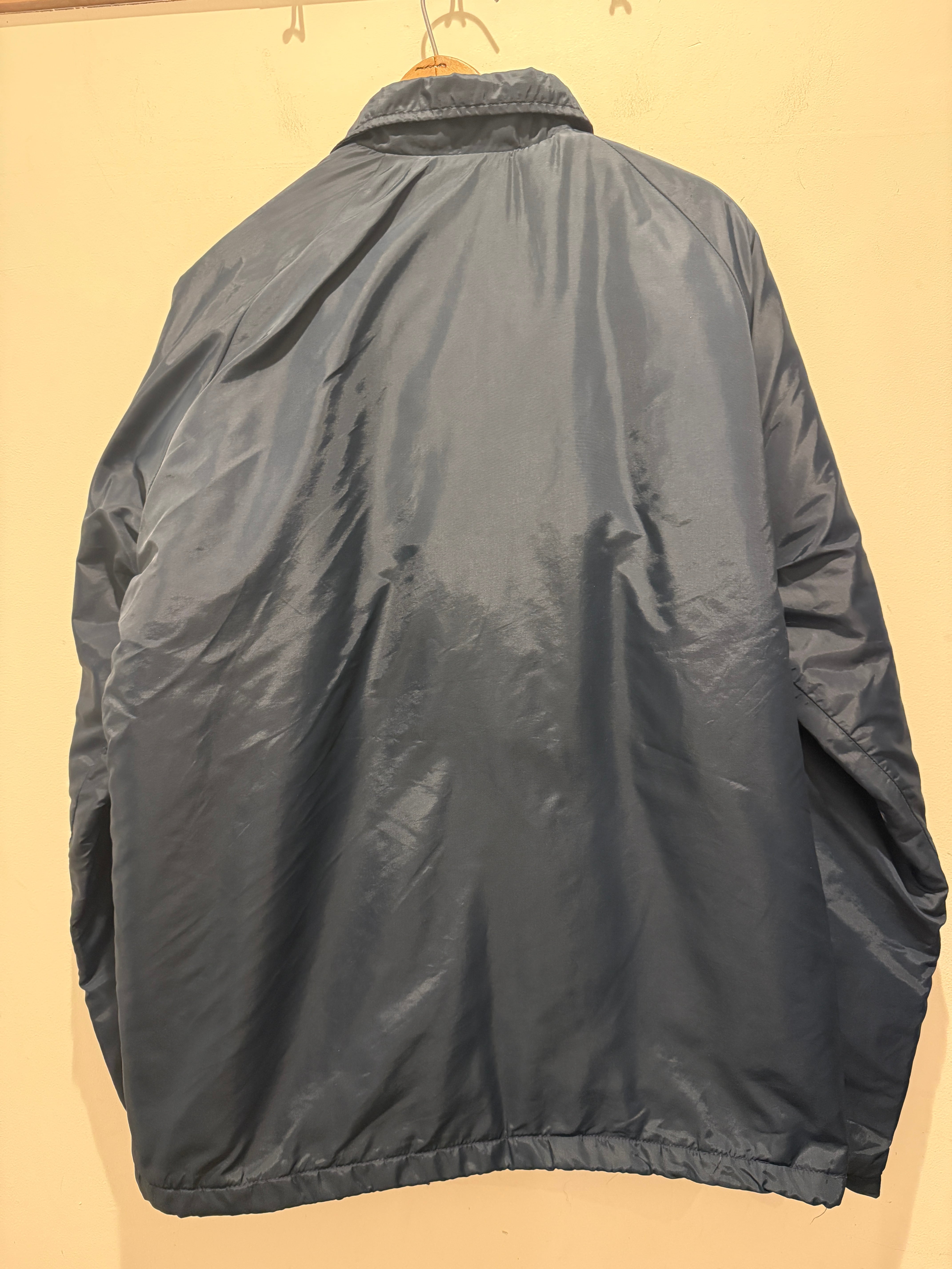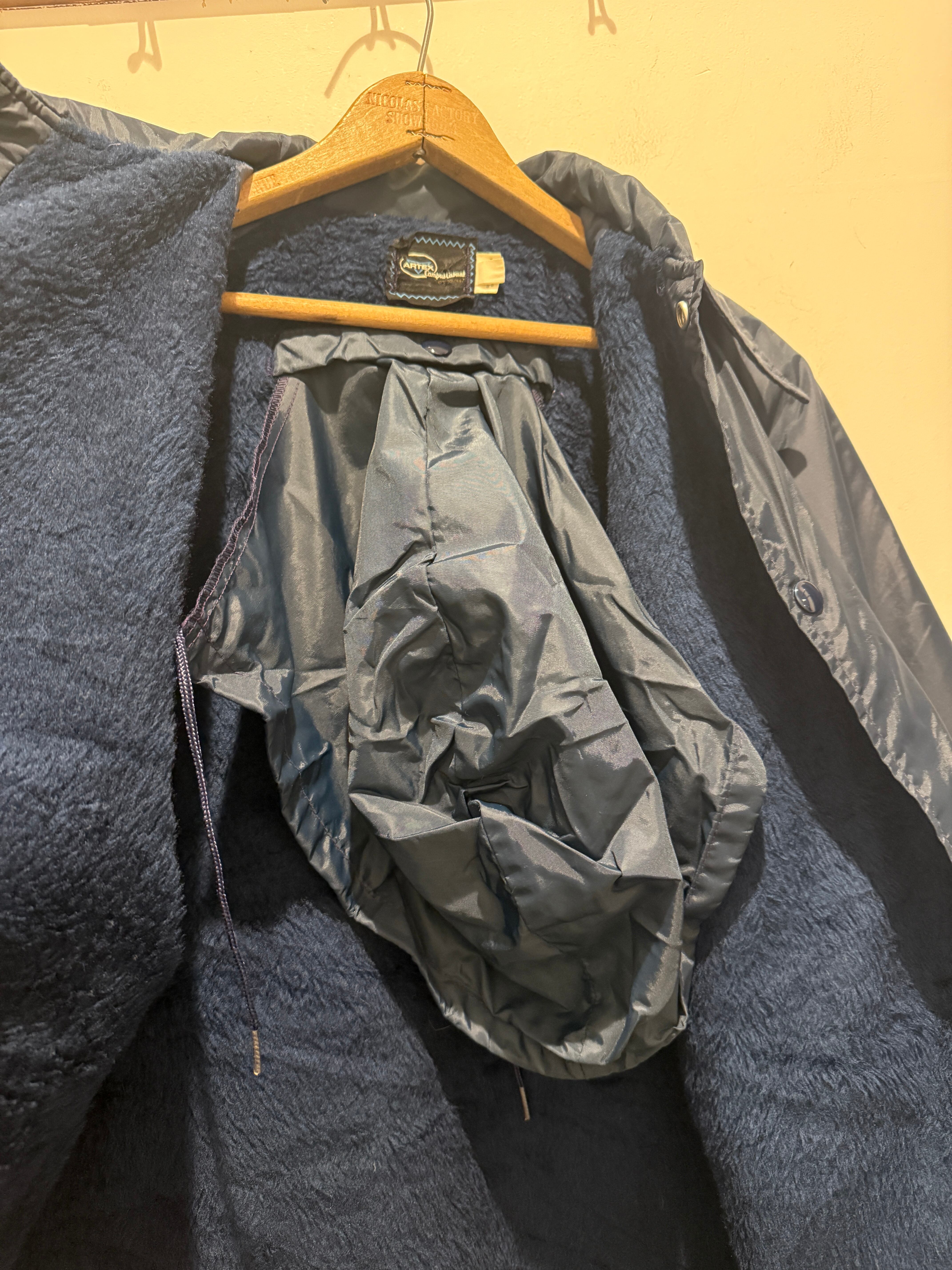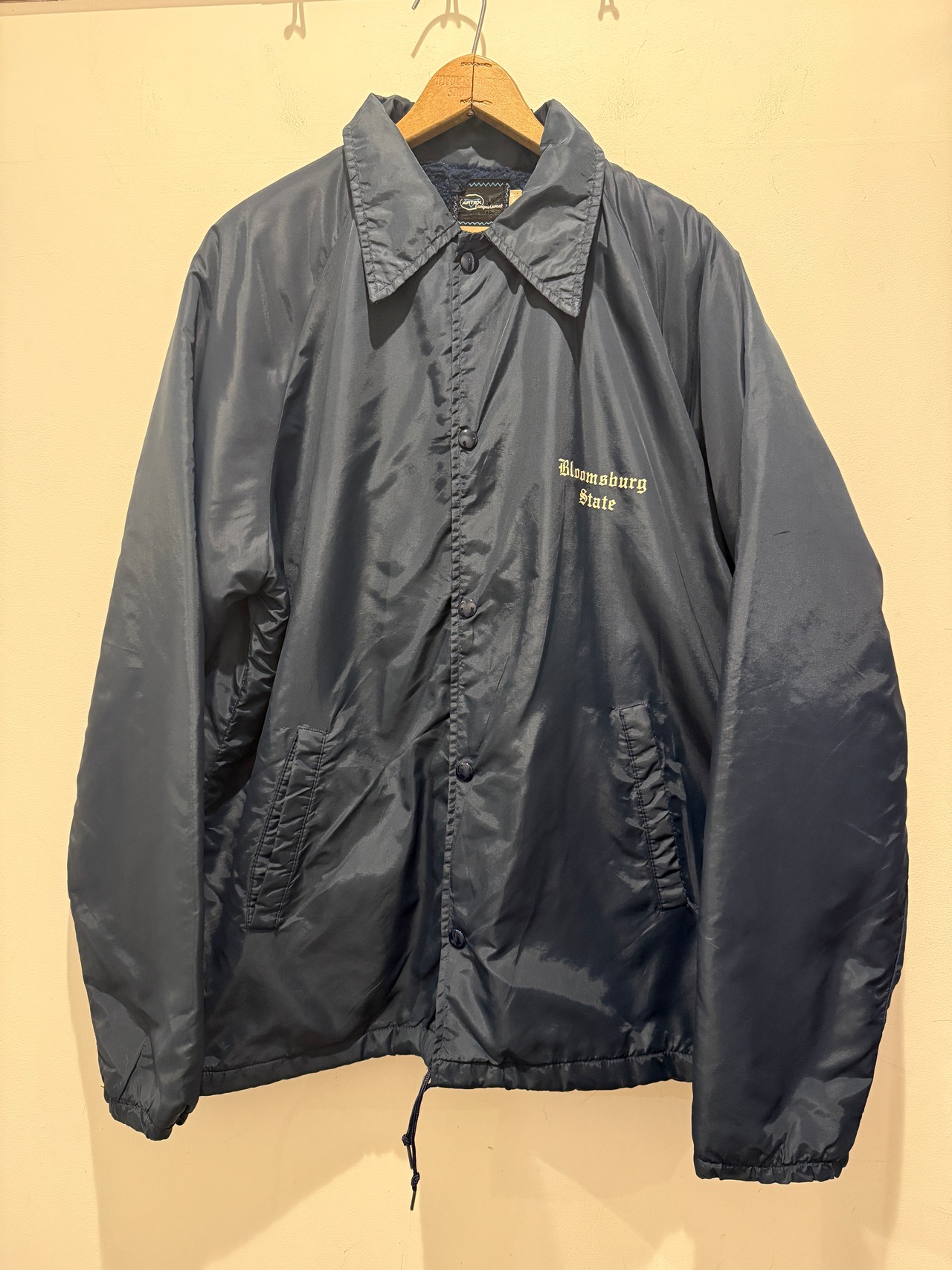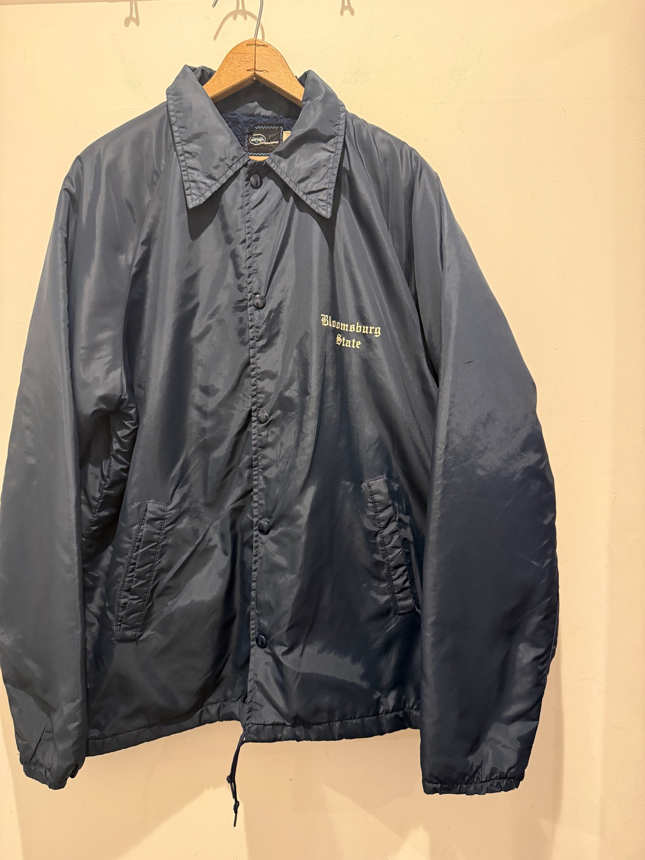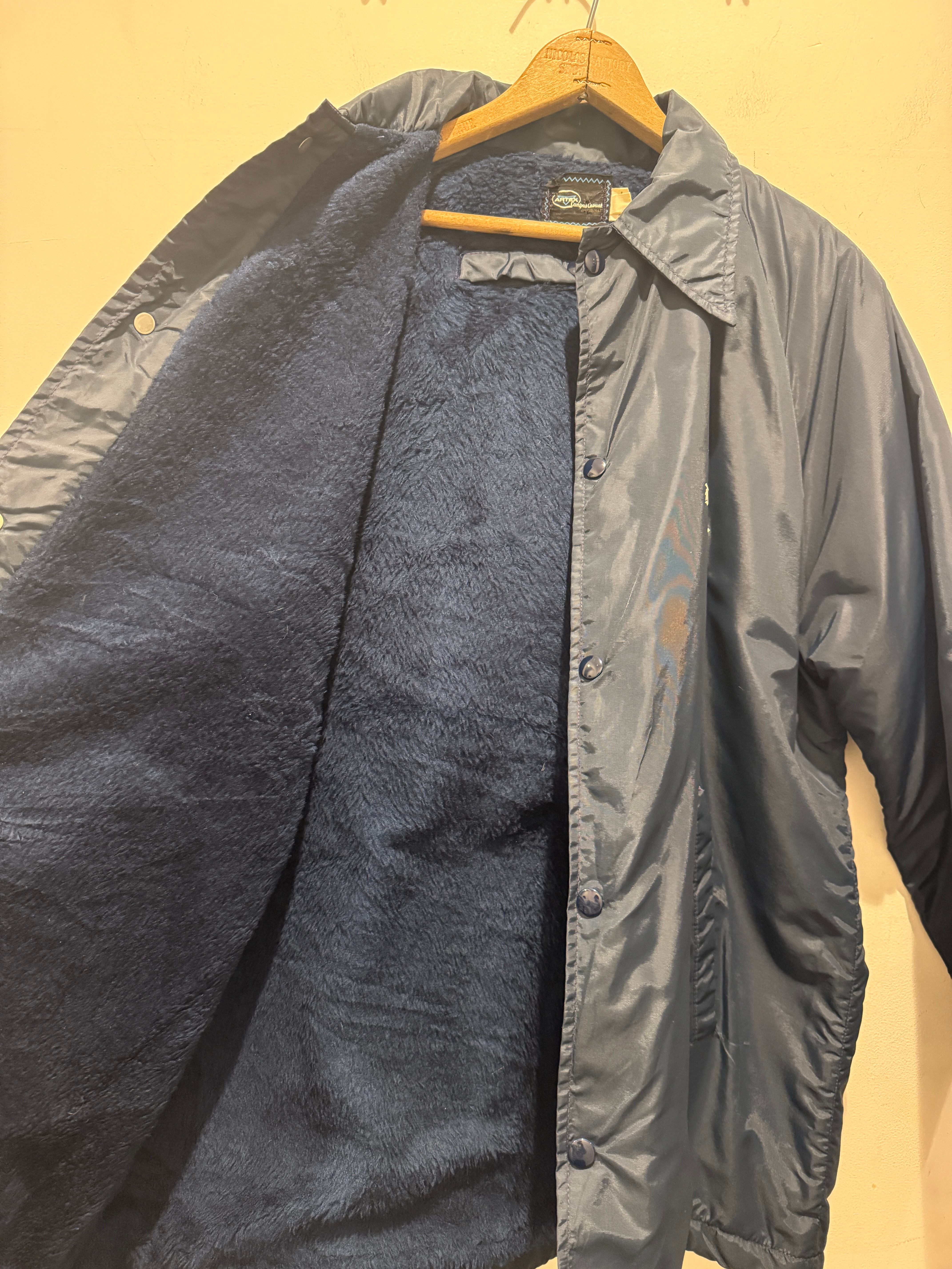 70年代アルテックスのコーチジャケットです。ネイビーカラーで胸に白のオールドイングリッシュのプリントがとても良い1着です。裏ボア仕様でボアもまだフカフカな良いコンディションです。フードが中に収納されているのも面白いポイントですね。身幅もしっかりあって大きめな作りと中に着こめてバイカーの方にもオススメなアイテムです。