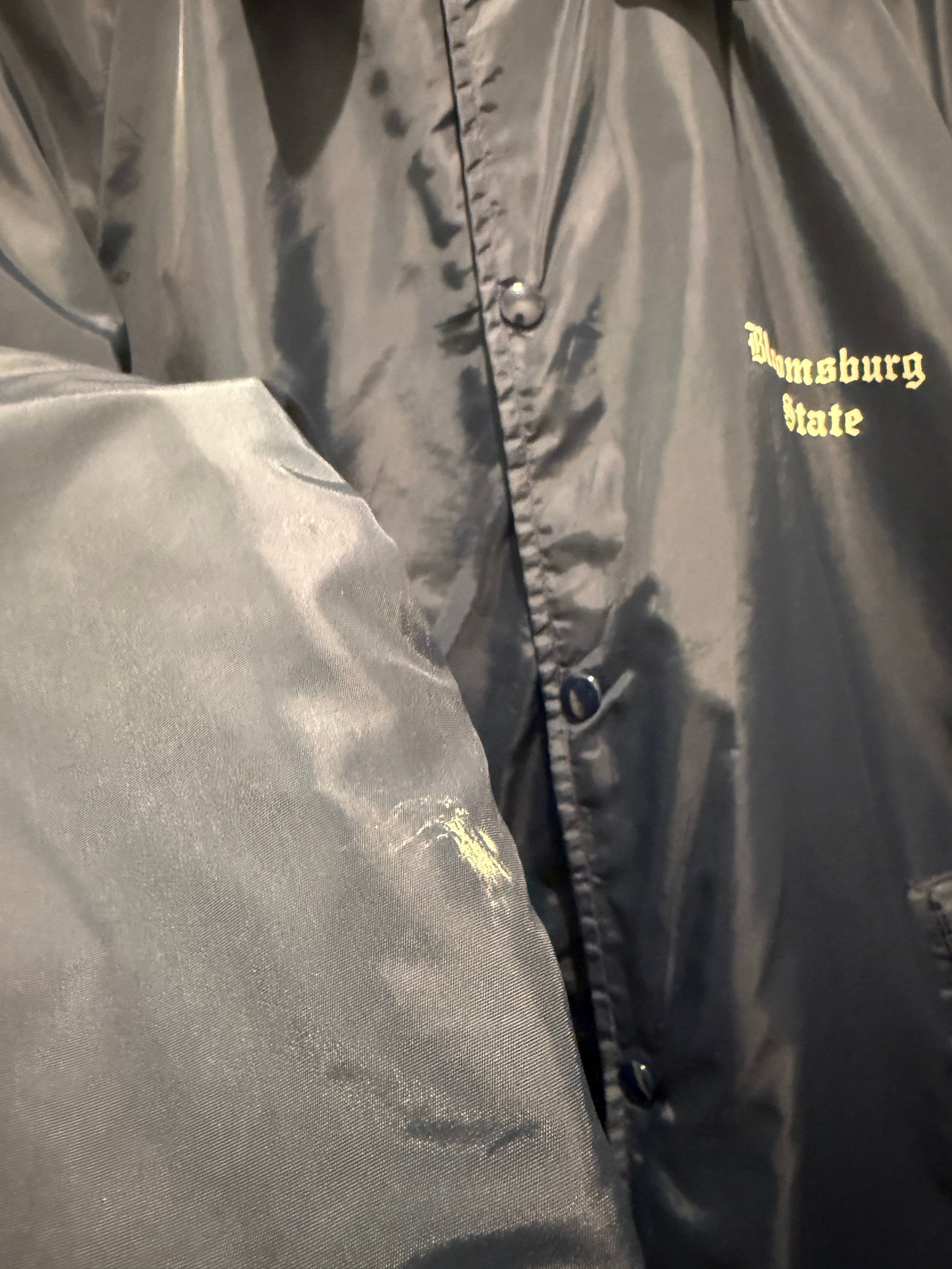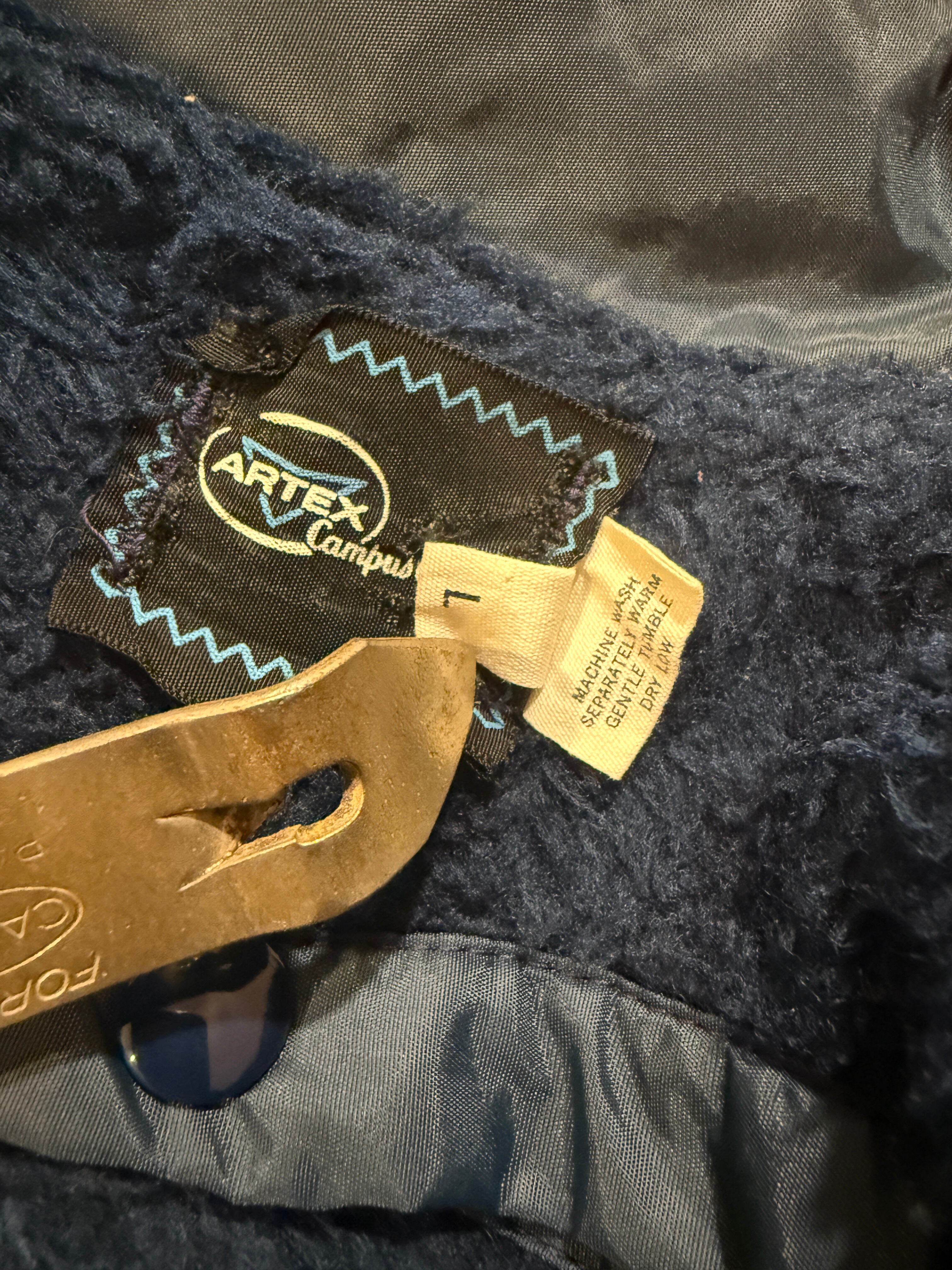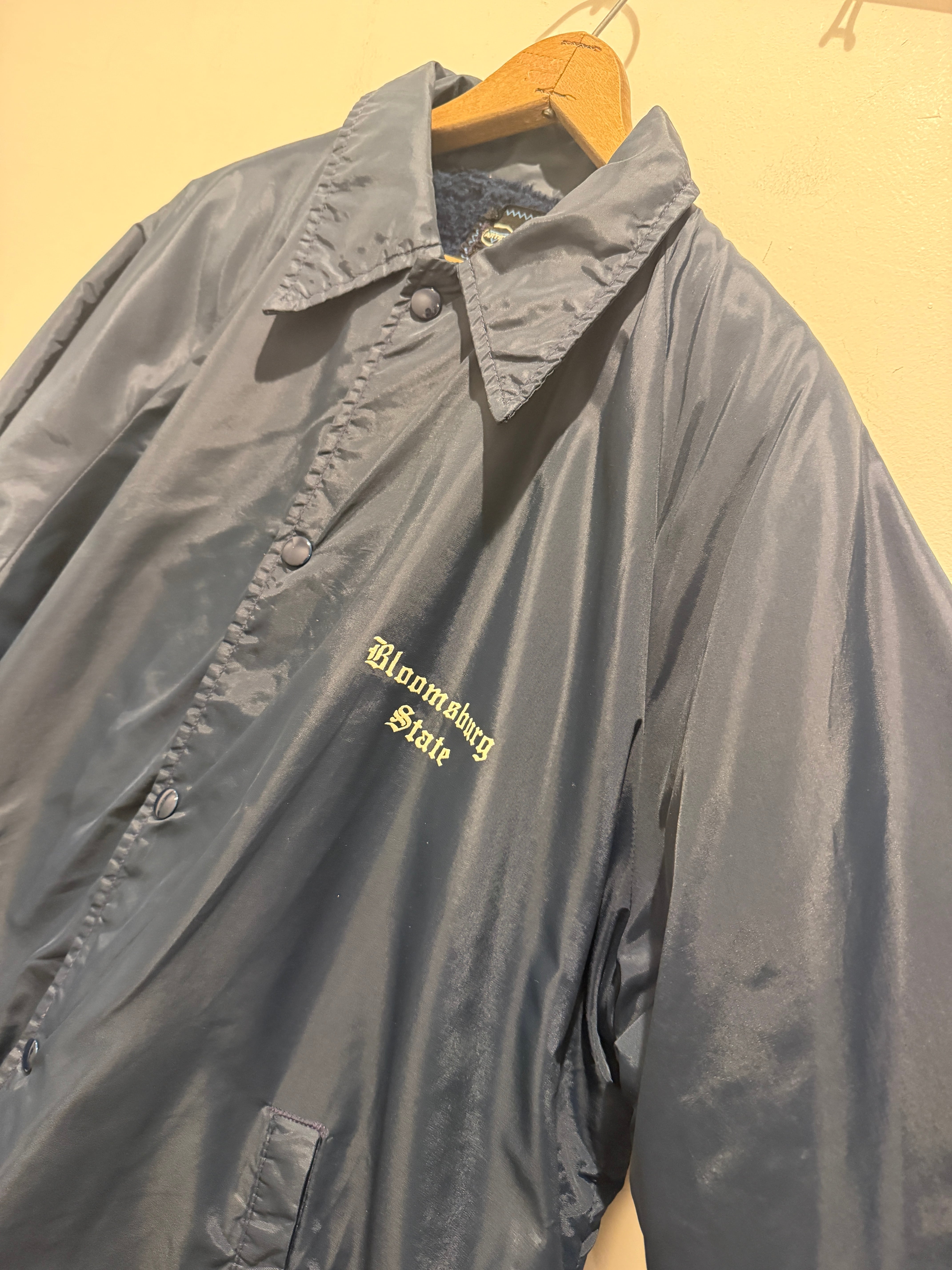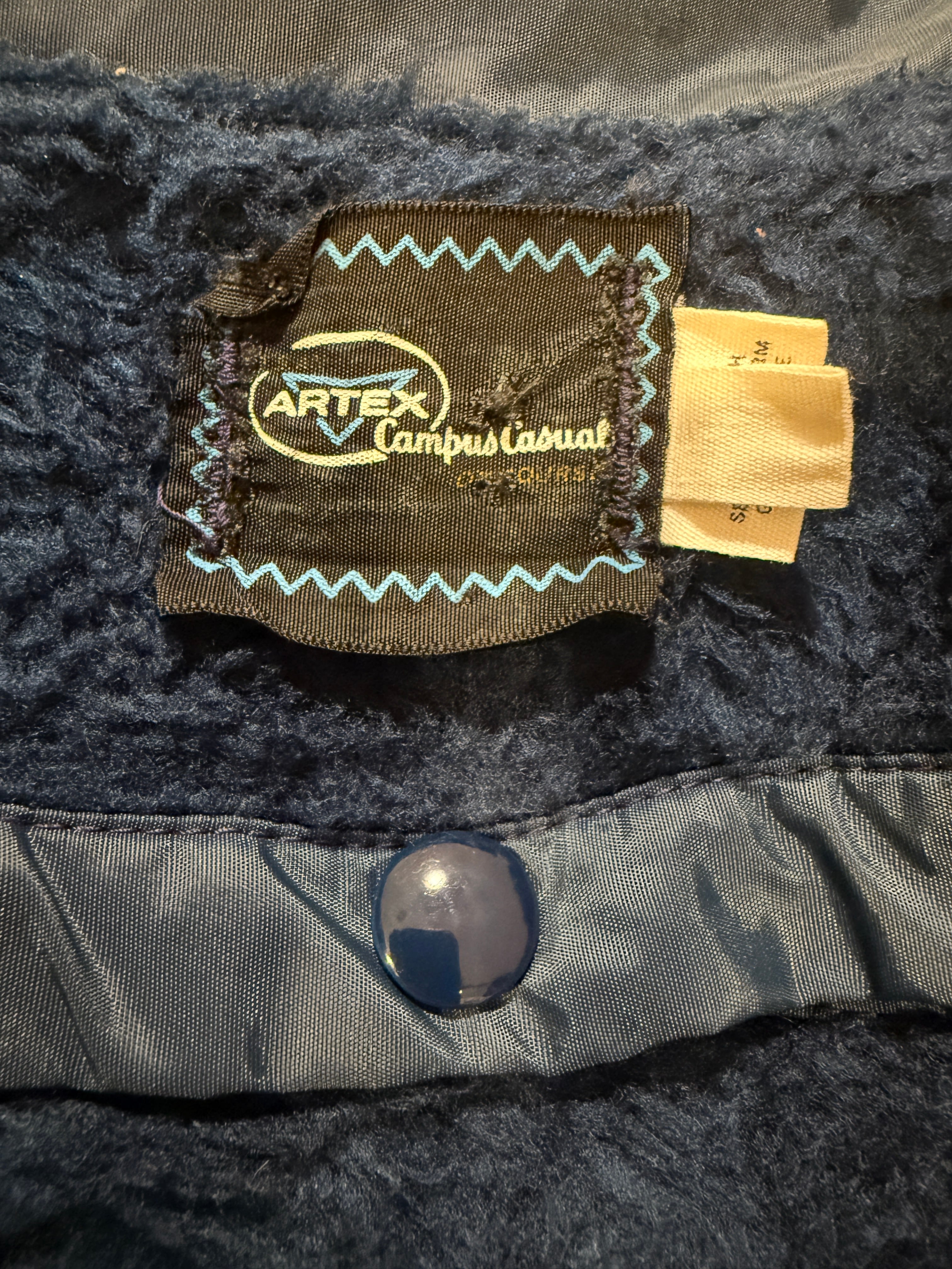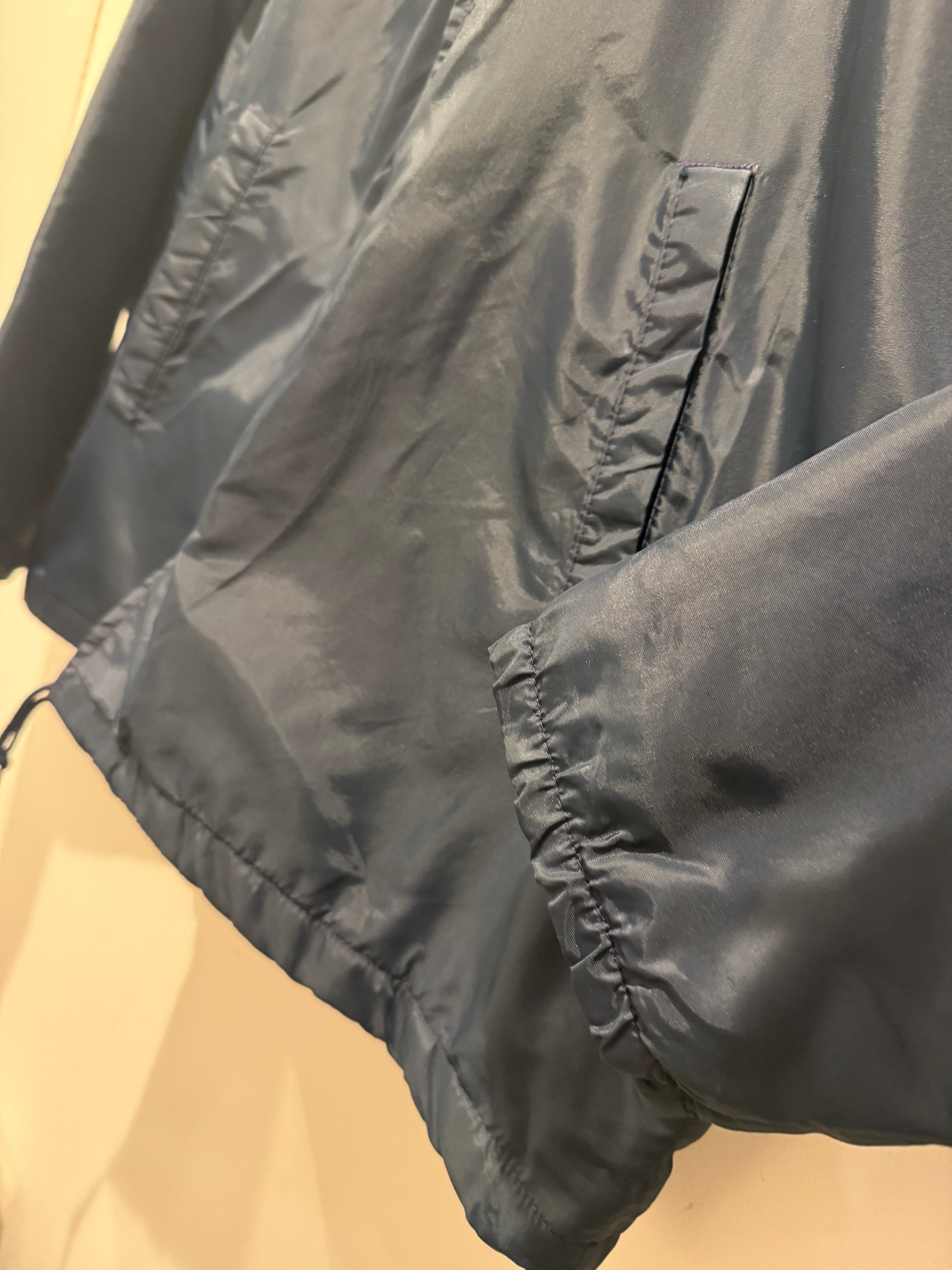 70年代アルテックスのコーチジャケットです。ネイビーカラーで胸に白のオールドイングリッシュのプリントがとても良い1着です。裏ボア仕様でボアもまだフカフカな良いコンディションです。フードが中に収納されているのも面白いポイントですね。身幅もしっかりあって大きめな作りと中に着こめてバイカーの方にもオススメなアイテムです。
