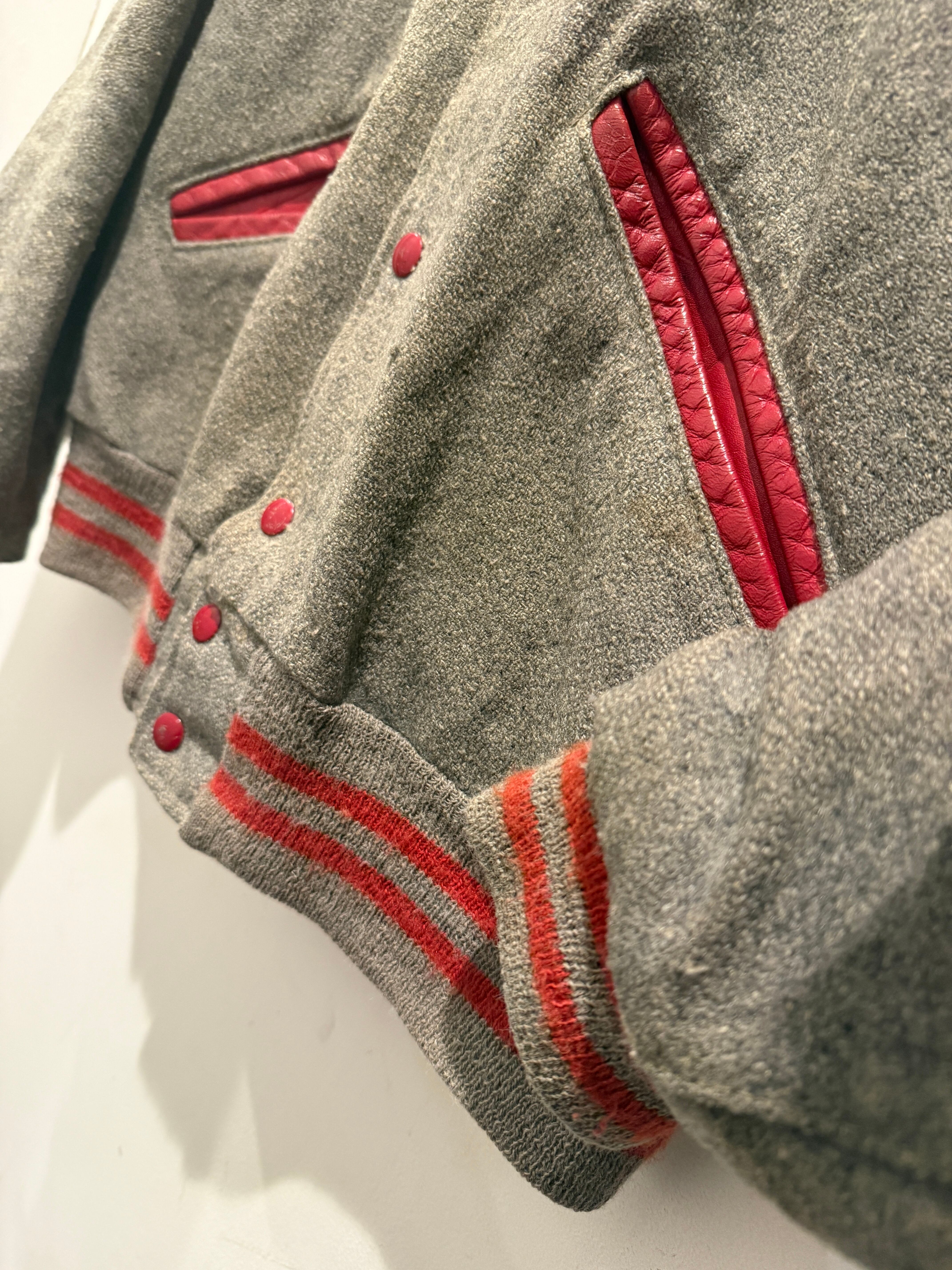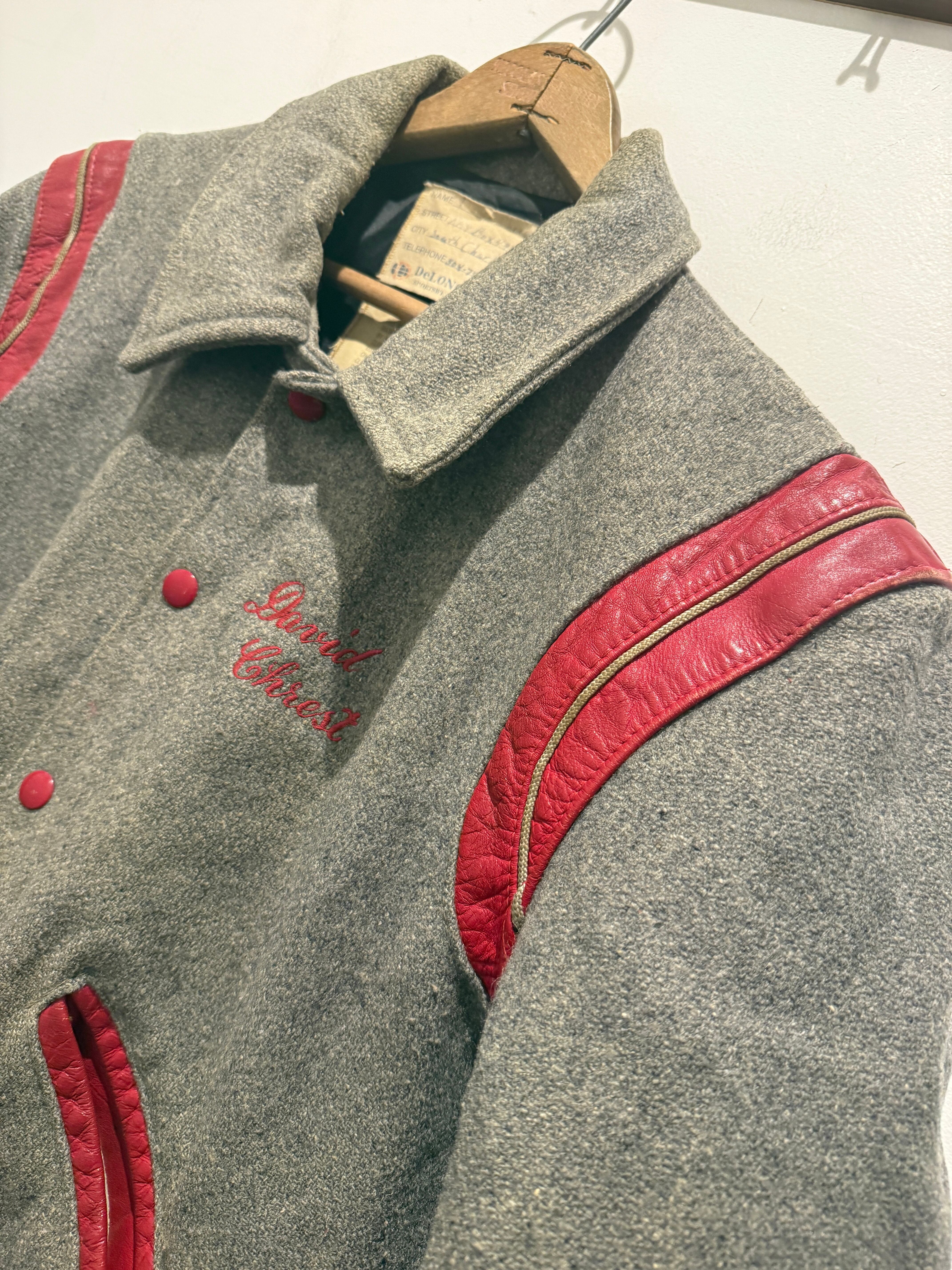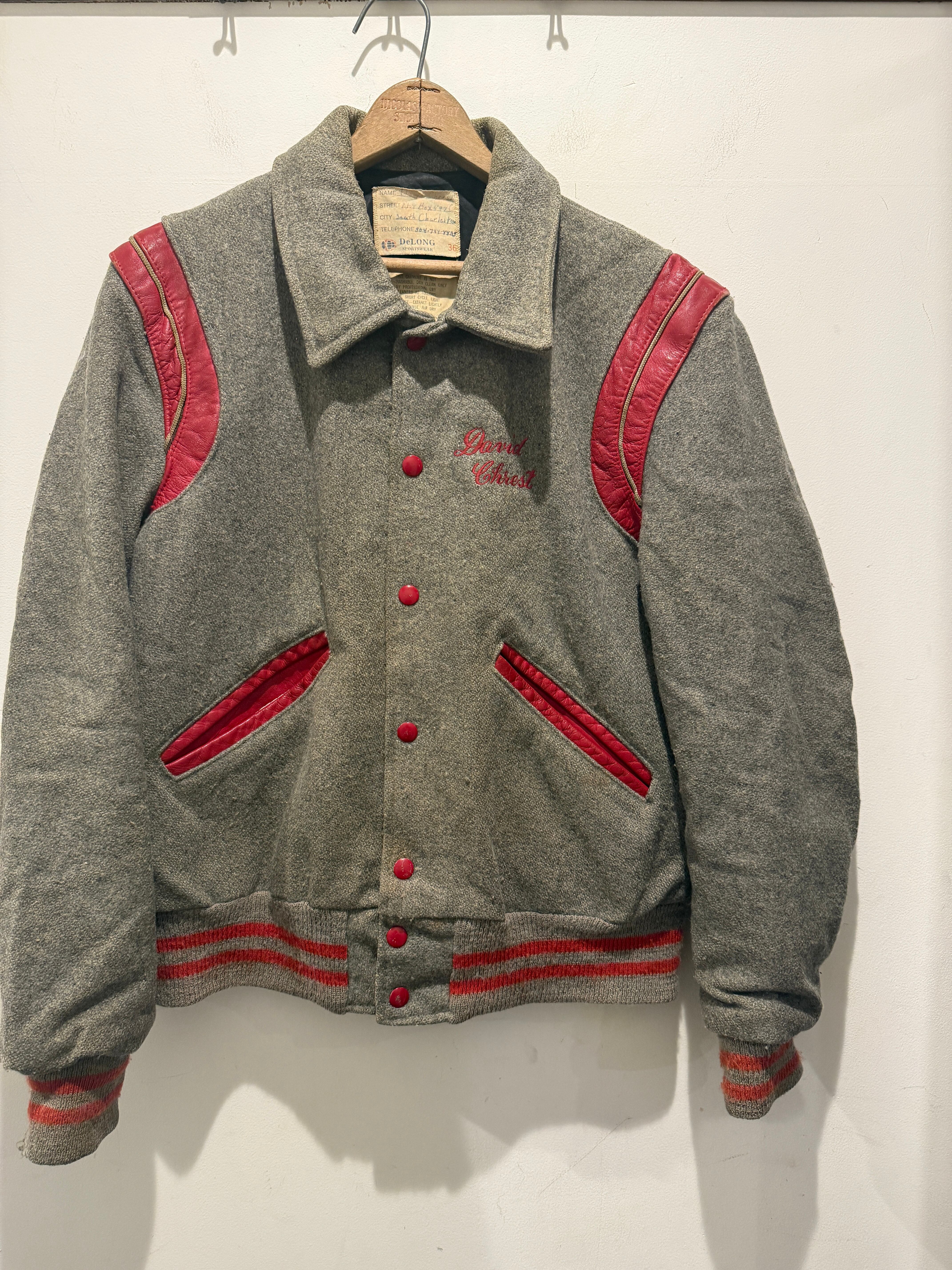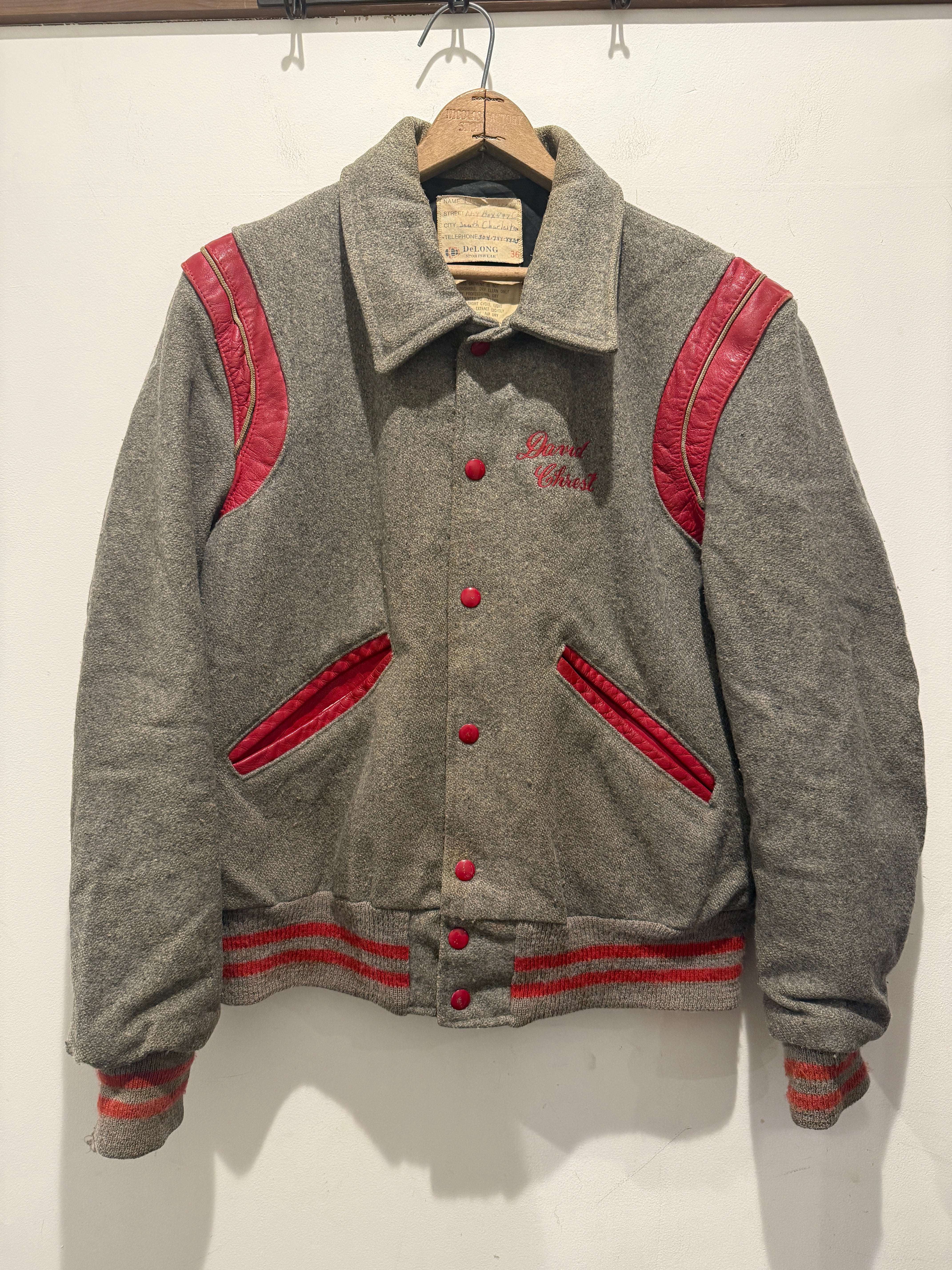 70年代〜80年代アメリカ製デロングのスタジャンです。グレーボディにレッドのレザーがとても良い1着です。胸とバッグに入るチェーンステッチもとても良いですね。サンローランやセリーヌであるテディジャケットと同じ型とファッション要素も高くサイズの合う方にはオススメなアイテムです。