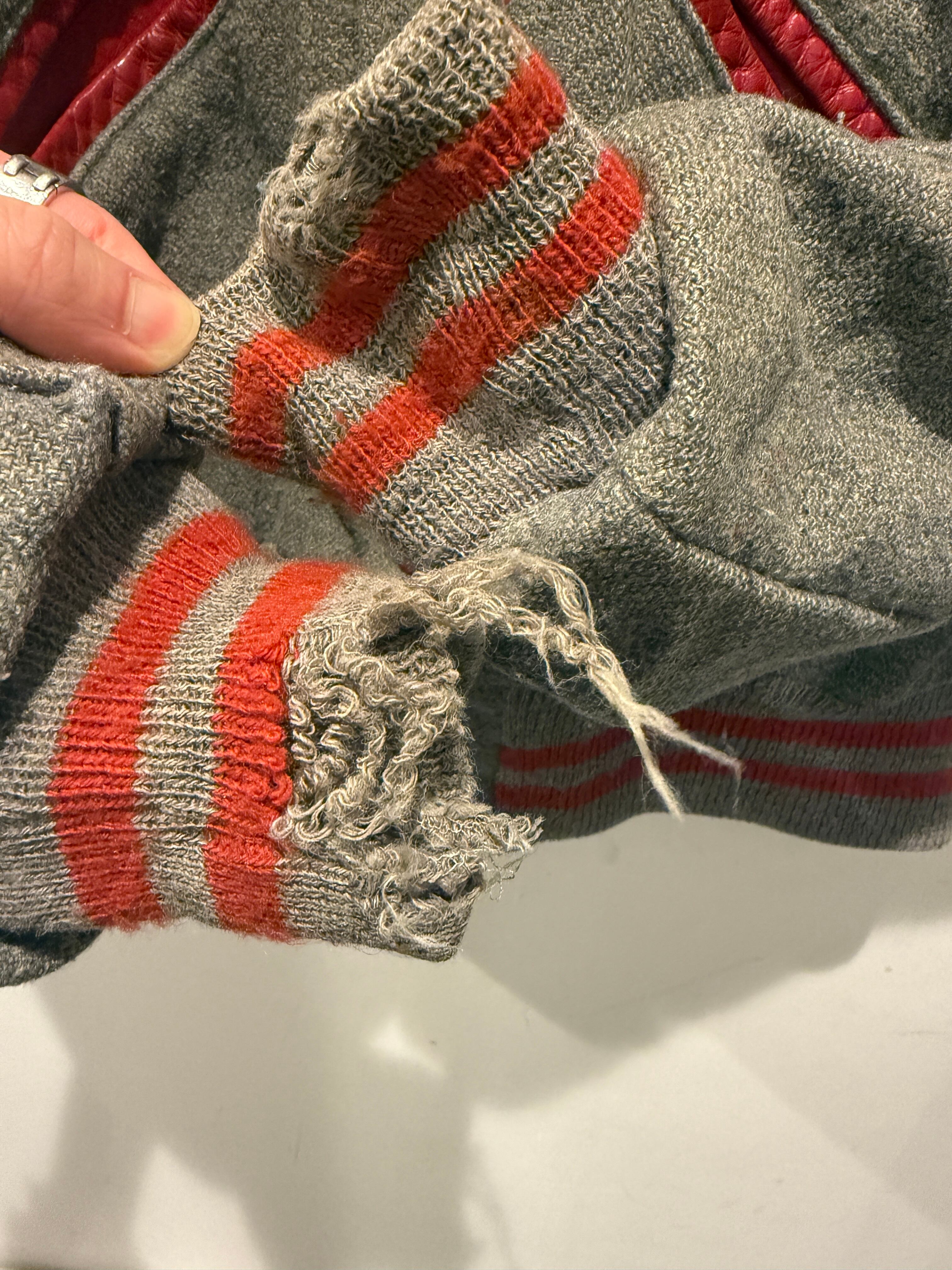 画像の通り袖リブにダメージ、インナーにペンキ汚れがございます。また全体的に使用感はございますが着用には問題無いコンディションです。