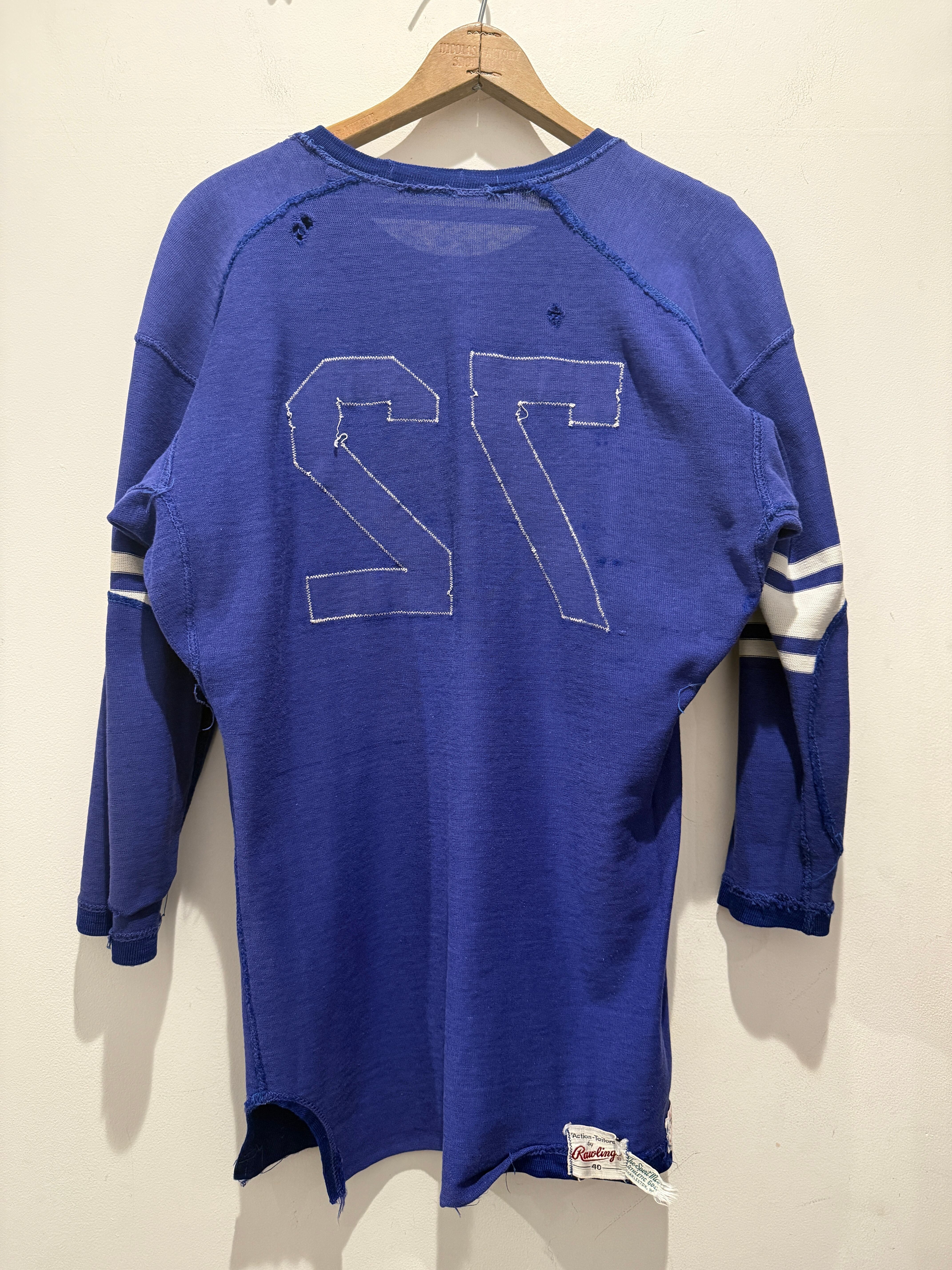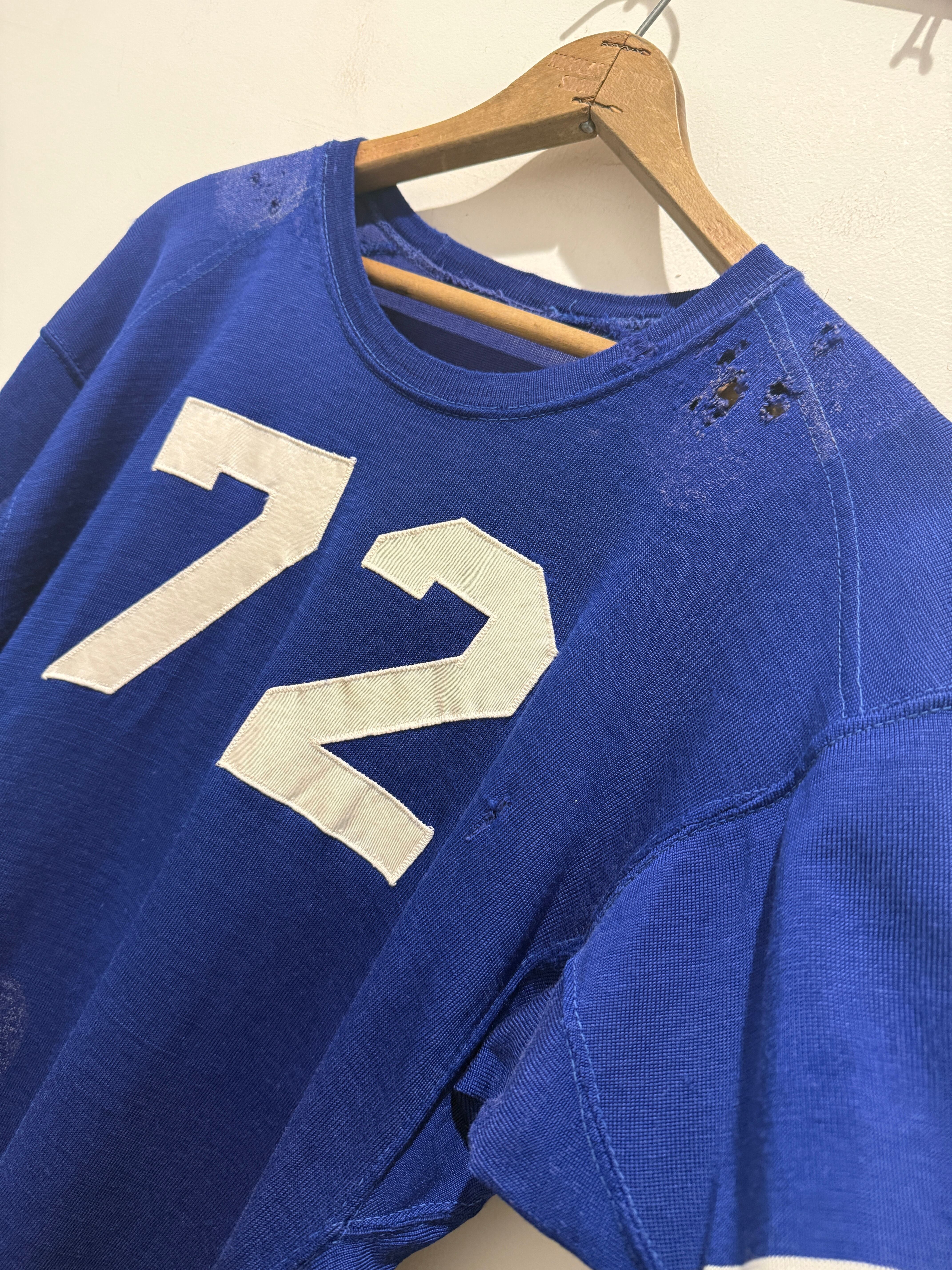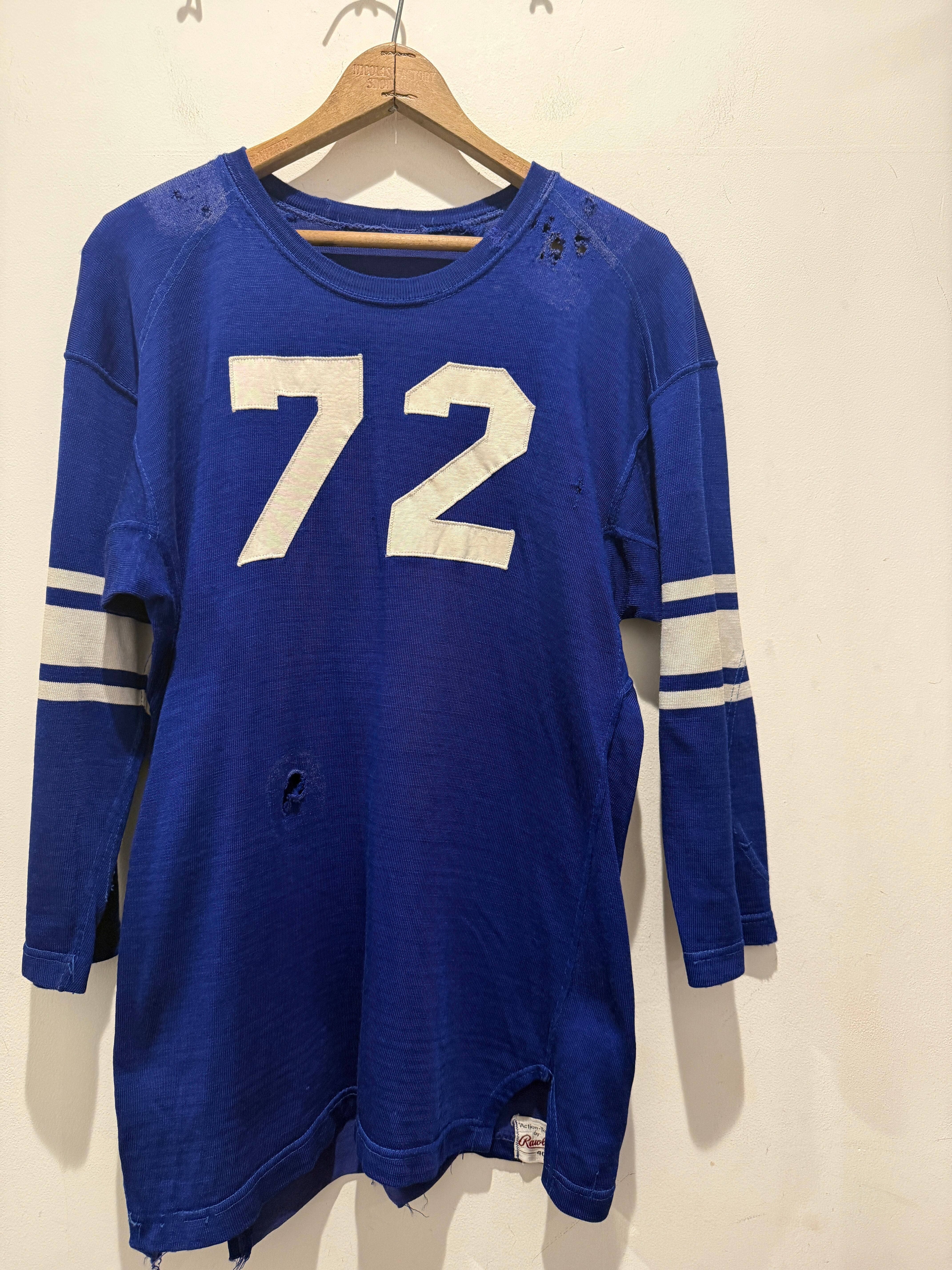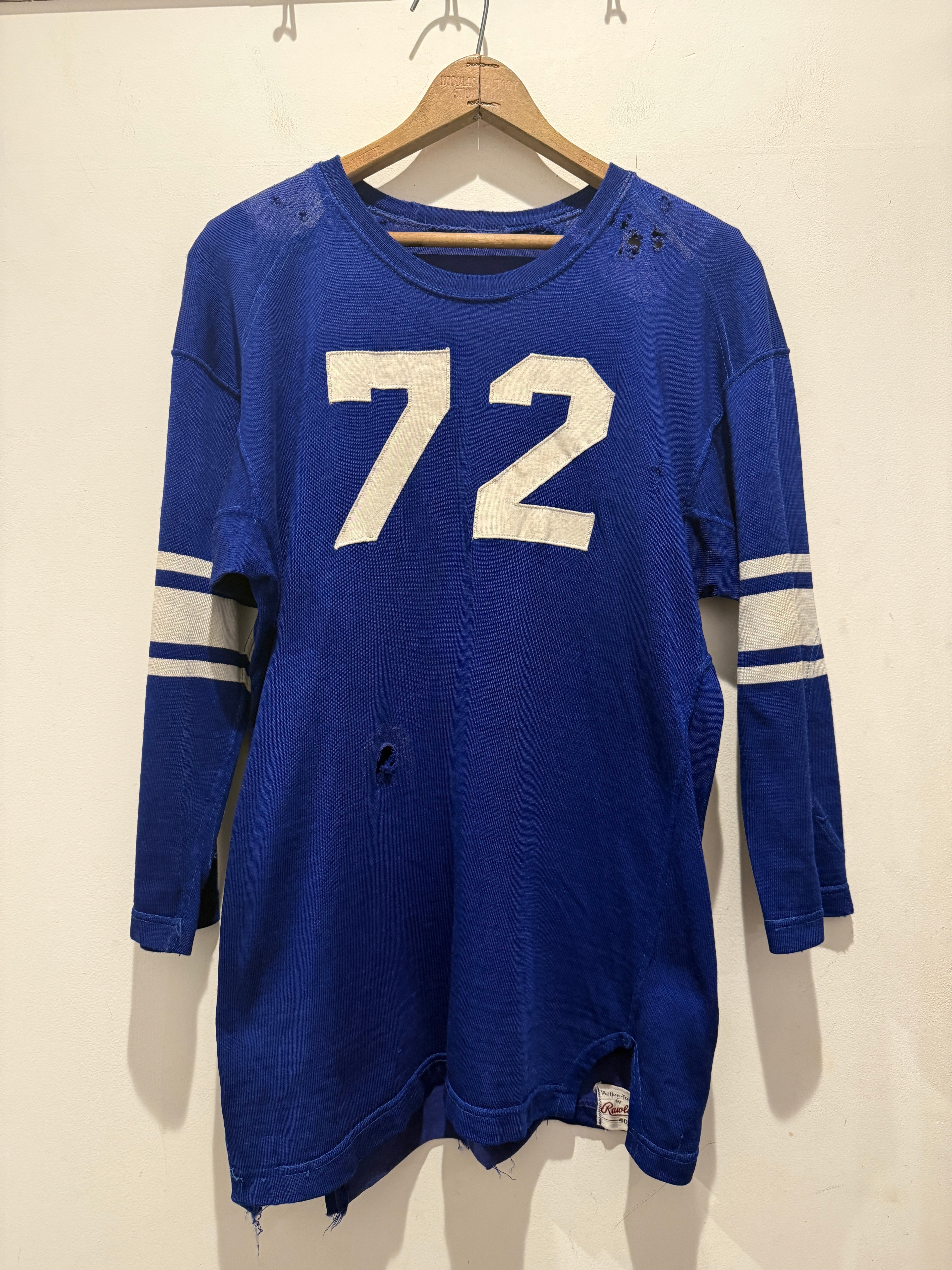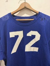 60年代〜70年代ローリングスのフットボールTシャツです。ブルーボディにホワイトのラインとナンバリングとなります。2本針で縫われていたり、エルボーパッチ、脇下ガゼットなど古いディテールも盛り沢山です。裏地は茄子紺カラーになっていますね。ボロの雰囲気たっぷりなフットボールTとオススメな1着です。