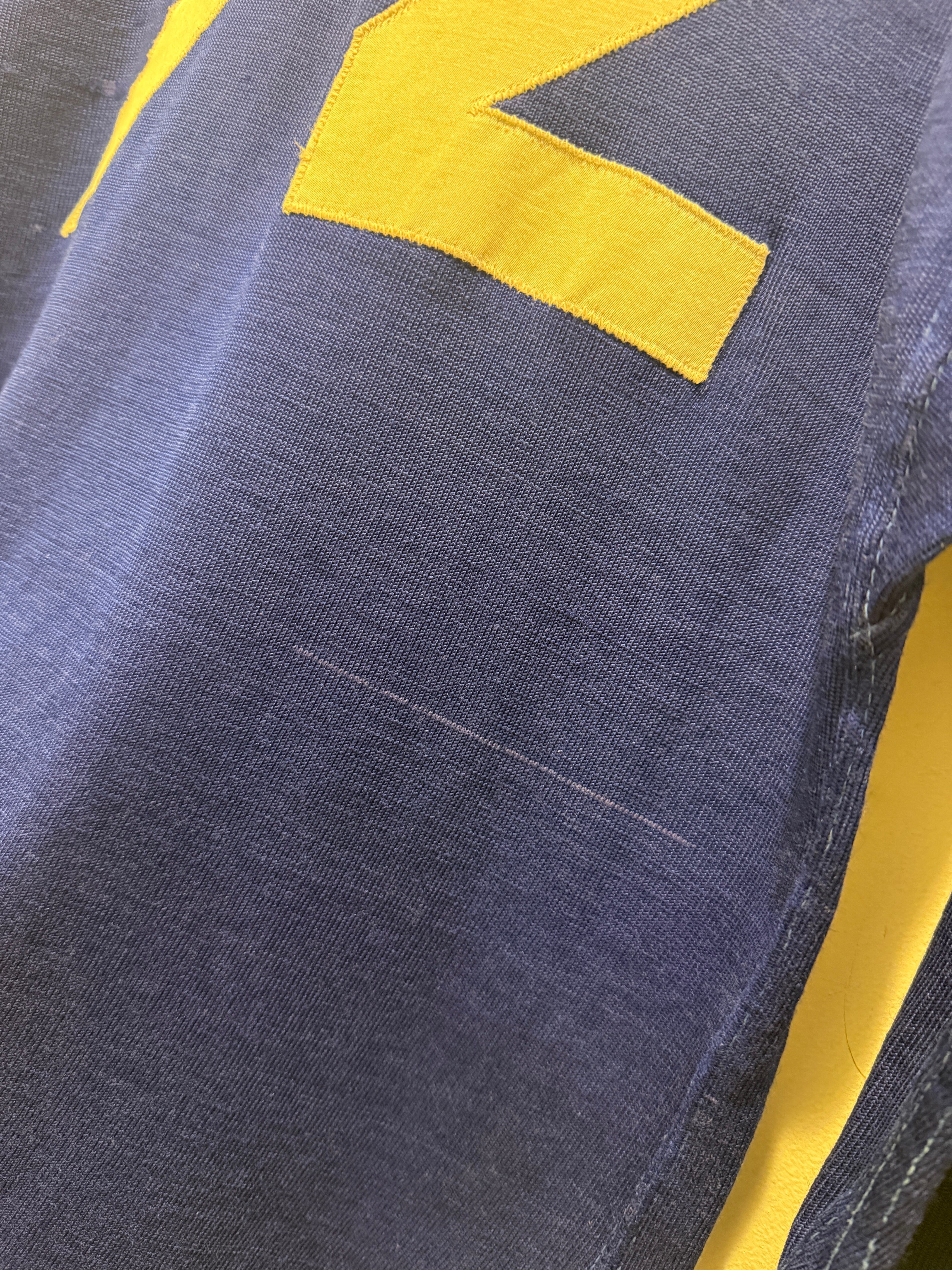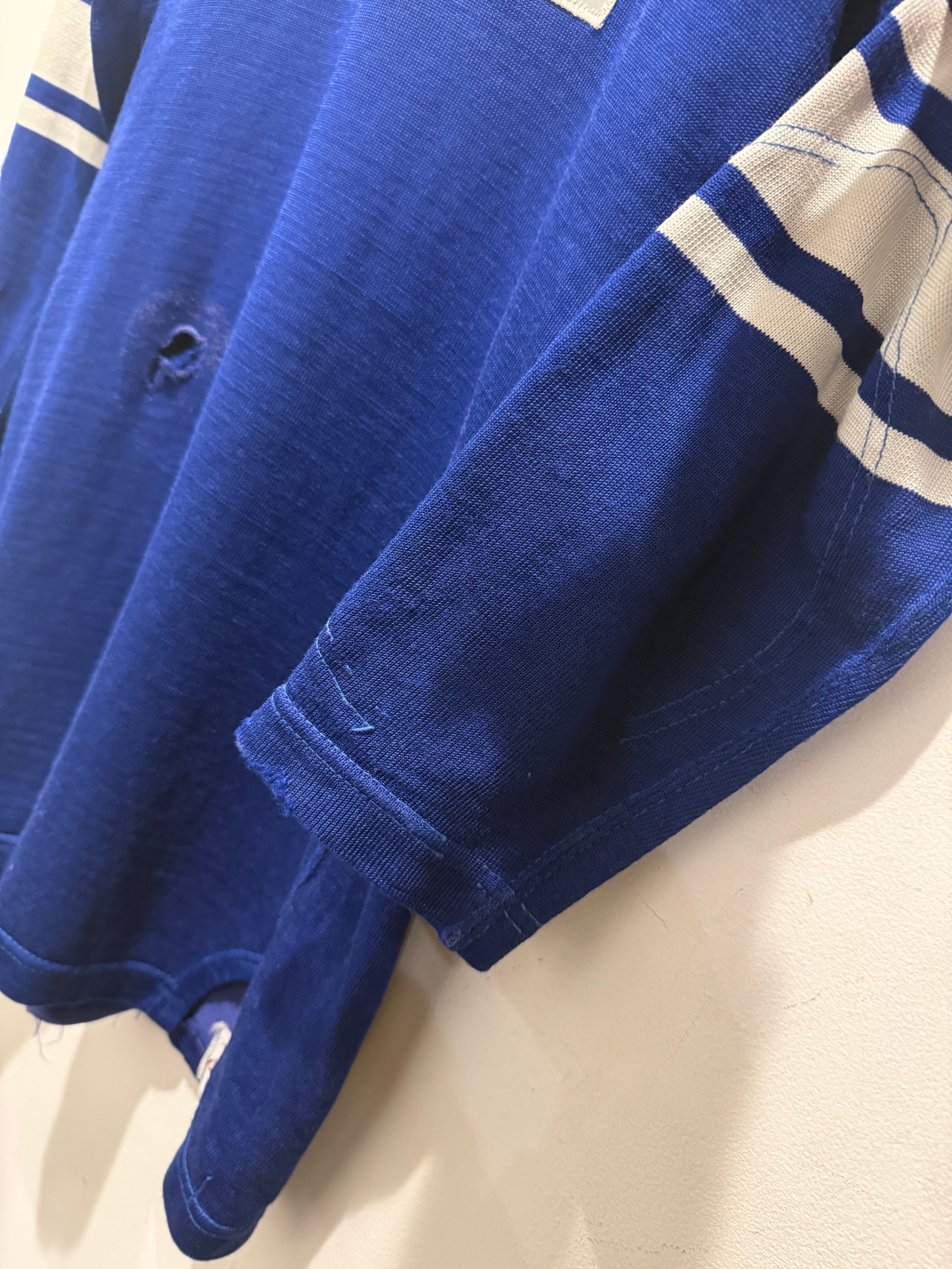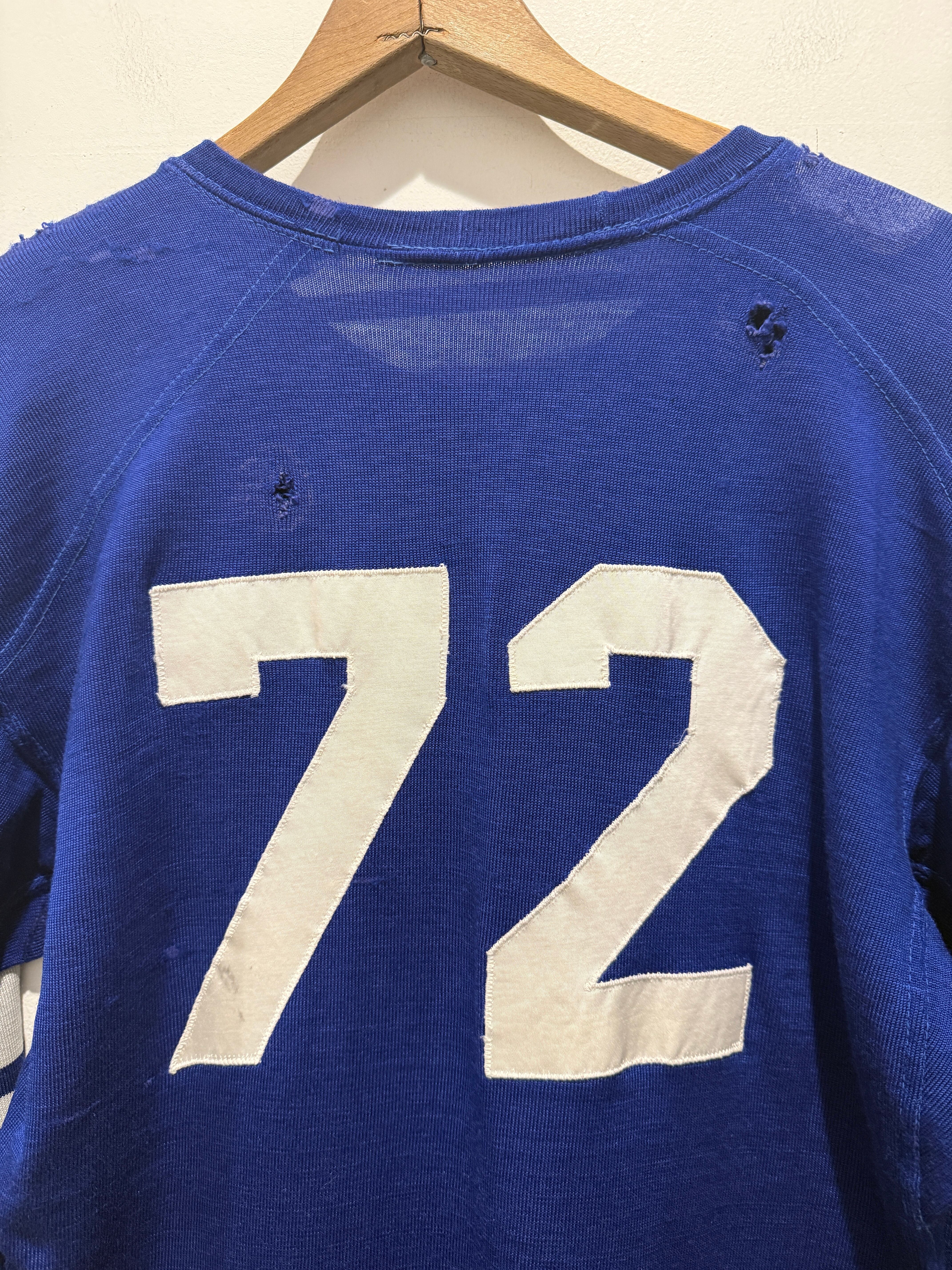 60年代〜70年代ローリングスのフットボールTシャツです。ブルーボディにホワイトのラインとナンバリングとなります。2本針で縫われていたり、エルボーパッチ、脇下ガゼットなど古いディテールも盛り沢山です。裏地は茄子紺カラーになっていますね。ボロの雰囲気たっぷりなフットボールTとオススメな1着です。