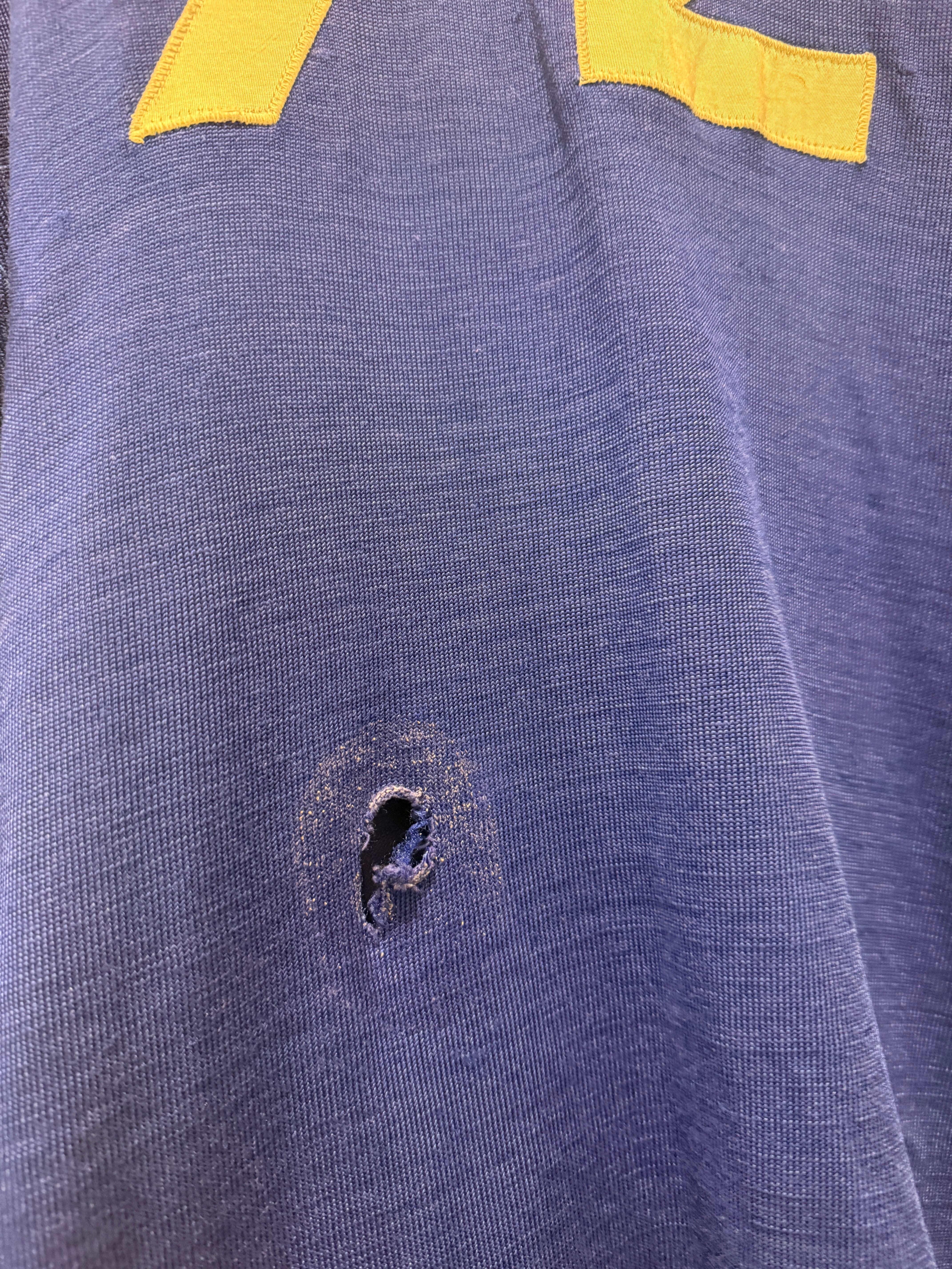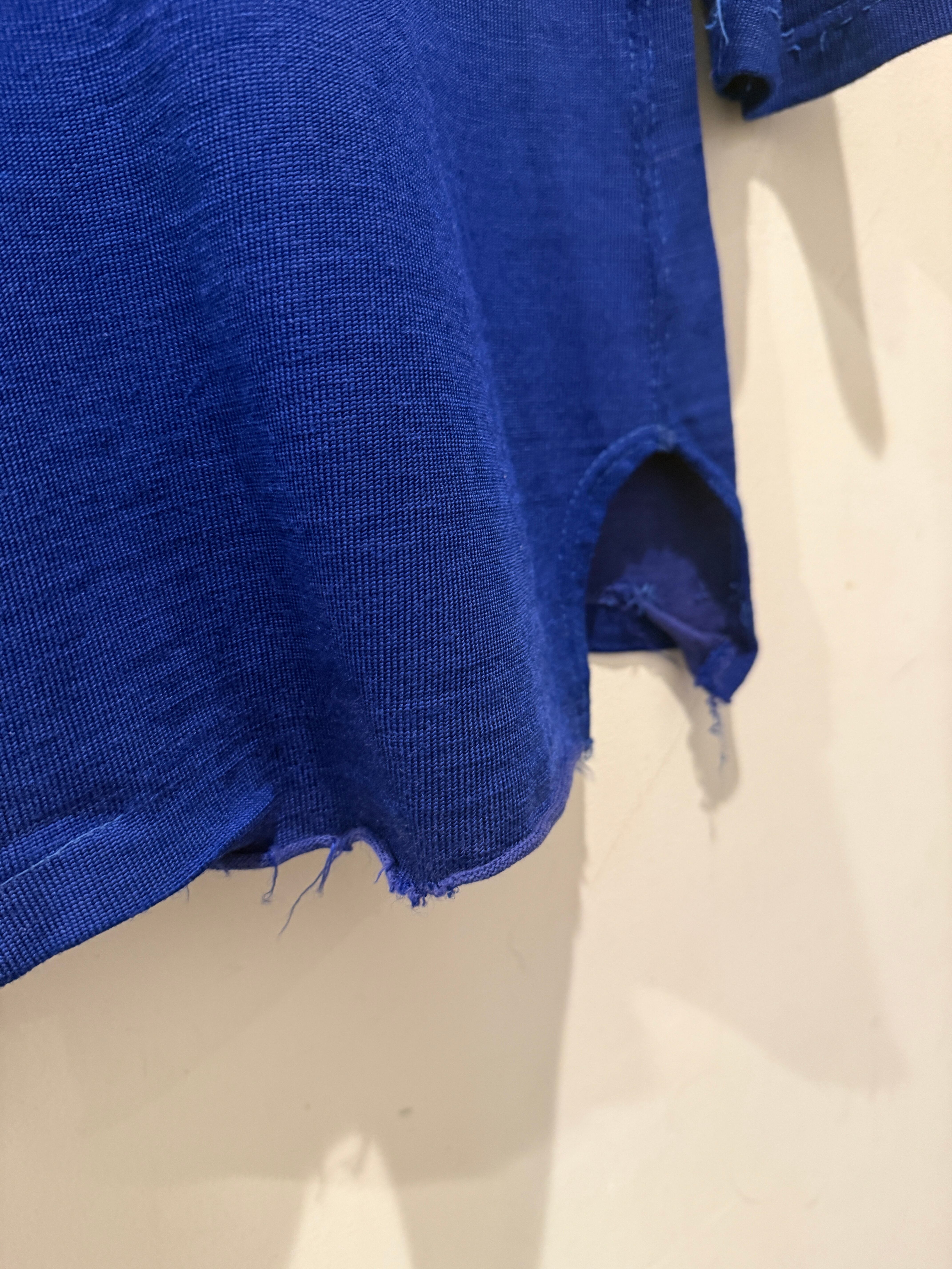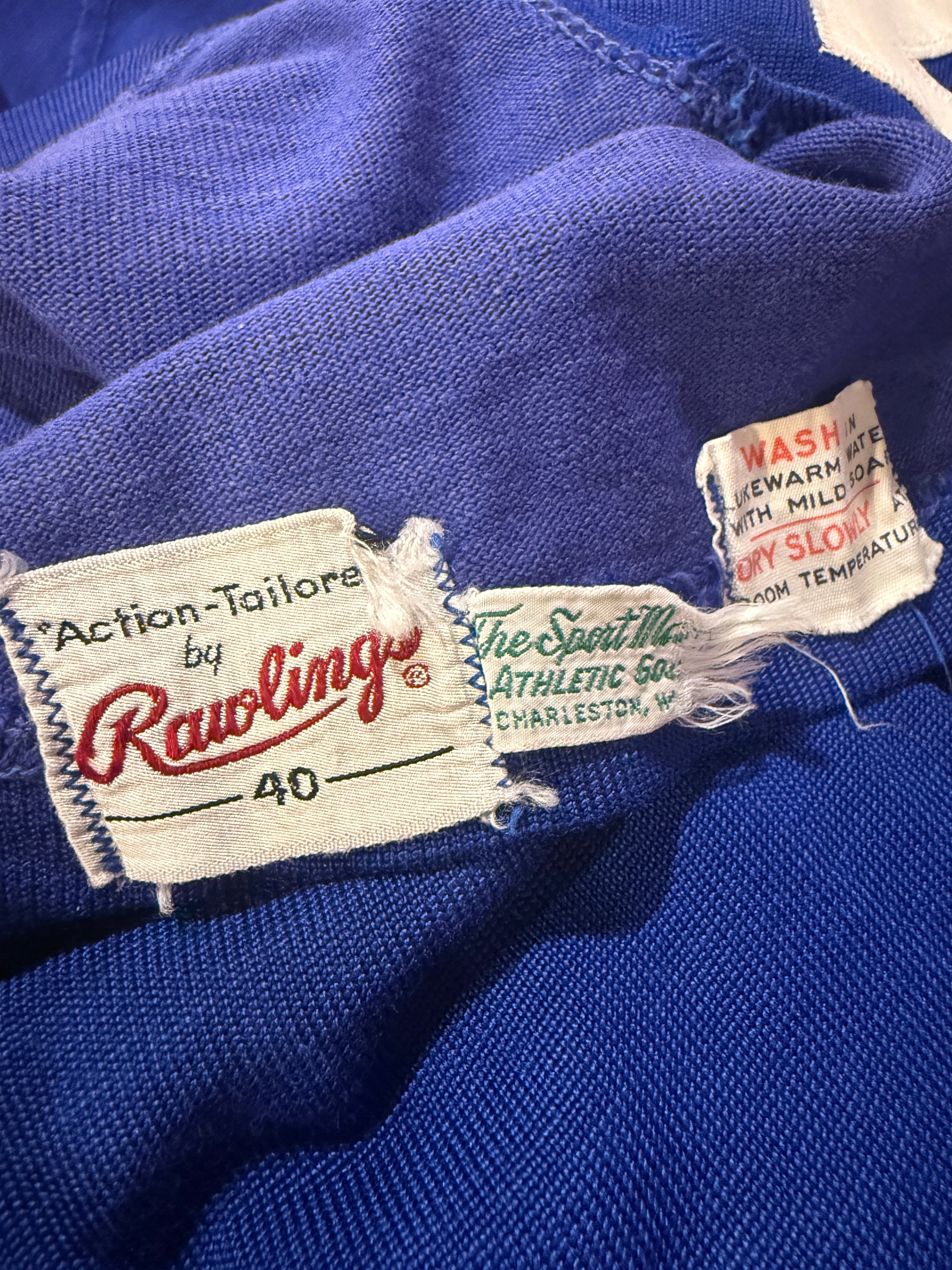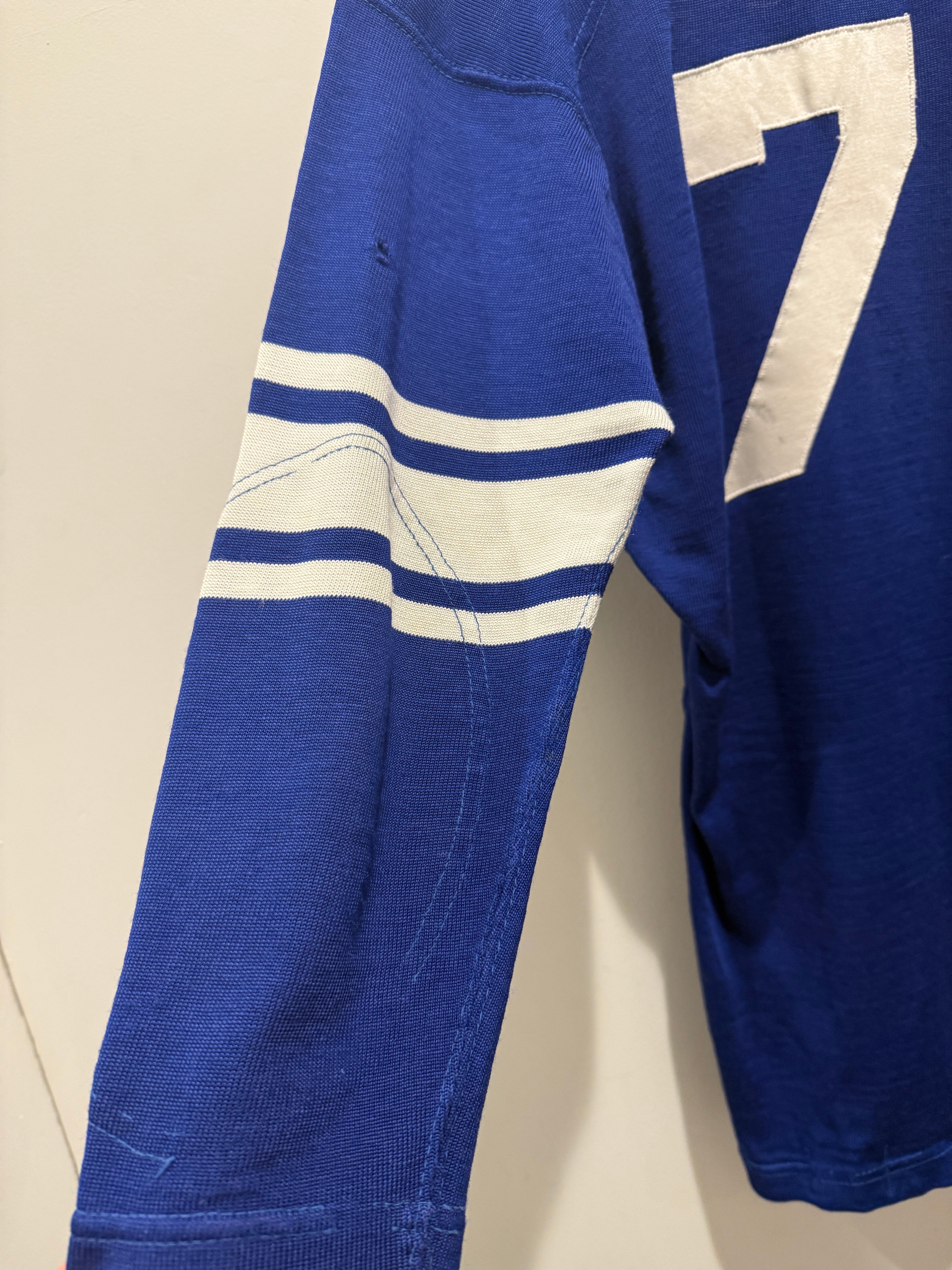 60年代〜70年代ローリングスのフットボールTシャツです。ブルーボディにホワイトのラインとナンバリングとなります。2本針で縫われていたり、エルボーパッチ、脇下ガゼットなど古いディテールも盛り沢山です。裏地は茄子紺カラーになっていますね。ボロの雰囲気たっぷりなフットボールTとオススメな1着です。