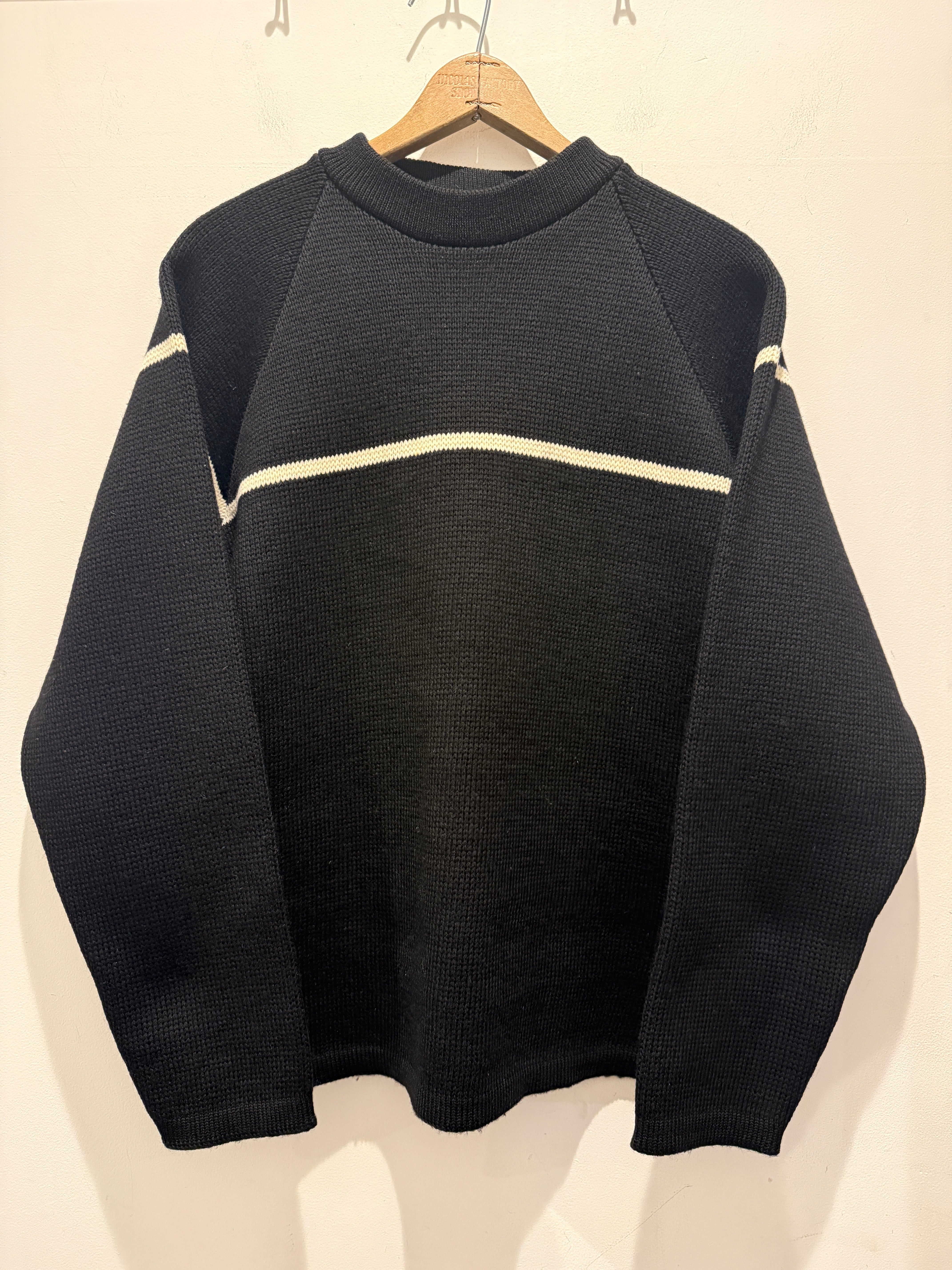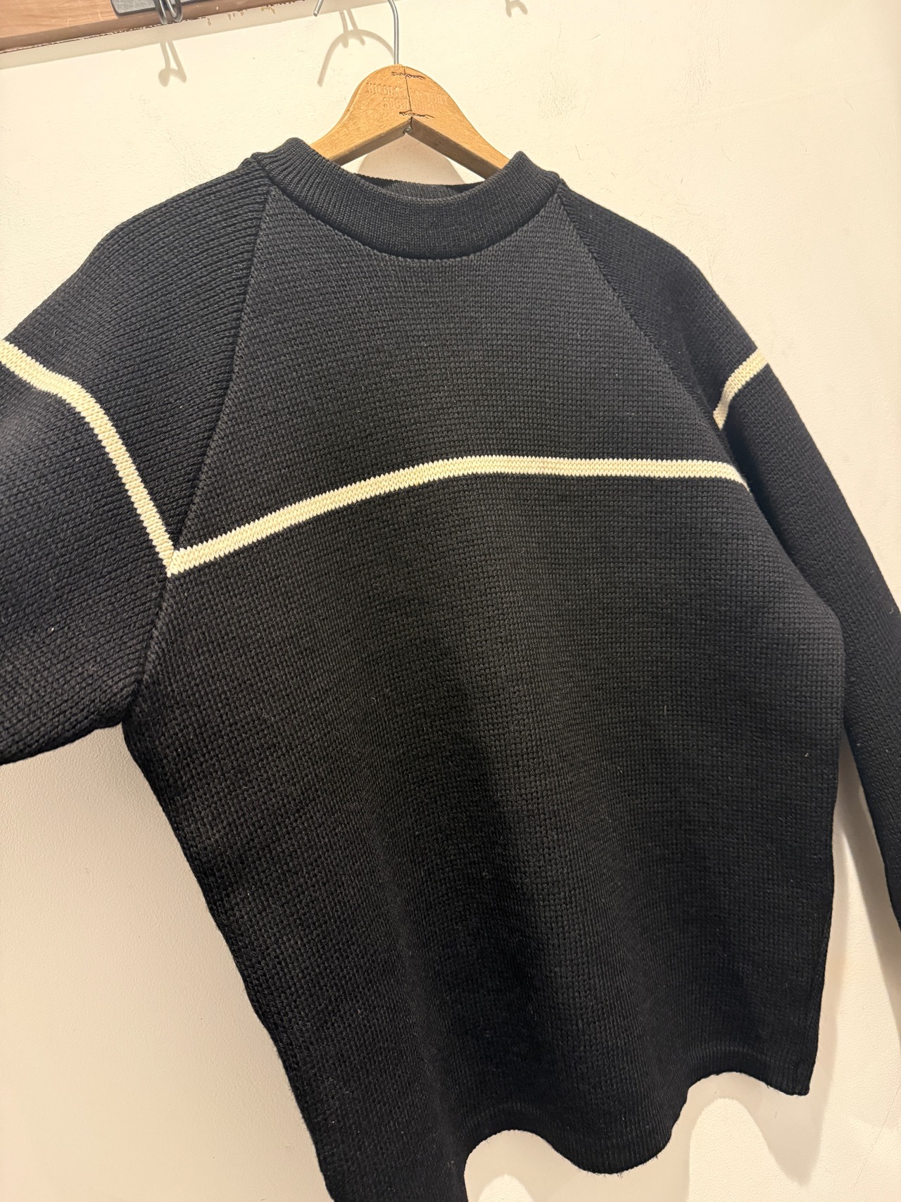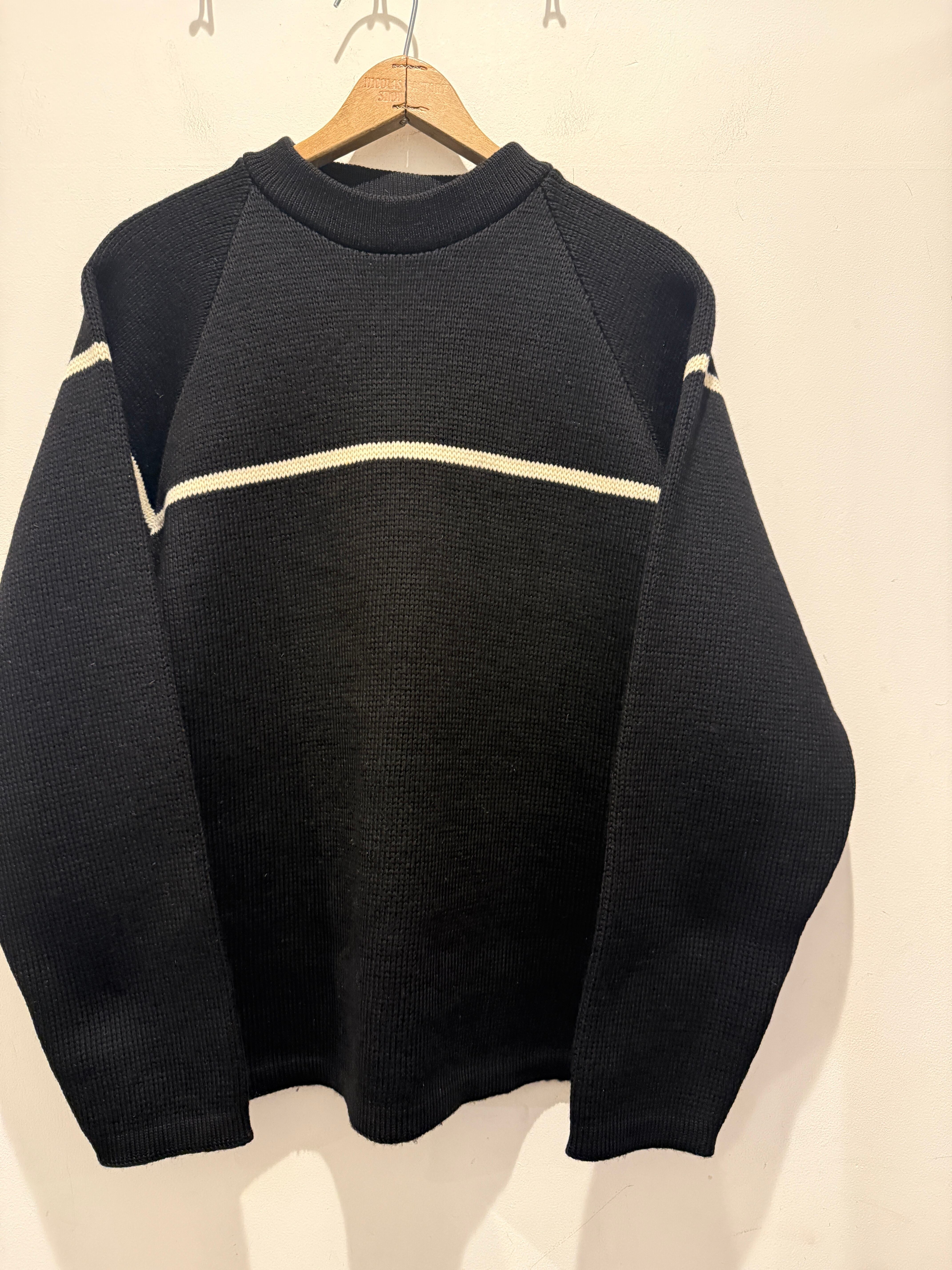 60年代ヴィンテージのブラックウールニットです。ブラックカラーにホワイトのラインが入るシンプルなデザインがとても良い1着です。ビンテージニット特有のウールがつまっていて厚みのある感じがとても良いですね。身幅もあってラグランスリーブと短めなリブが着用しやすくオススメなニットです。