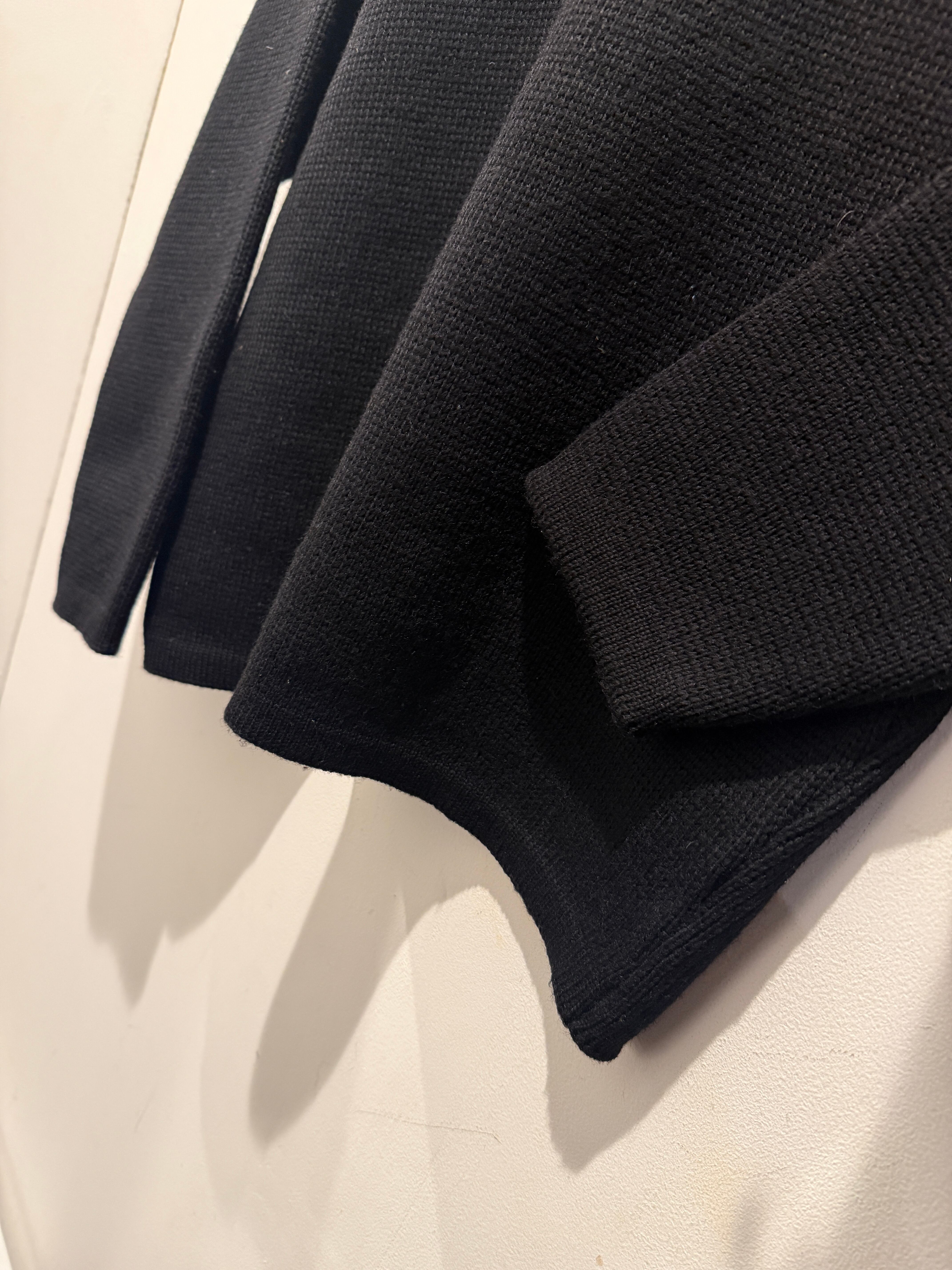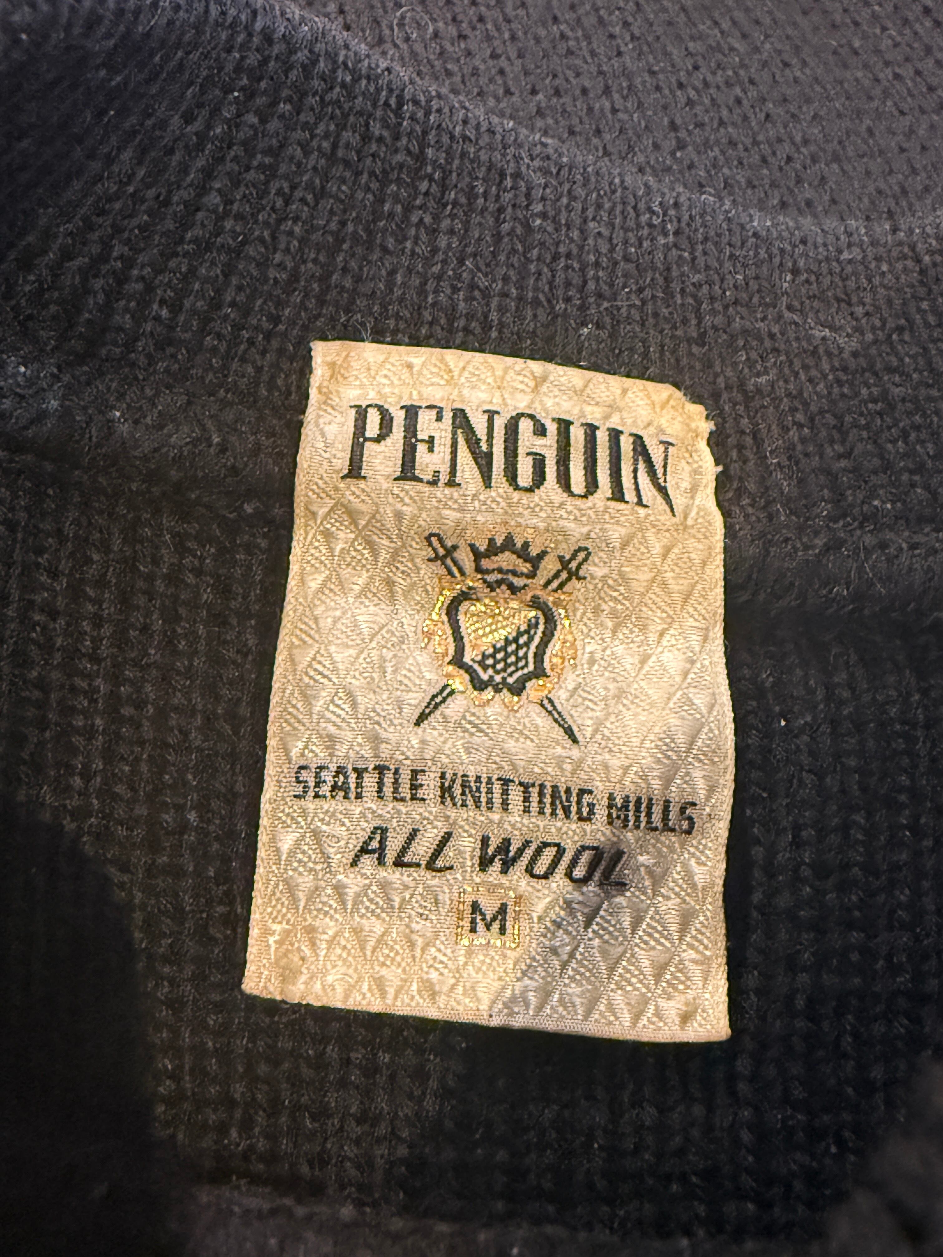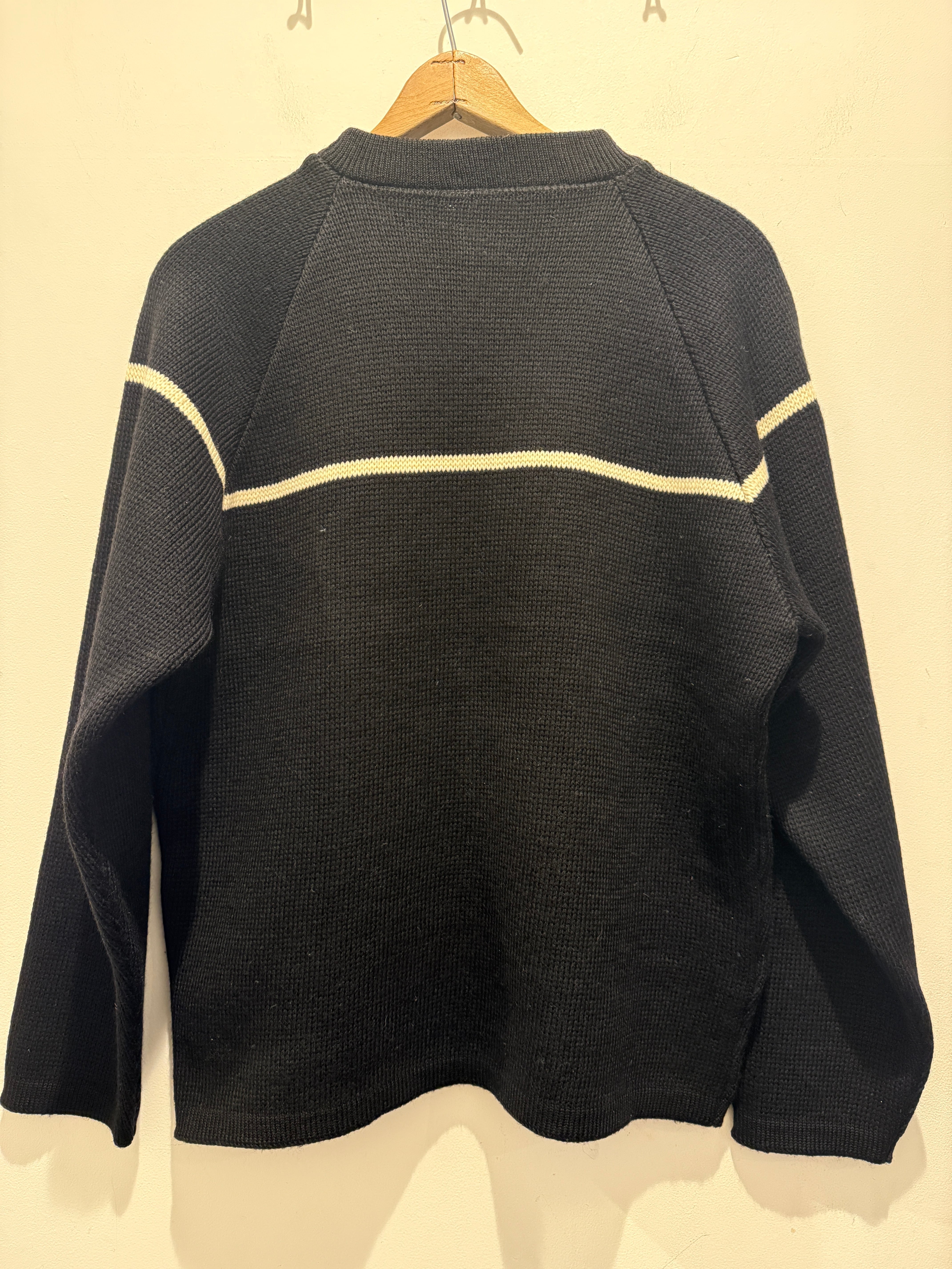 60年代ヴィンテージのブラックウールニットです。ブラックカラーにホワイトのラインが入るシンプルなデザインがとても良い1着です。ビンテージニット特有のウールがつまっていて厚みのある感じがとても良いですね。身幅もあってラグランスリーブと短めなリブが着用しやすくオススメなニットです。