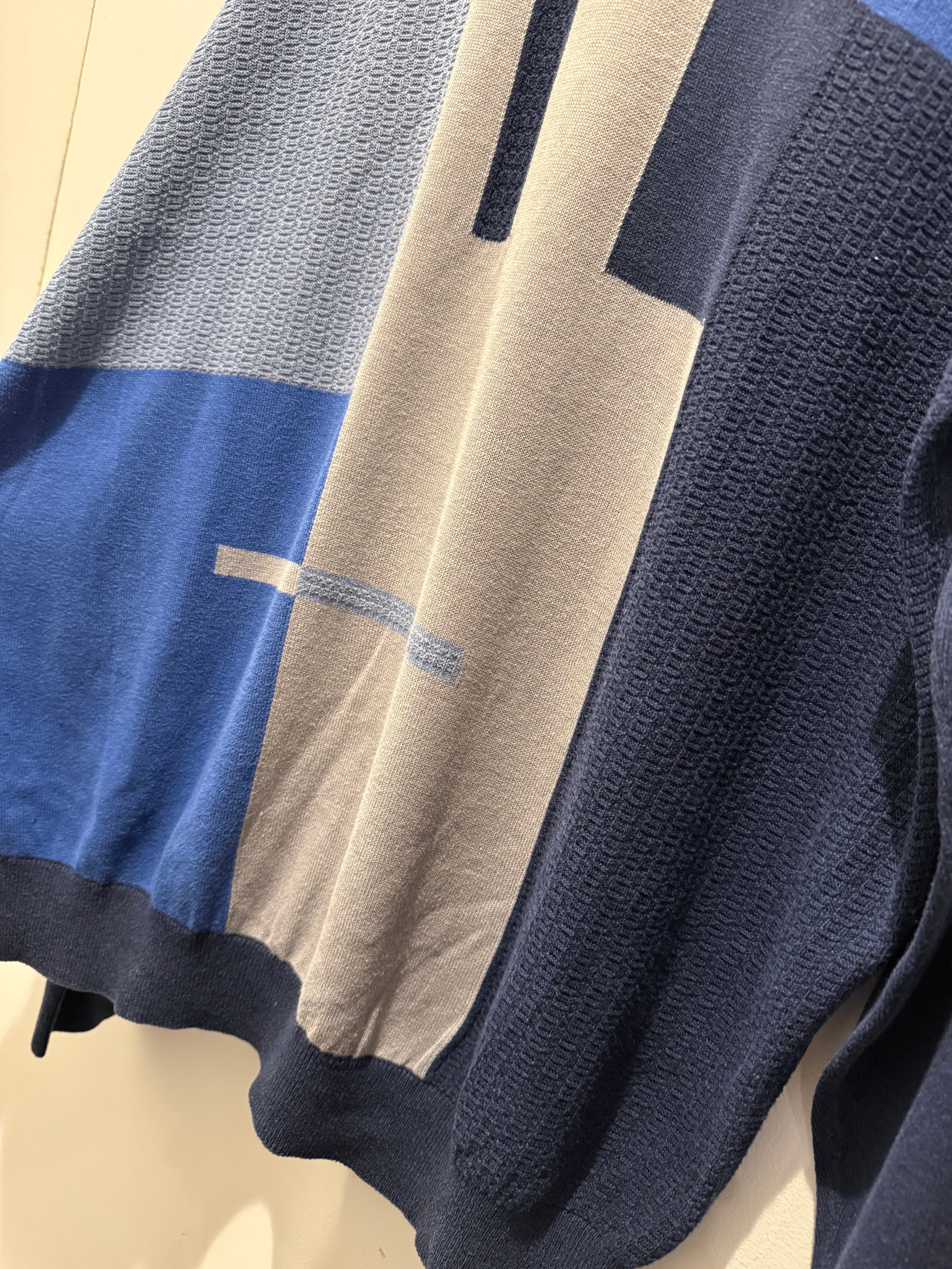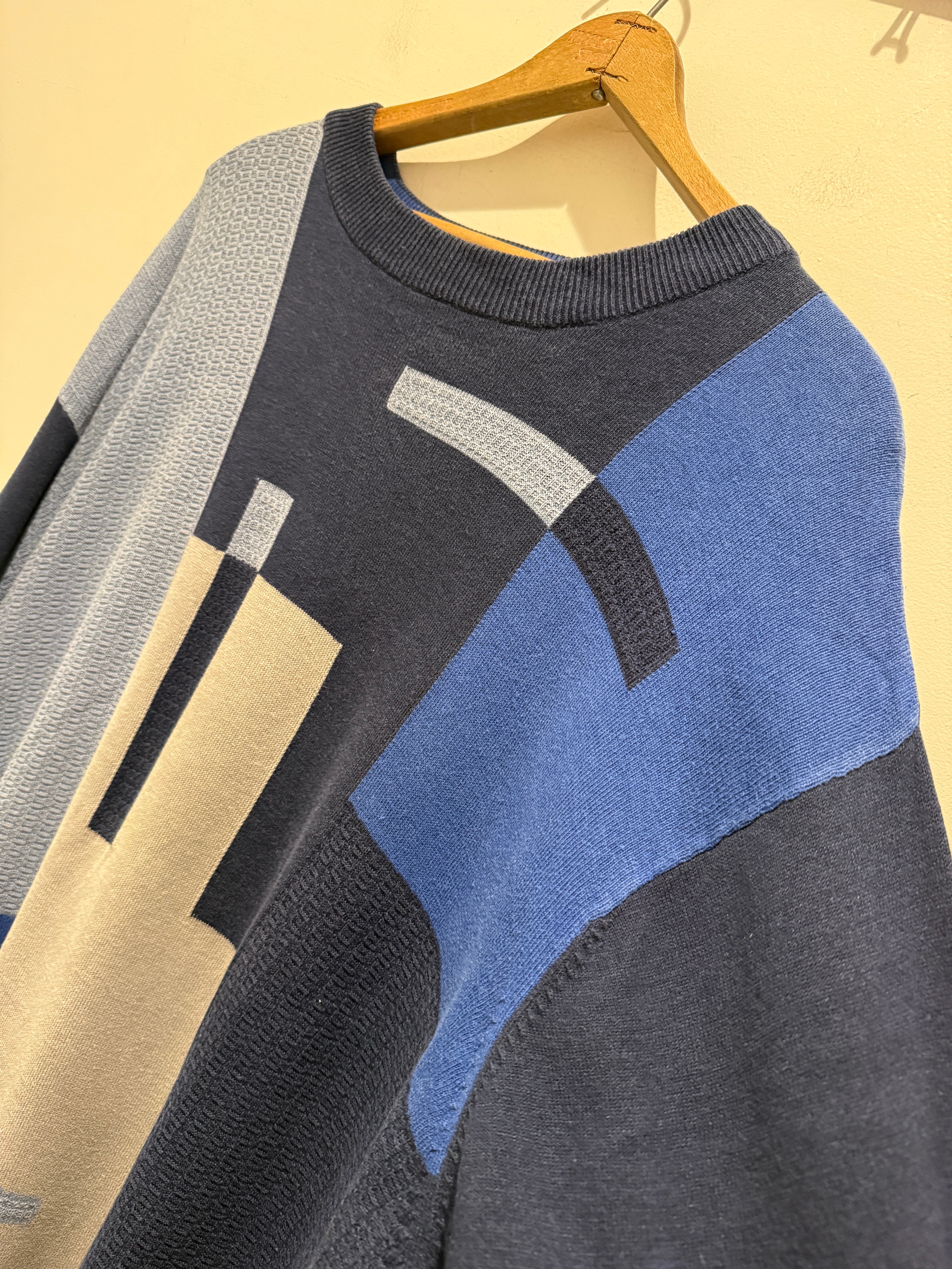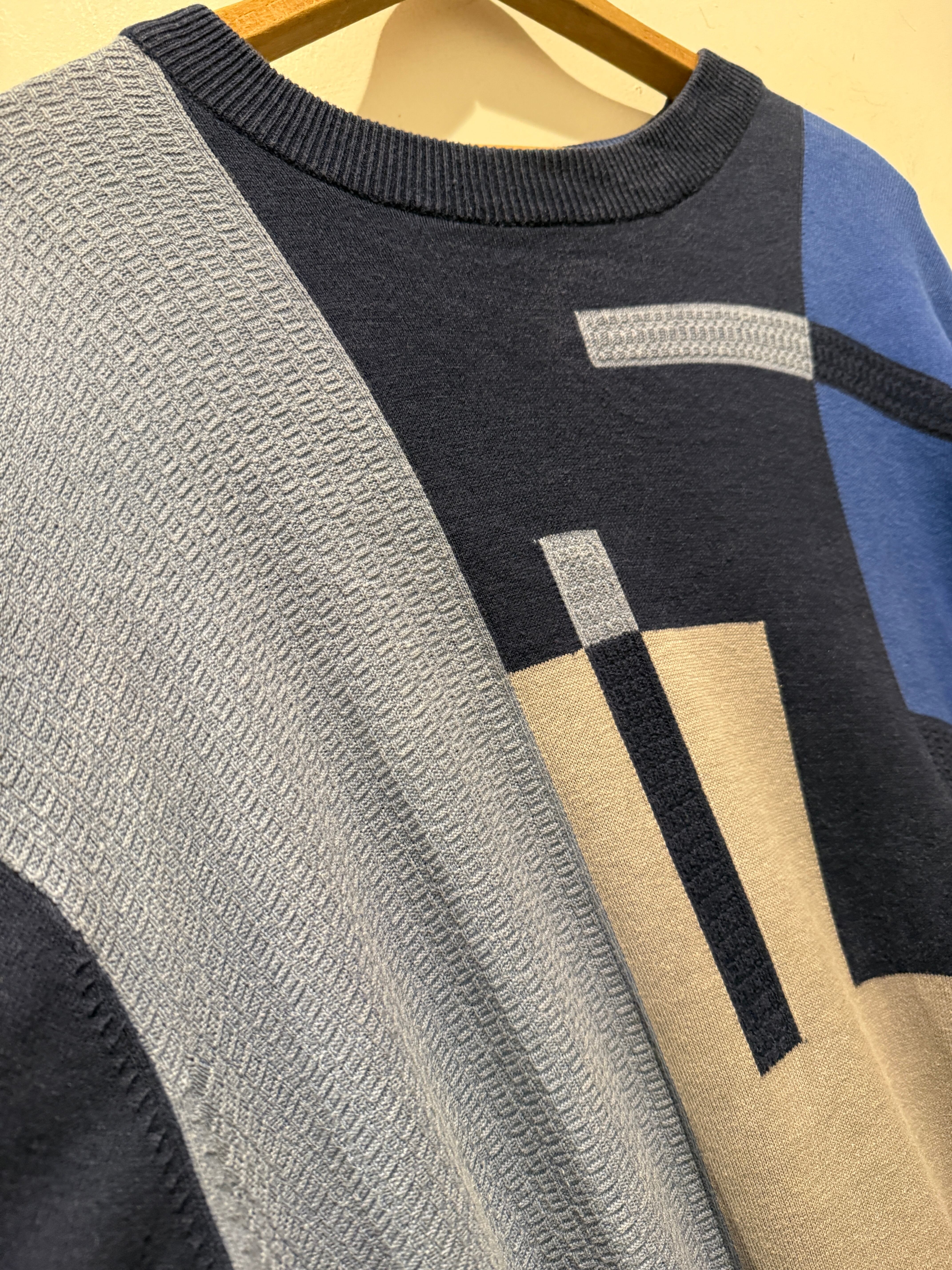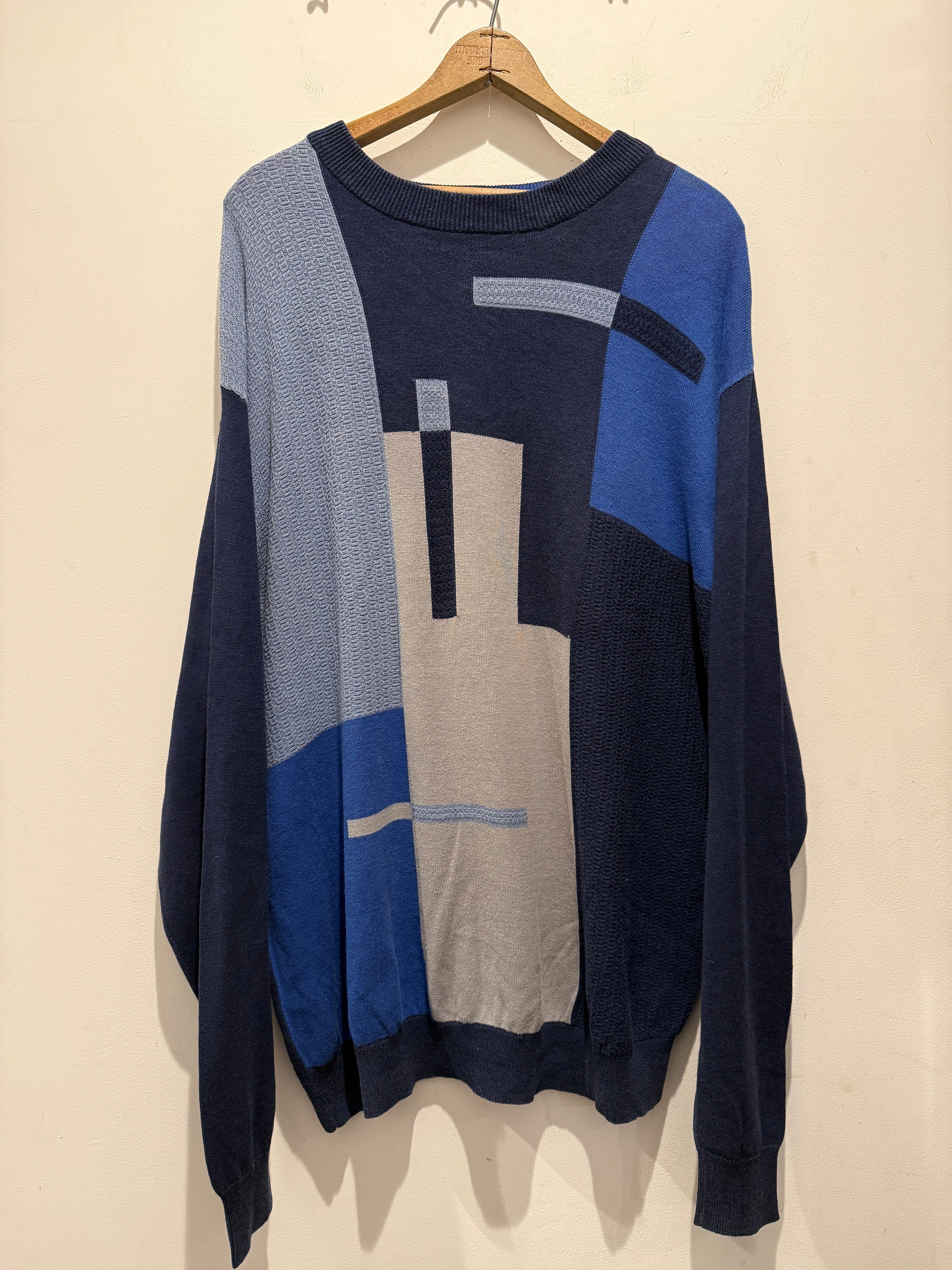 90年代〜2000年代プロテジェのデザインニットです。3Dニットで有名なprotégé。こちらはネイビーベースにアートの様なデザインがとても良くシルク70%×コットン30%となめらかな生地感もとても良い1着です。ニットですが薄手でカットソーの様にちかく着用した時に肩の落ち感もありオススメです。