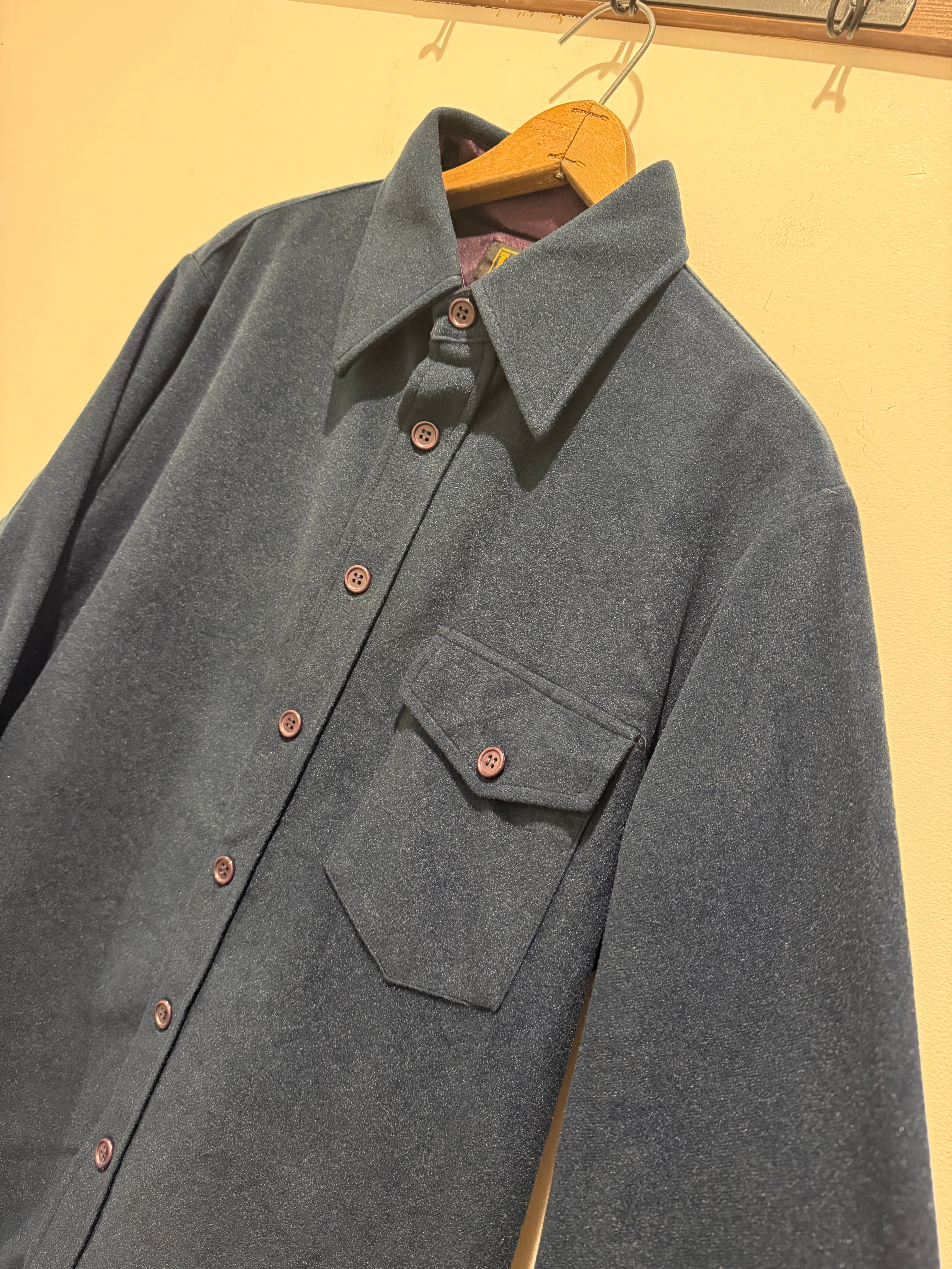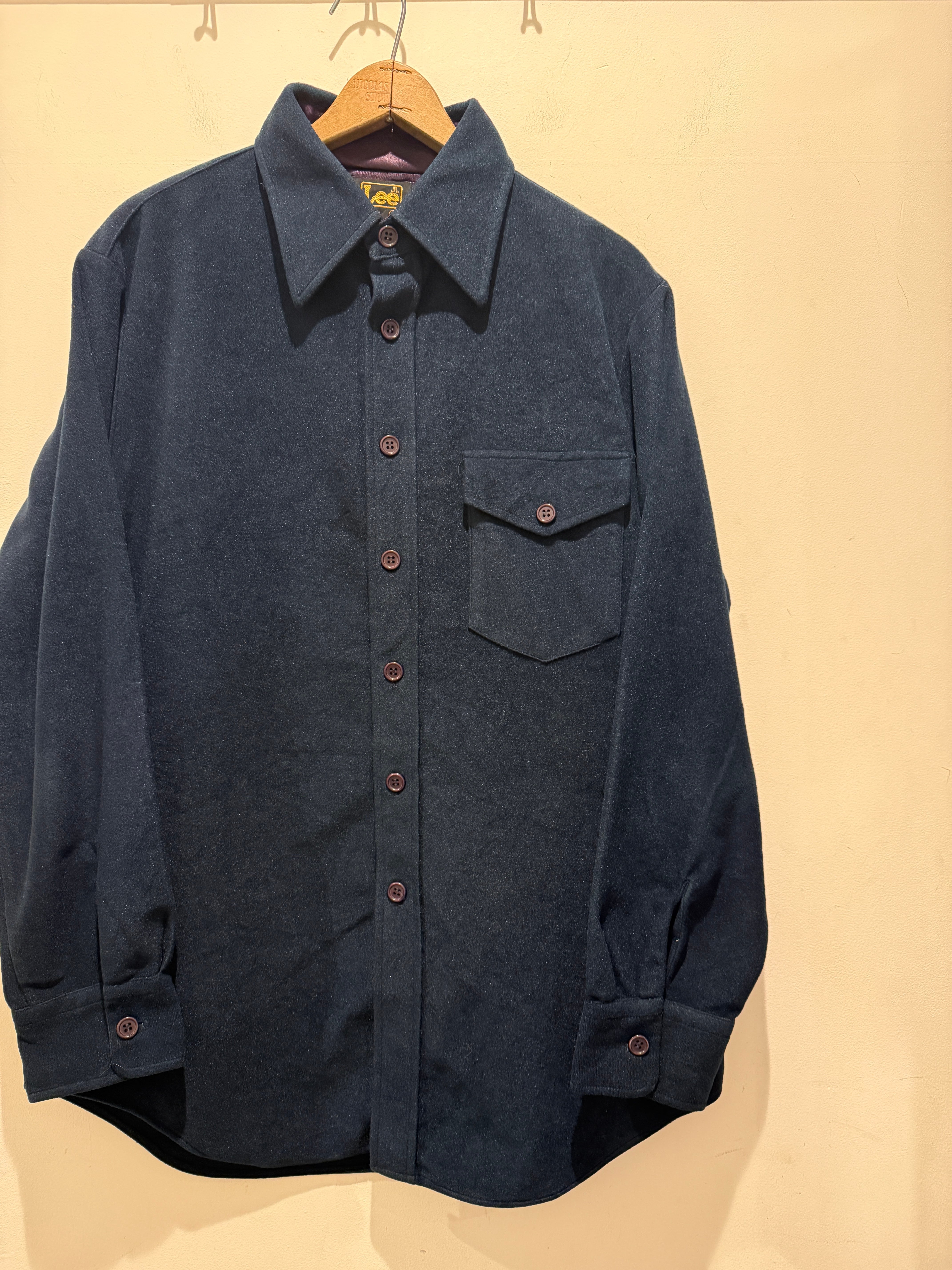 70年代アメリカ製リーのフリースシャツです。ダークネイビーカラーにフラップ付きの片ポケットとシンプルなデザインですが、珍しいフリース素材と面白い1着となります。フリースもまだフカフカで裏地などもしっかり作り込まれています。中々な珍品アイテムですがしっかりアメリカ製のLeeアイテムとオススメです。