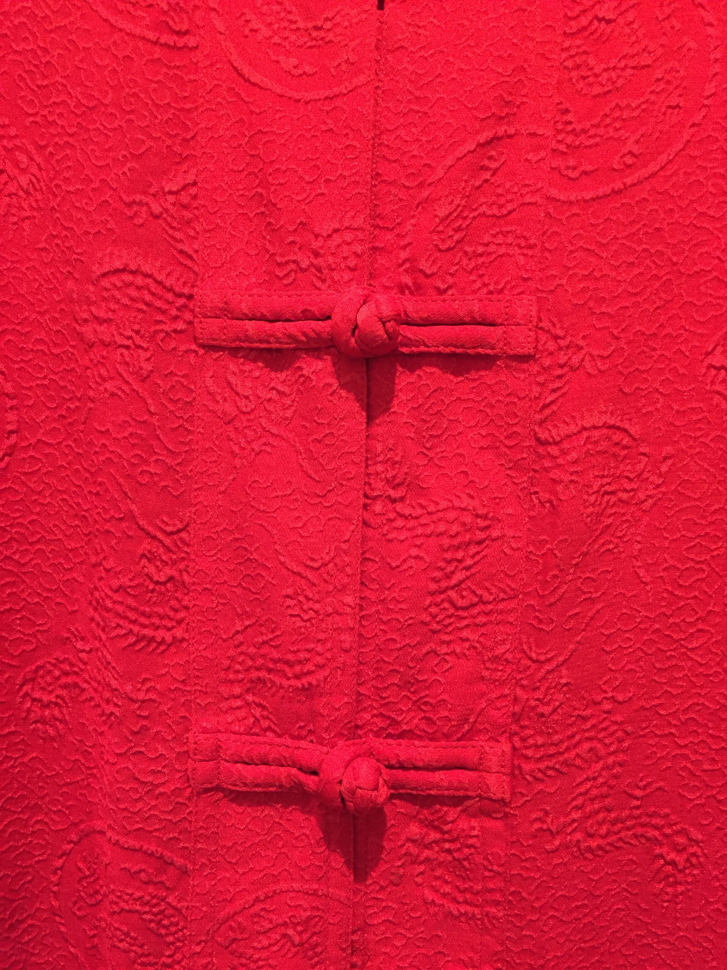 カラーは発色の良いレッドです。一見普通のチャイナシャツのように見えますが良く見るとドラゴンのデザインが立体的に描かれています。素材もシルク100%と肌触りも良くオススメです。ジャケットやコートのインナーにも映える1着ですね。