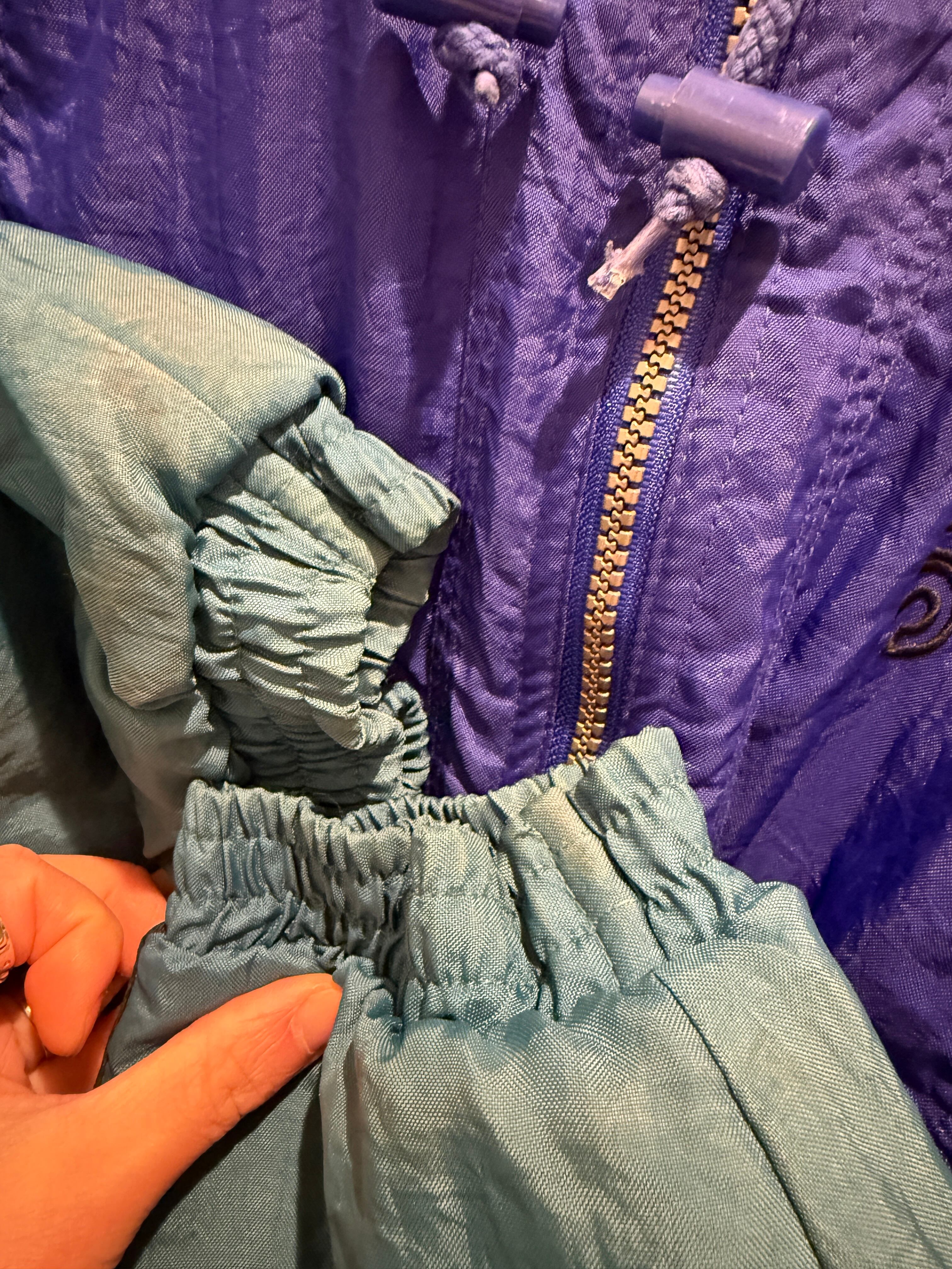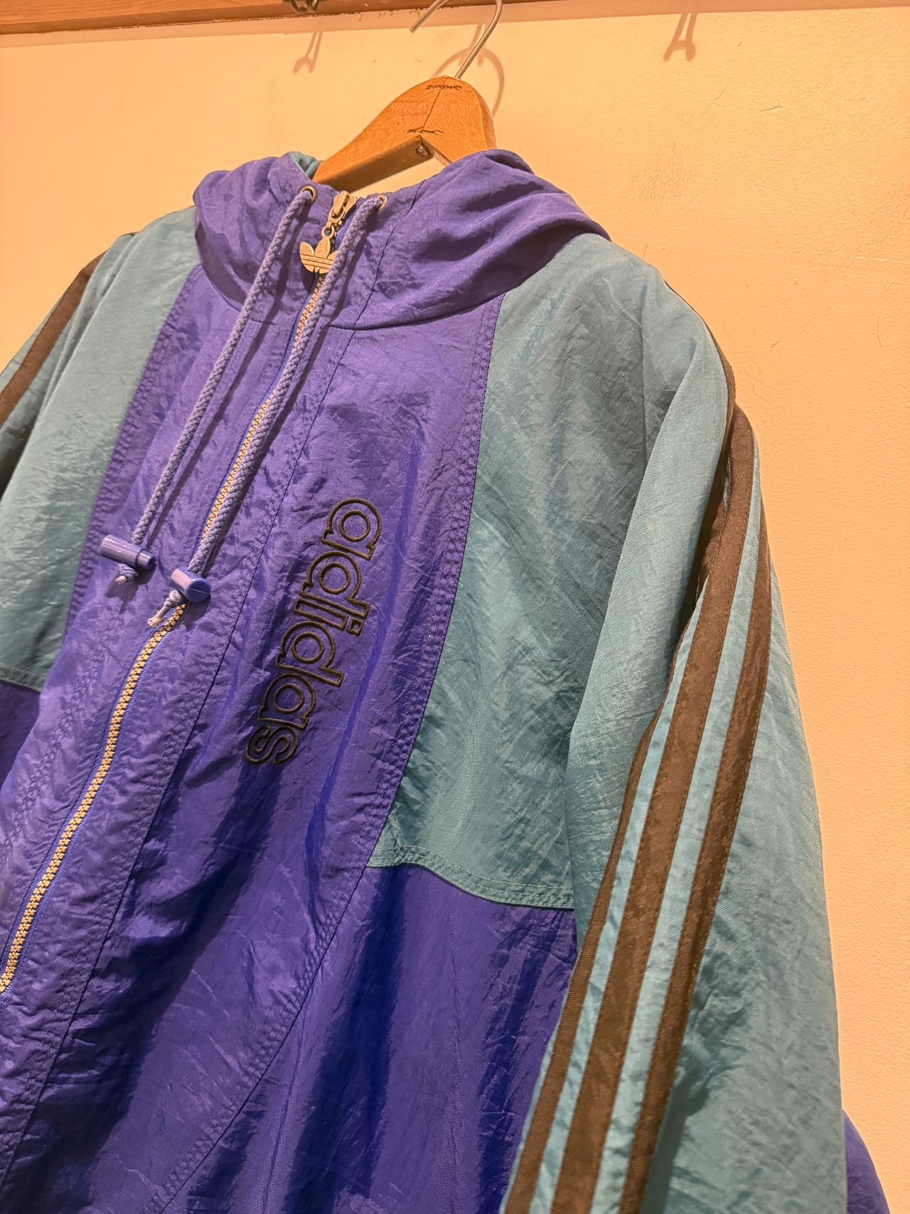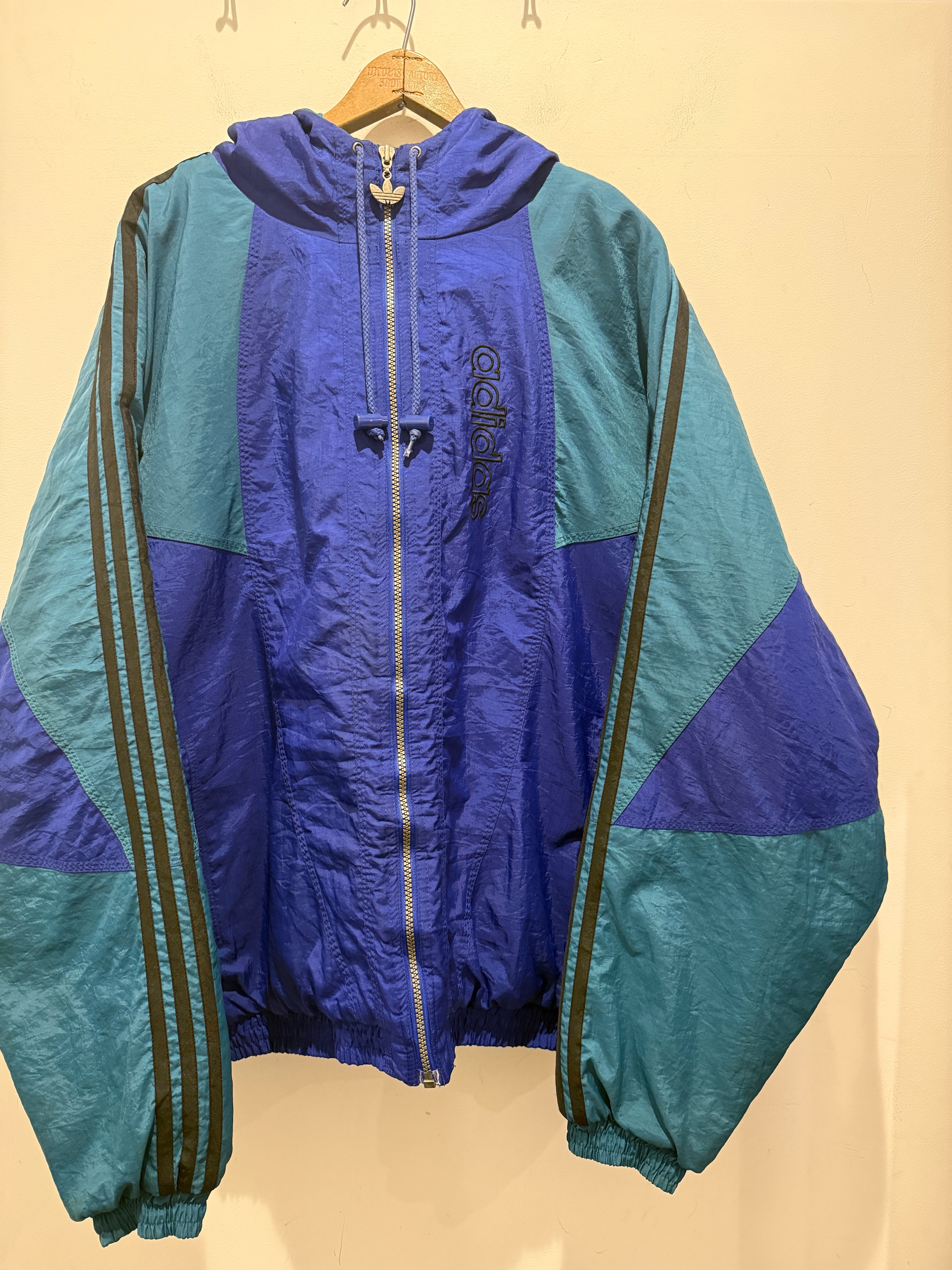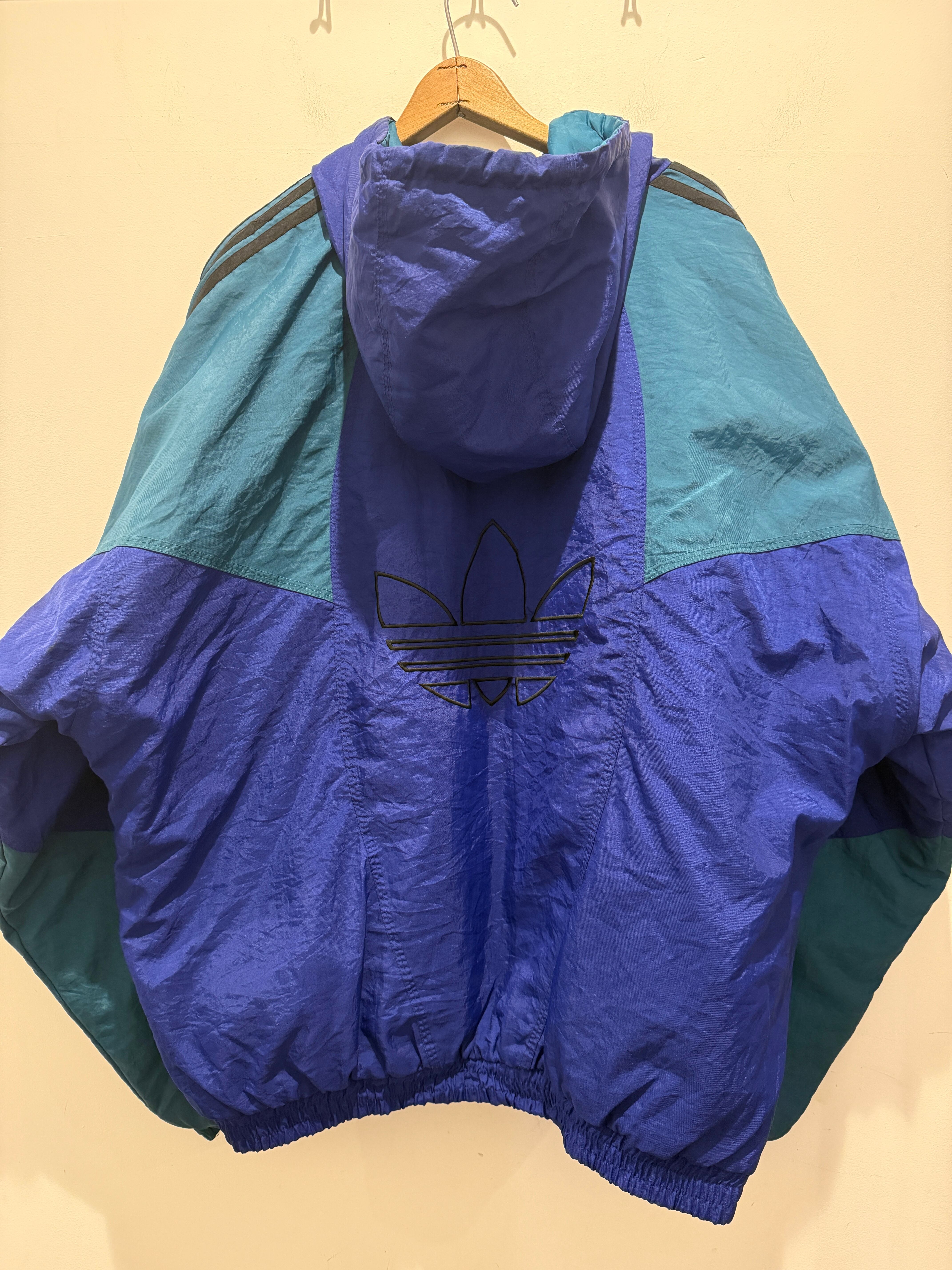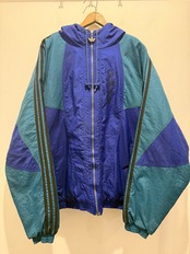 90年代アディダスのナイロンジャケットです。ブルー×グリーンの配色がとても良くフード付きのナイロンジャケットとなります。薄手の物では無く中綿入りのしっかりとした生地感となります。欠損しがちなトレファイルのジッパーがしっかりあるのもポイントですね。身幅たっぷりで着丈長すぎないシルエットも良くオススメです。