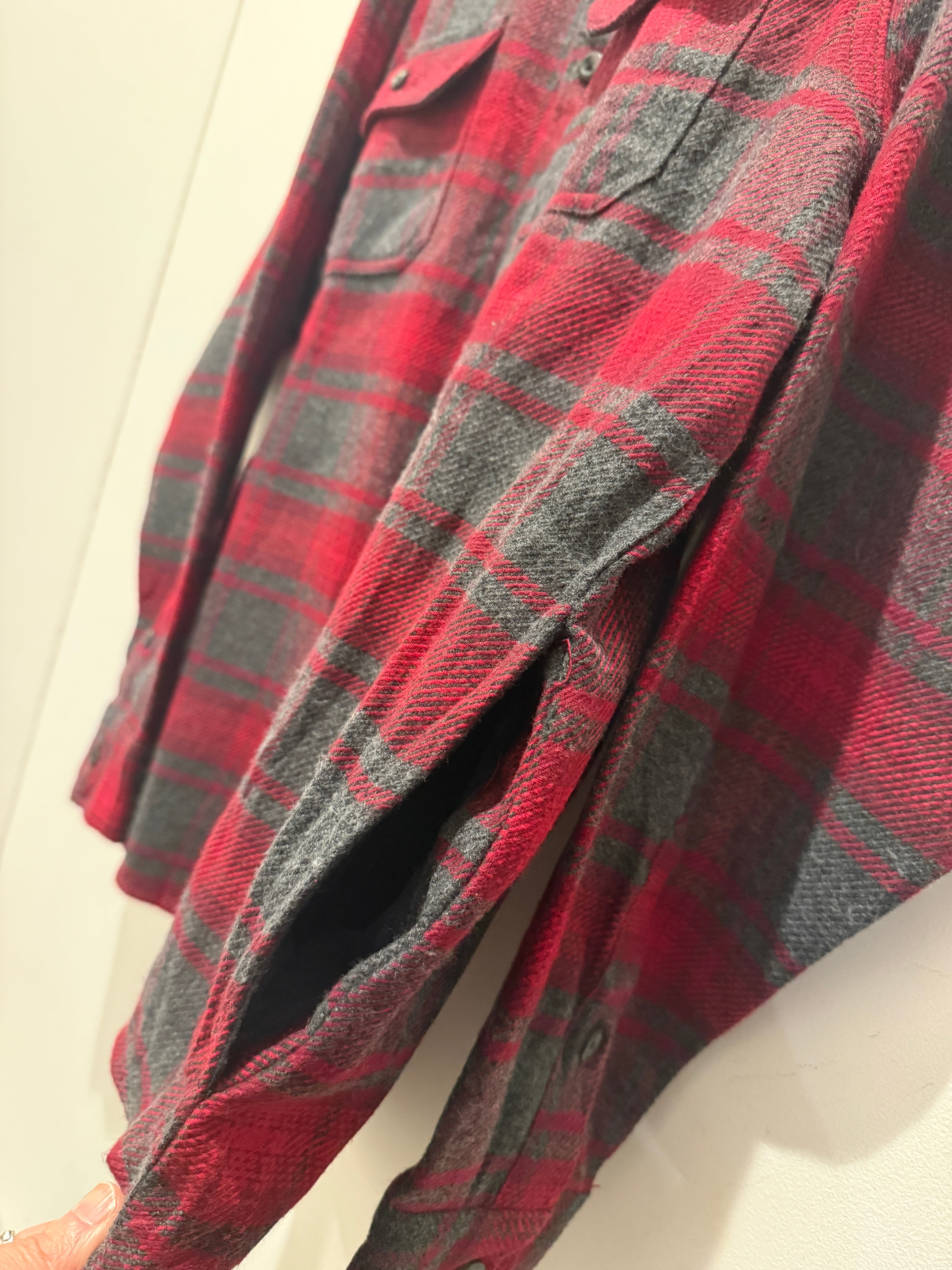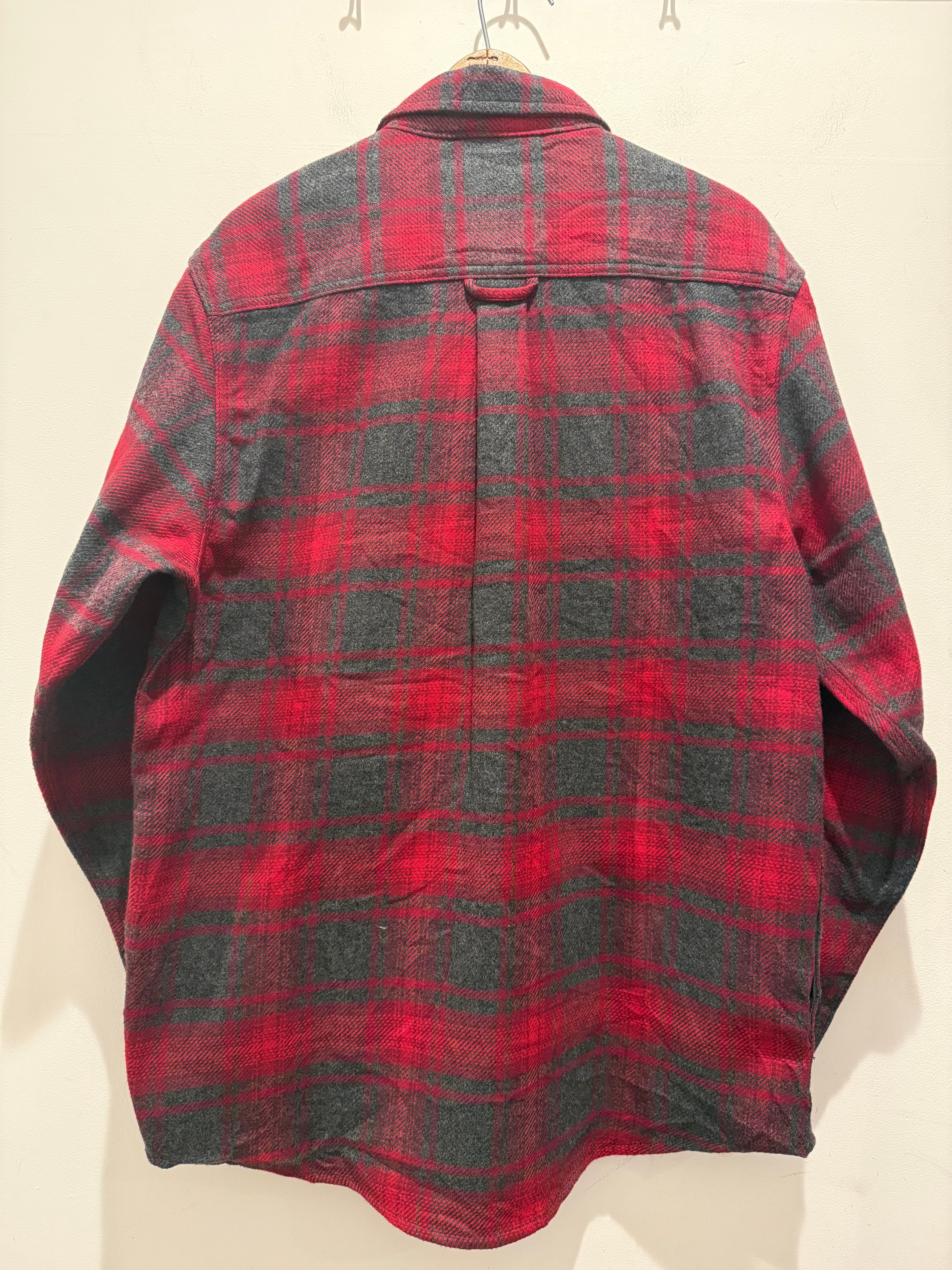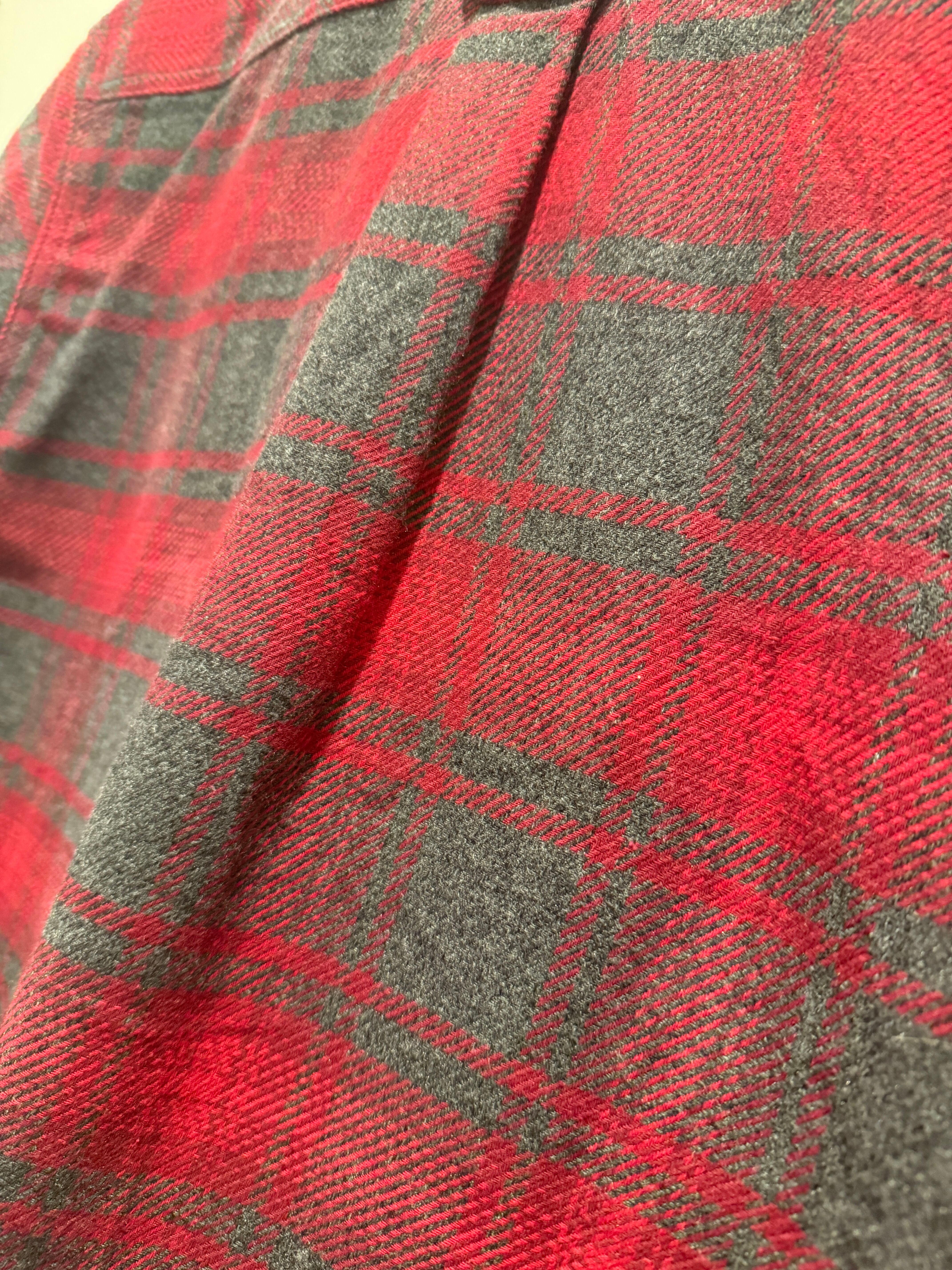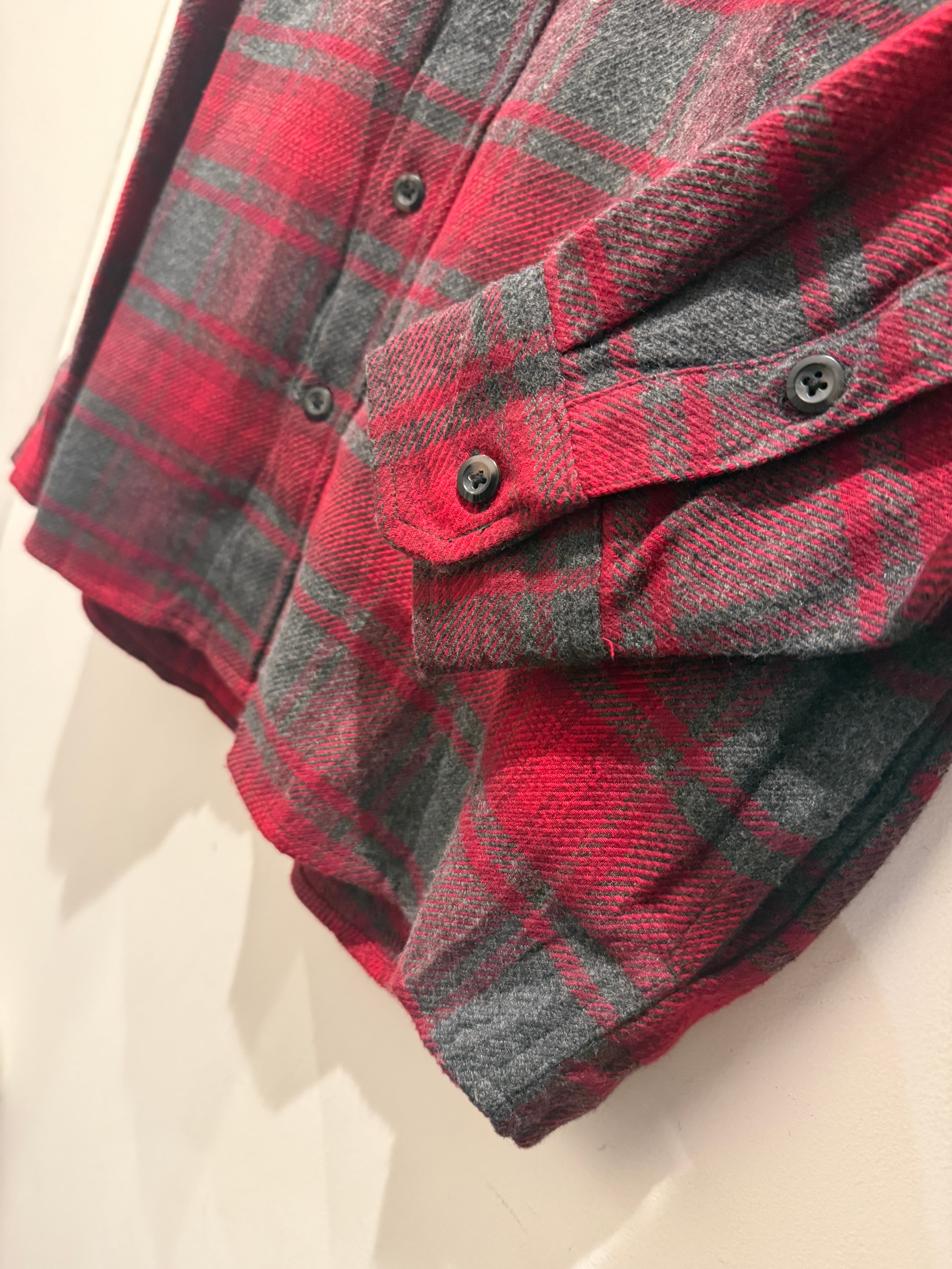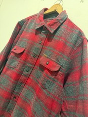 90年代〜2000年代オービスのネルシャツです。レッド×グレーでオンブレっぽくなっているのがとても良い1着です。肉厚な生地感とフラップ付きのポケットも良いですね。またこちらはサイドポケットがあり、手を入れる事も可能で実用的にも最高なディテールです。Mサイズ表記ですが少し大きめな作りとユニセックスでオススメなネルシャツです。