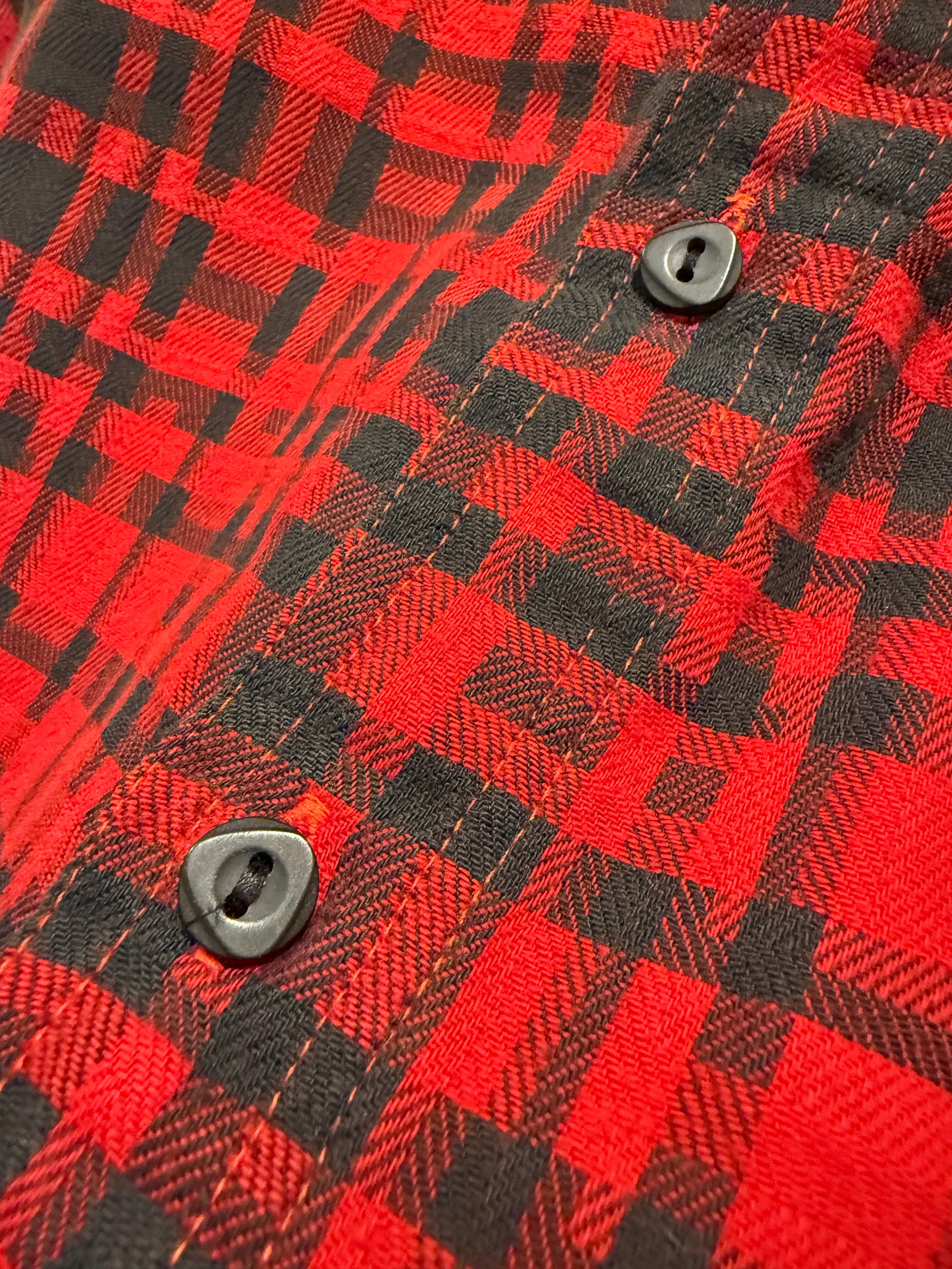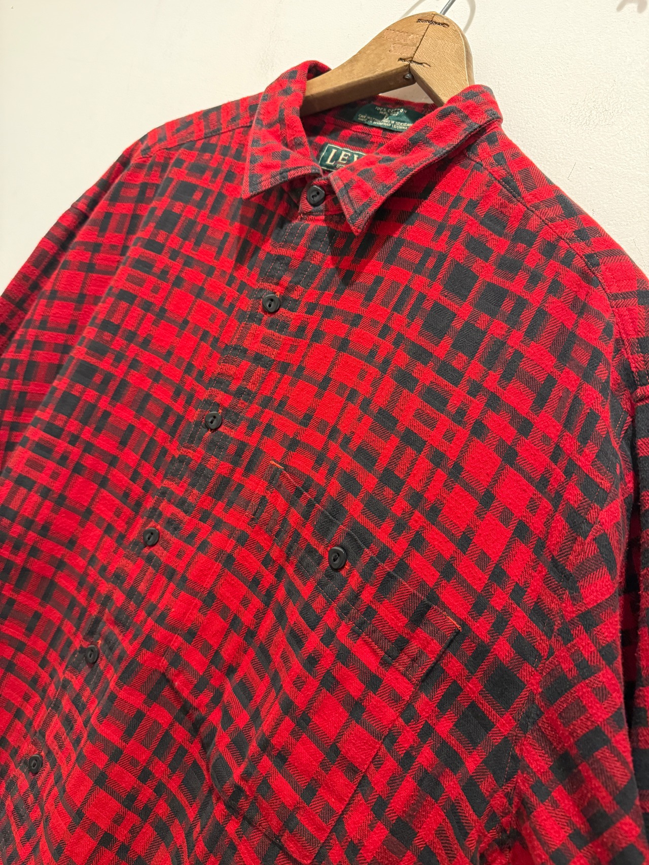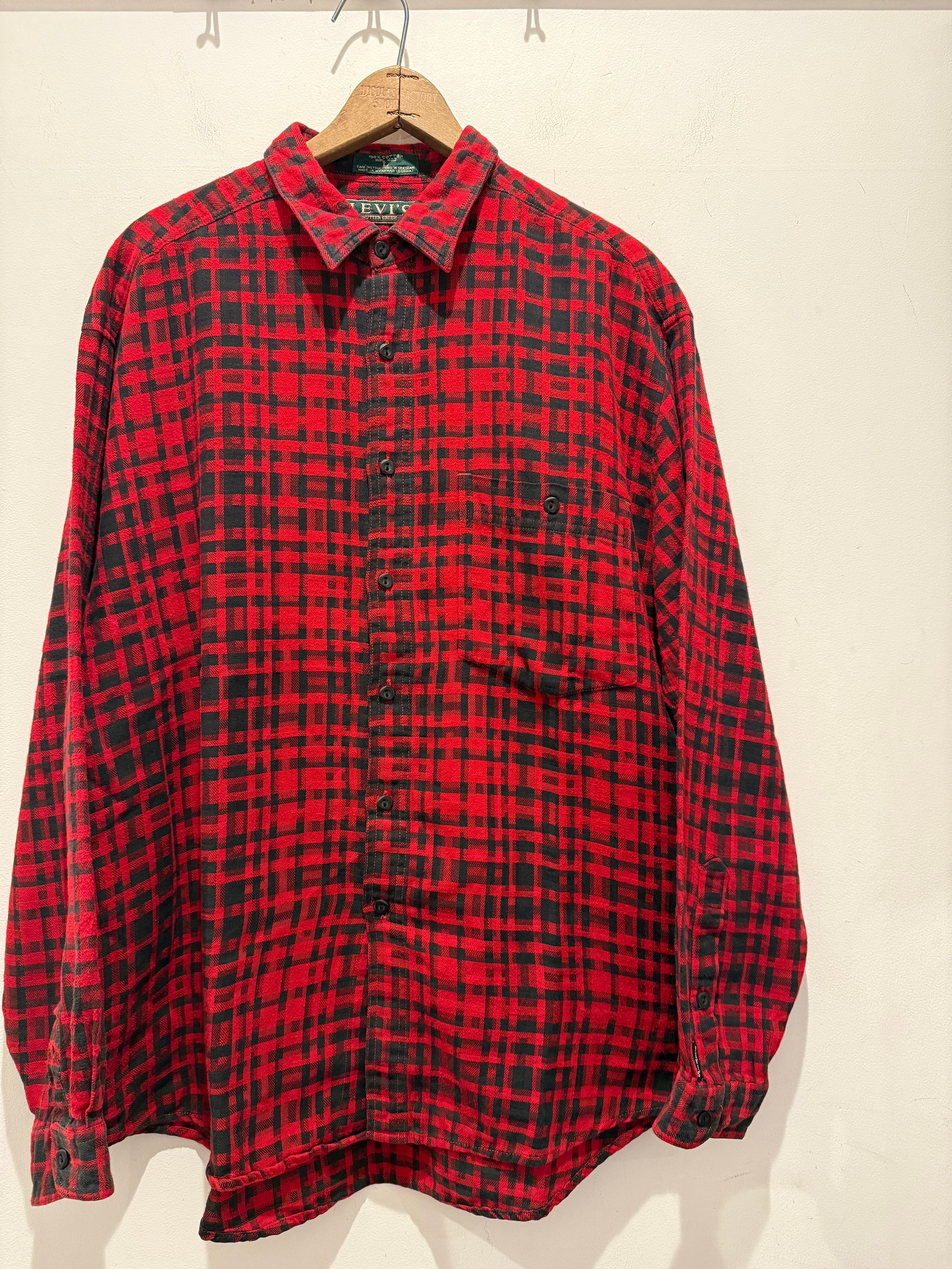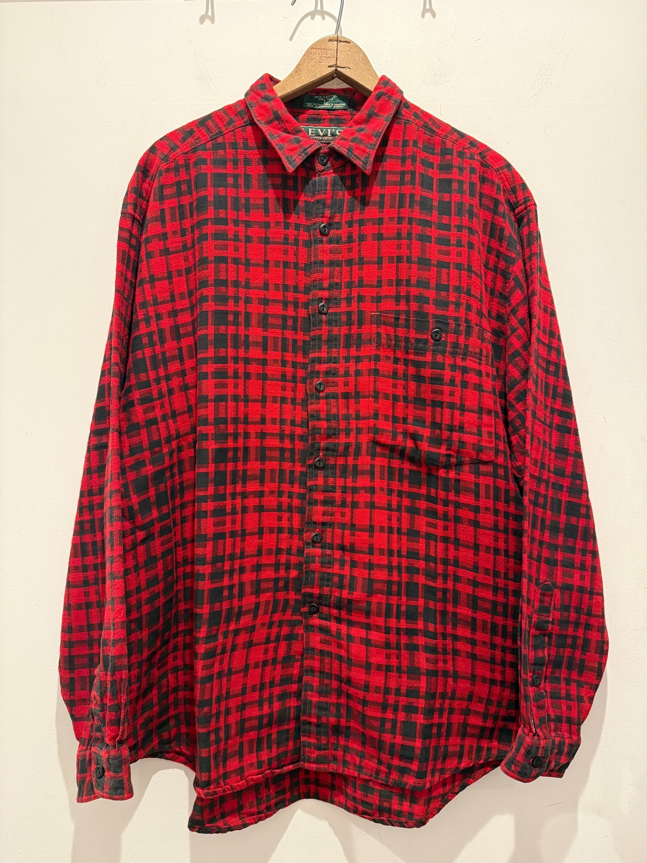 90年代リーバイスのフランネルシャツです。薄手のライトネルでレッド×ブラックの幾何学的なチェックパターンが面白い1着です。ボタンの丸と三角が合わさったデザインや袖に付くLEVI'Sのタブなど細かいところも凝っていますね。ライトネルで着心地も良くオススメです。