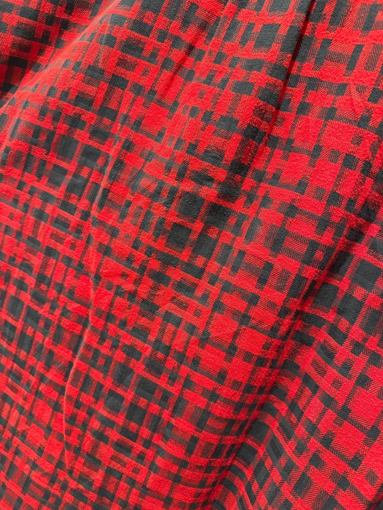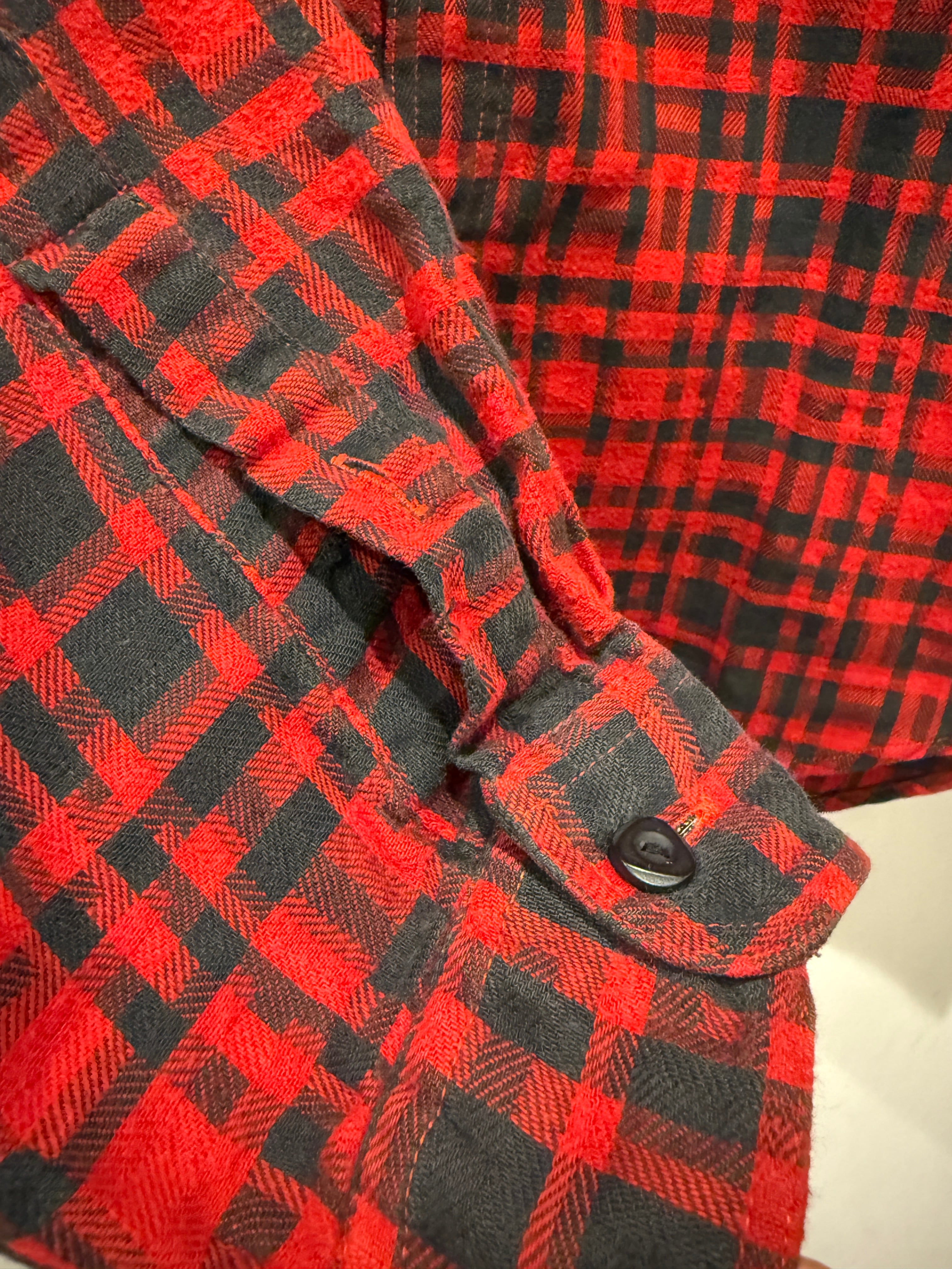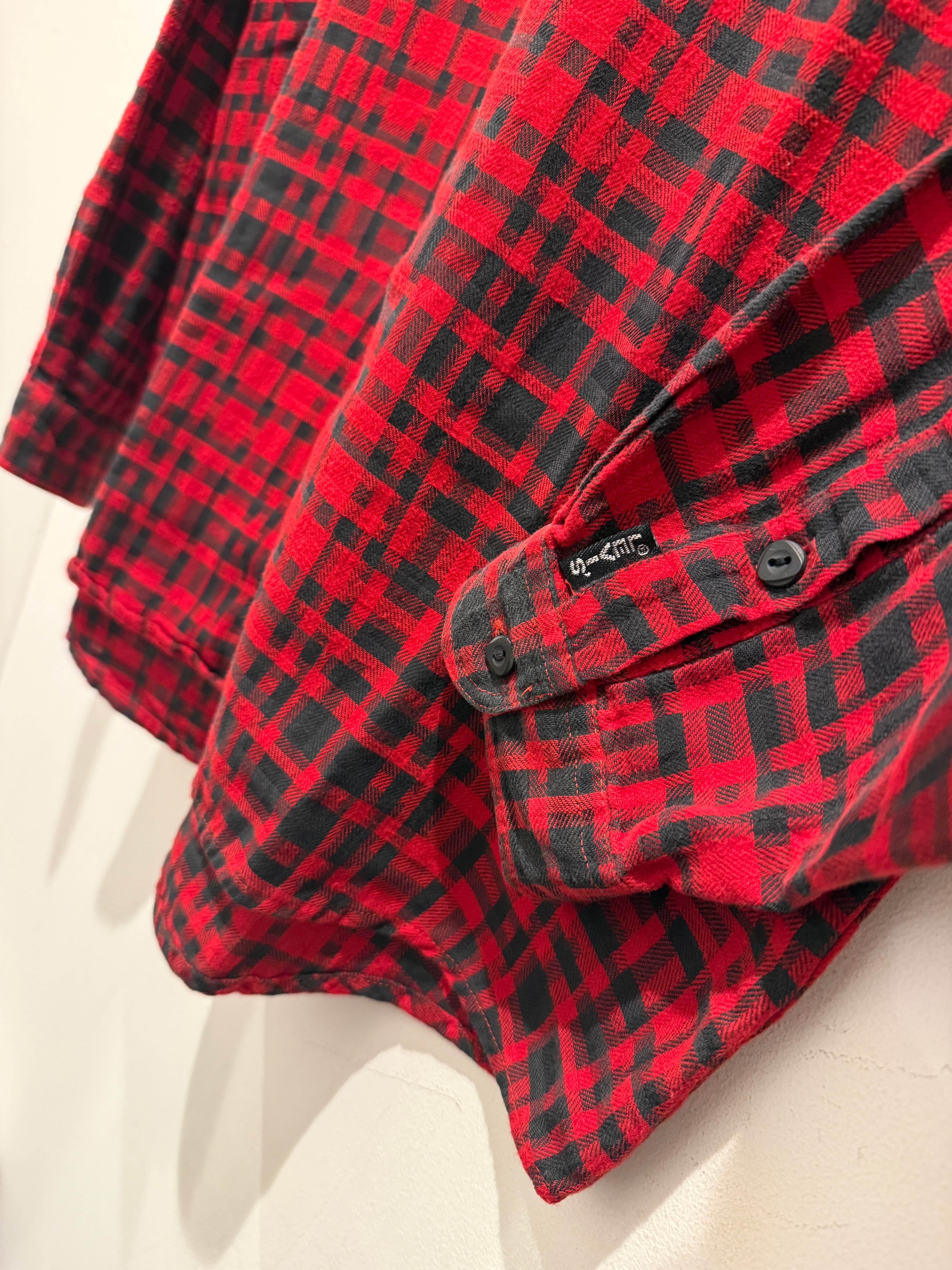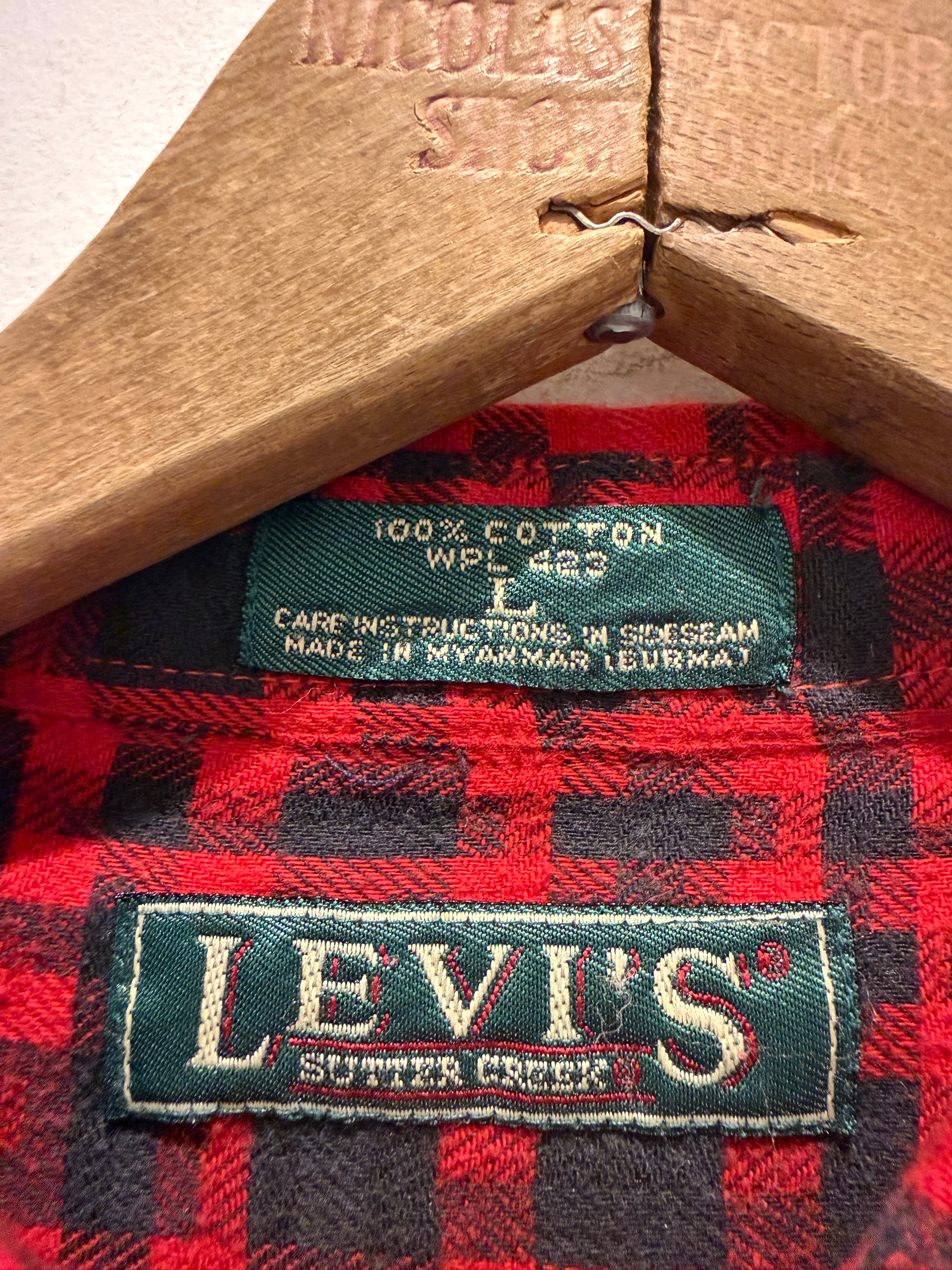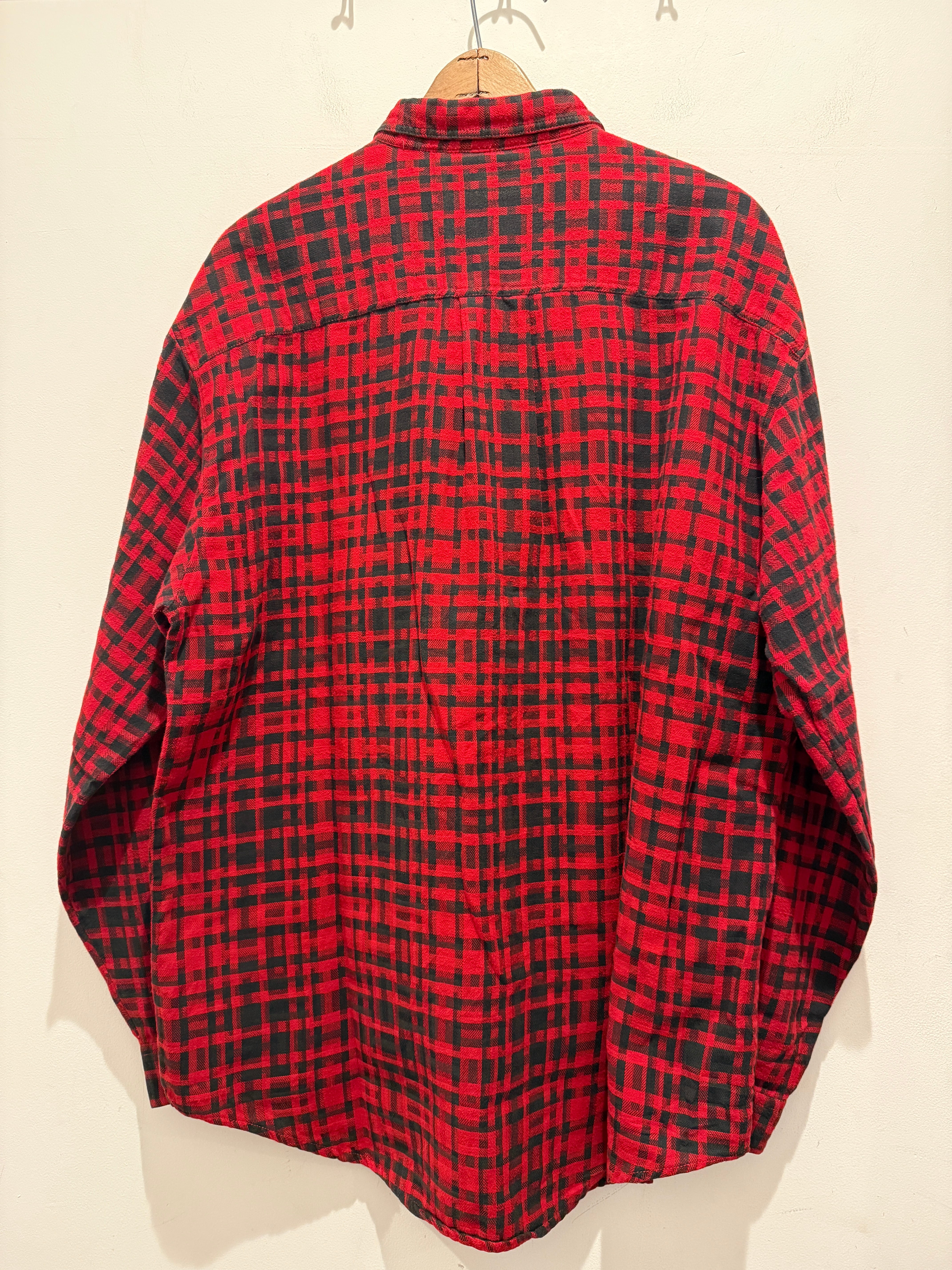 90年代リーバイスのフランネルシャツです。薄手のライトネルでレッド×ブラックの幾何学的なチェックパターンが面白い1着です。ボタンの丸と三角が合わさったデザインや袖に付くLEVI'Sのタブなど細かいところも凝っていますね。ライトネルで着心地も良くオススメです。