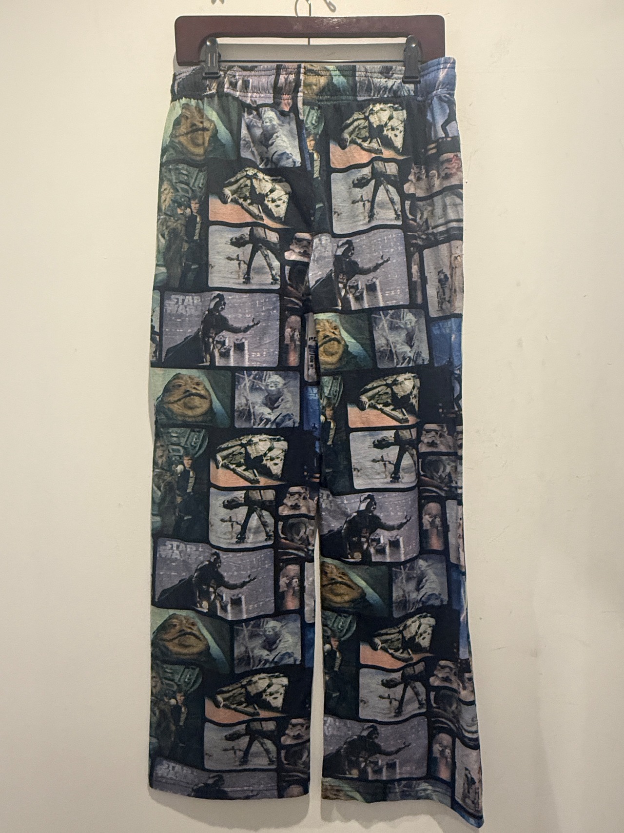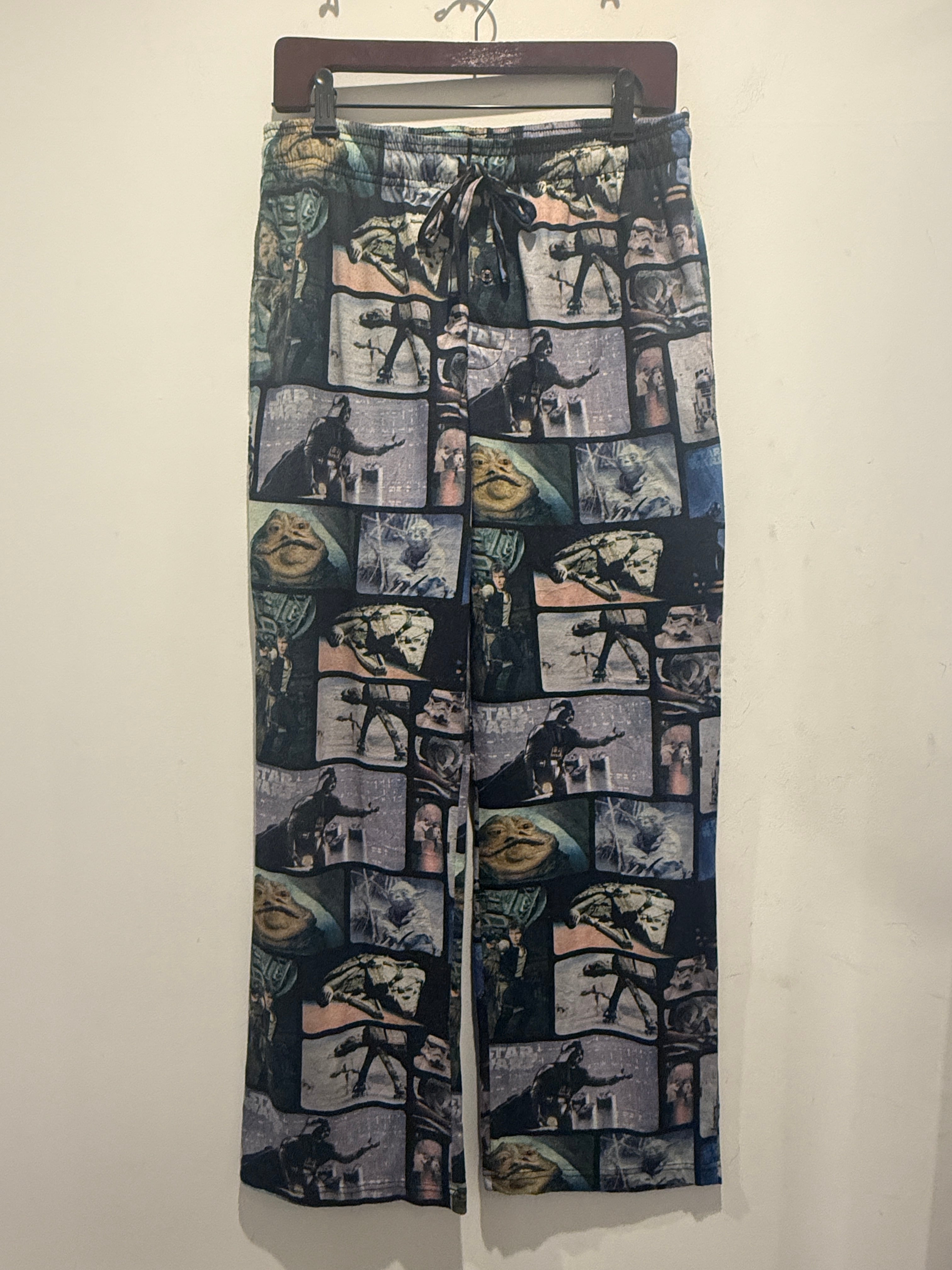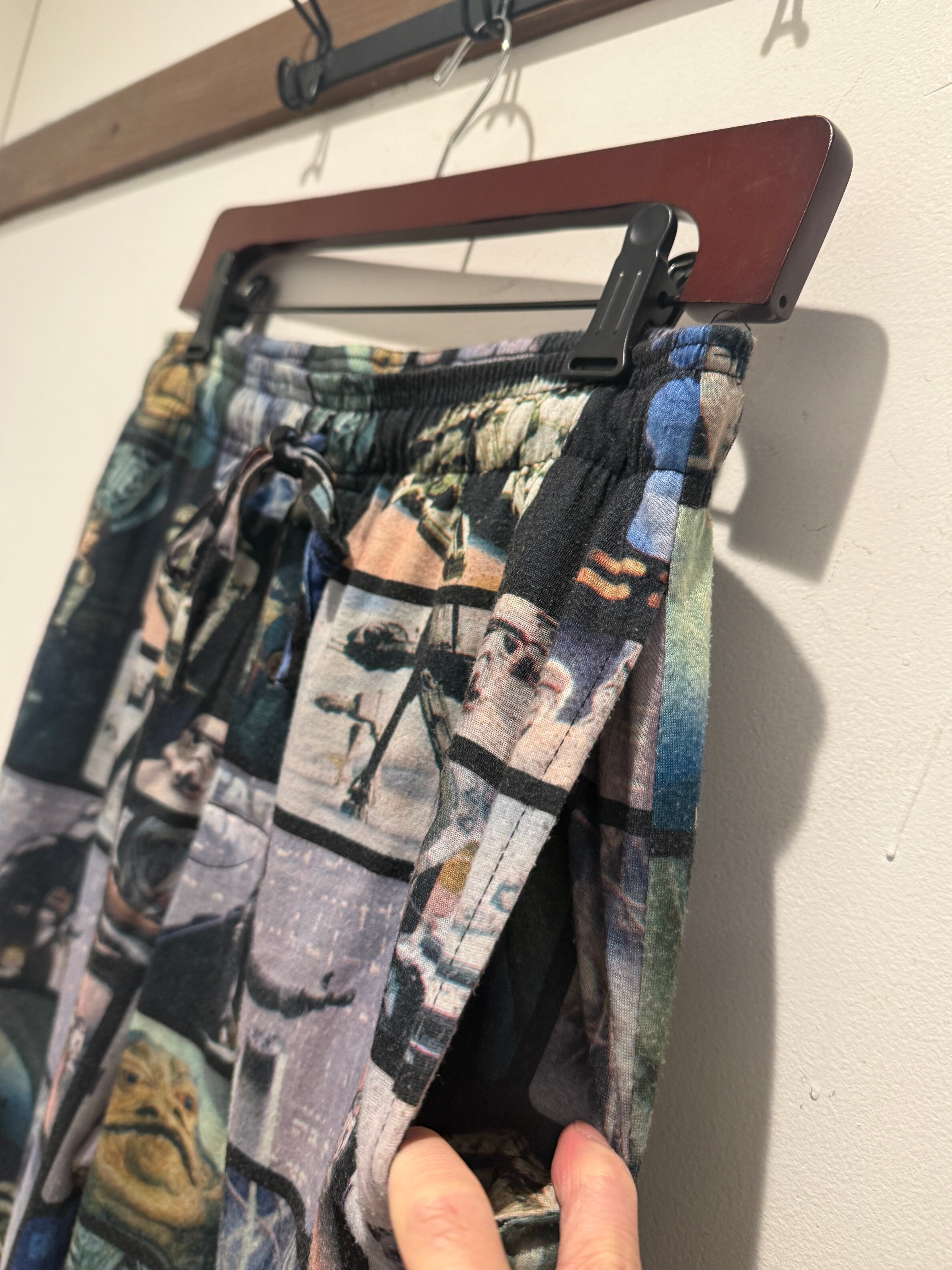 スターウォーズの映画柄イージーパンツです。ダースベイダーやタイトルのみのイージーパンツは良く見かけますがこちらはフォトのムービーパターンの総柄デザインと中々見ないパターンとなります。初期のスターウォーズな感じがとても良いですね。しっかりサイドポケットがあり、ウエストがゴムと紐で調整出来て楽チンに履けるのもポイントでオススメです。