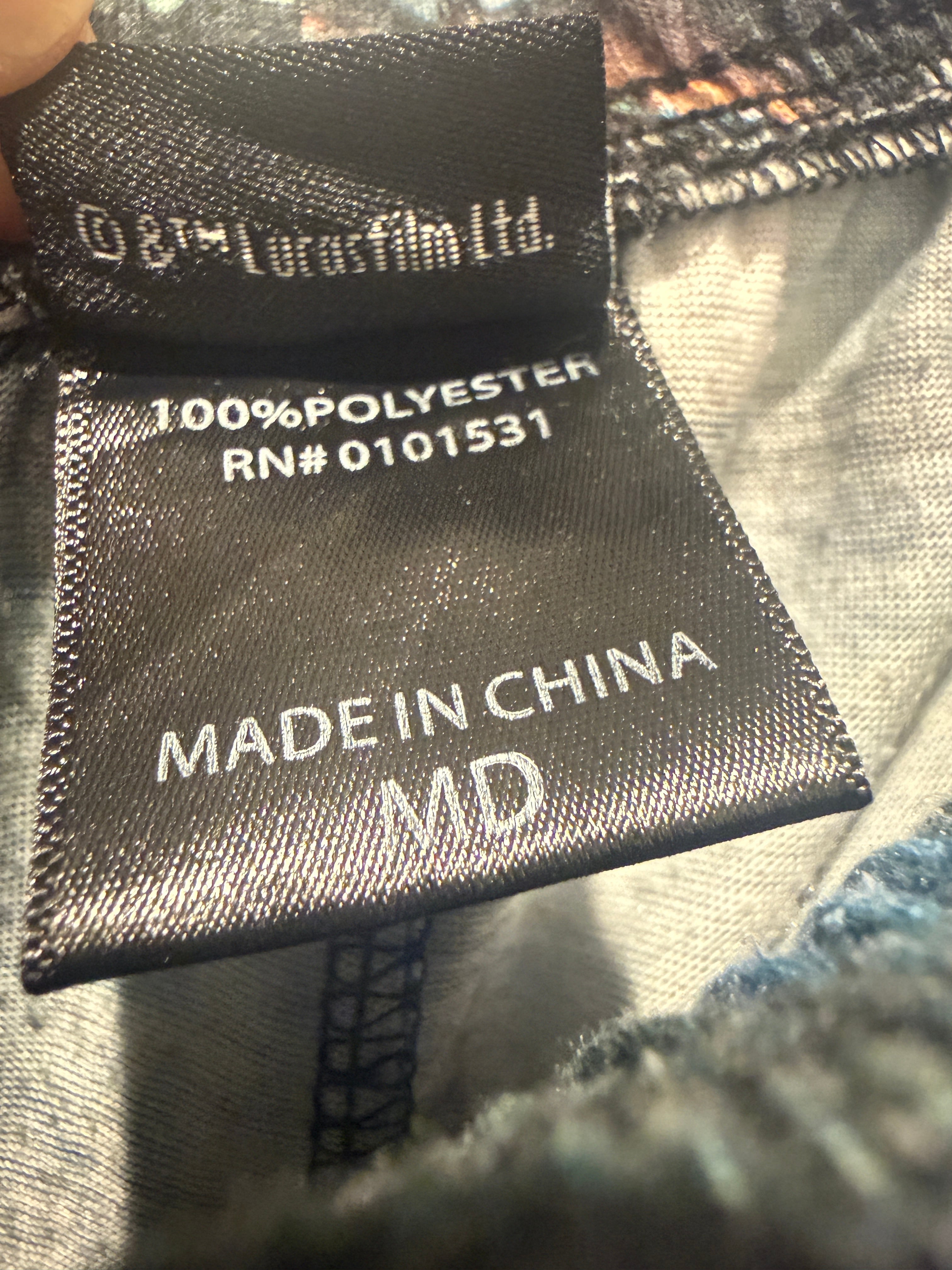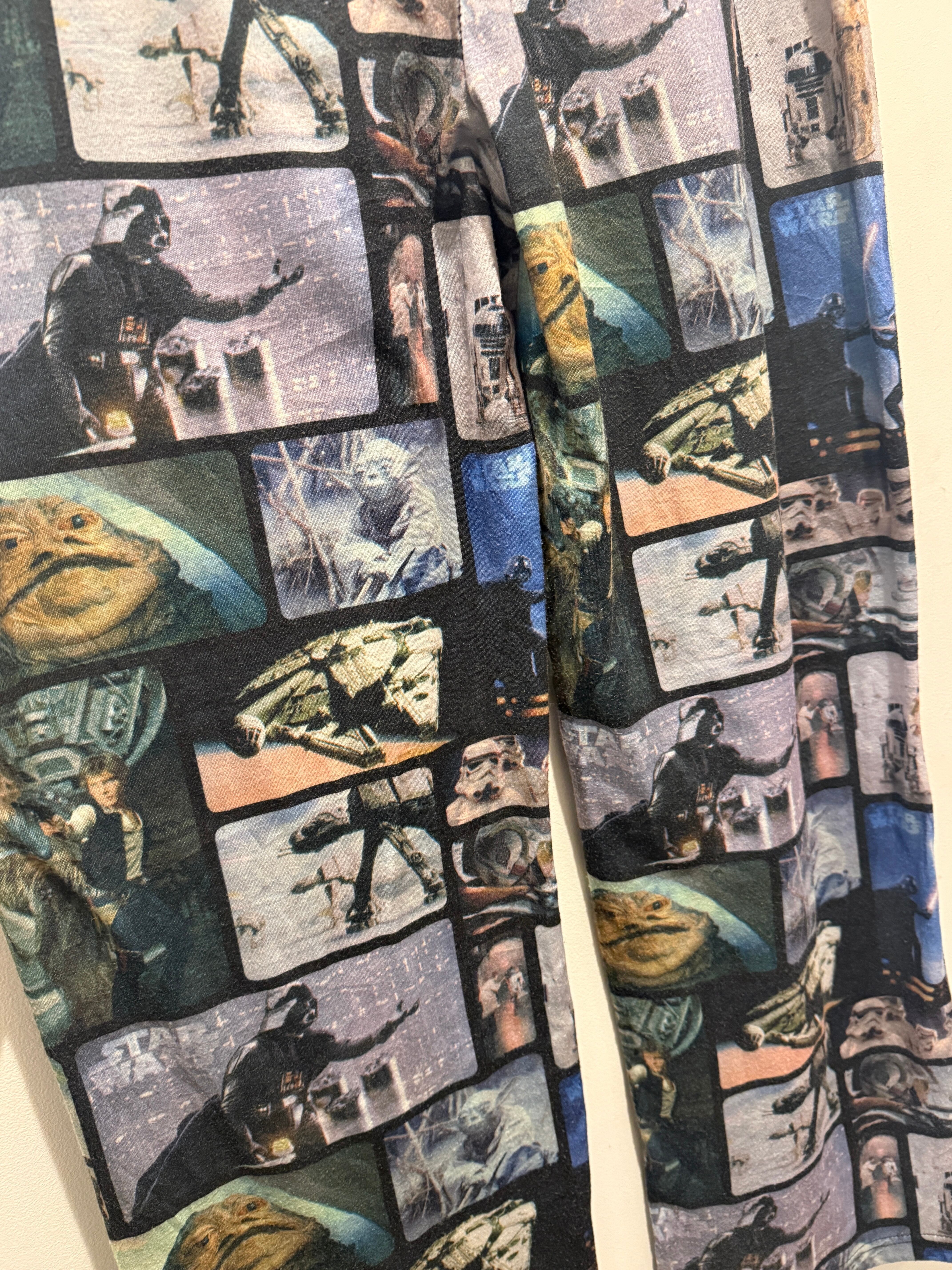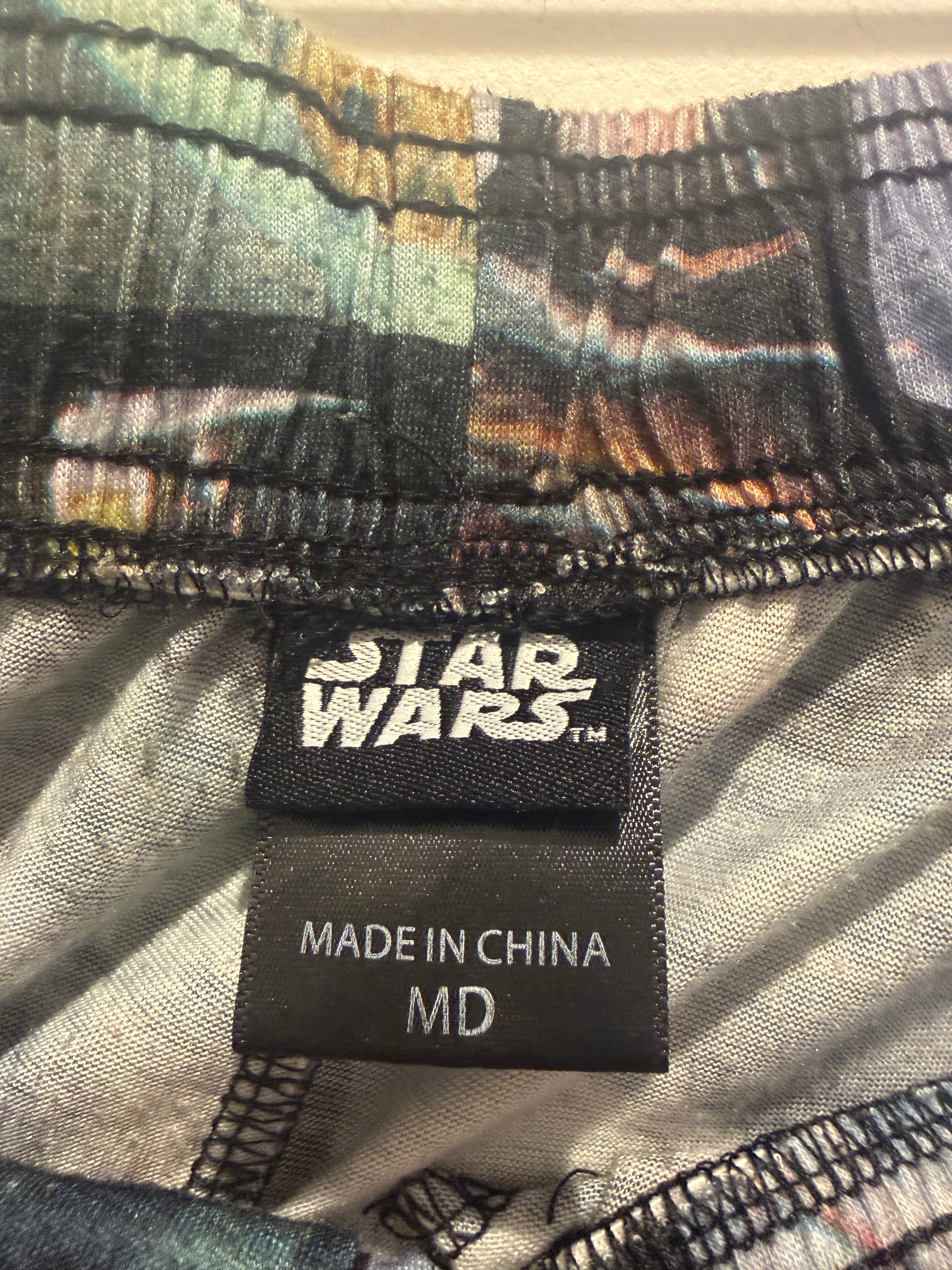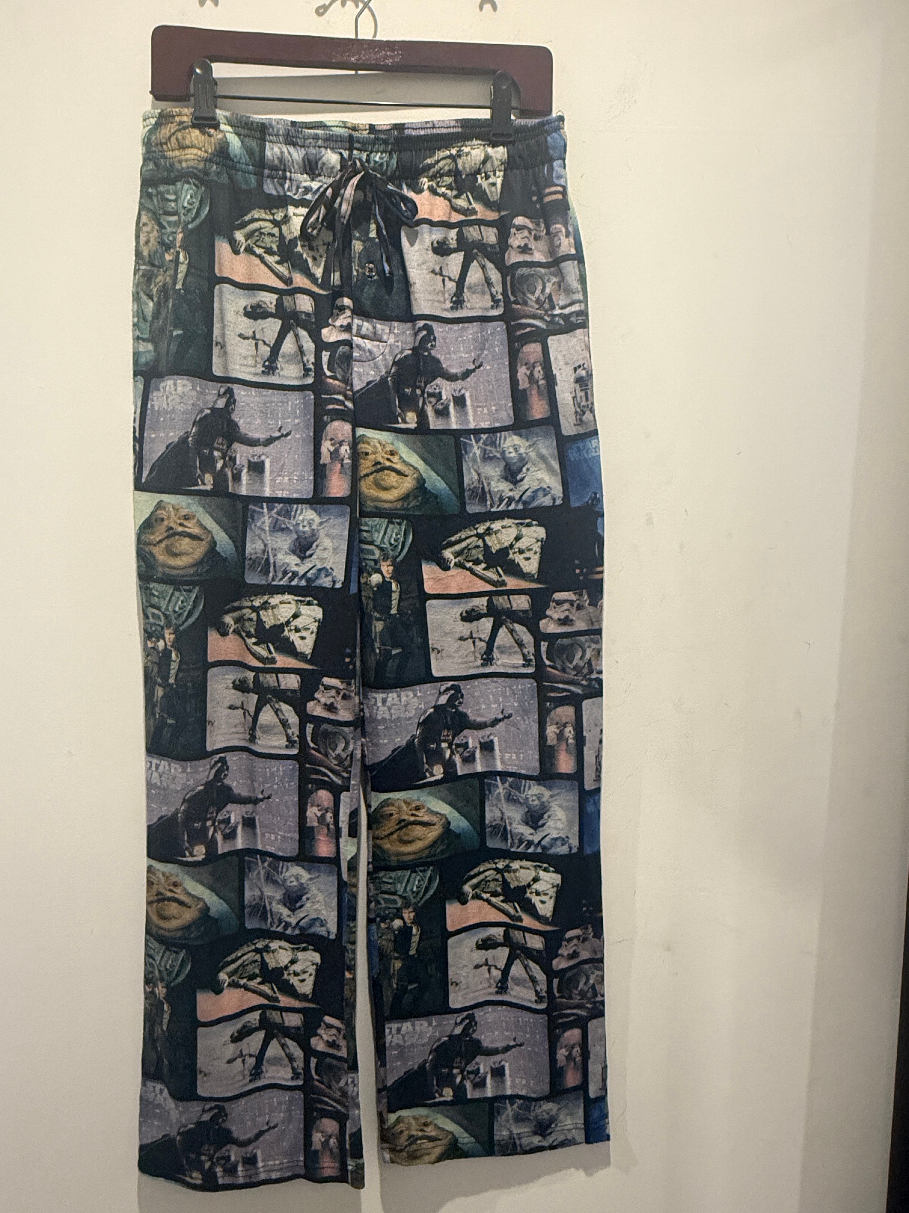 スターウォーズの映画柄イージーパンツです。ダースベイダーやタイトルのみのイージーパンツは良く見かけますがこちらはフォトのムービーパターンの総柄デザインと中々見ないパターンとなります。初期のスターウォーズな感じがとても良いですね。しっかりサイドポケットがあり、ウエストがゴムと紐で調整出来て楽チンに履けるのもポイントでオススメです。