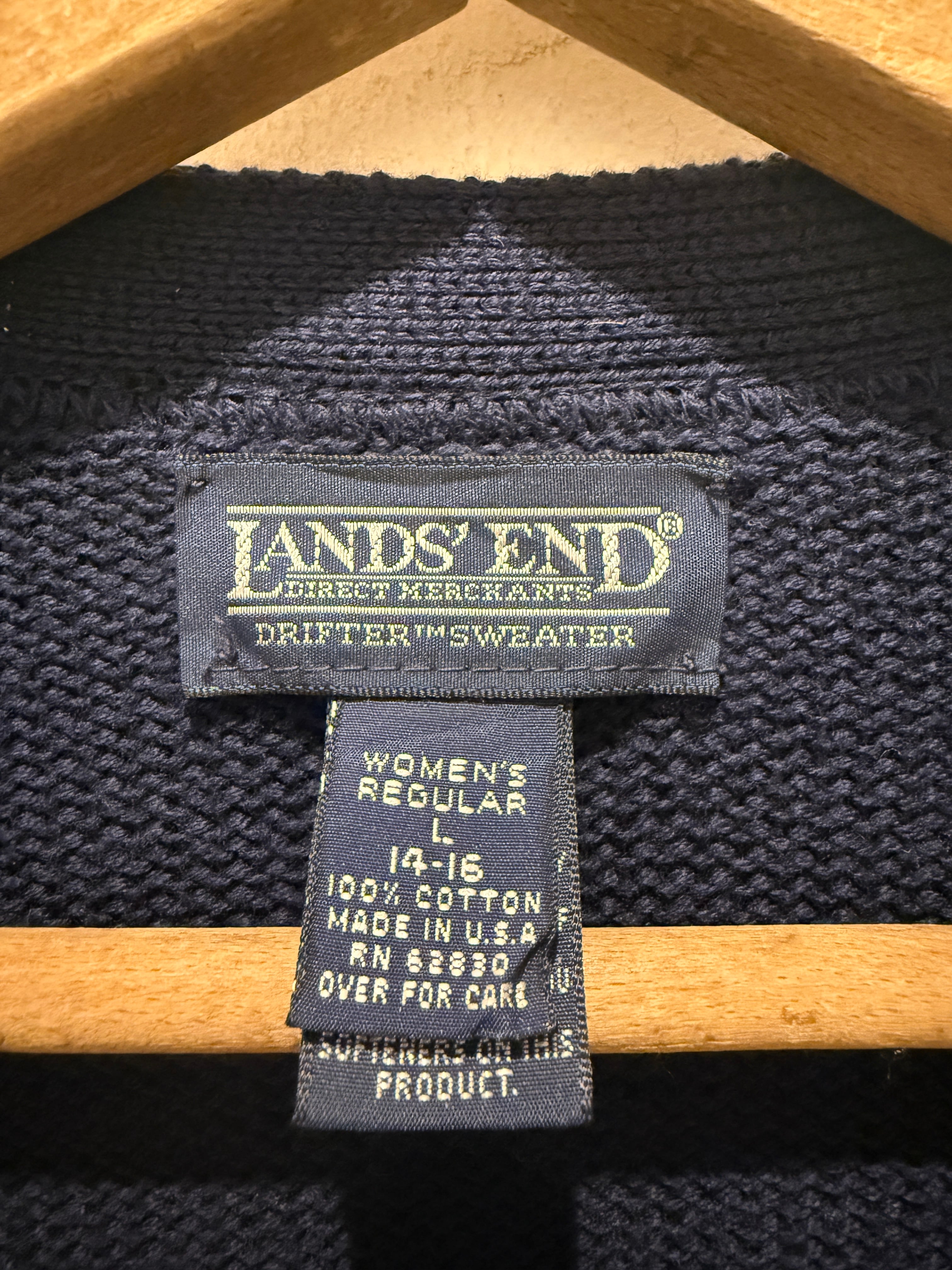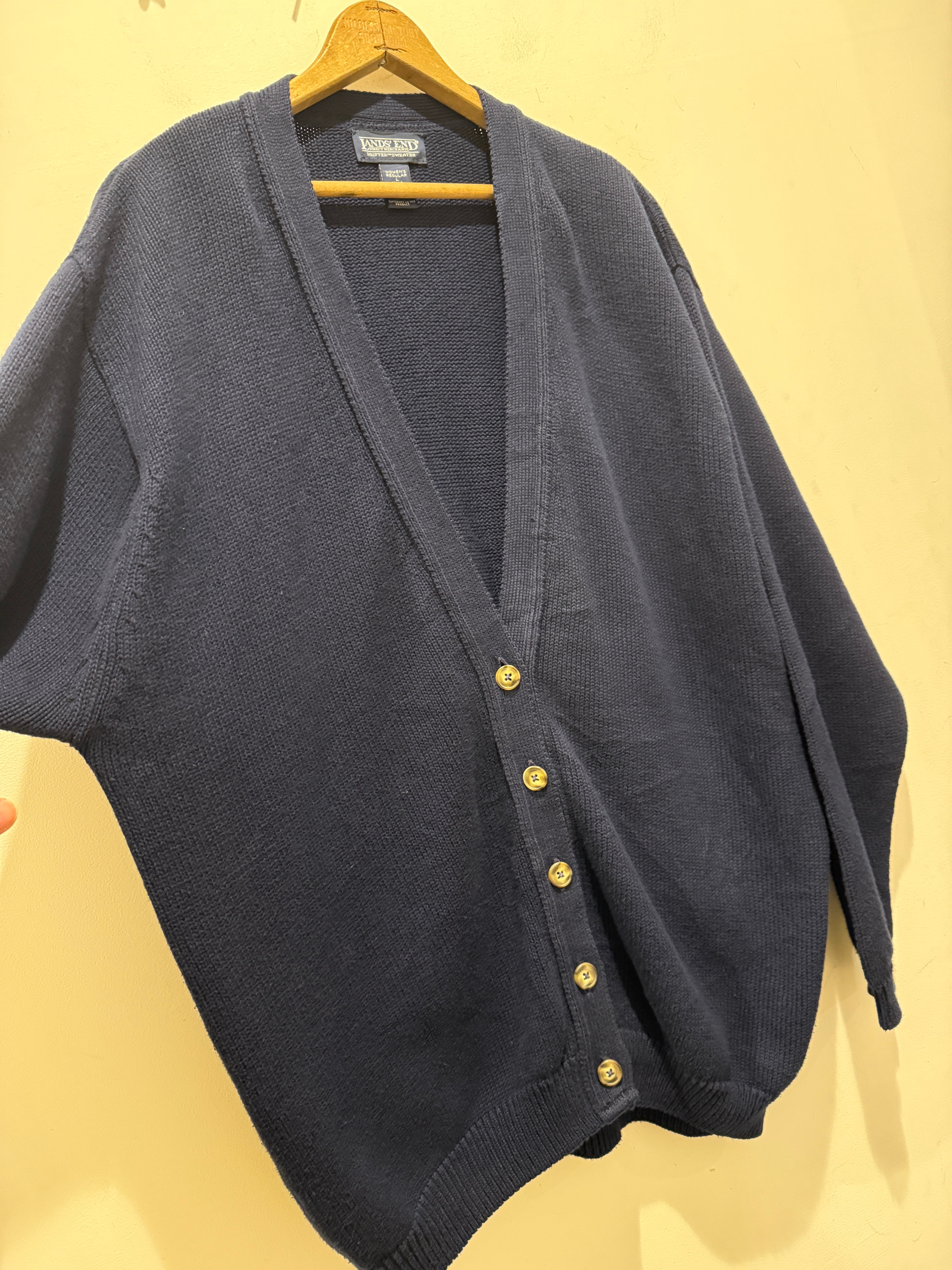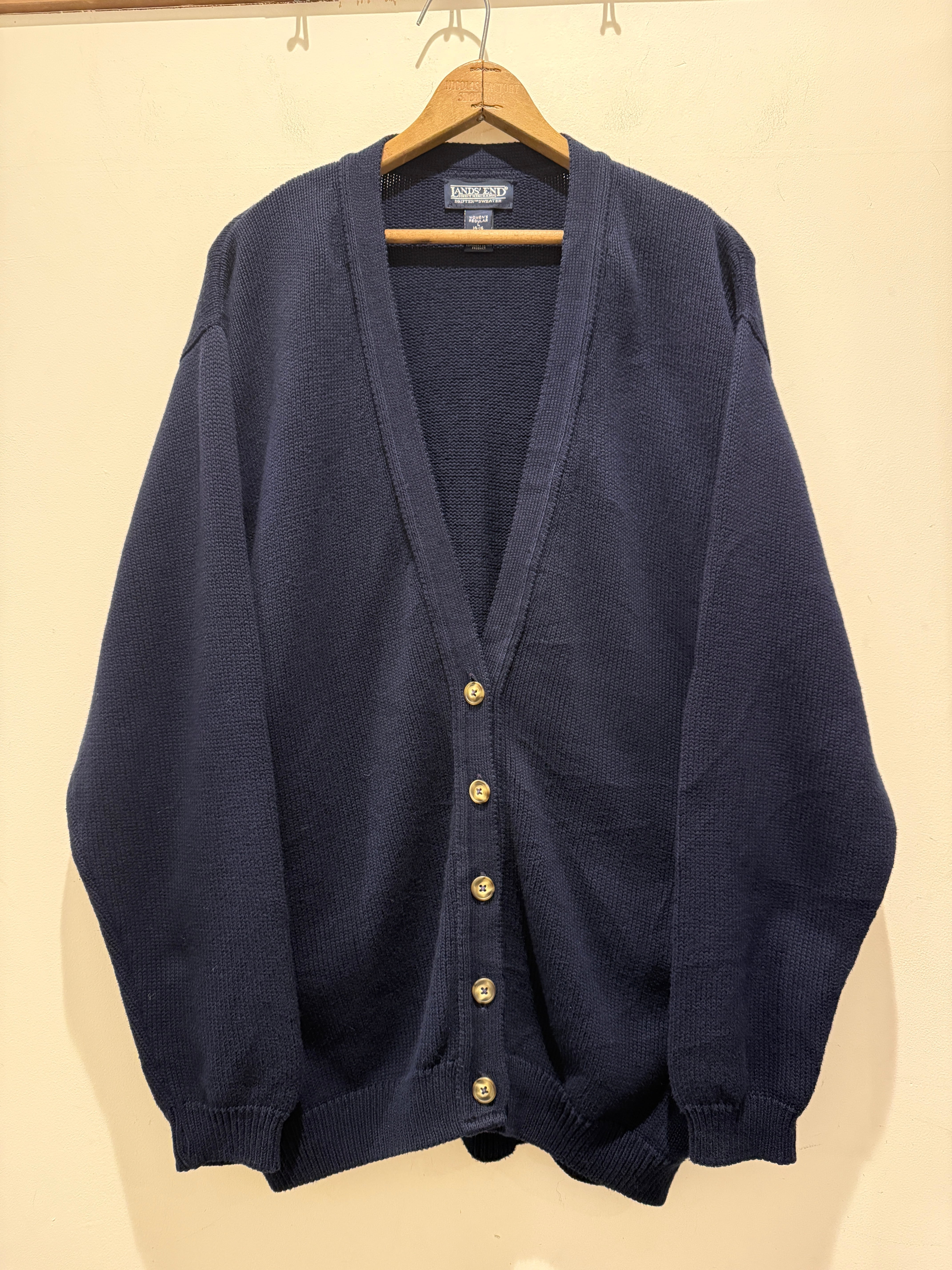 90年代アメリカ製ランズエンドのコットンニットカーディガンです。ネイビーカラーでレディースのアイテムとなります。大きめな作りなのでメンズでも着れるサイズ感ですね。コットンニットでもカーディガンタイプはあまり見かけなくアメリカ製とユニセックスでオススメです。