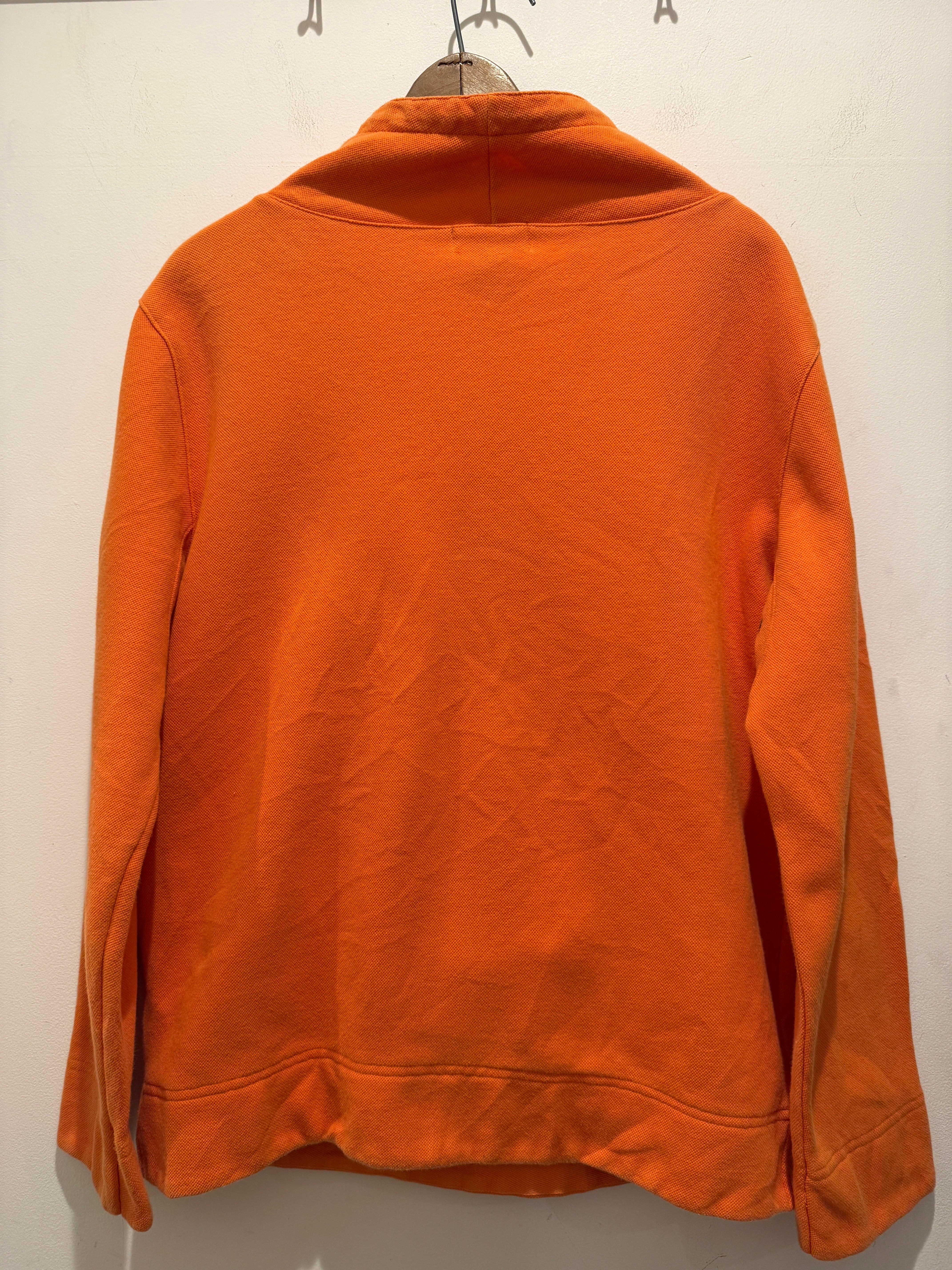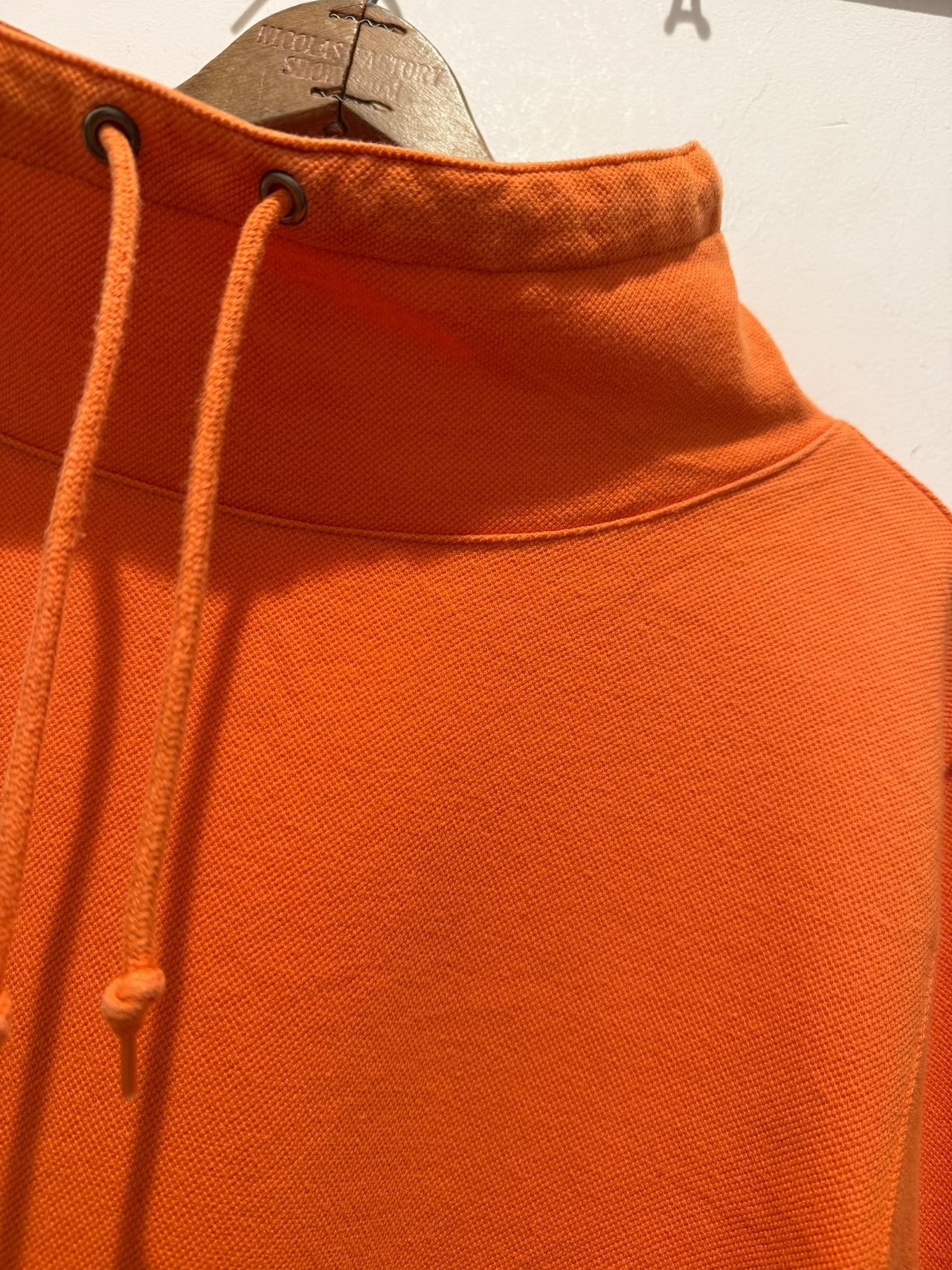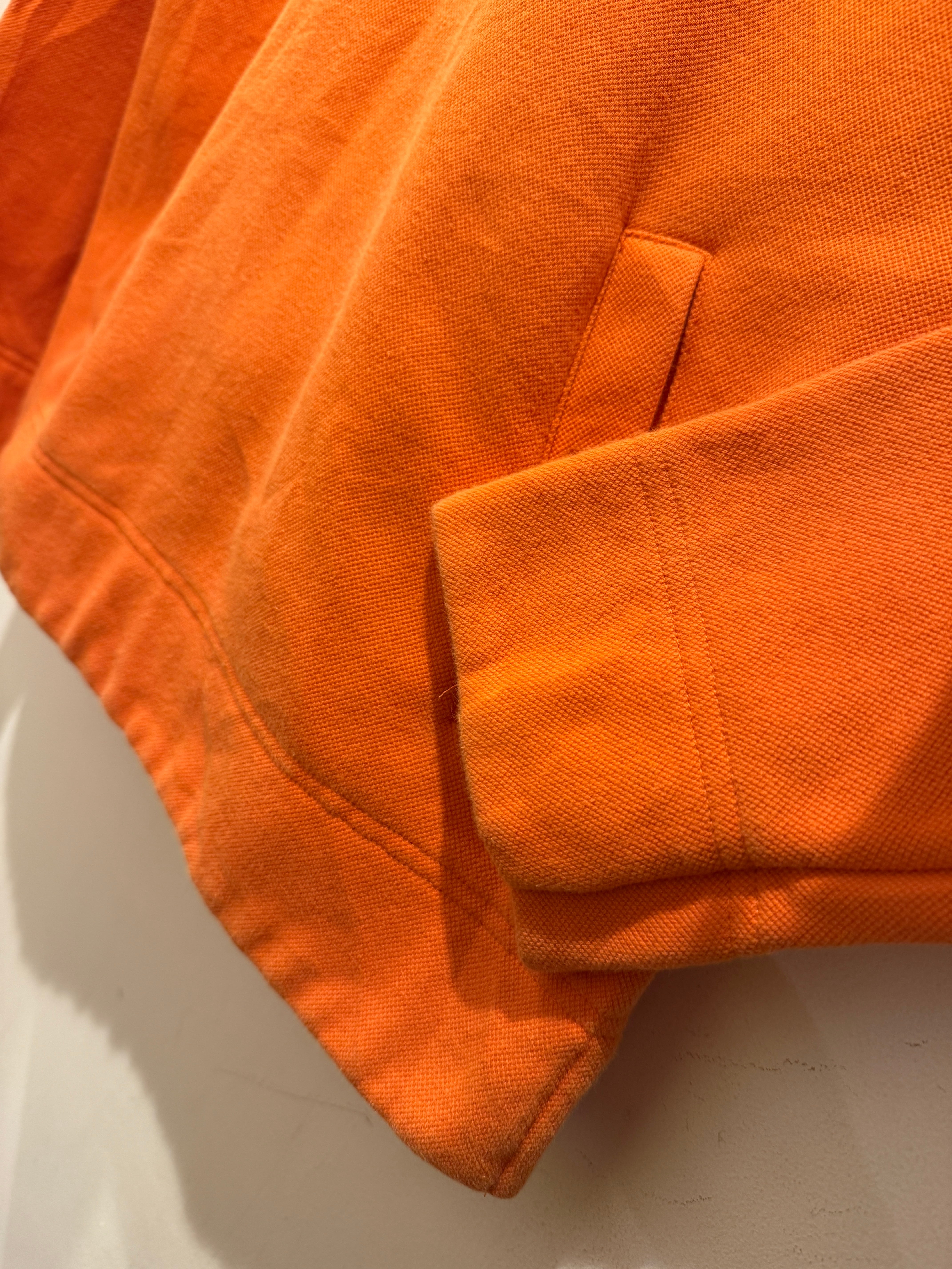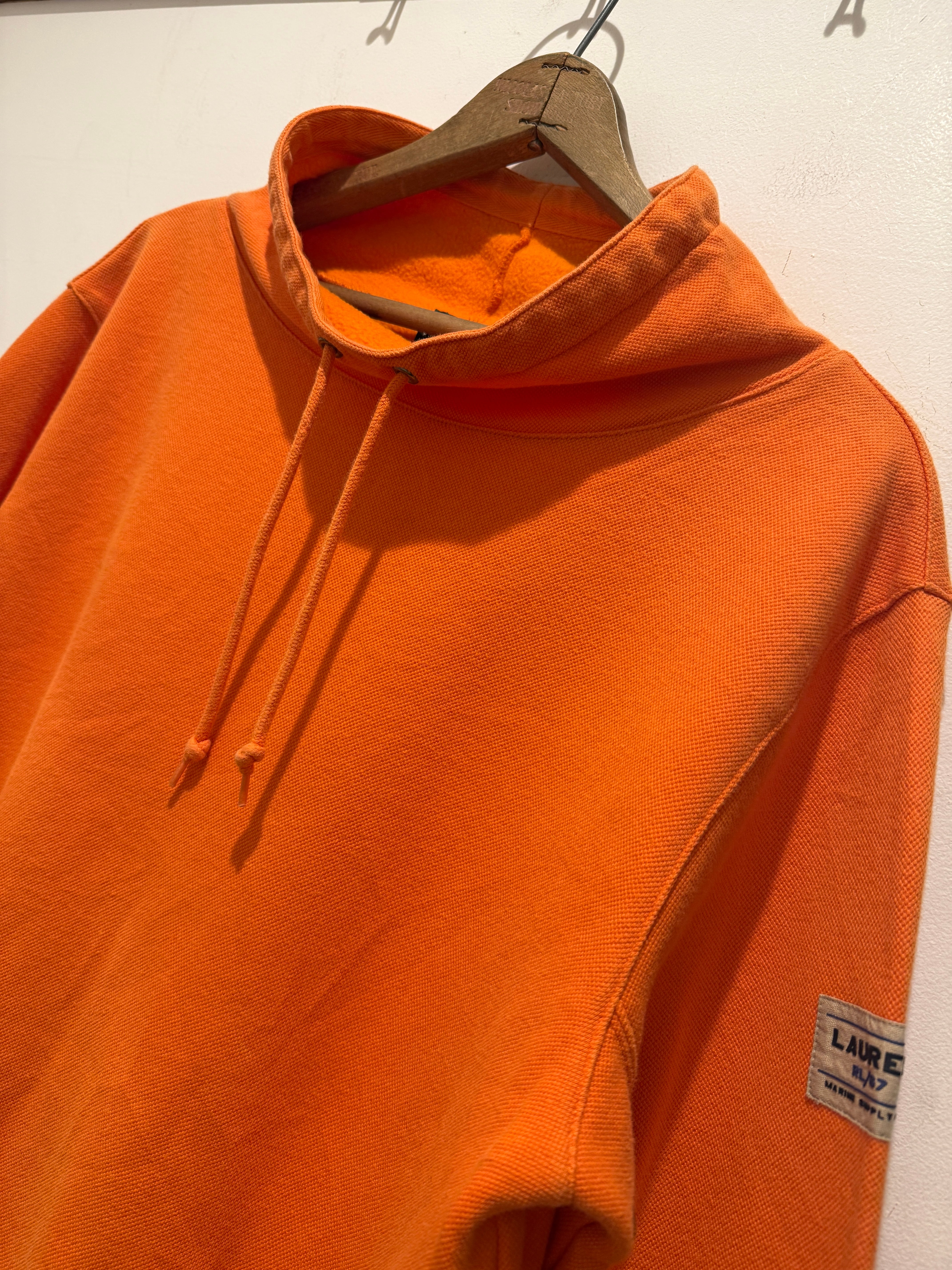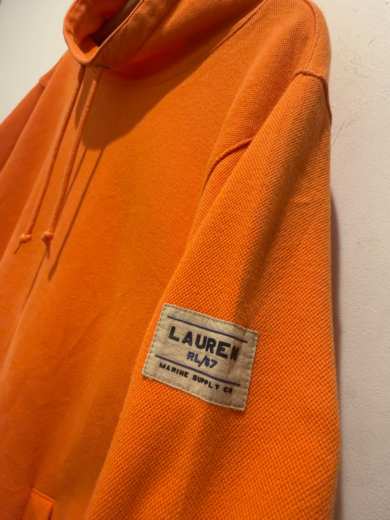 ラルフローレンのデザインスウェットです。オレンジカラーでモックネックの鹿の子素材スウェットとお洒落な1着です。袖のワッペンや裾のスリットなど細かいディテールも最高ですね。Sサイズなので女性の方にもオススメなスウェットです。