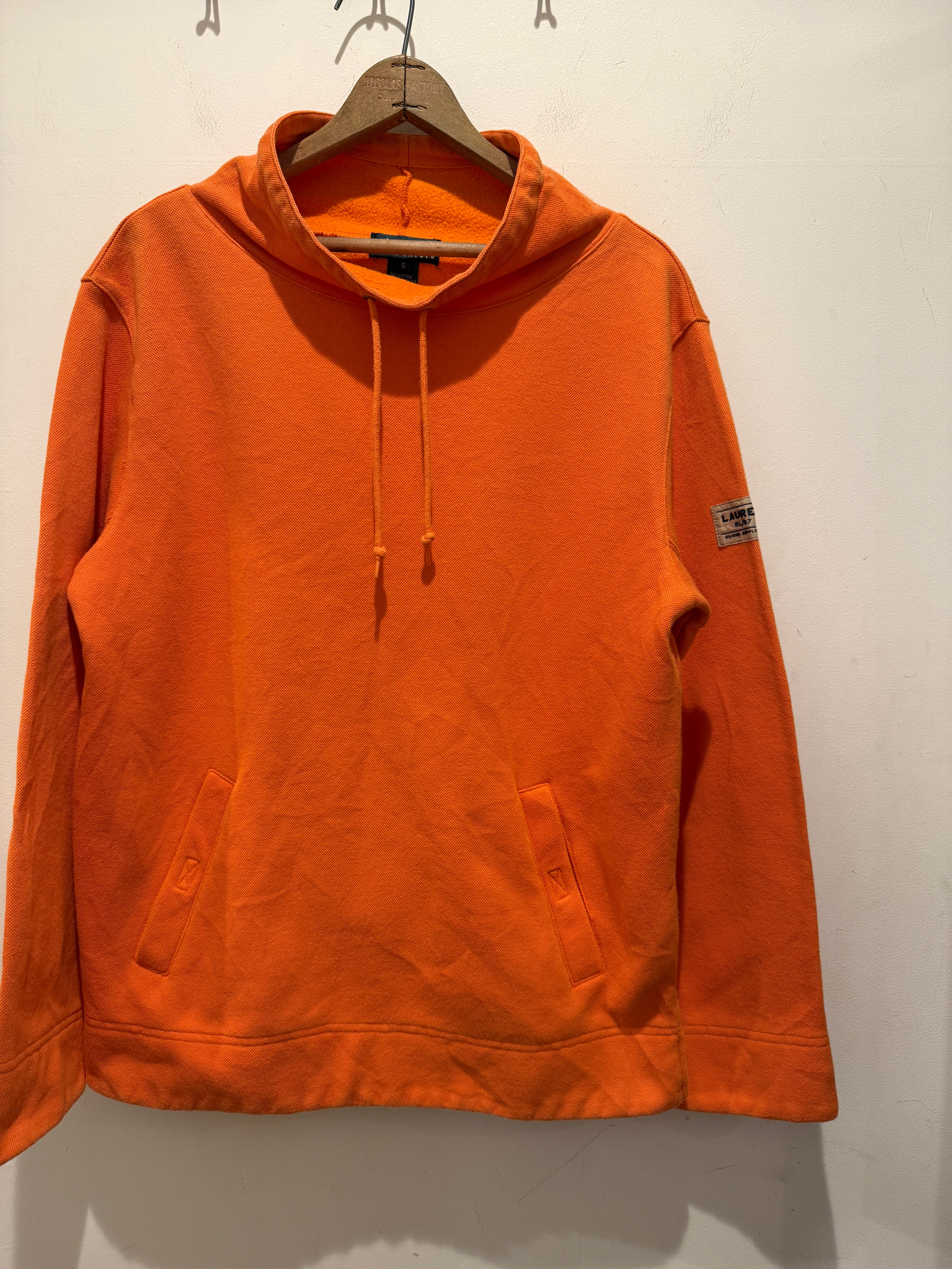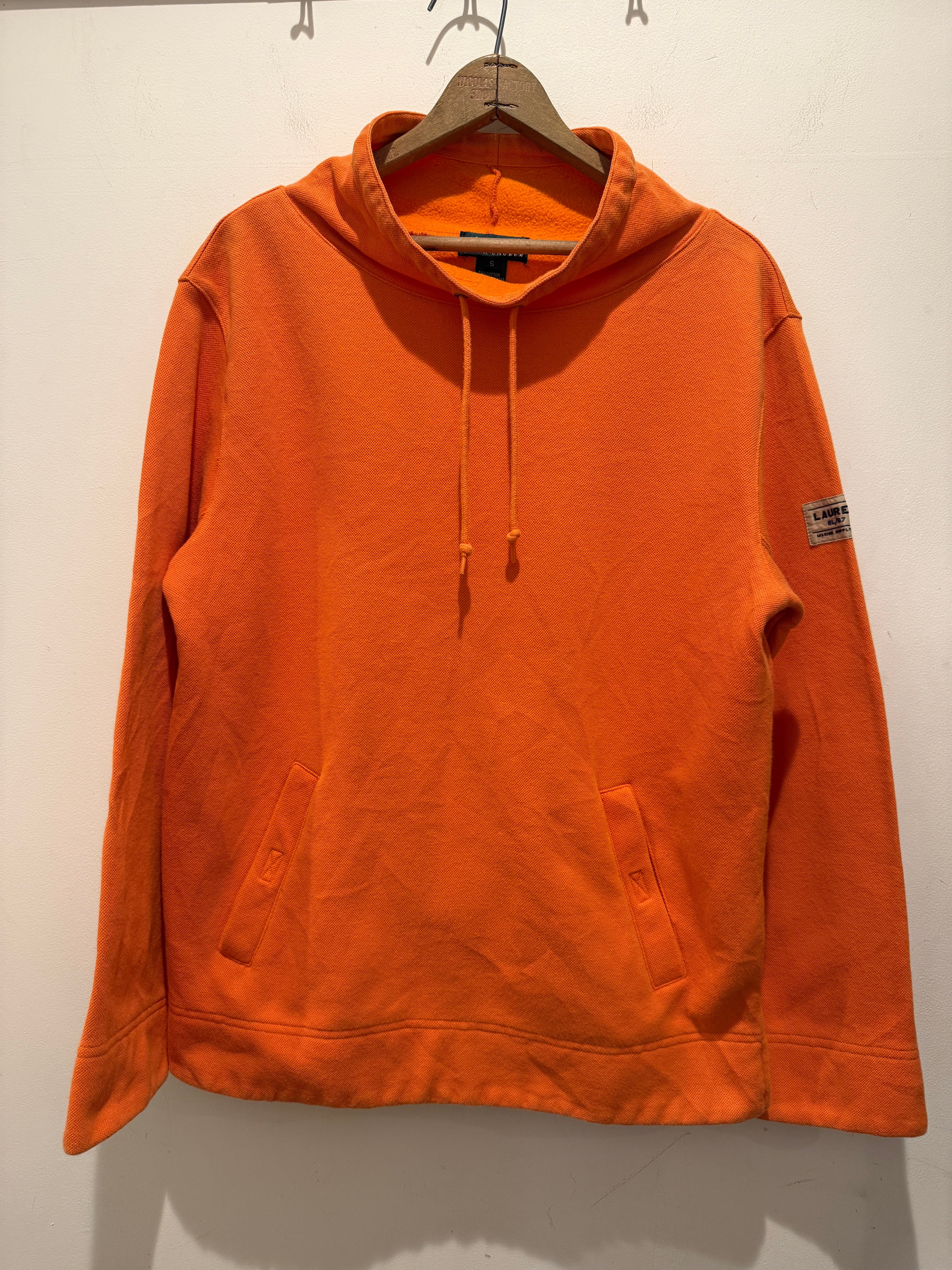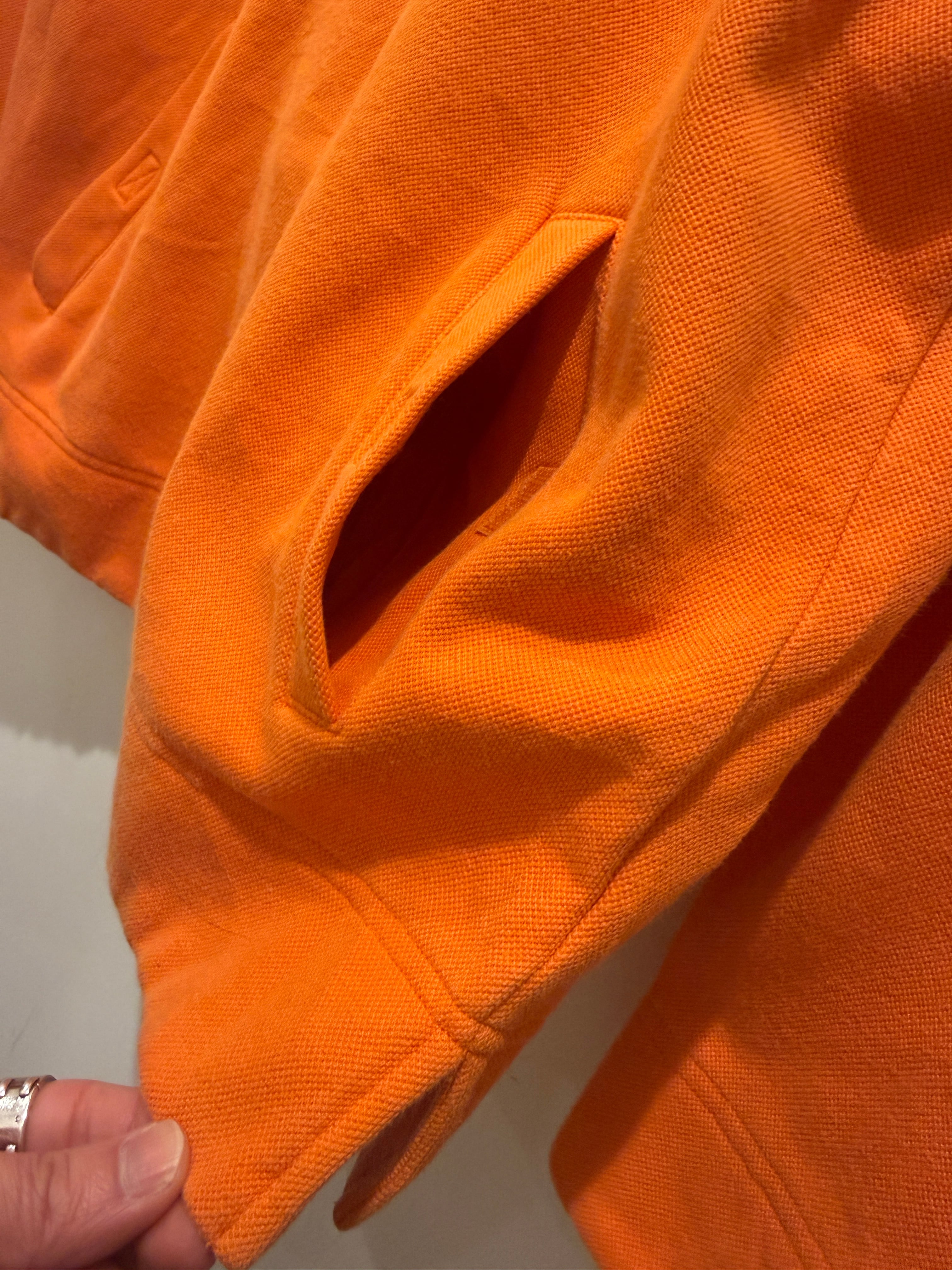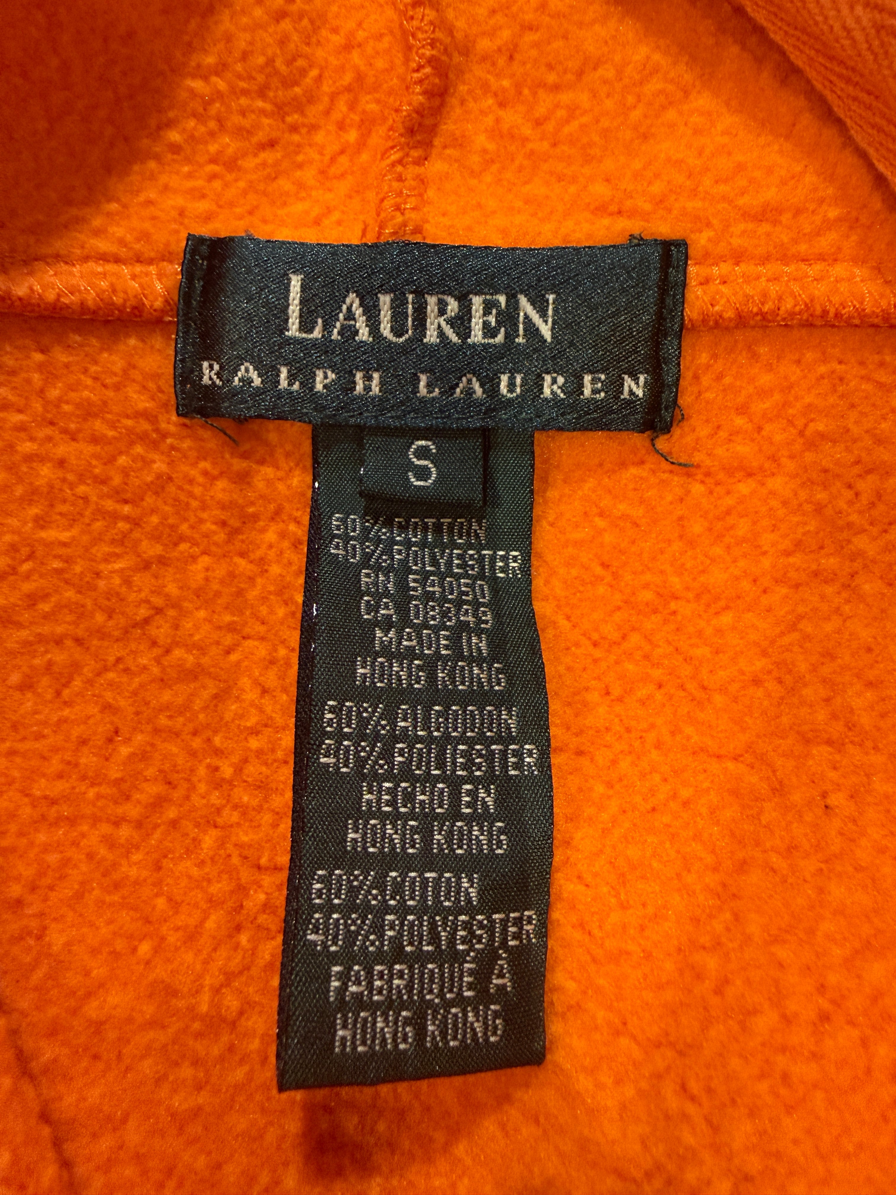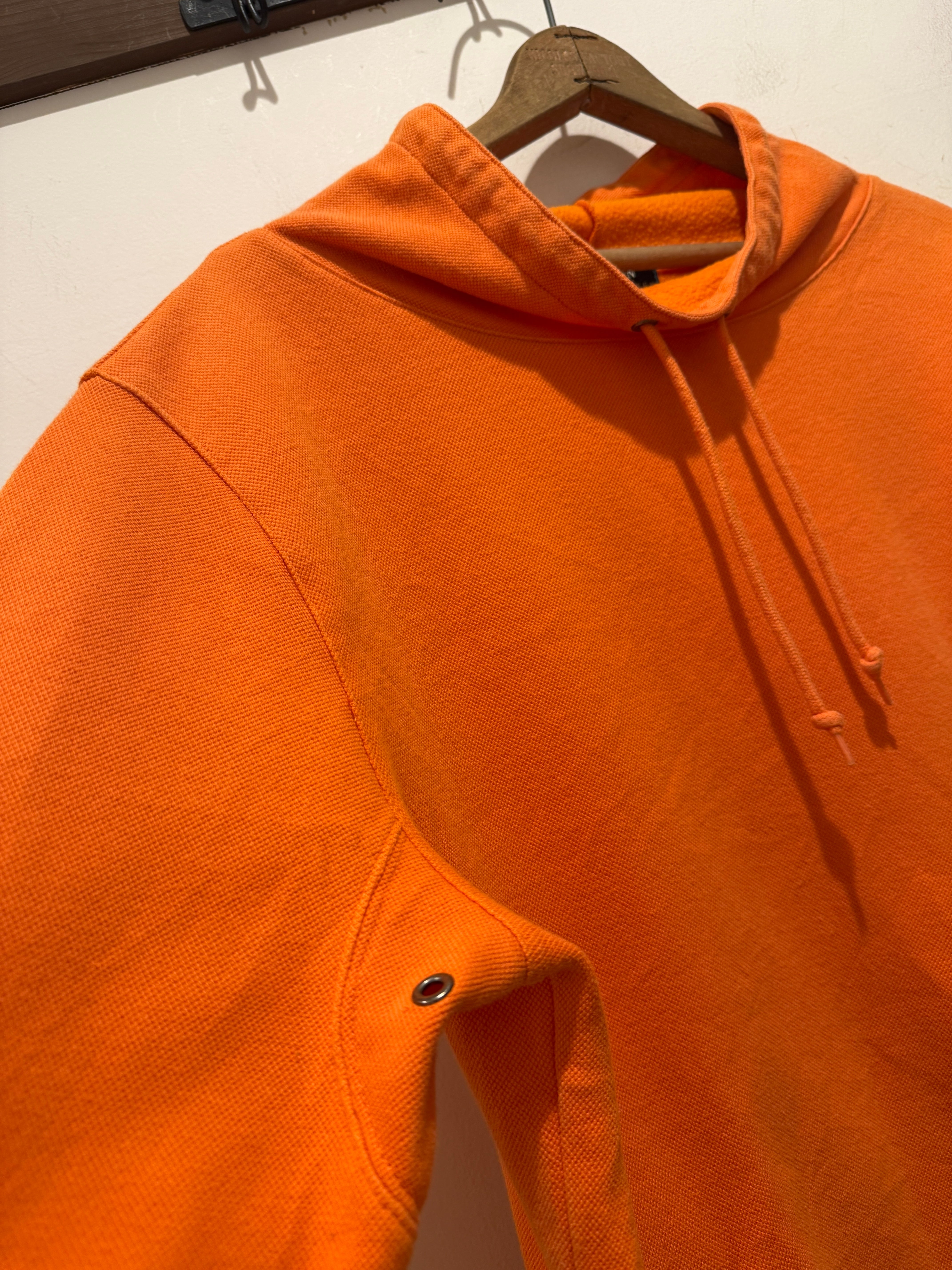 ラルフローレンのデザインスウェットです。オレンジカラーでモックネックの鹿の子素材スウェットとお洒落な1着です。袖のワッペンや裾のスリットなど細かいディテールも最高ですね。Sサイズなので女性の方にもオススメなスウェットです。