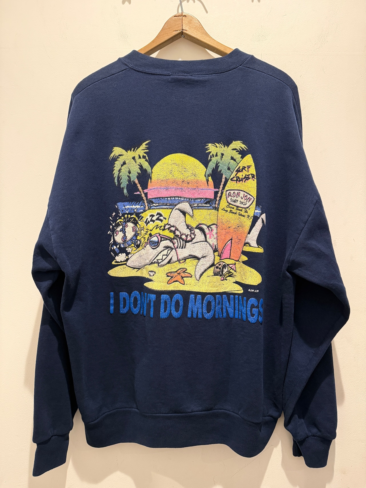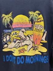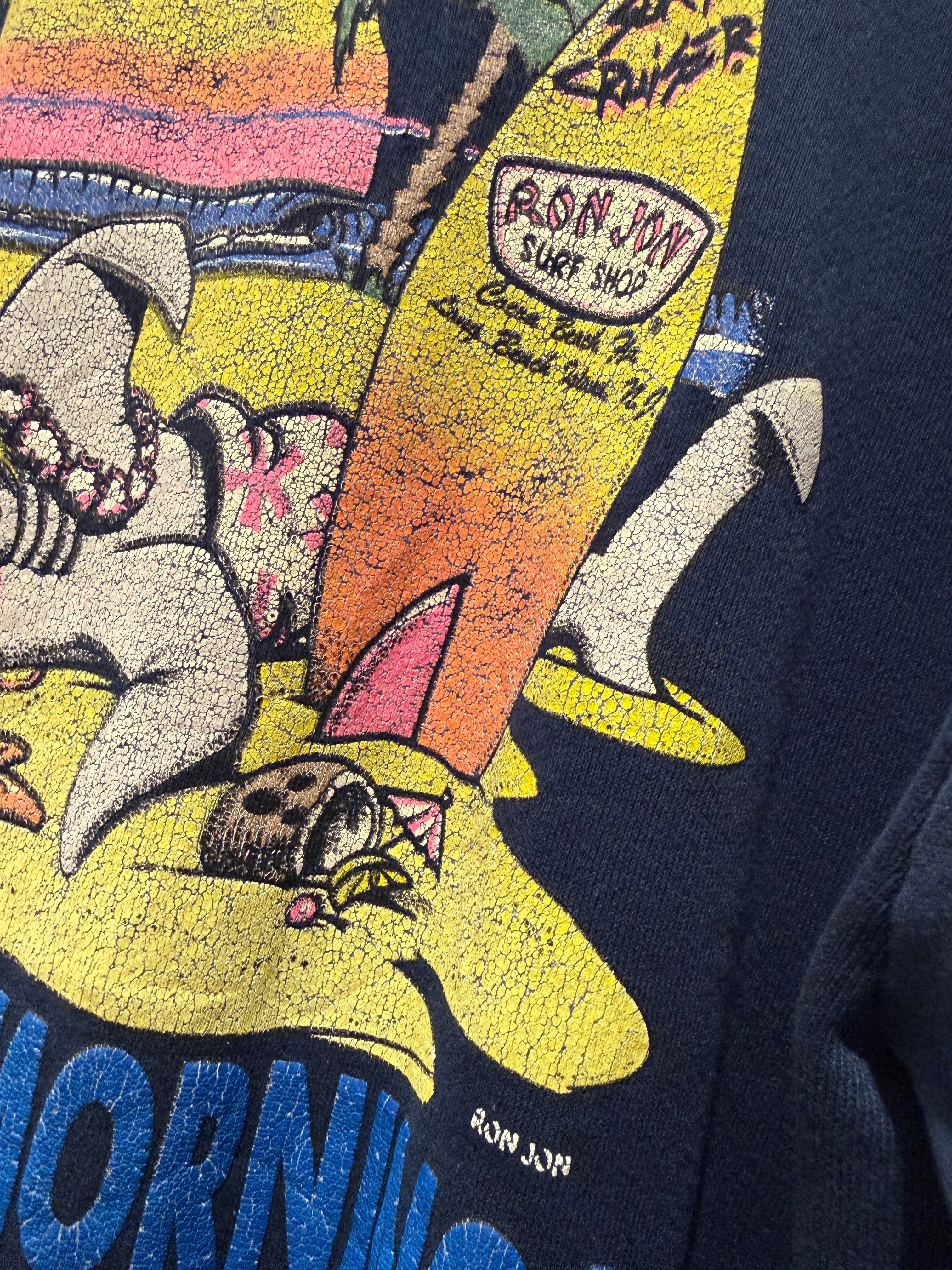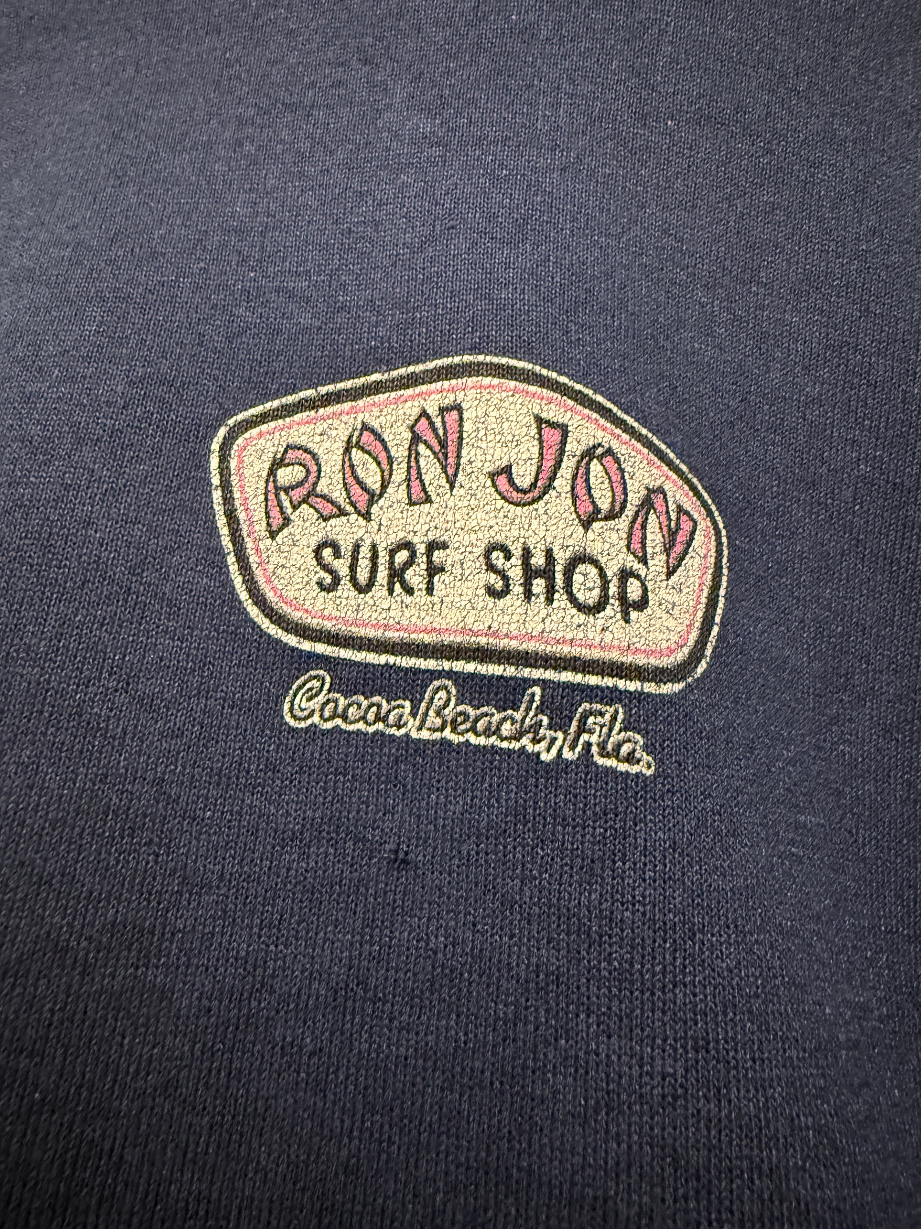 90年代ロンジョンのスウェットです。ネイビーボディでフロントは胸にワンポイント、そしてバッグにもプリントが入るスウェットとなります。TシャツやロンTよりスウェットは見かける機会が少ない印象ですね。デザインもロゴのみが多い中、バッグプリントにサメがはいるデザインなのもポイントです。サイズ表記が欠損してますがXL位の大きさとオススメなスウェットです。