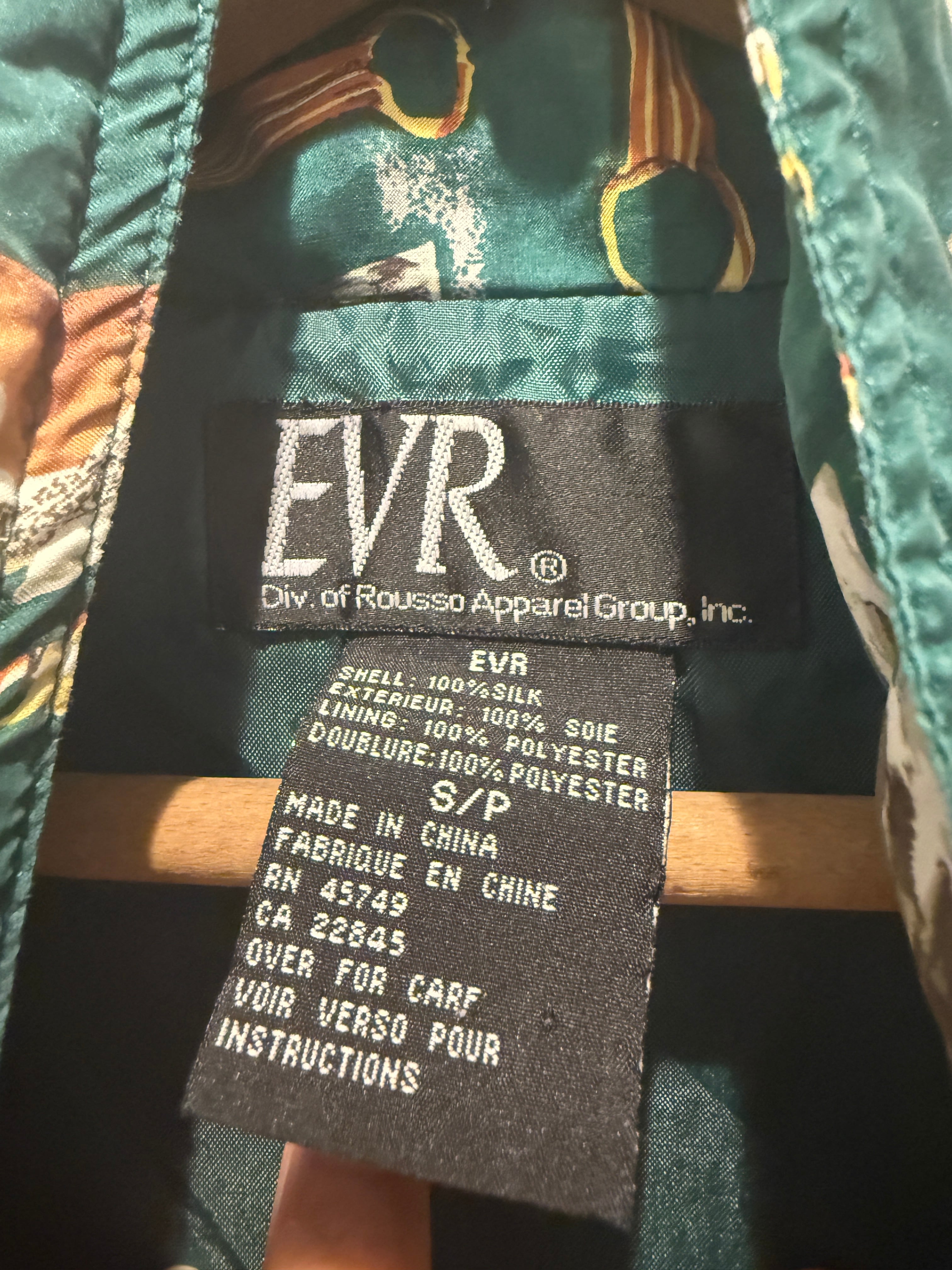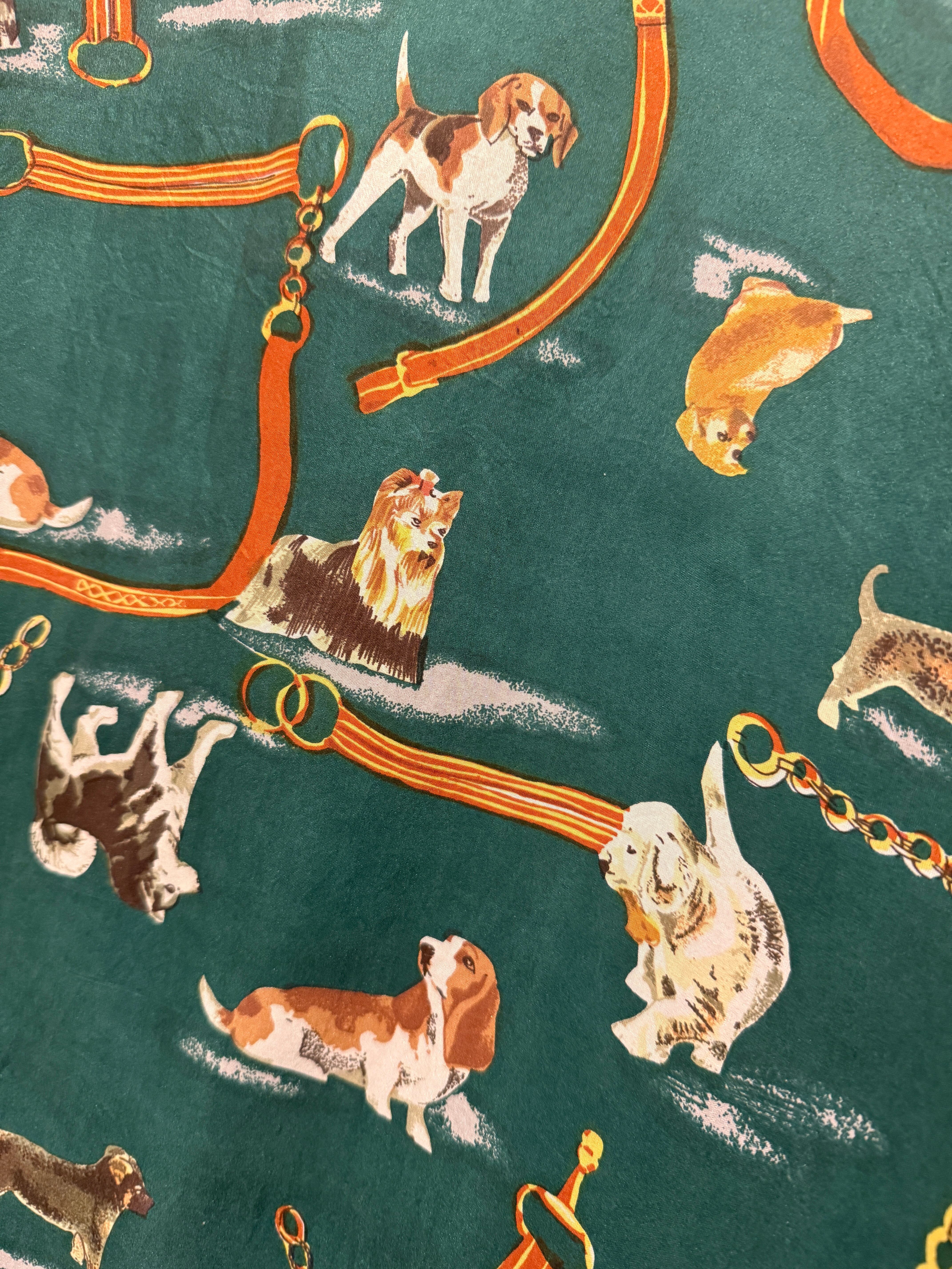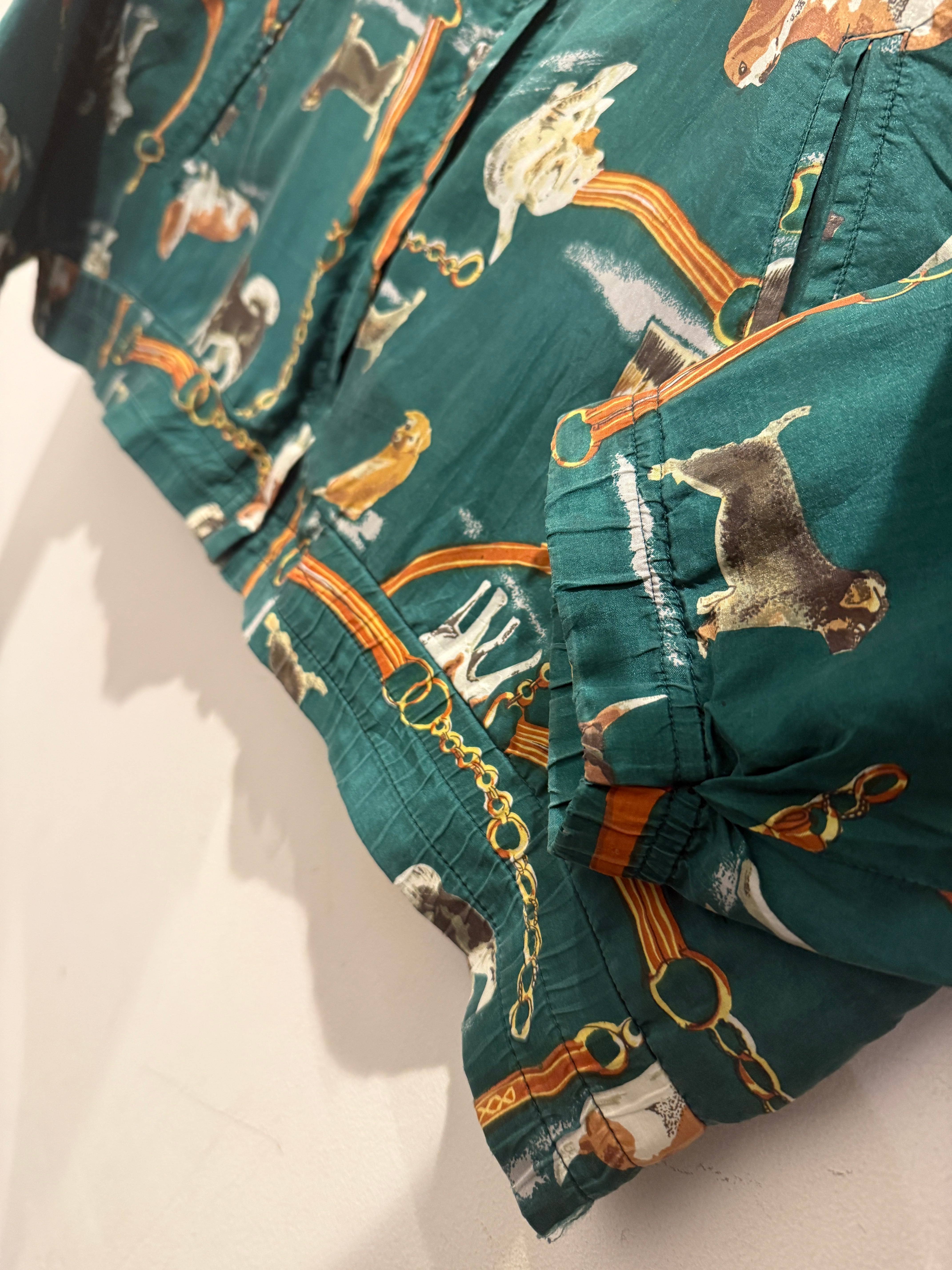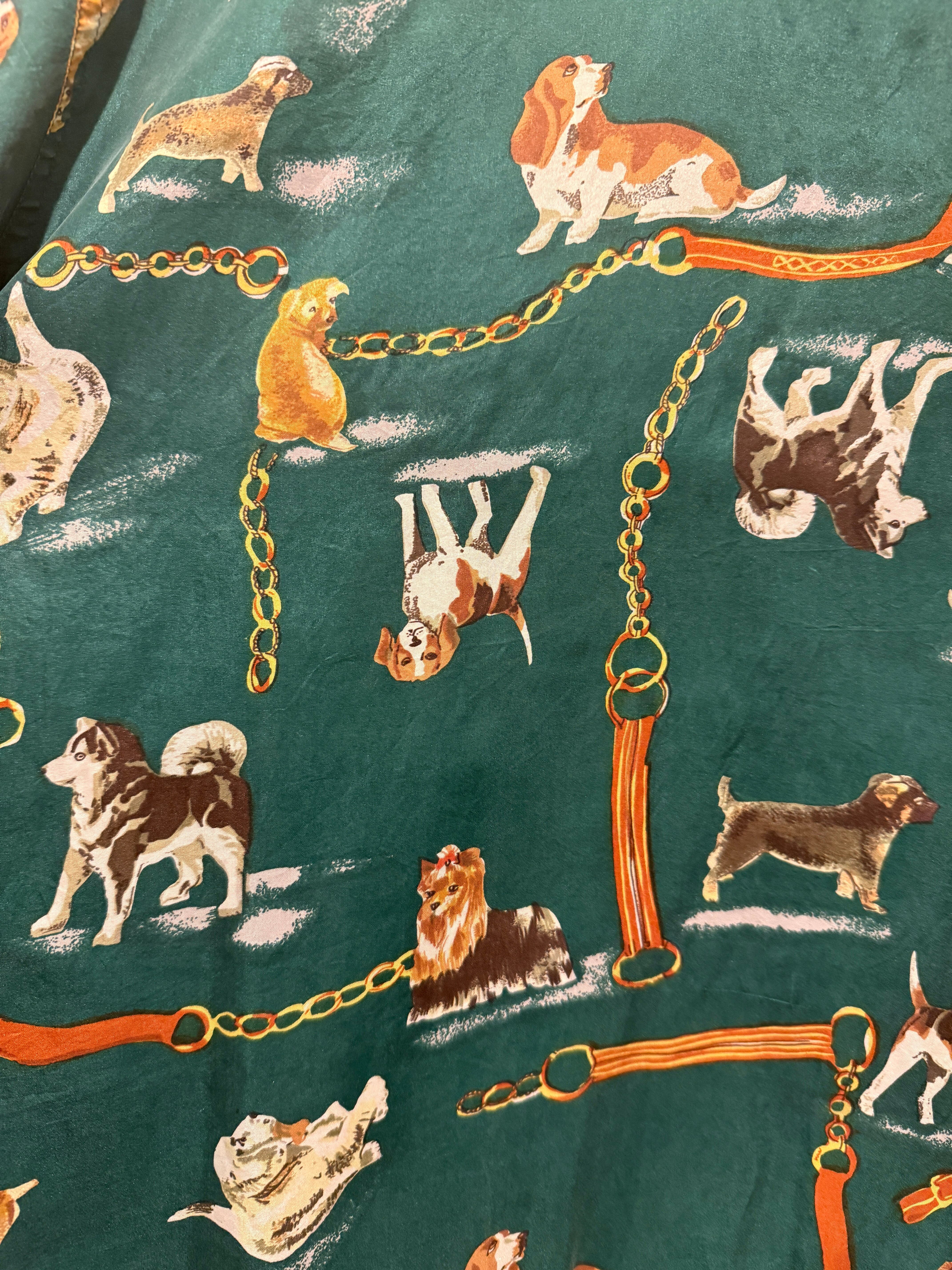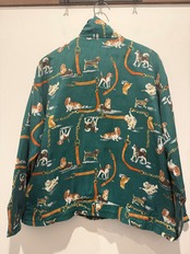 90年代犬デザインのシルクジャケットです。グリーンボディに色々な犬のデザインがされている可愛い1着です。シルク100%でチェーンなどのデザインもはいるのでエルメスのスカーフの様なデザインがまた良いですね。ボックスシルエットで形も良くユニセックスでオススメです。