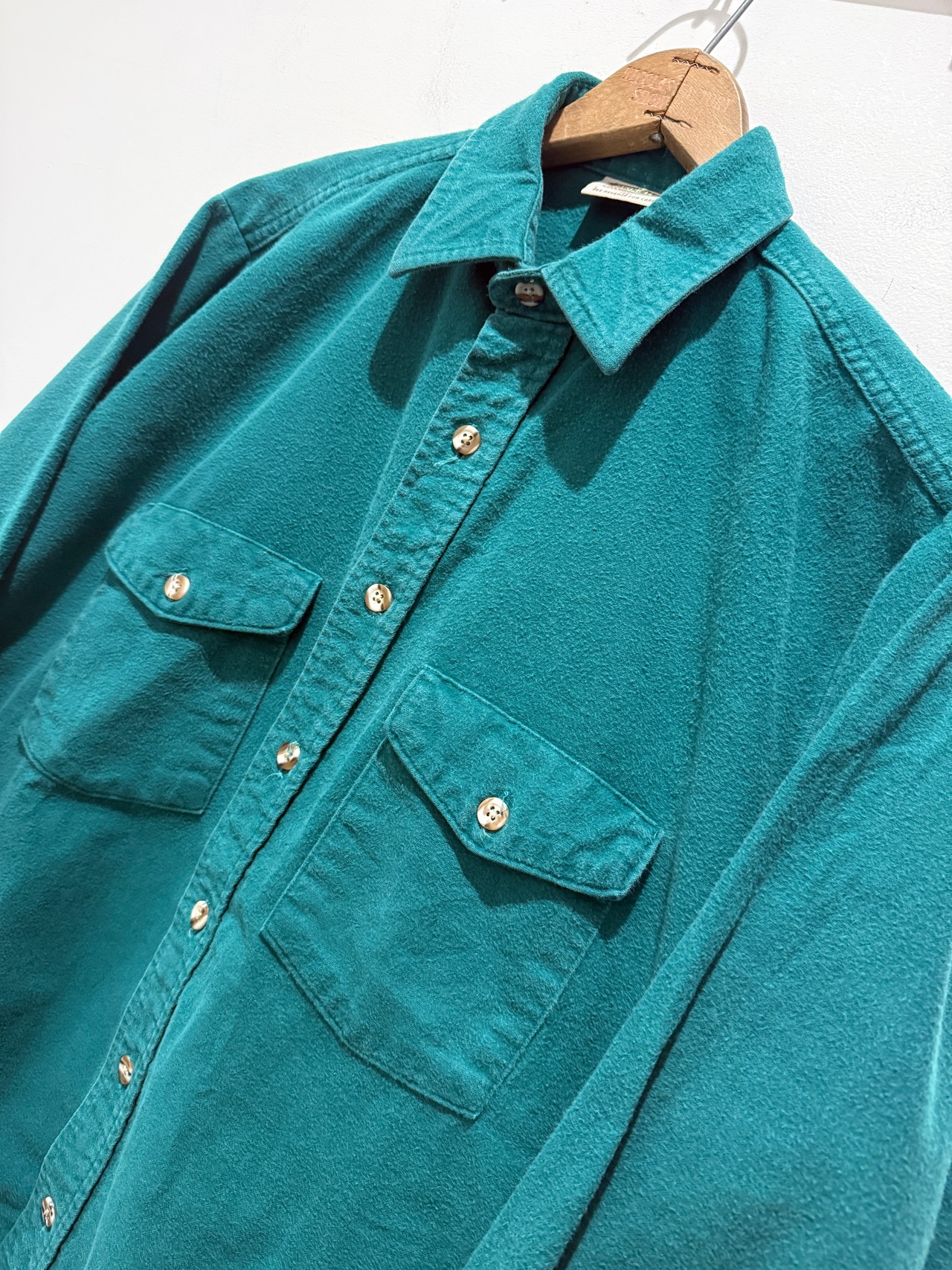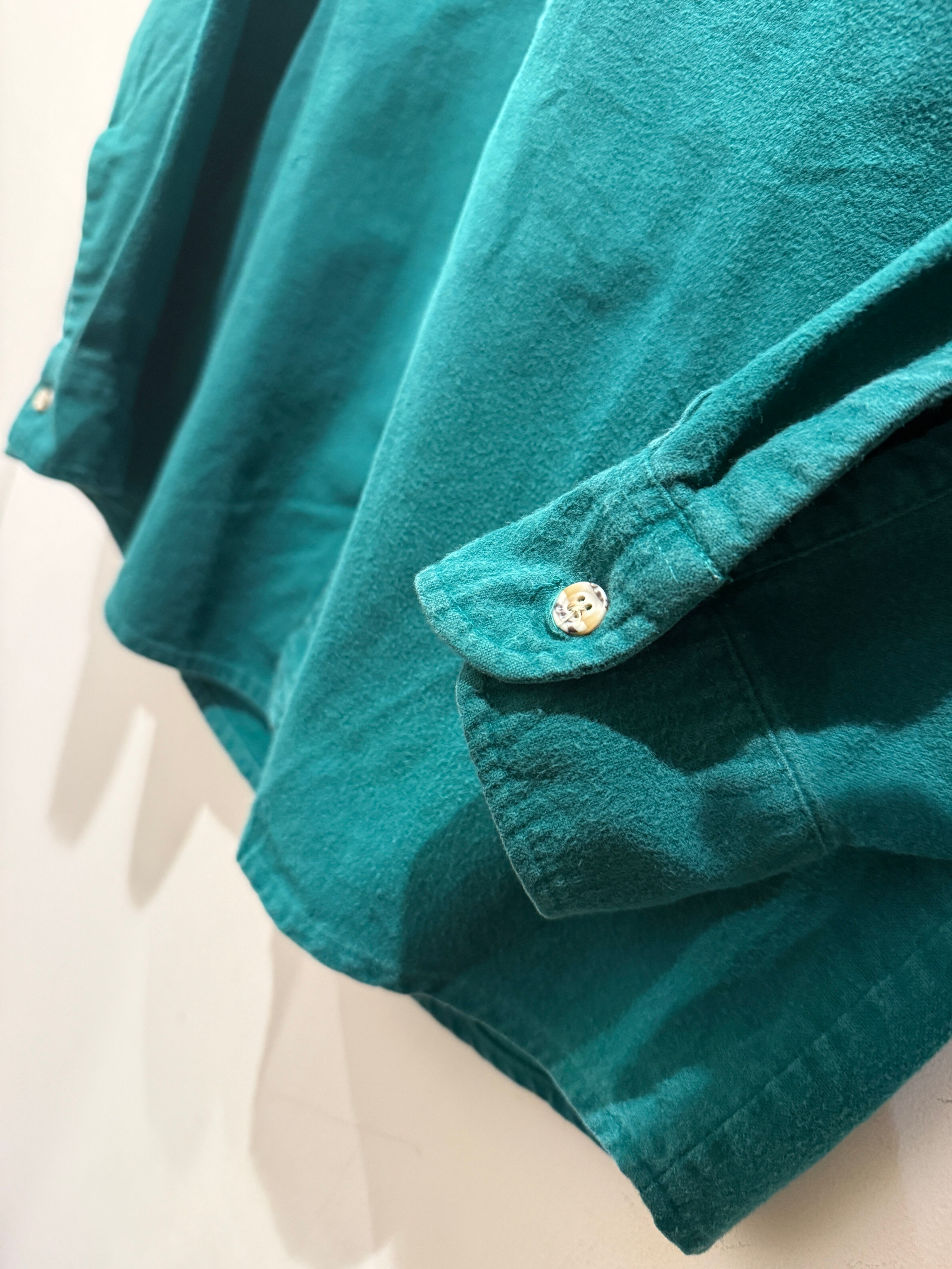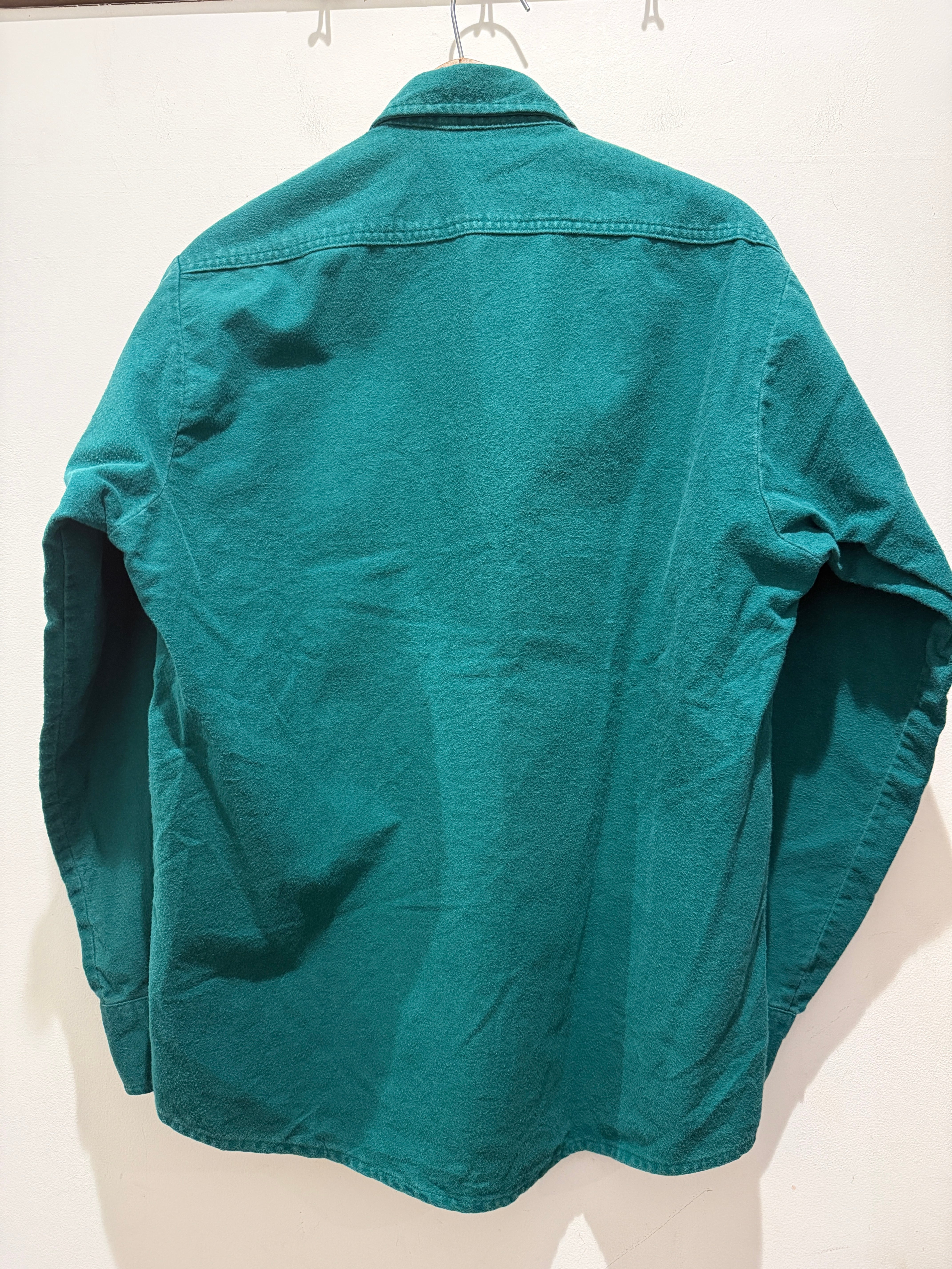 90年代ファイブブラザーのネルシャツです。ファイブブラザーといえばチェックのネルシャツが定番ですが、こちらは玉数少ない無地のネルシャツとなります。グリーンの無地で表記が薄くなっていますが恐らくアメリカ製だと思われます。ボタンの欠損なども無くサイズが合う方にはオススメな1着です。