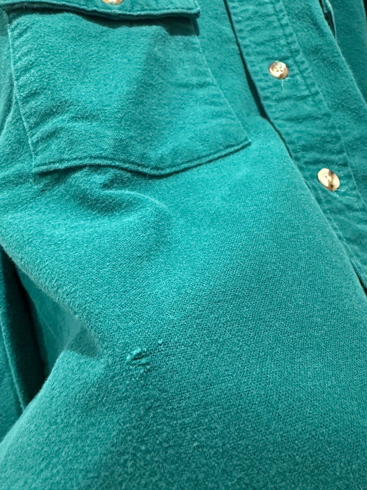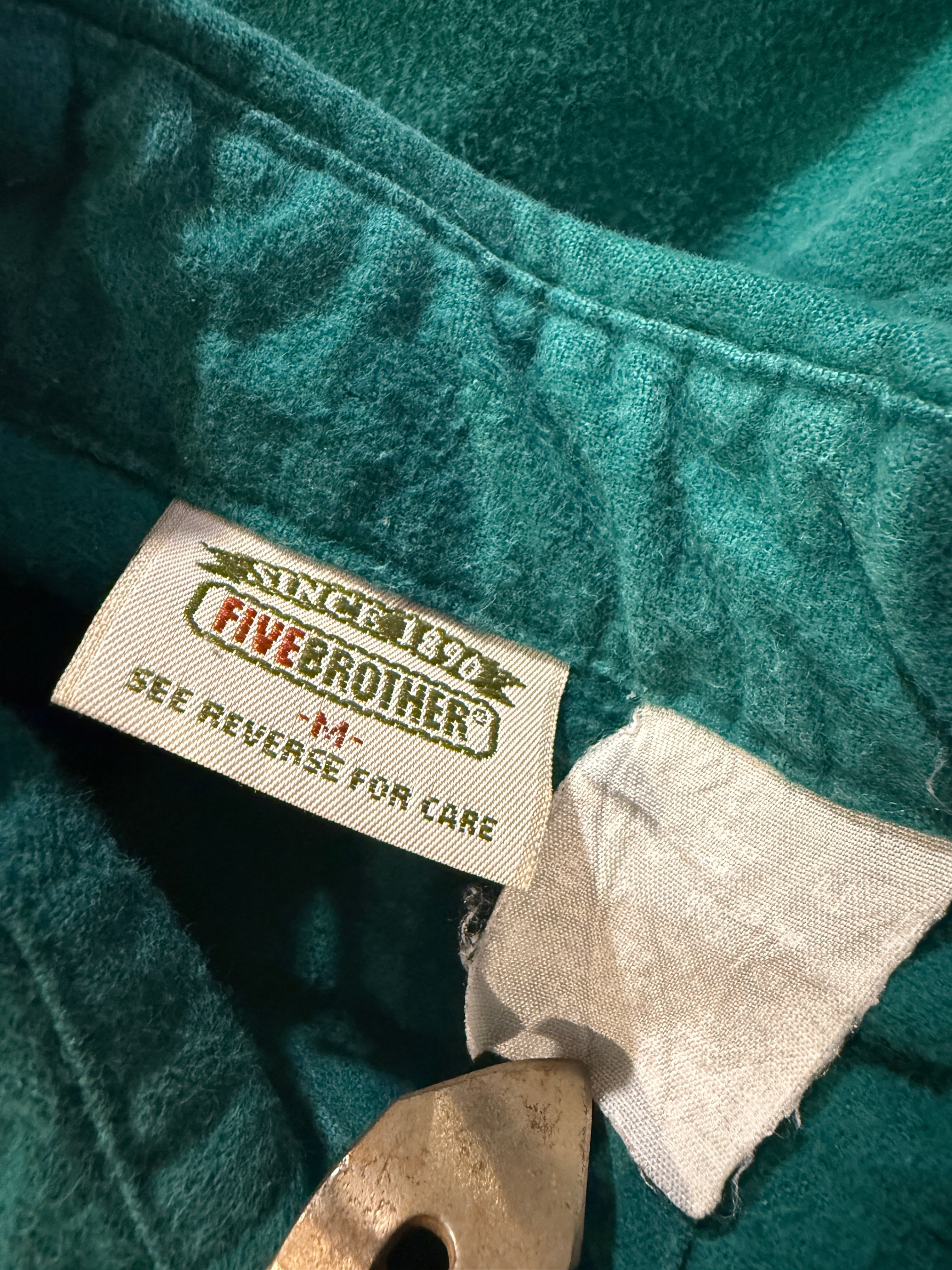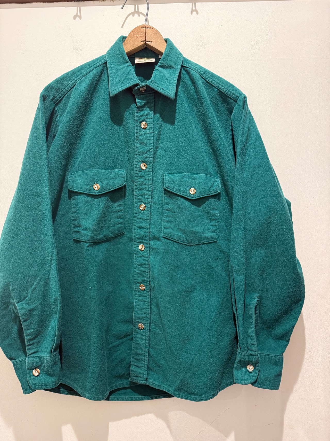 90年代ファイブブラザーのネルシャツです。ファイブブラザーといえばチェックのネルシャツが定番ですが、こちらは玉数少ない無地のネルシャツとなります。グリーンの無地で表記が薄くなっていますが恐らくアメリカ製だと思われます。ボタンの欠損なども無くサイズが合う方にはオススメな1着です。