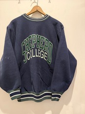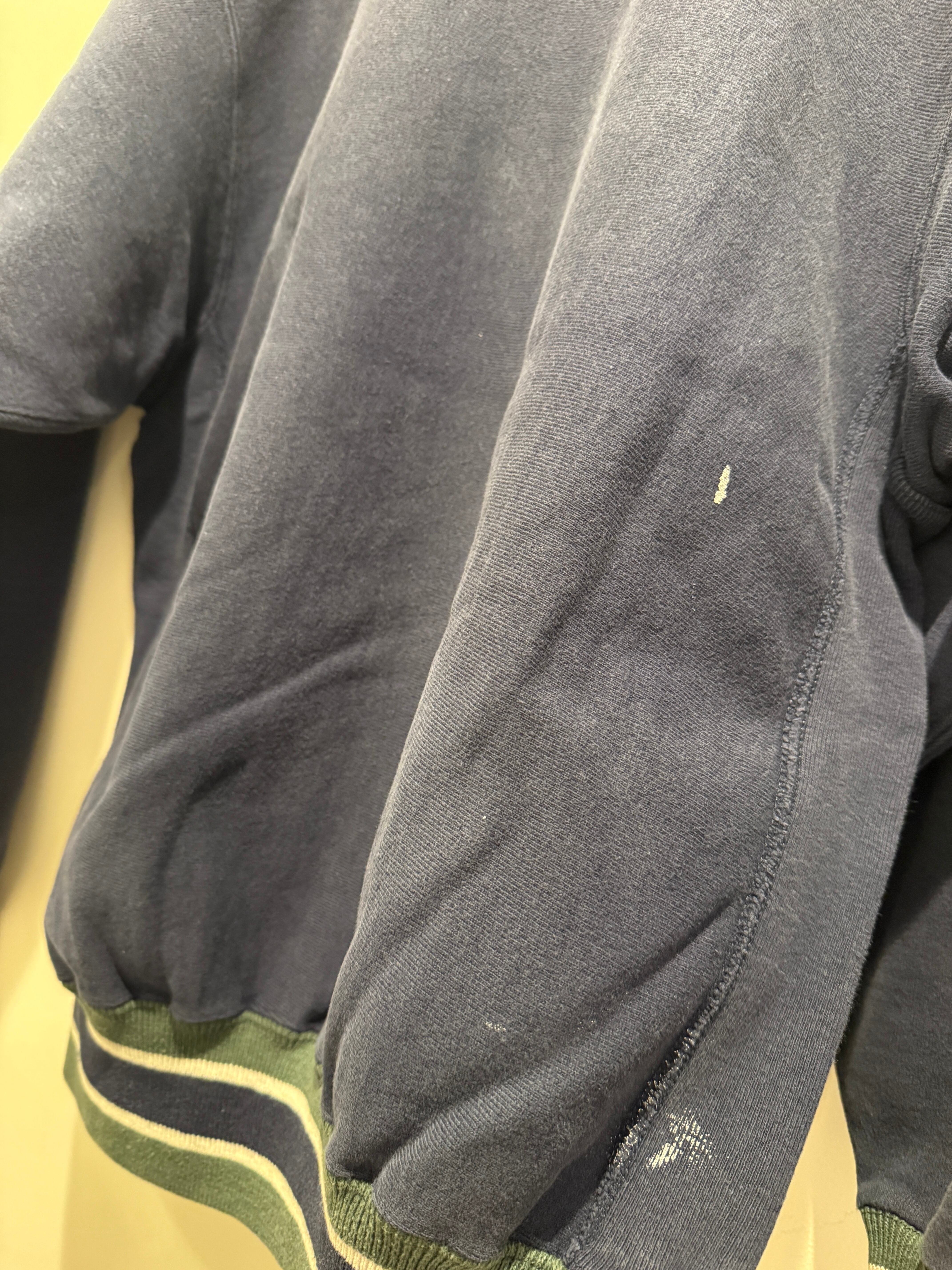 90年代アメリカ製チャンピオンのリバースウィーブです。刺繍タグが付く90年代前半の物でしっかりアメリカ製のリバースとなります。ネイビーボディに2段のカレッジプリントでリブ付きの1点となります。プリントカラーとリブカラーが合わせて作られているのがとても良いですね。フェードしたネイビーでペンキ飛びの雰囲気も良くボックスシルエットとオススメなスウェットです。