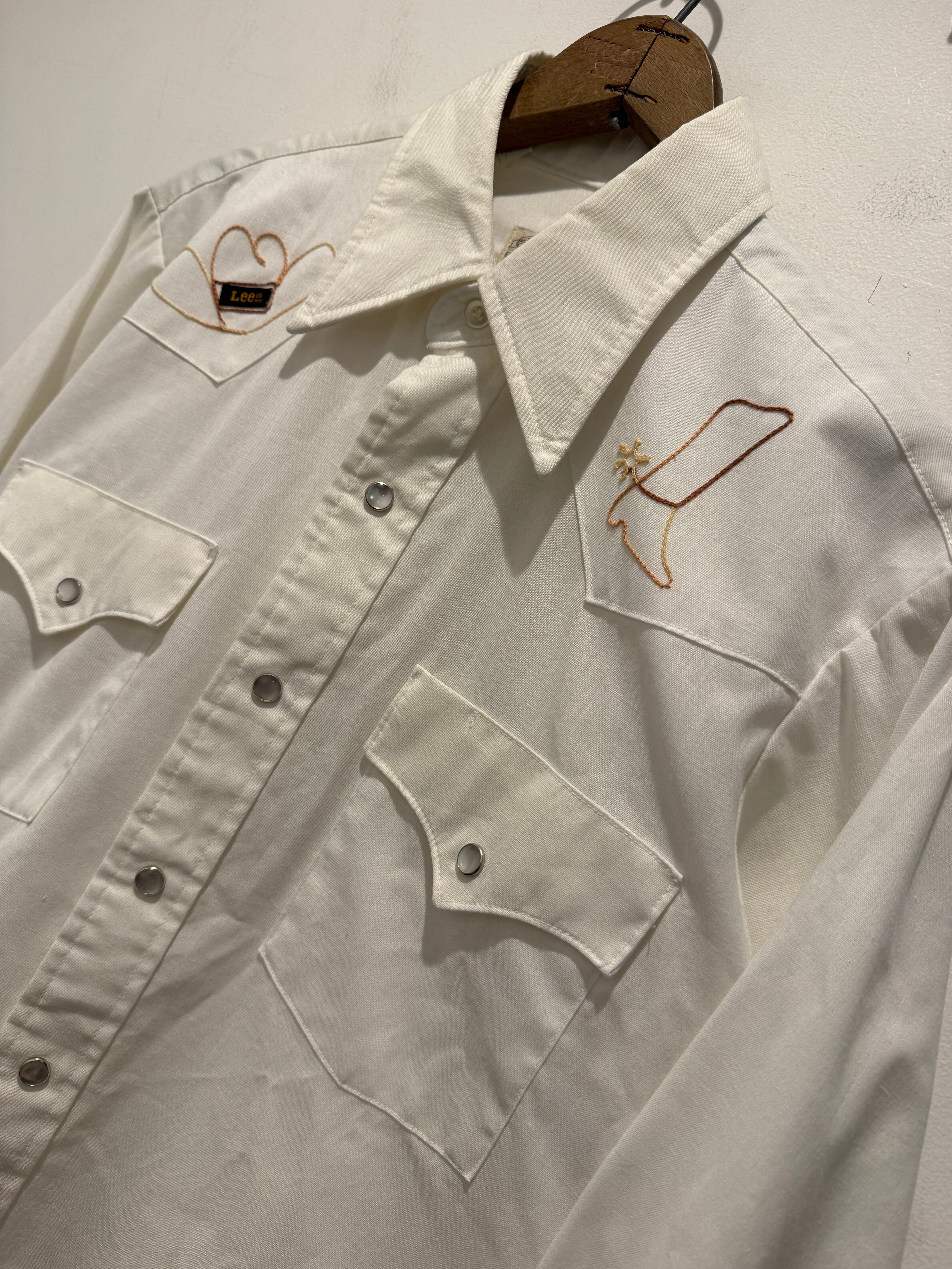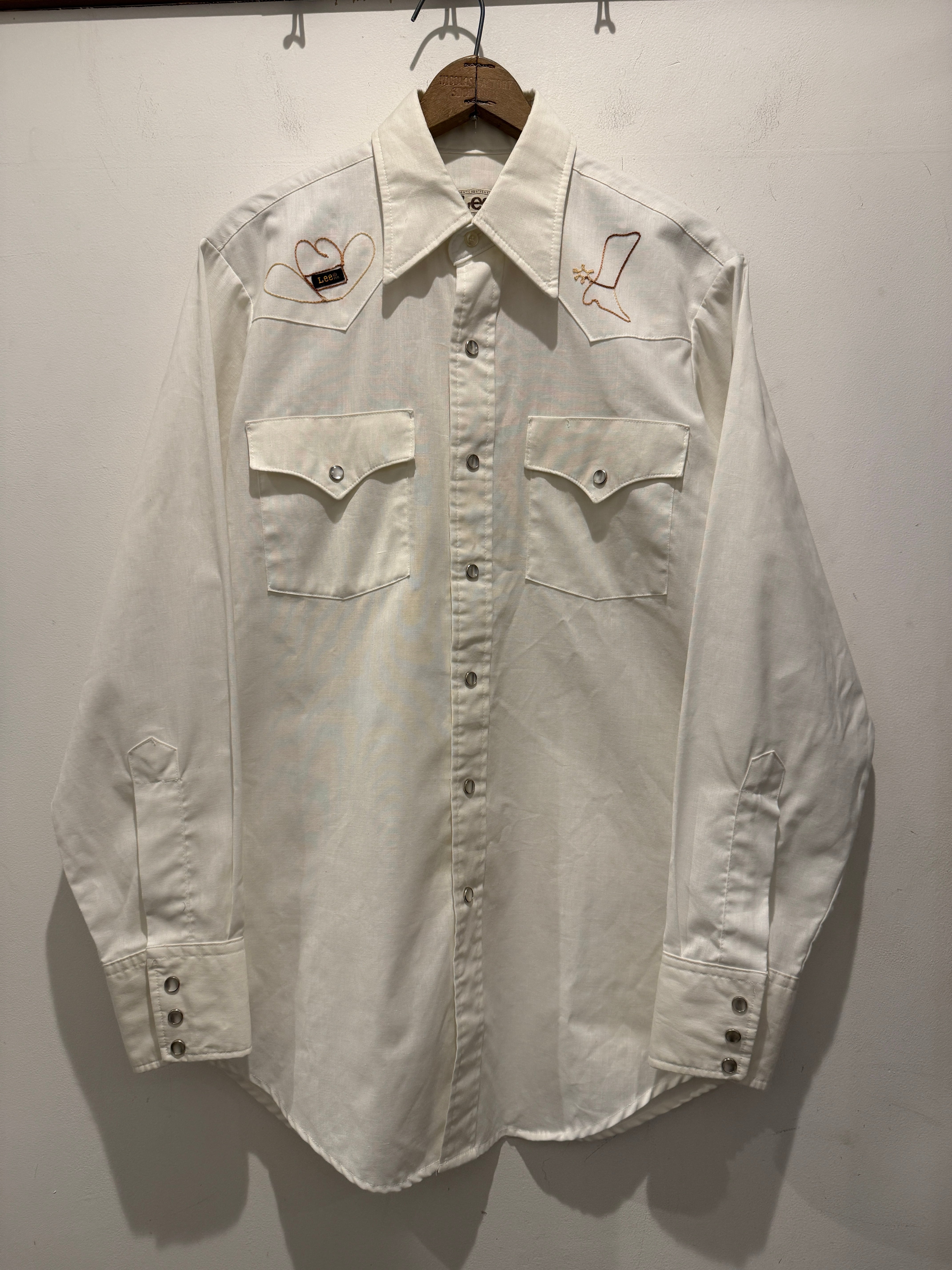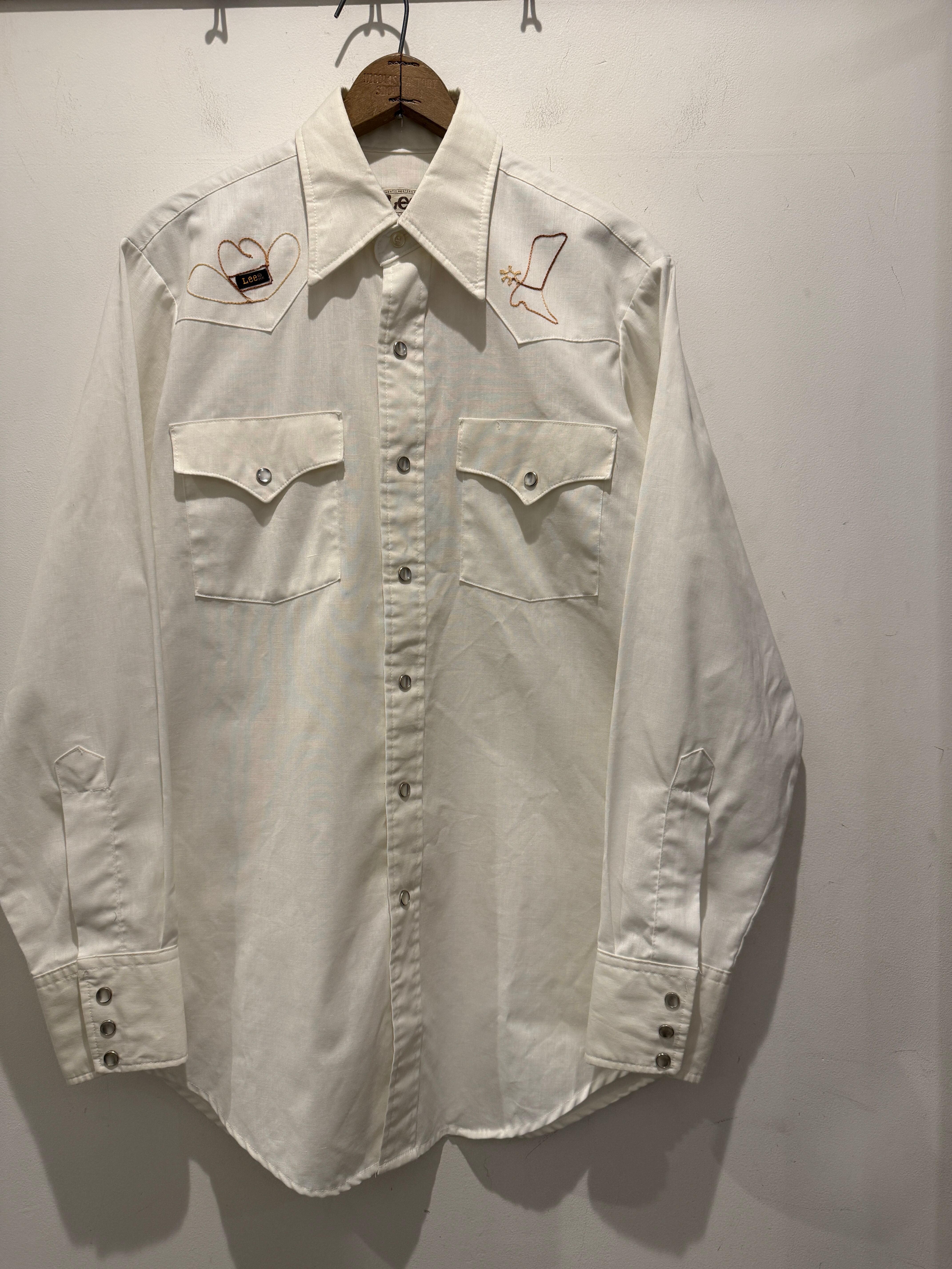 70年代アメリカ製リーのウエスタンシャツです。白ボディにフロントとバッグに刺繍デザインが入るとても良い1着です。カウボーイハットにLeeのピスタグが使われていたり面白いですね。ウエスタンシャツとしては身幅もしっかりあって白ボディでコンディションも良くとオススメです。