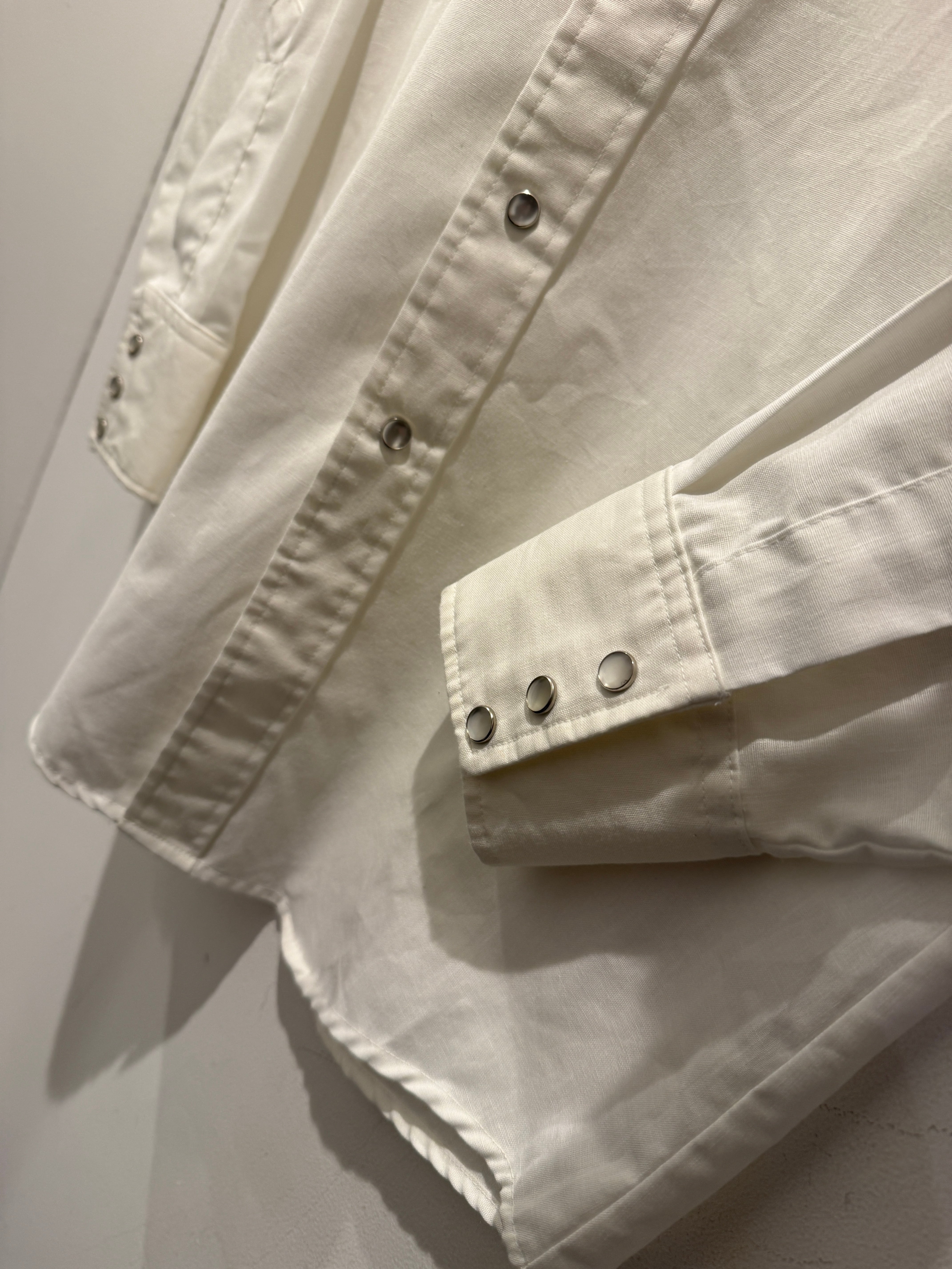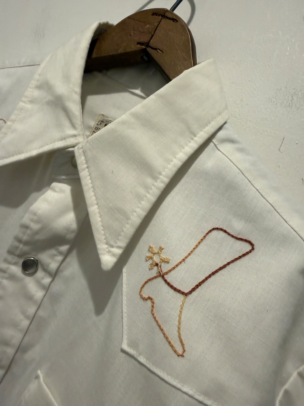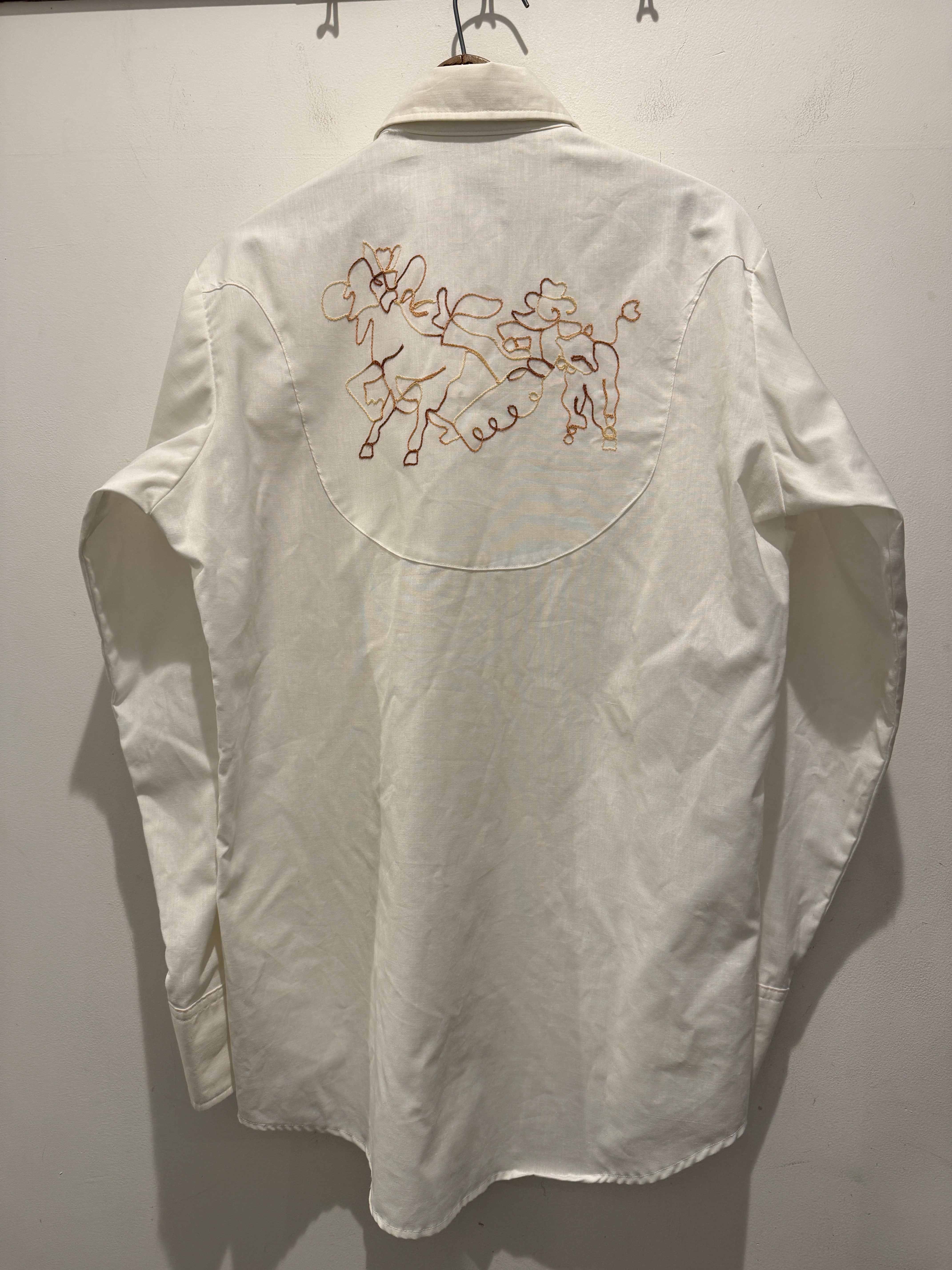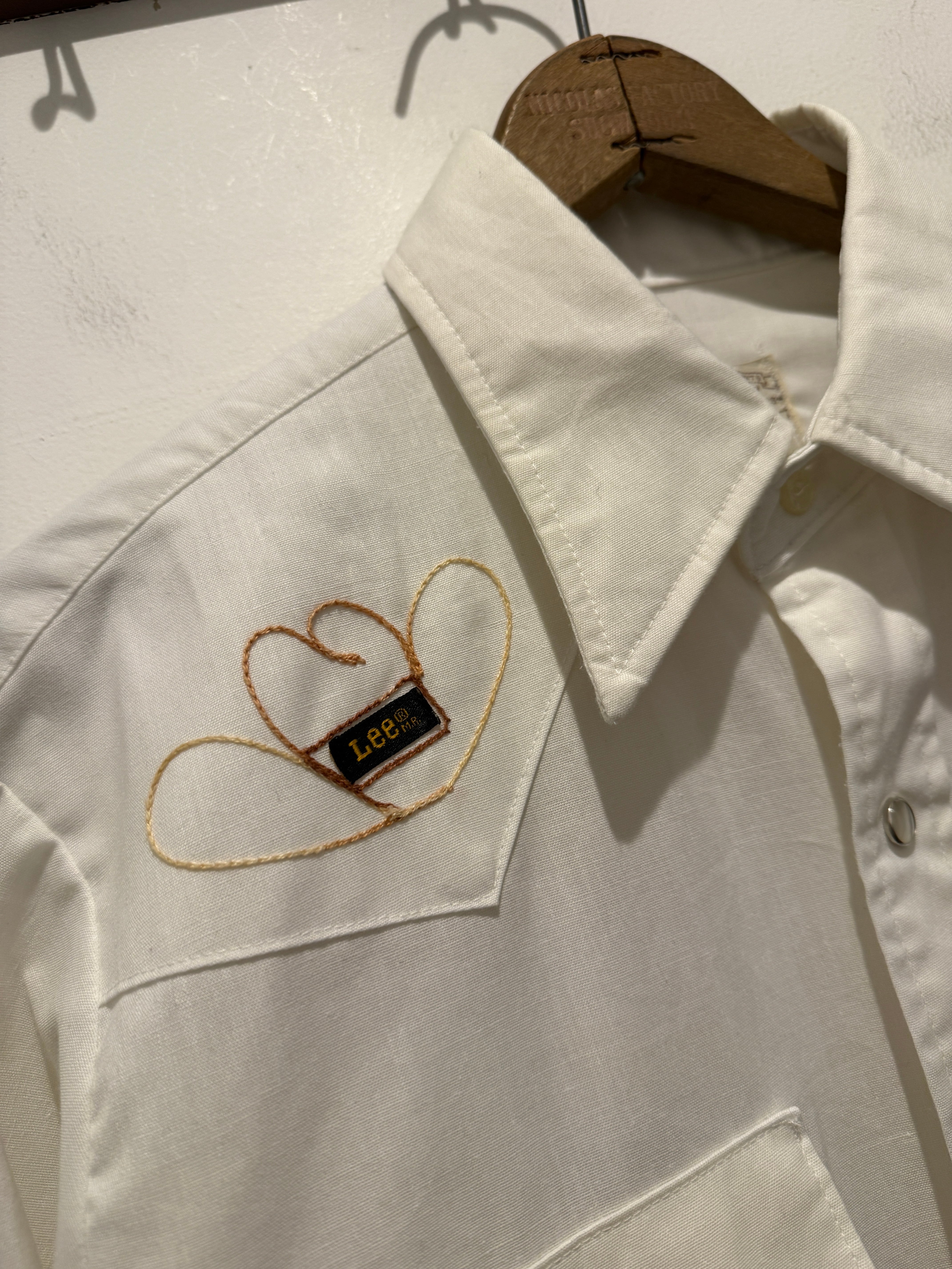 70年代アメリカ製リーのウエスタンシャツです。白ボディにフロントとバッグに刺繍デザインが入るとても良い1着です。カウボーイハットにLeeのピスタグが使われていたり面白いですね。ウエスタンシャツとしては身幅もしっかりあって白ボディでコンディションも良くとオススメです。