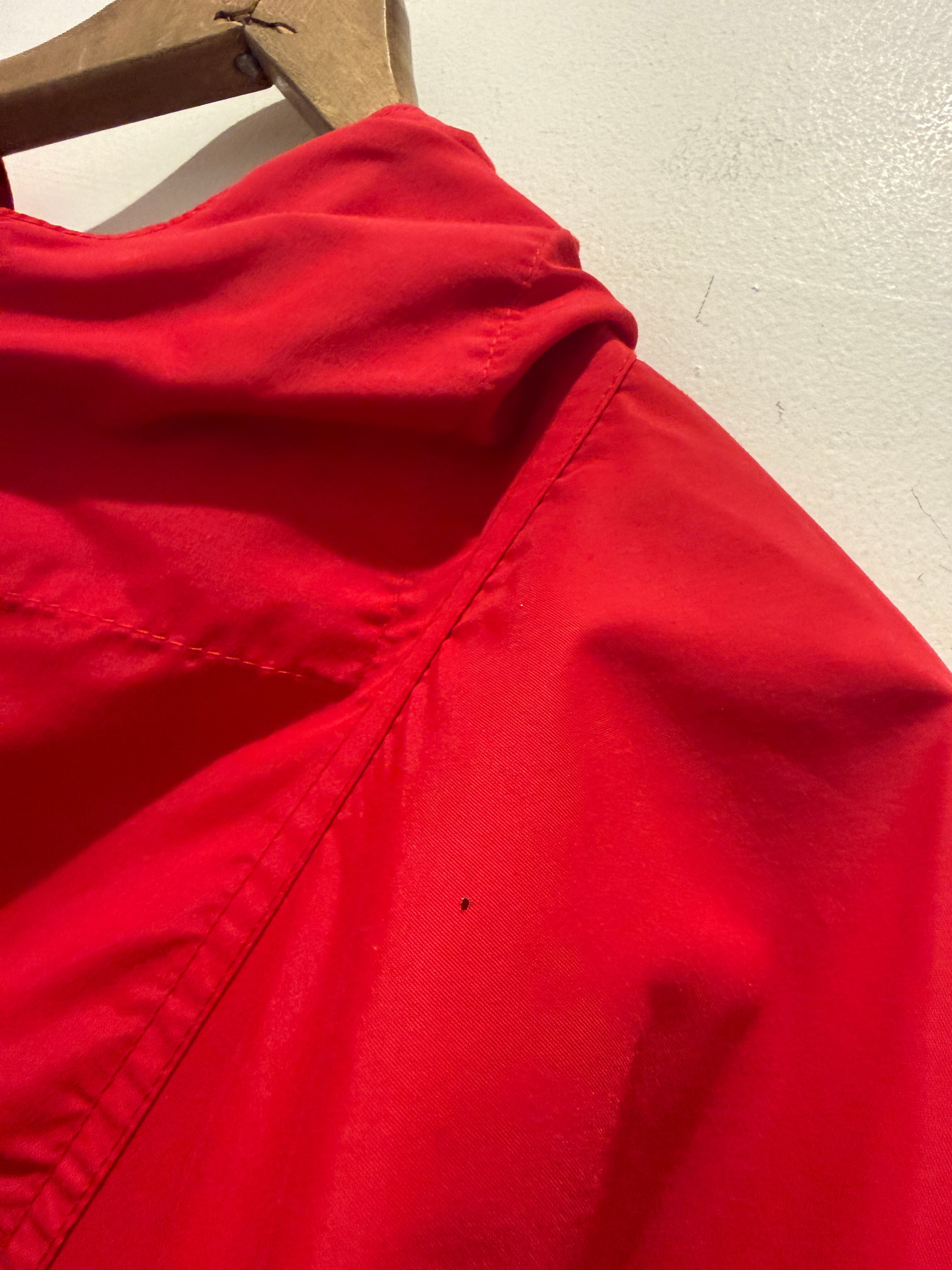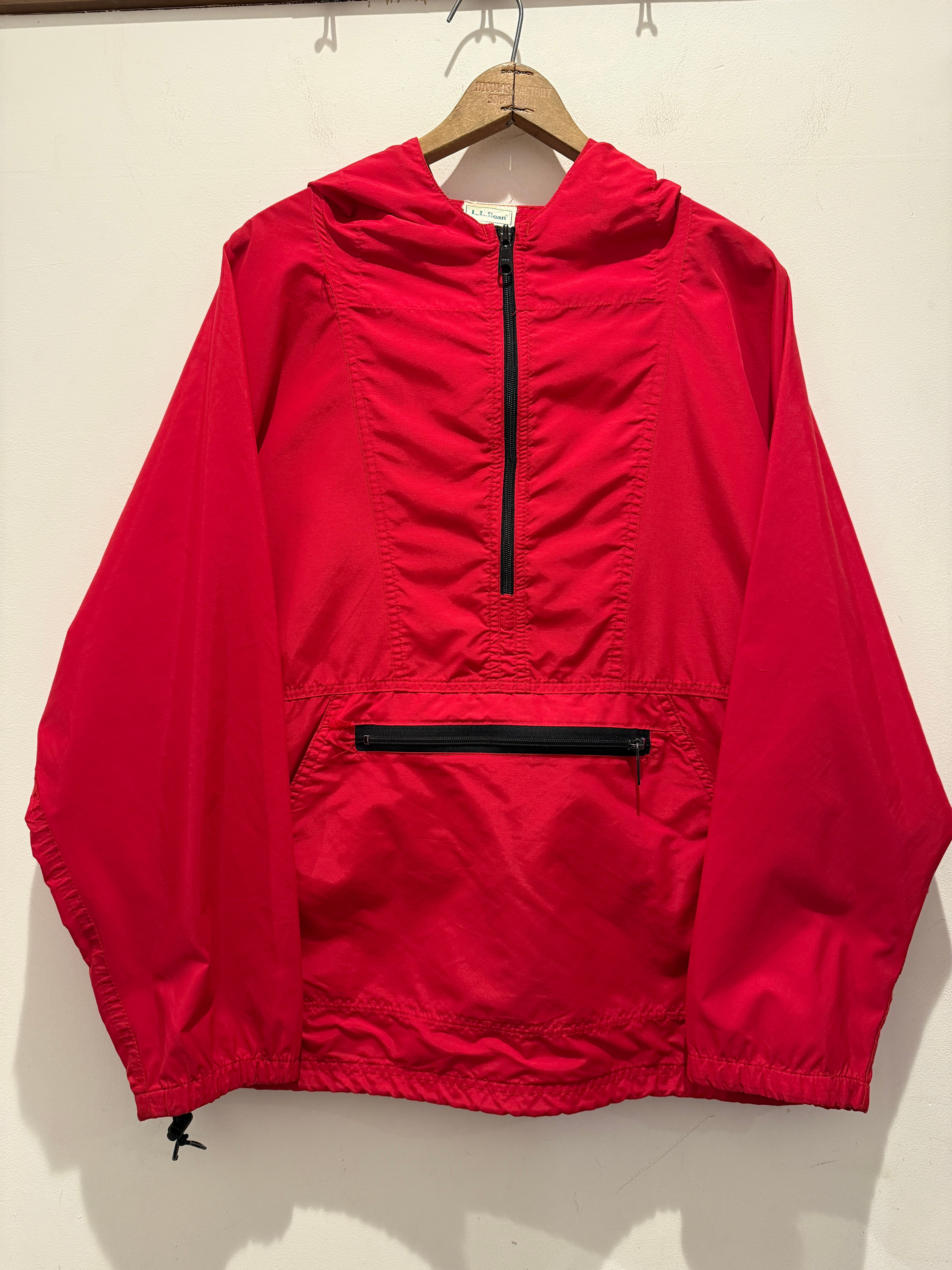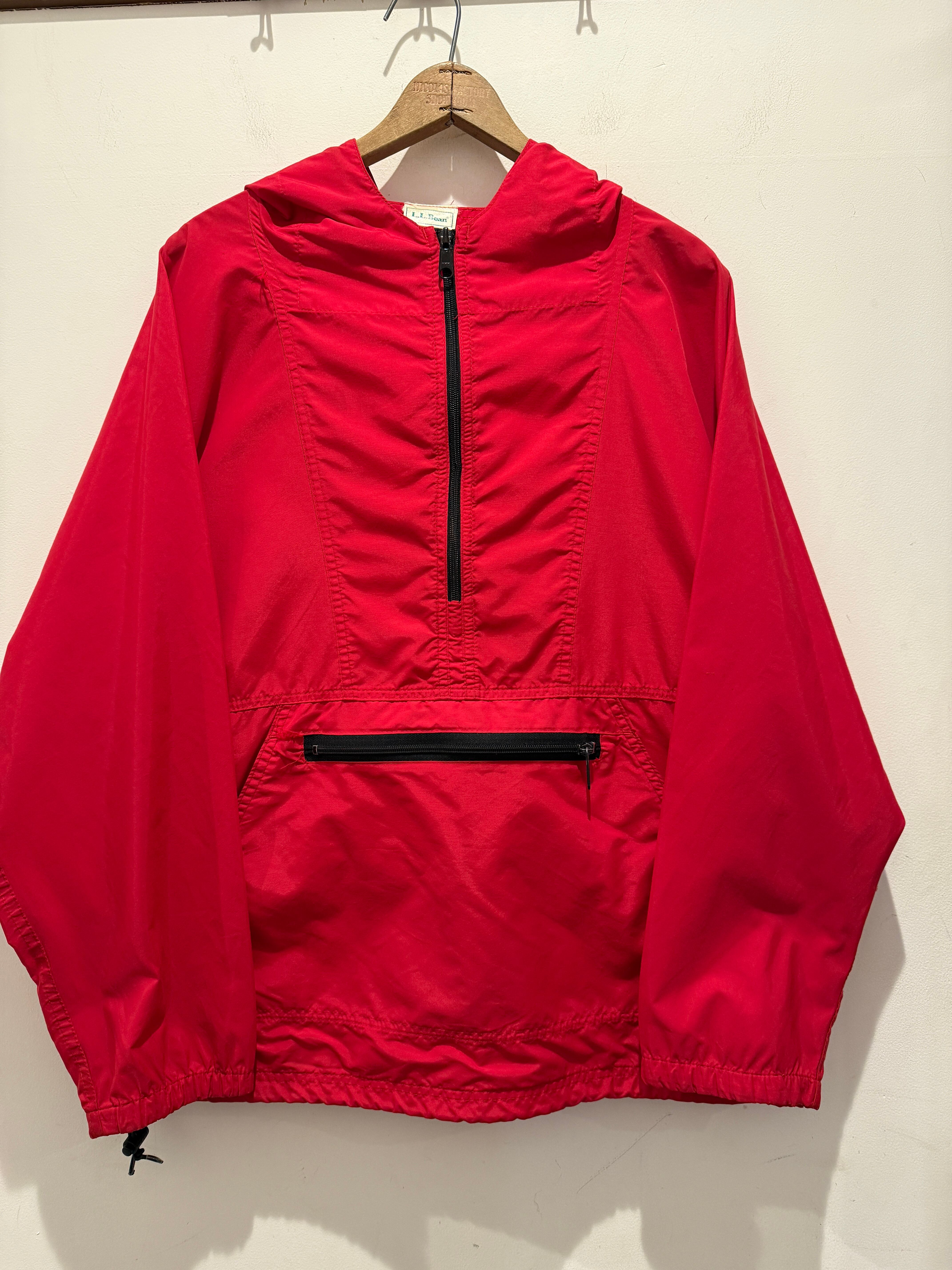 90年代L.Lビーンのアノラックパーカーです。カラーはレッドで裾の方にタグが付きます。裾にはドローコードが付いているので絞って着用するのも良いですね。折りたたんでコンパクトになるのでバッグに入れておいて雨が降った際に、取り出してサラッと着れるのもポイントです。定番アイテムとしてオススメな1着です。