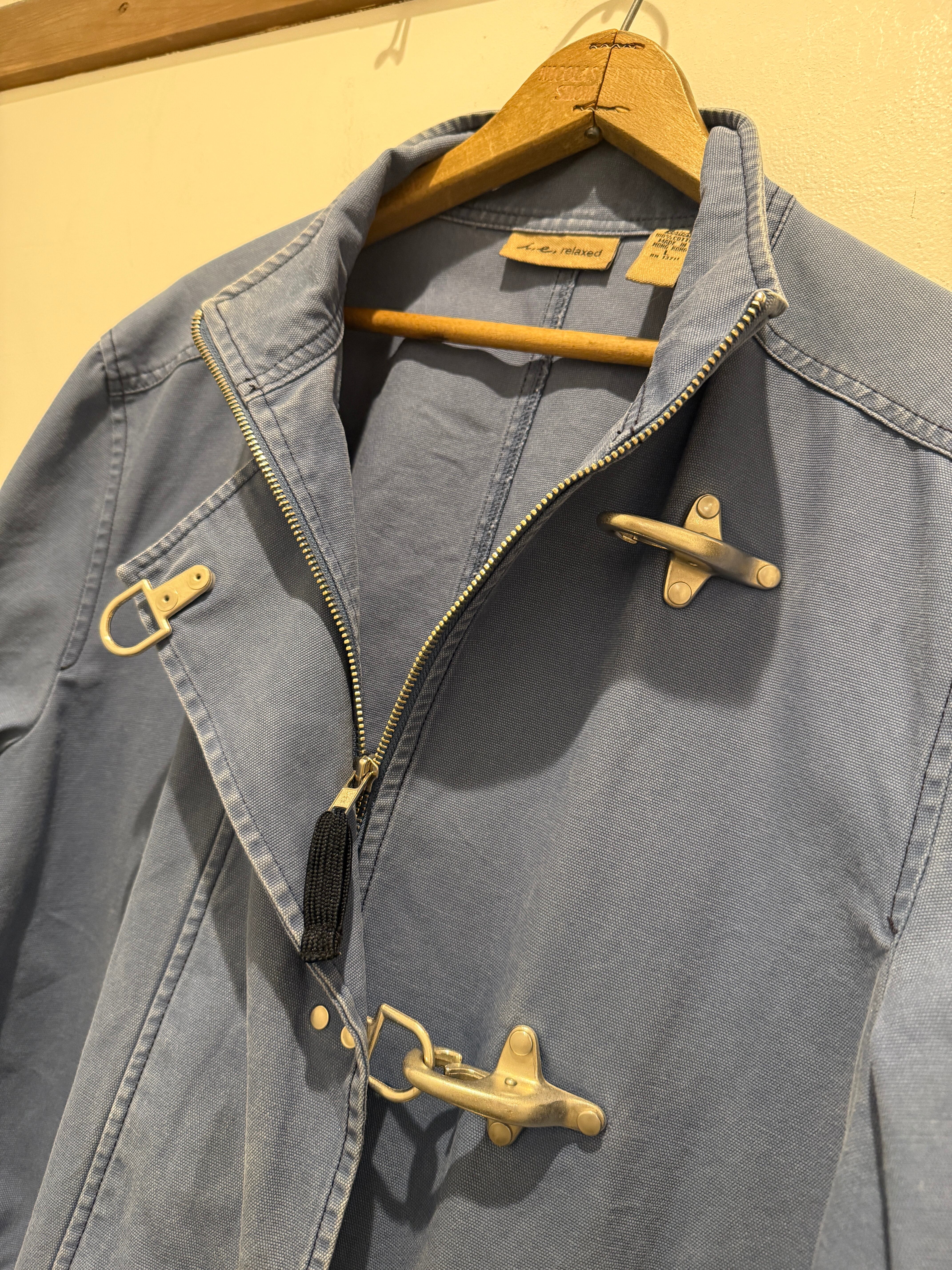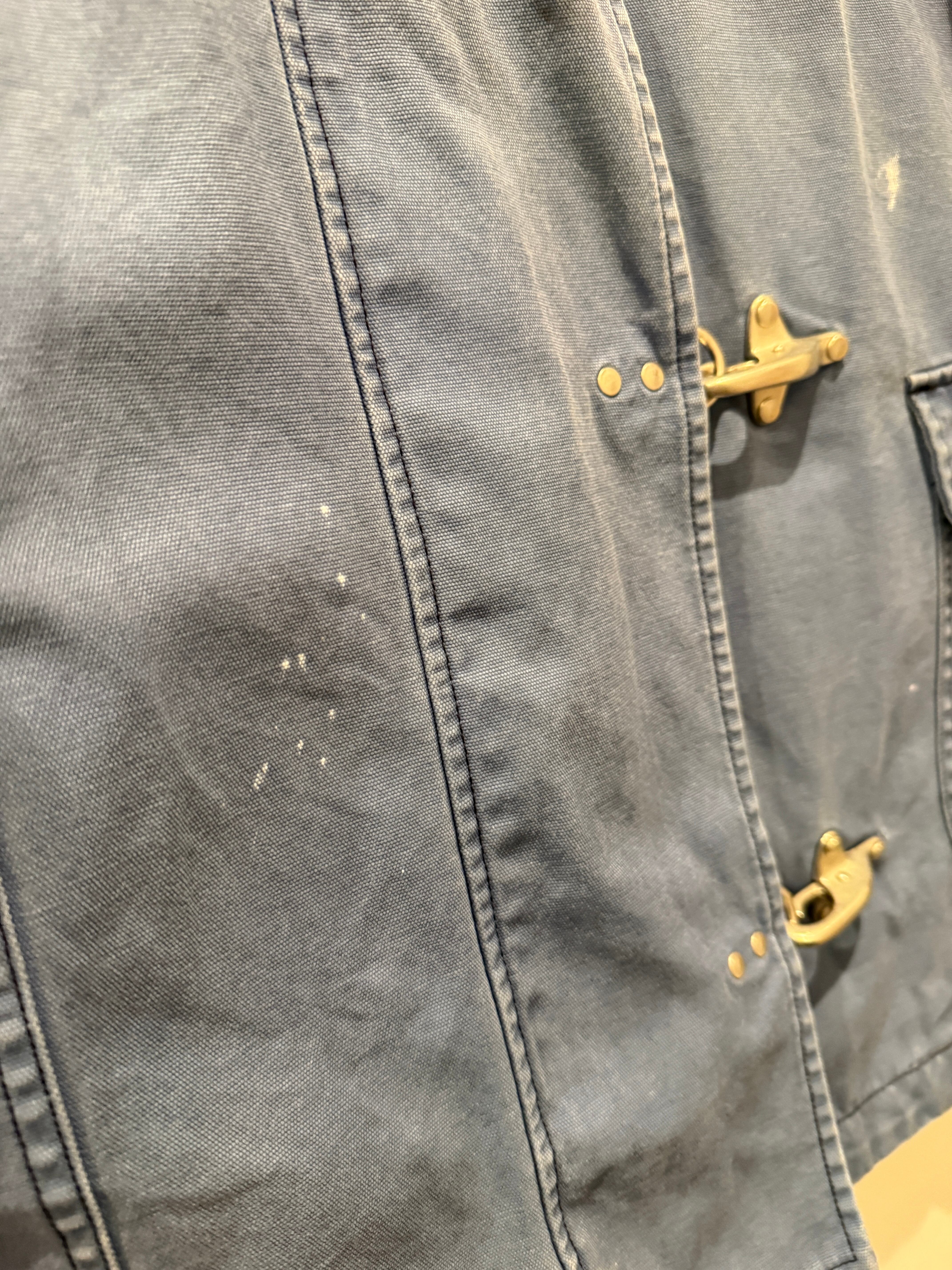 90年代〜2000年代のファイヤーマンダックジャケットです。ネイビーグレーがフェードした様な色味がとても良い1着です。スタンド襟でファイヤーマンジャケットであるフックもアクセントになっていますね。裏地が無くて着用しやすく程良いペンキなどもナイスな雰囲気とユニセックスでオススメなアイテムです。