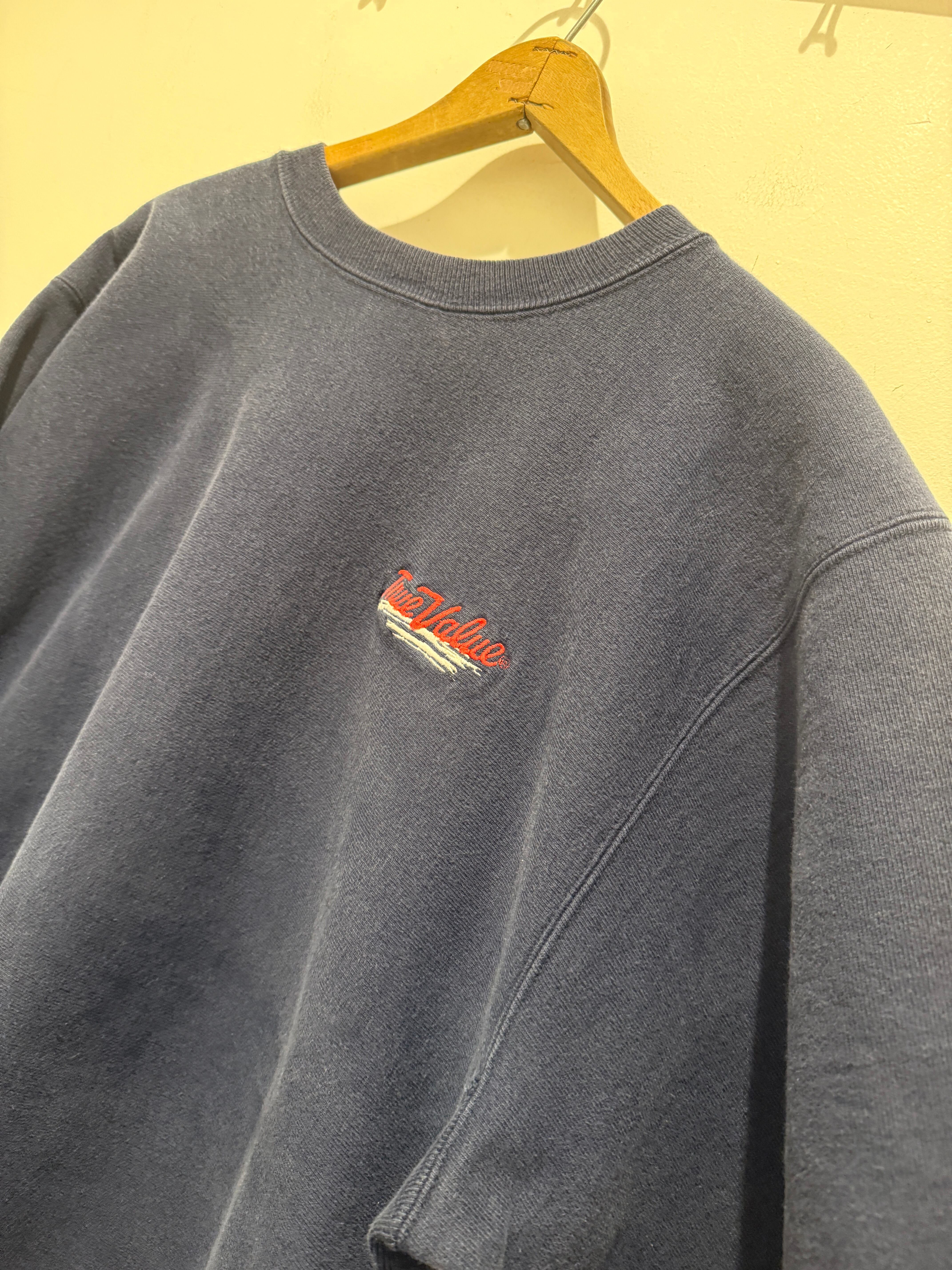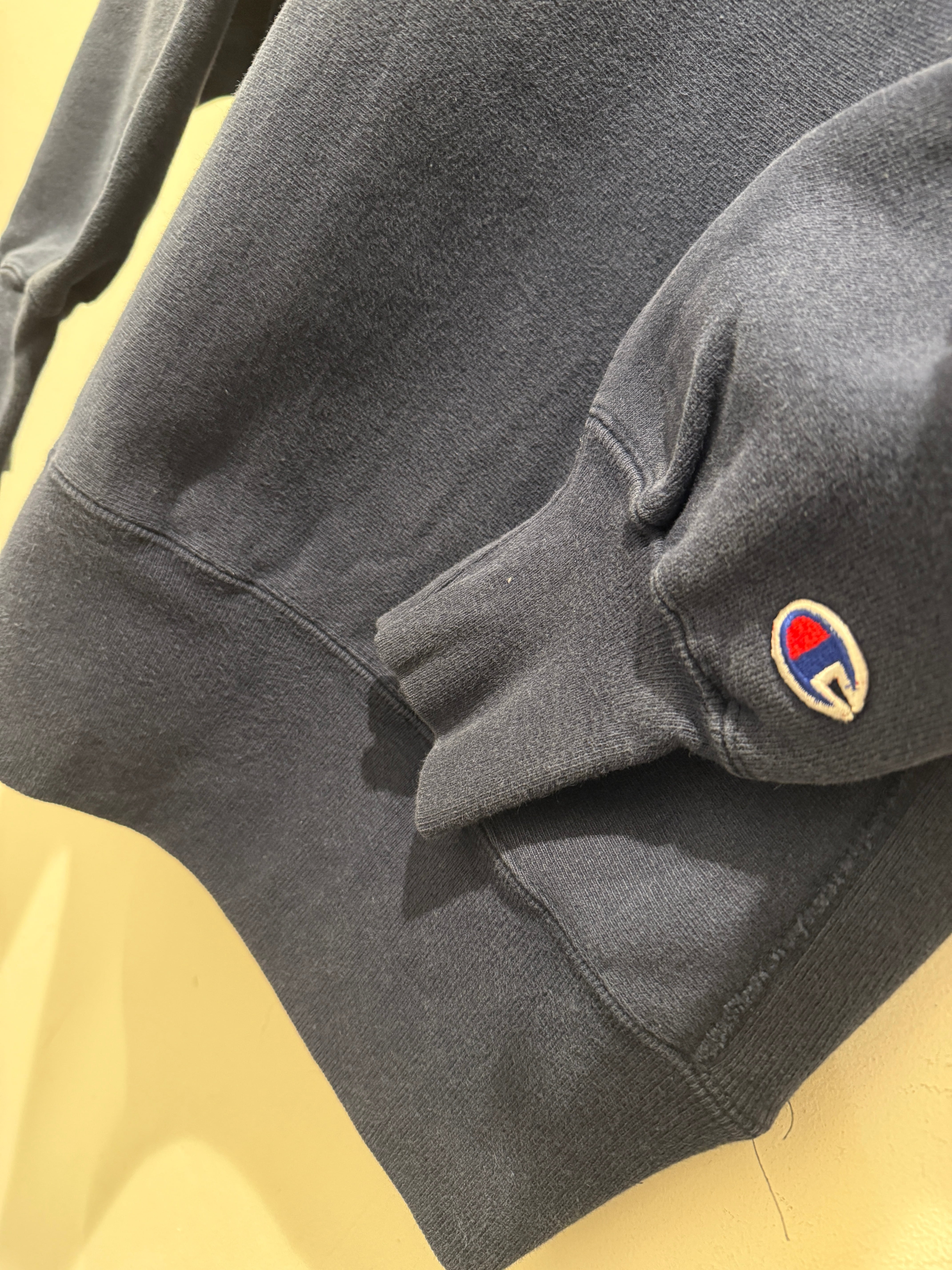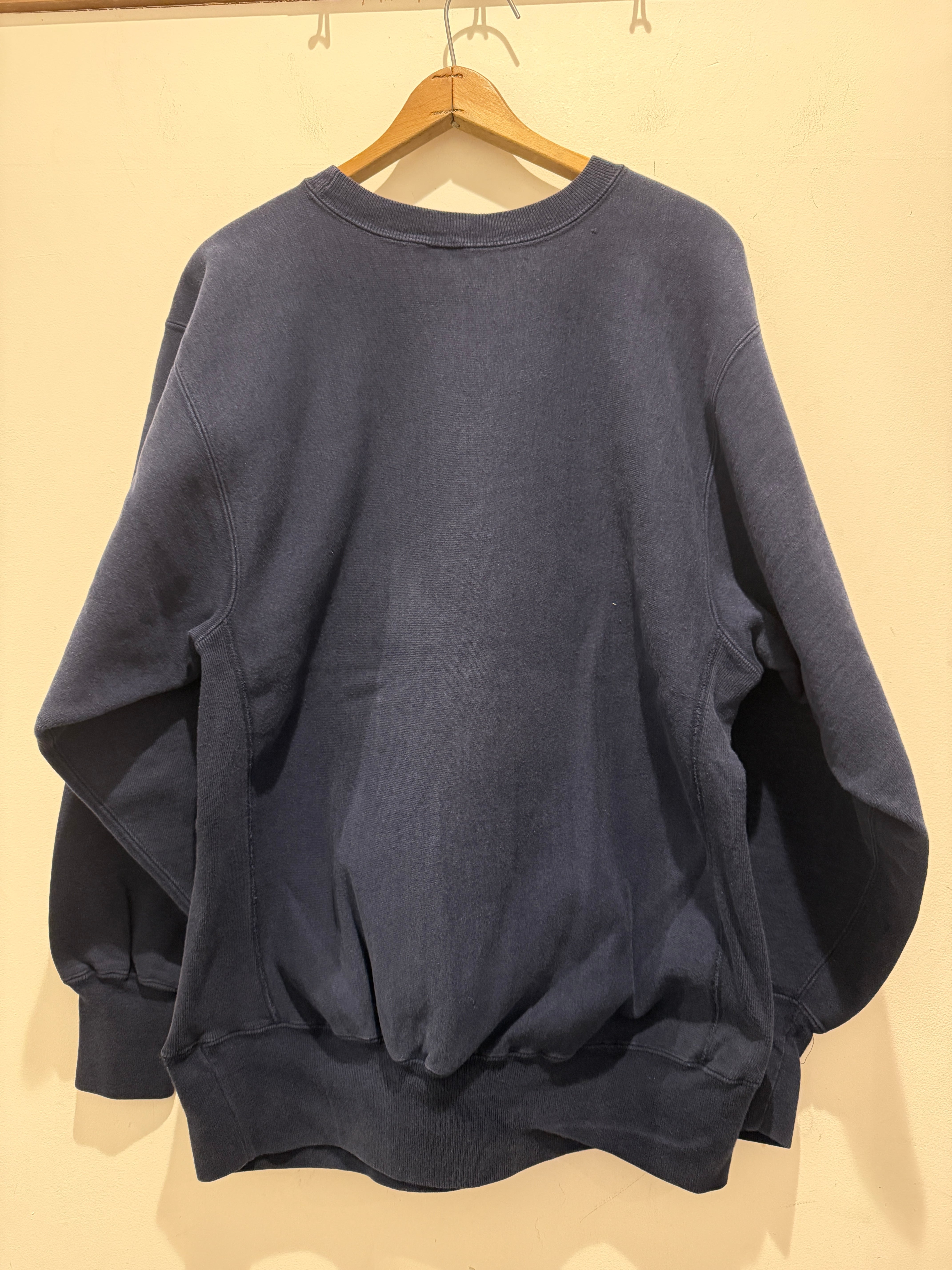 90年代アメリカ製チャンピオンのリバースウィーブです。刺繍タグが付く90年代前半の物でしっかりアメリカ製のリバースとなります。ネイビーボディに定番のカレッジプリントでは無くアメリカ企業の刺繍がワンポイントではいるデザインとシンプルでとても良い1着ですね。フェードしたネイビーボディも良くオススメなリバースです。