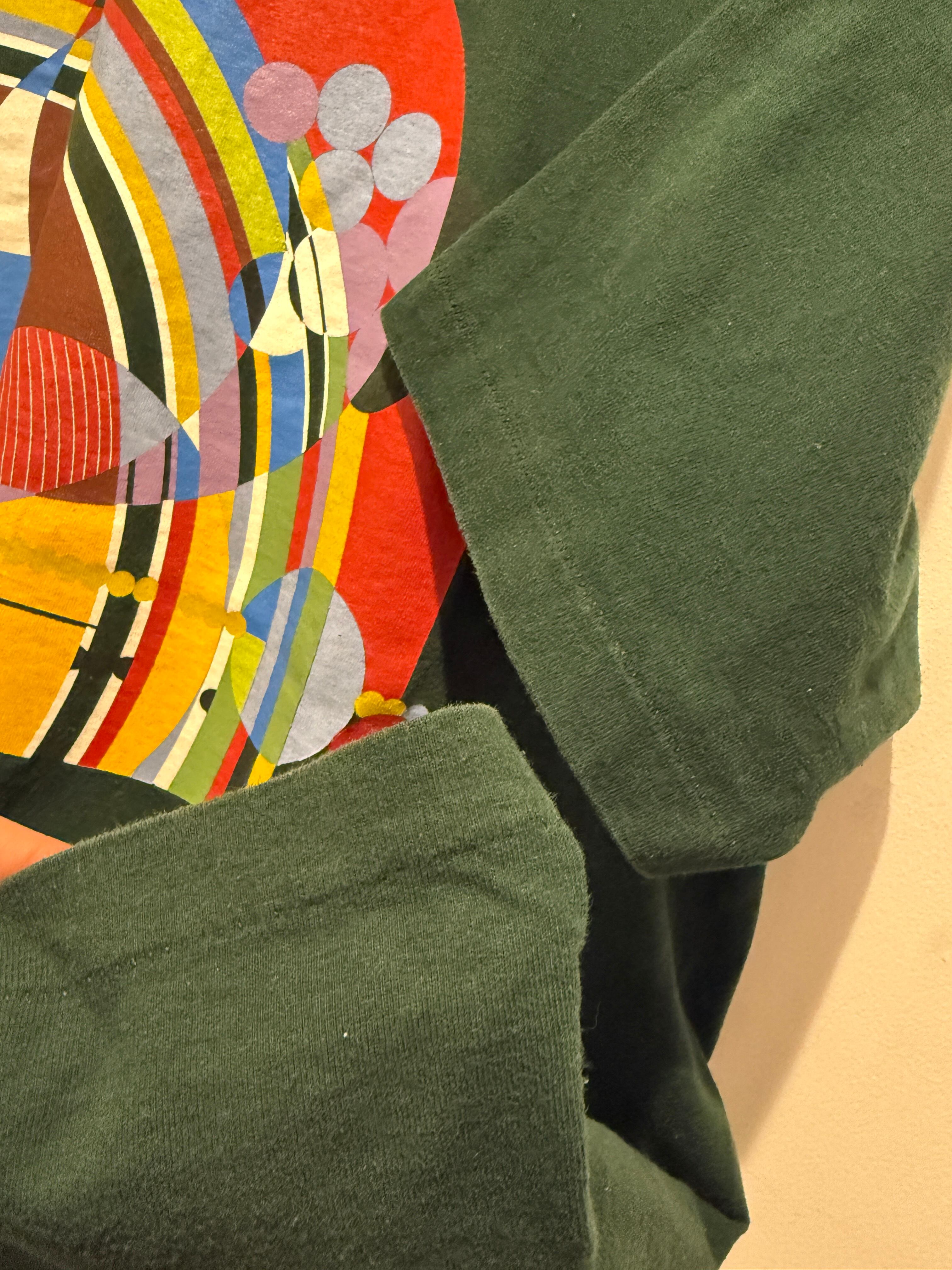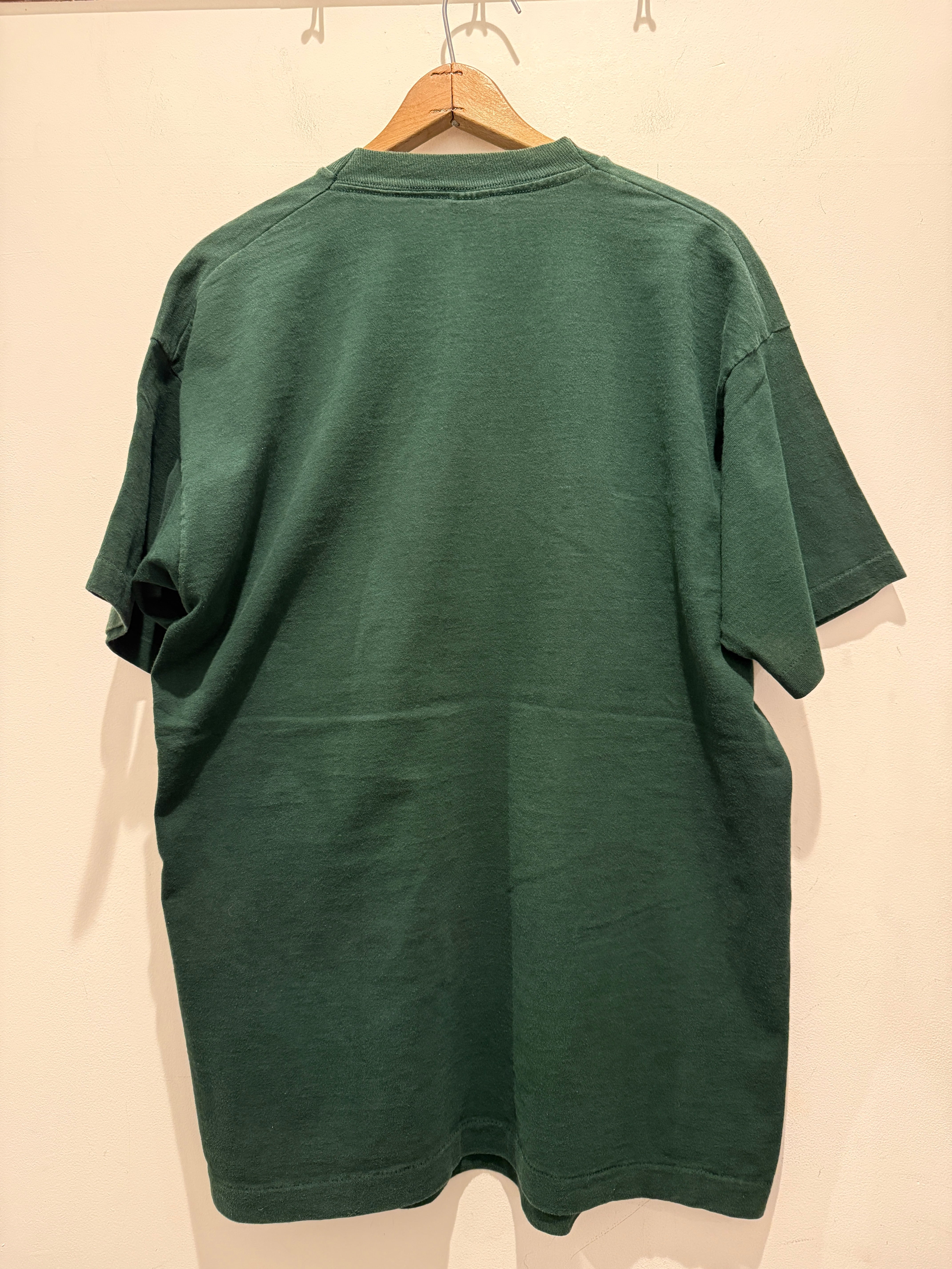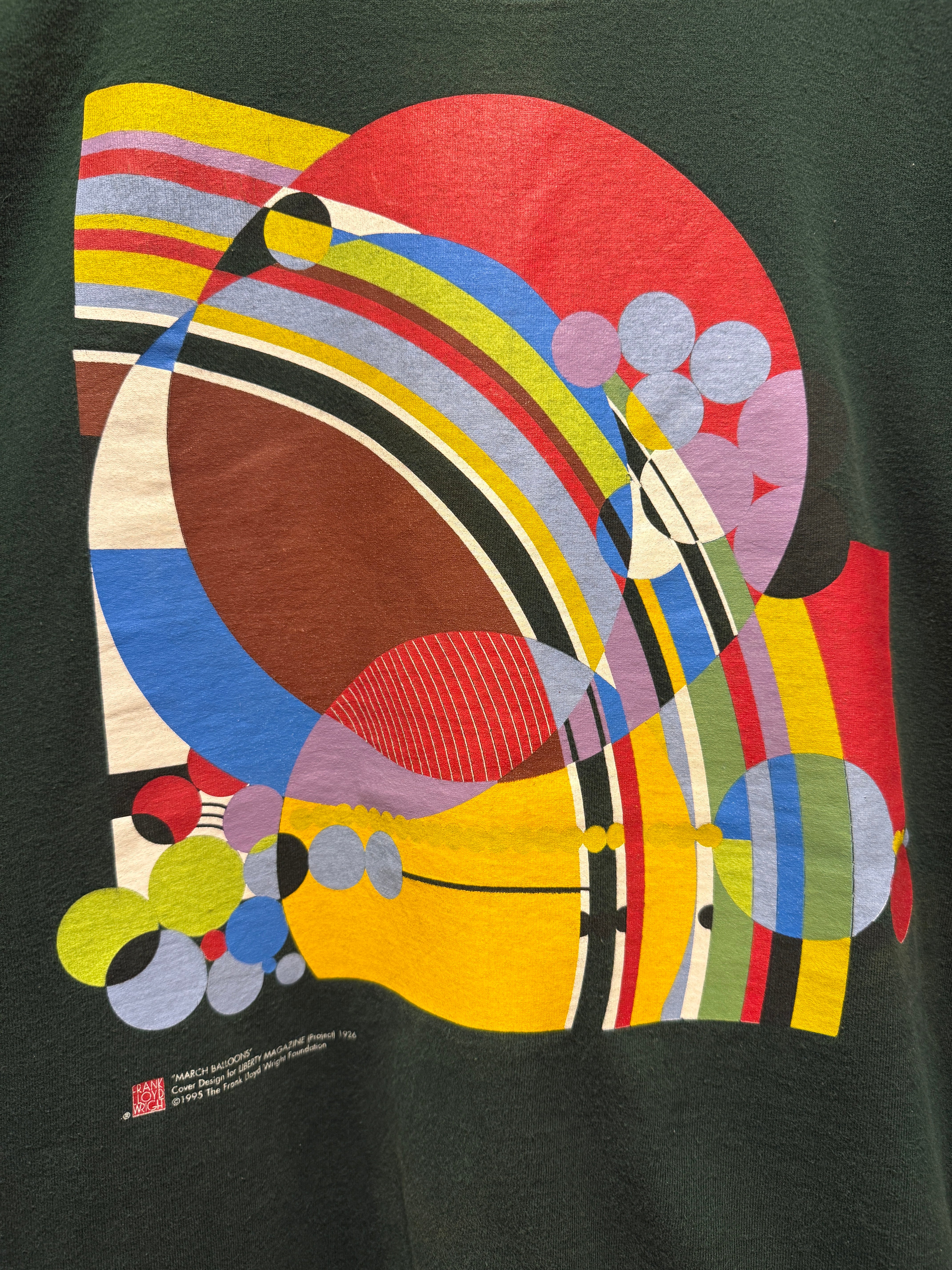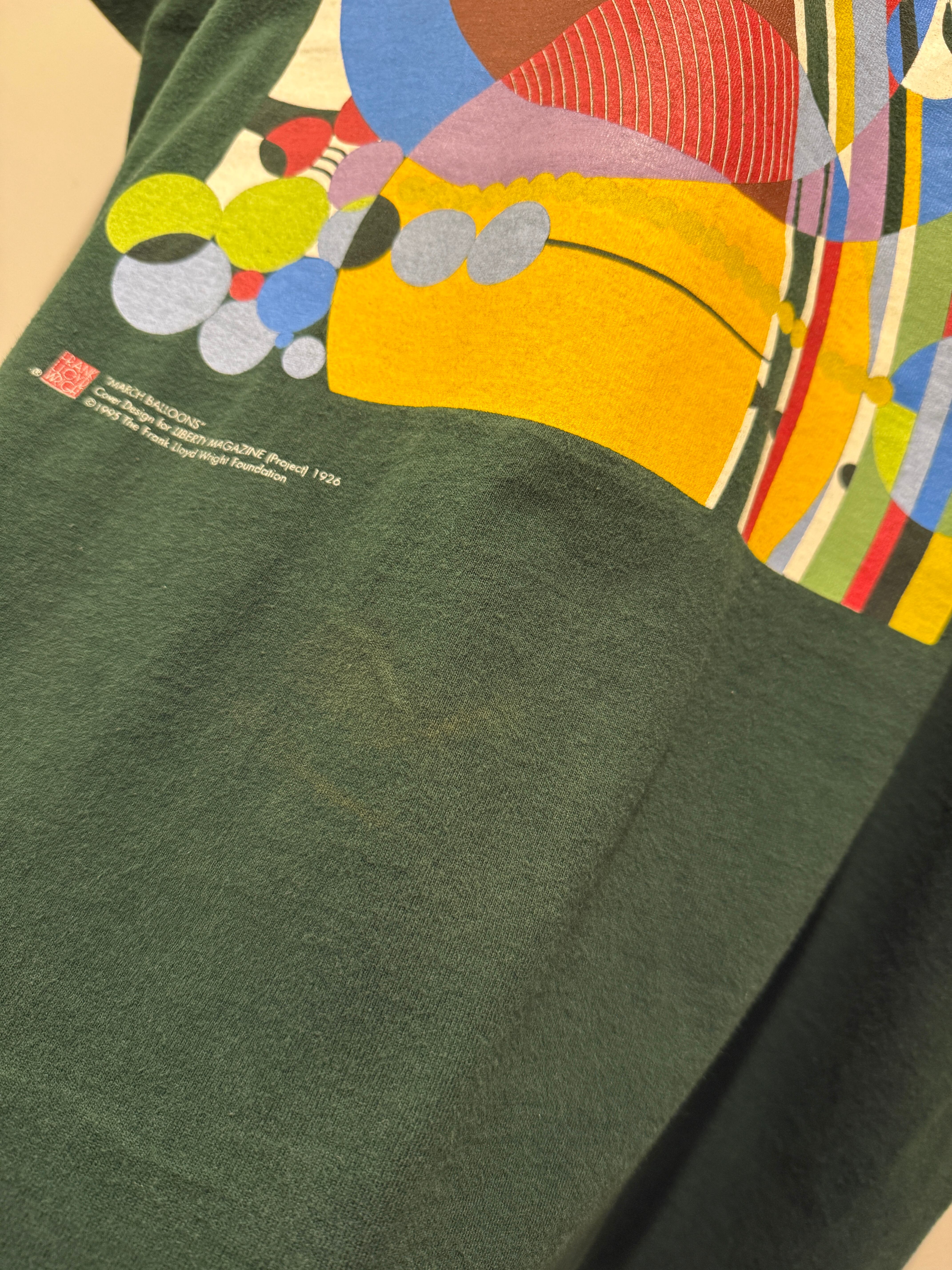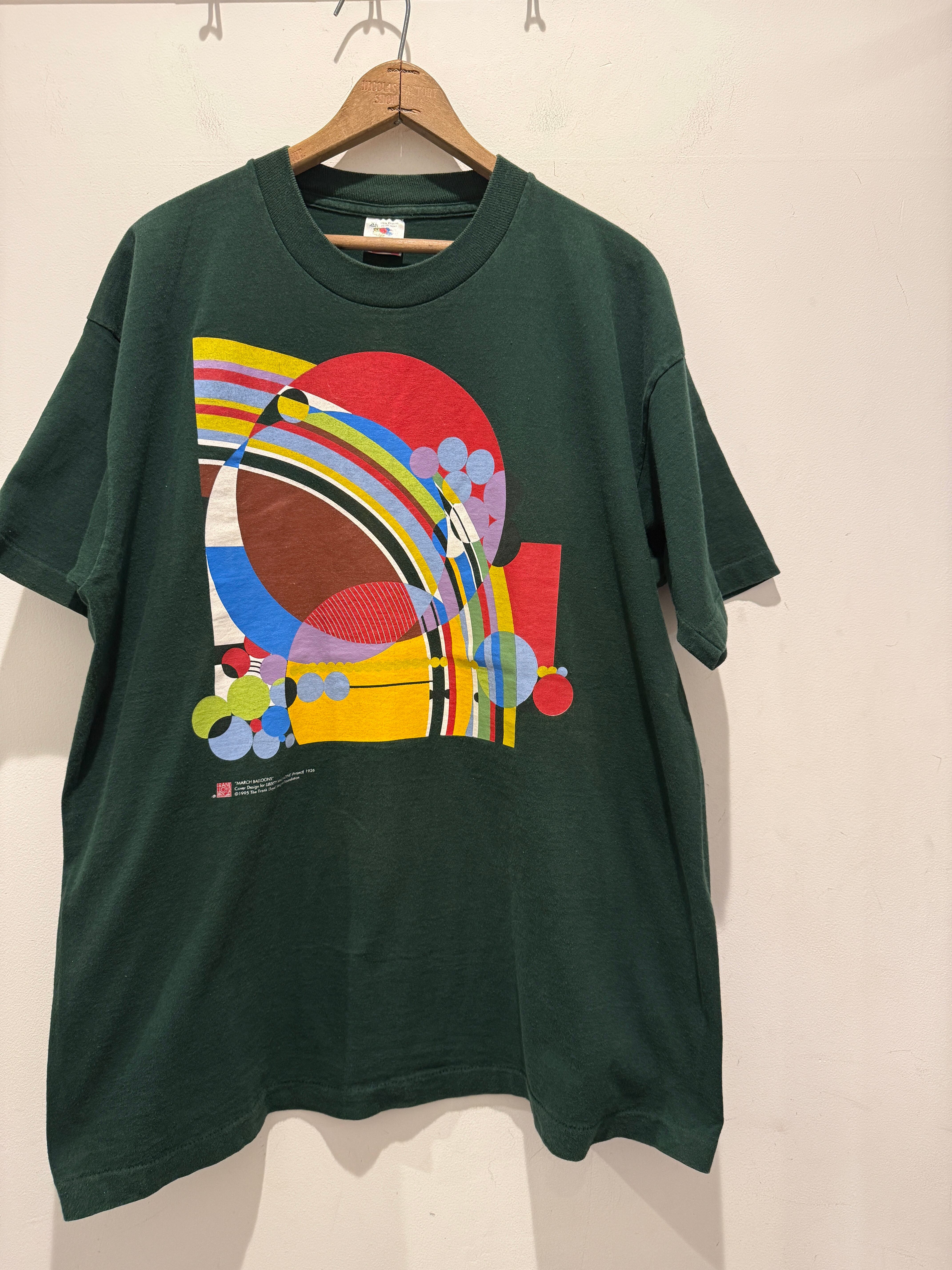90年代アメリカ製フランク ロイド ライトのTシャツです。アメリカの建築家フランク ロイド ライトの「マーチ・バルーンズ」のデザインがプリントされたTシャツとなります。グリーンボディにカラフルなプリントバランスがアートで最高ですね。アメリカ製のフルーツタグで袖、裾共にシングルステッチとなります。サイズもXLとオススメなTシャツです。