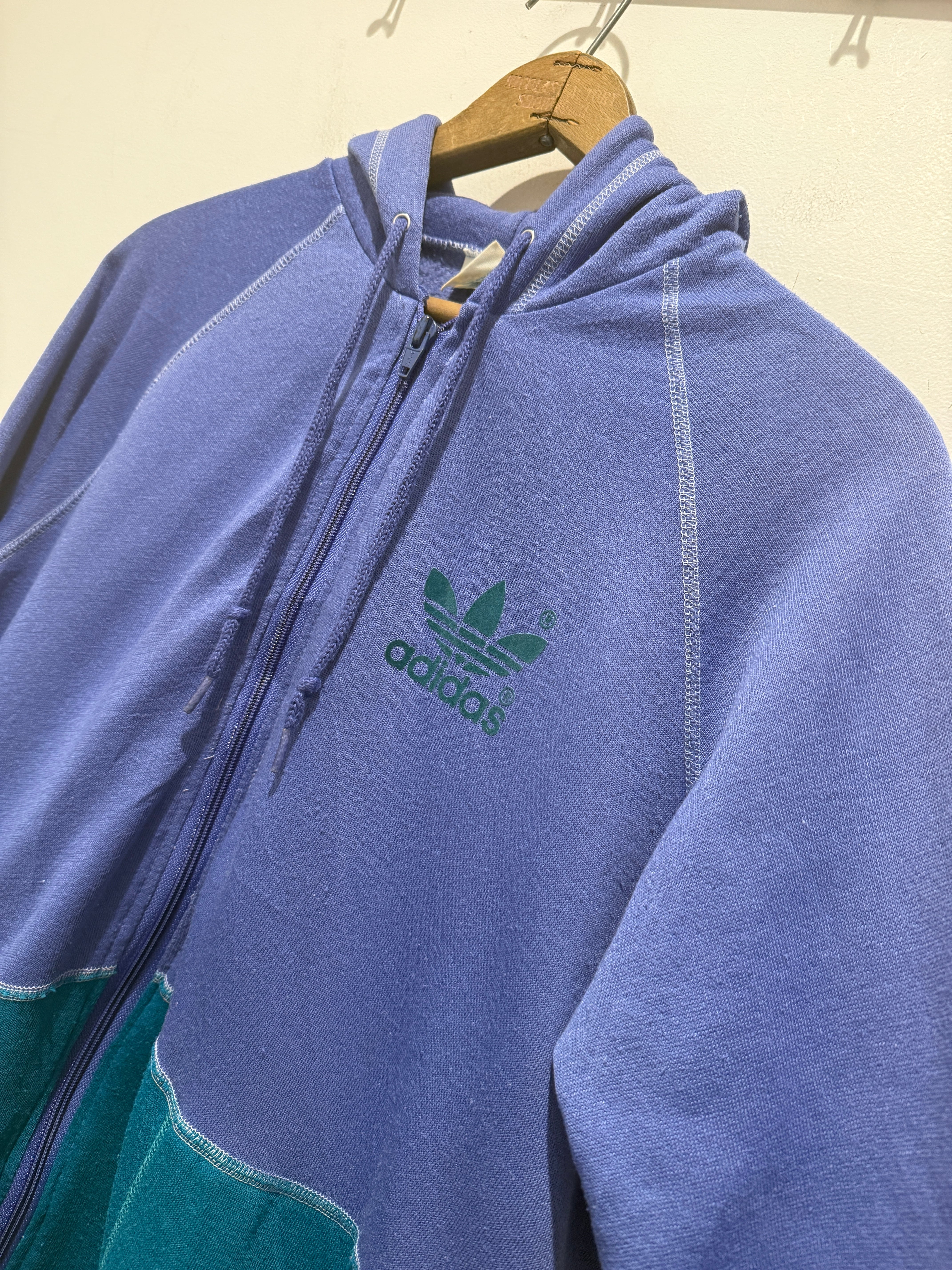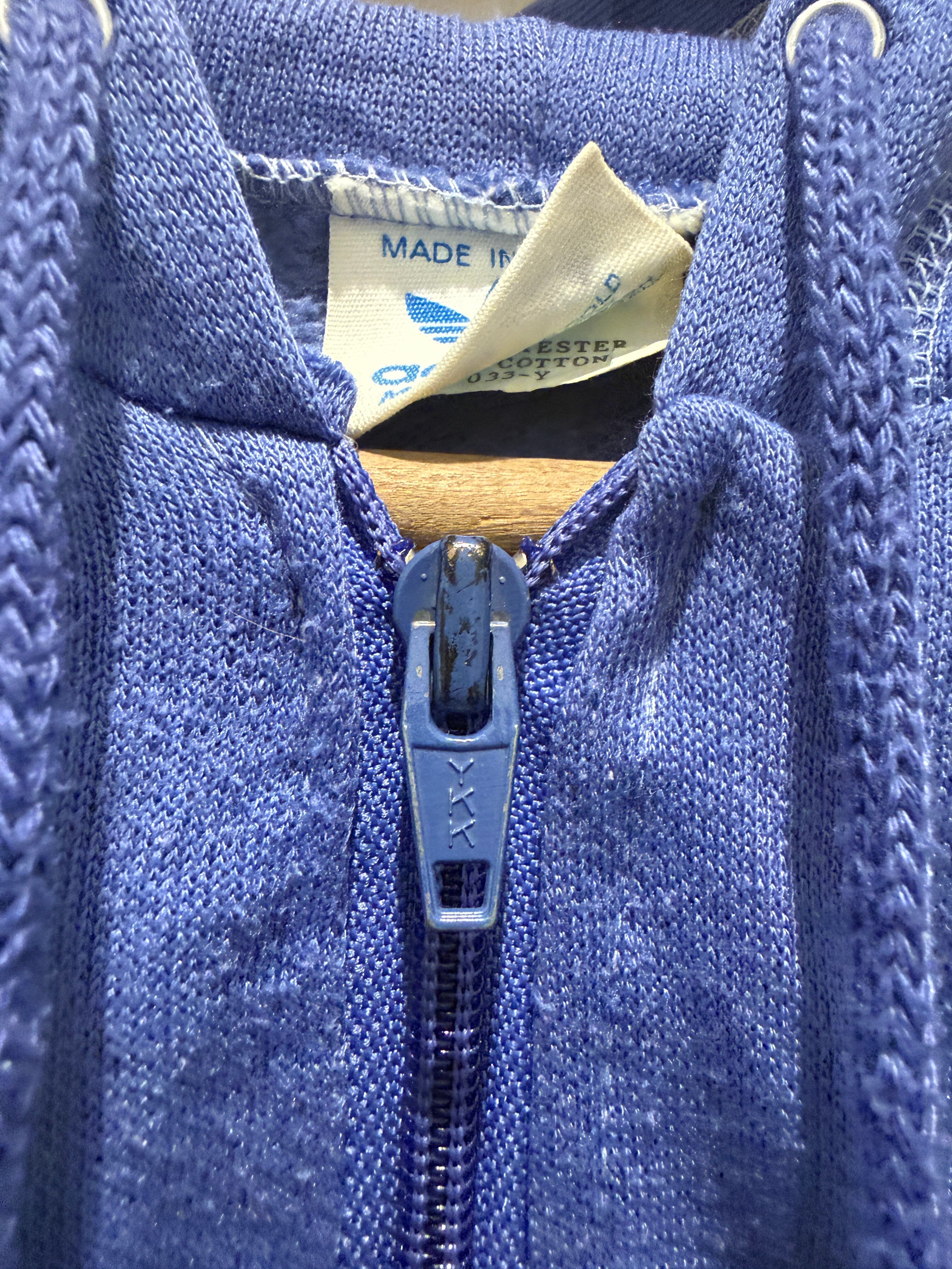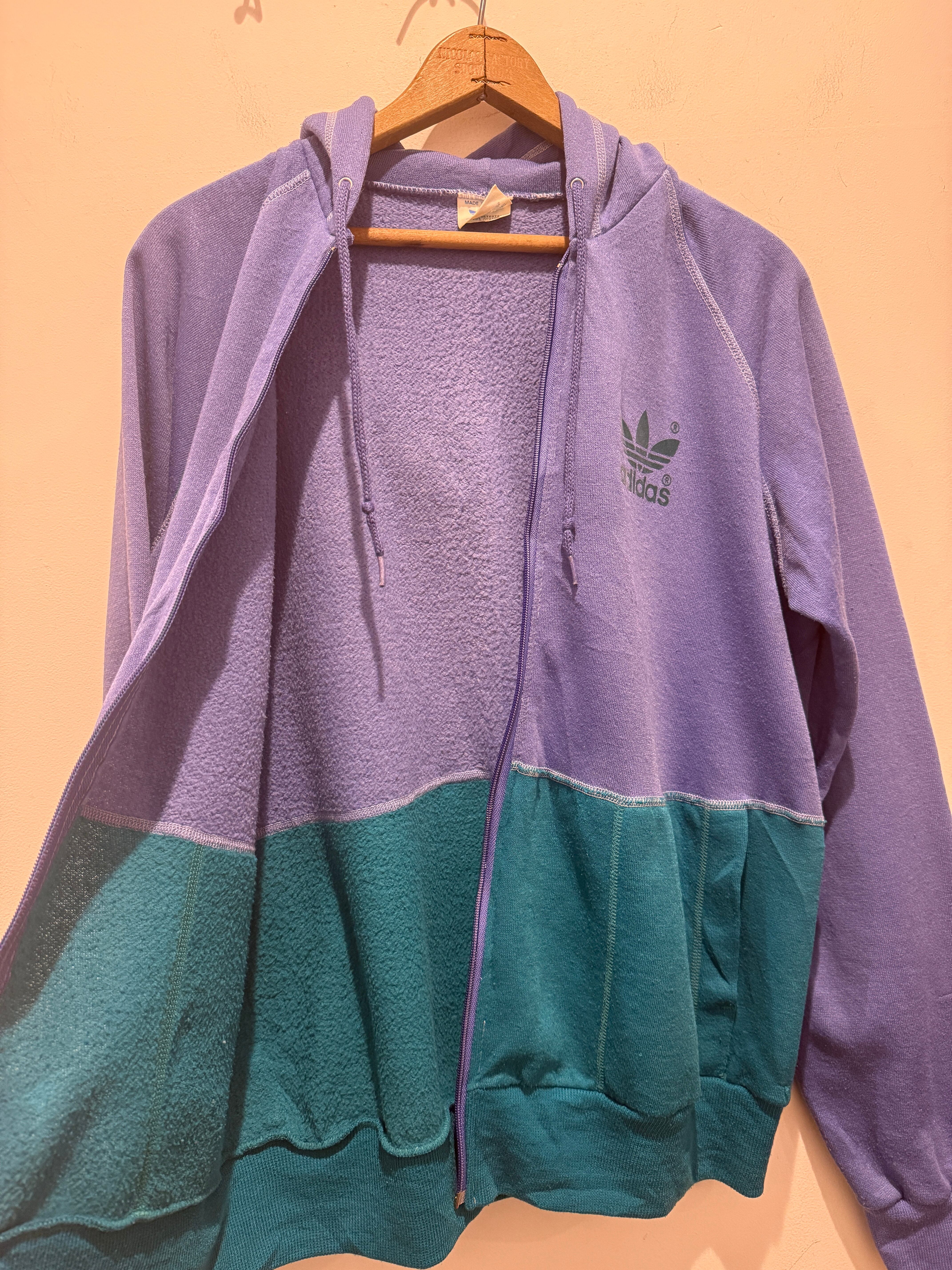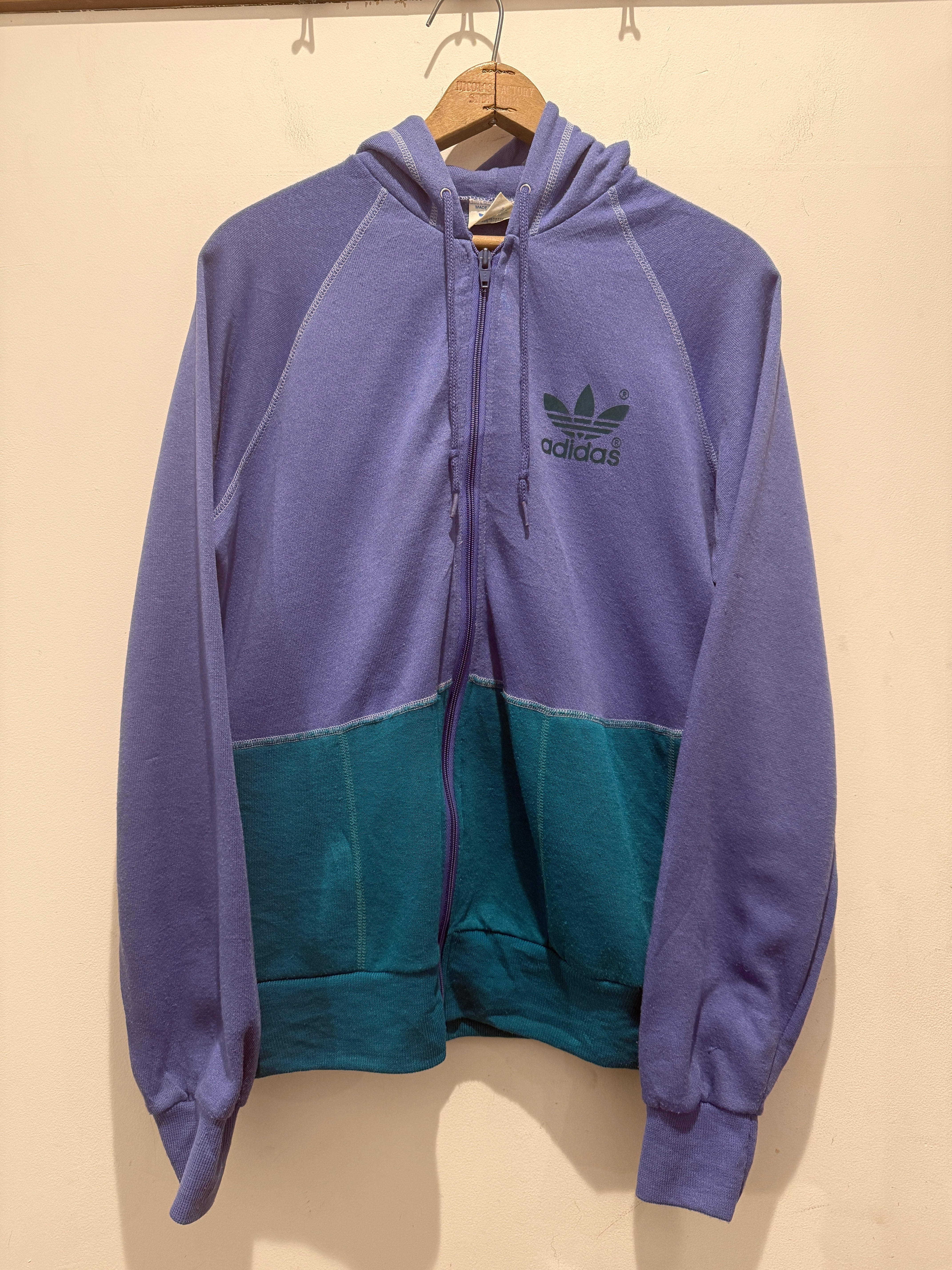 80年代アメリカ製アディダスのフルジップパーカーです。ラベンダーカラー×エメラルドグリーンの配色がとても良い1着です。フルジップなのも着やすくて使いやすいですね。アメリカ製のオールドアディダスとユニセックスでオススメなアイテムです。
