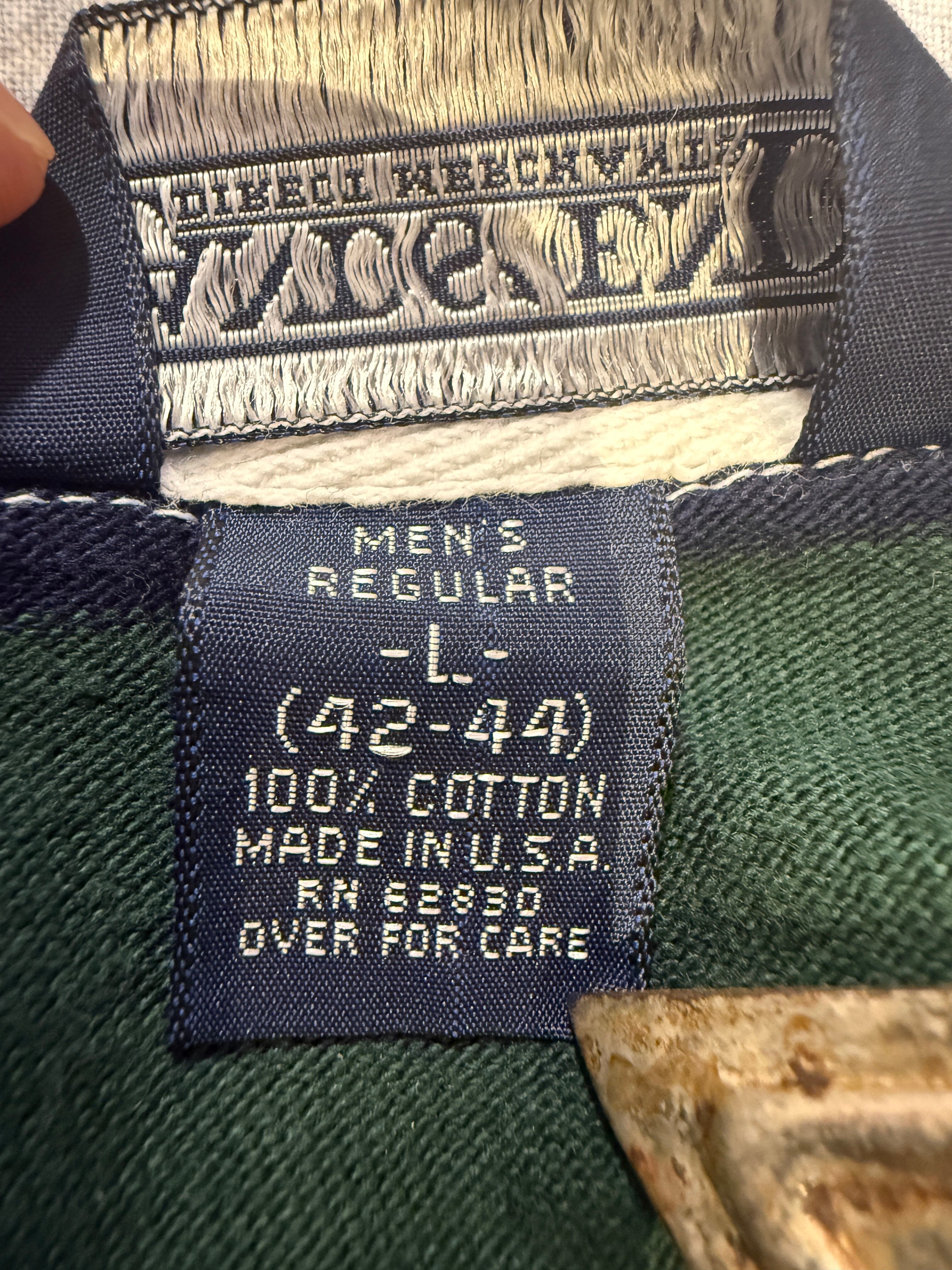 90年代アメリカ製ランズエンドのラガーシャツです。ネイビー×グリーンのボーダーパターンがとても良い1着です。襟元がシャンブレー生地になっているのも最高ですね。ファッションのアクセントに使えるアイテムでアメリカ製とユニセックスでオススメです。