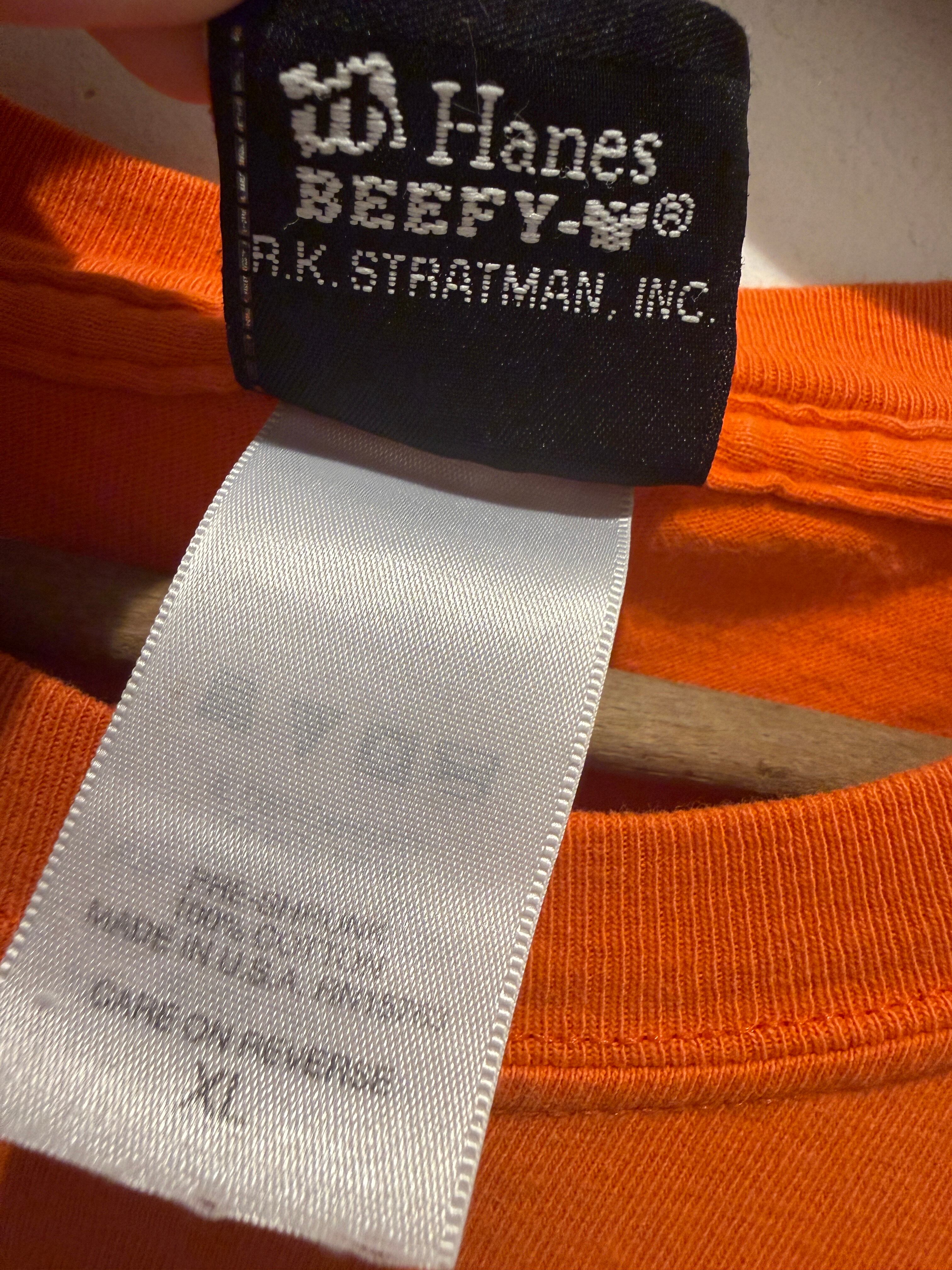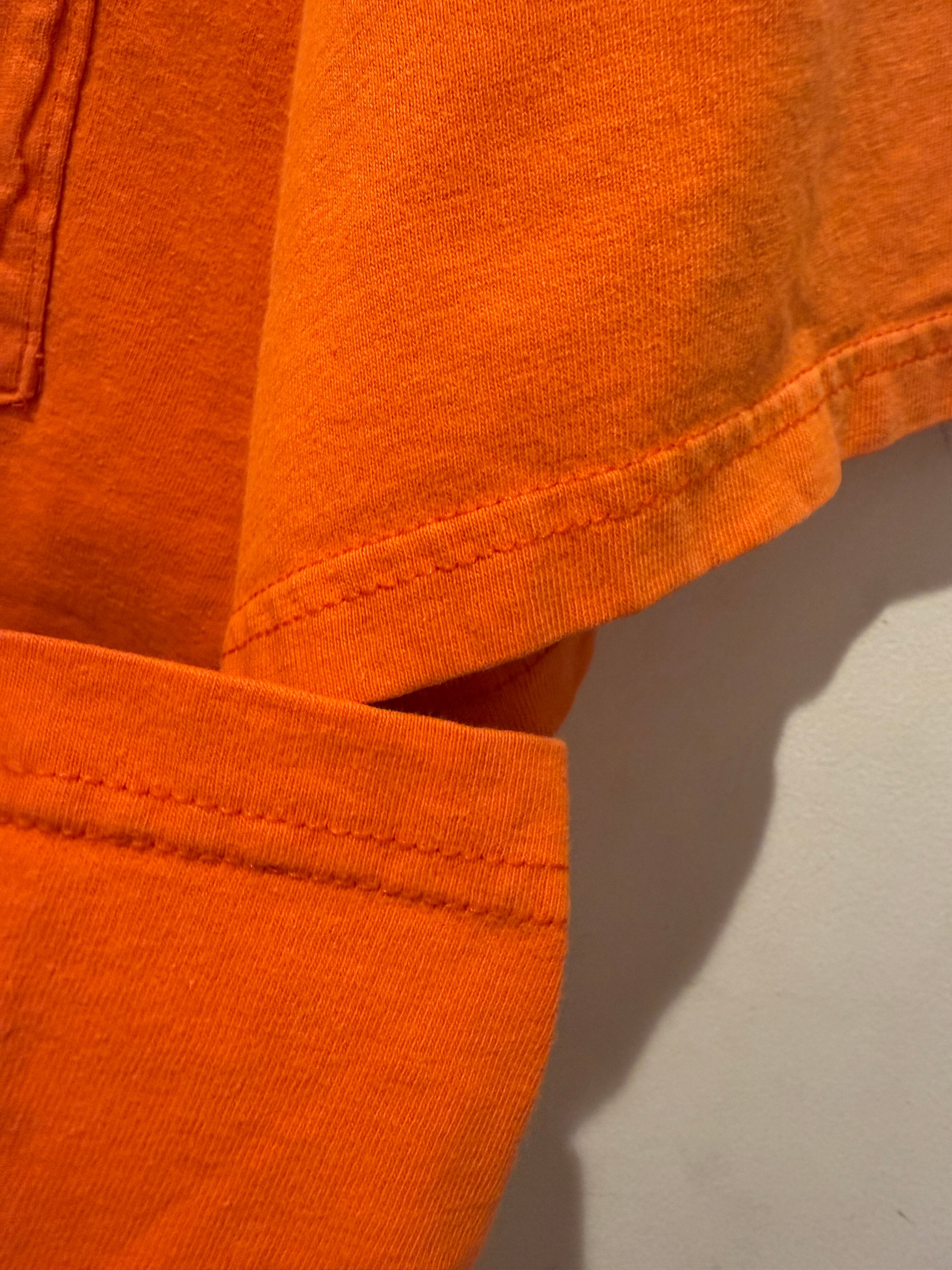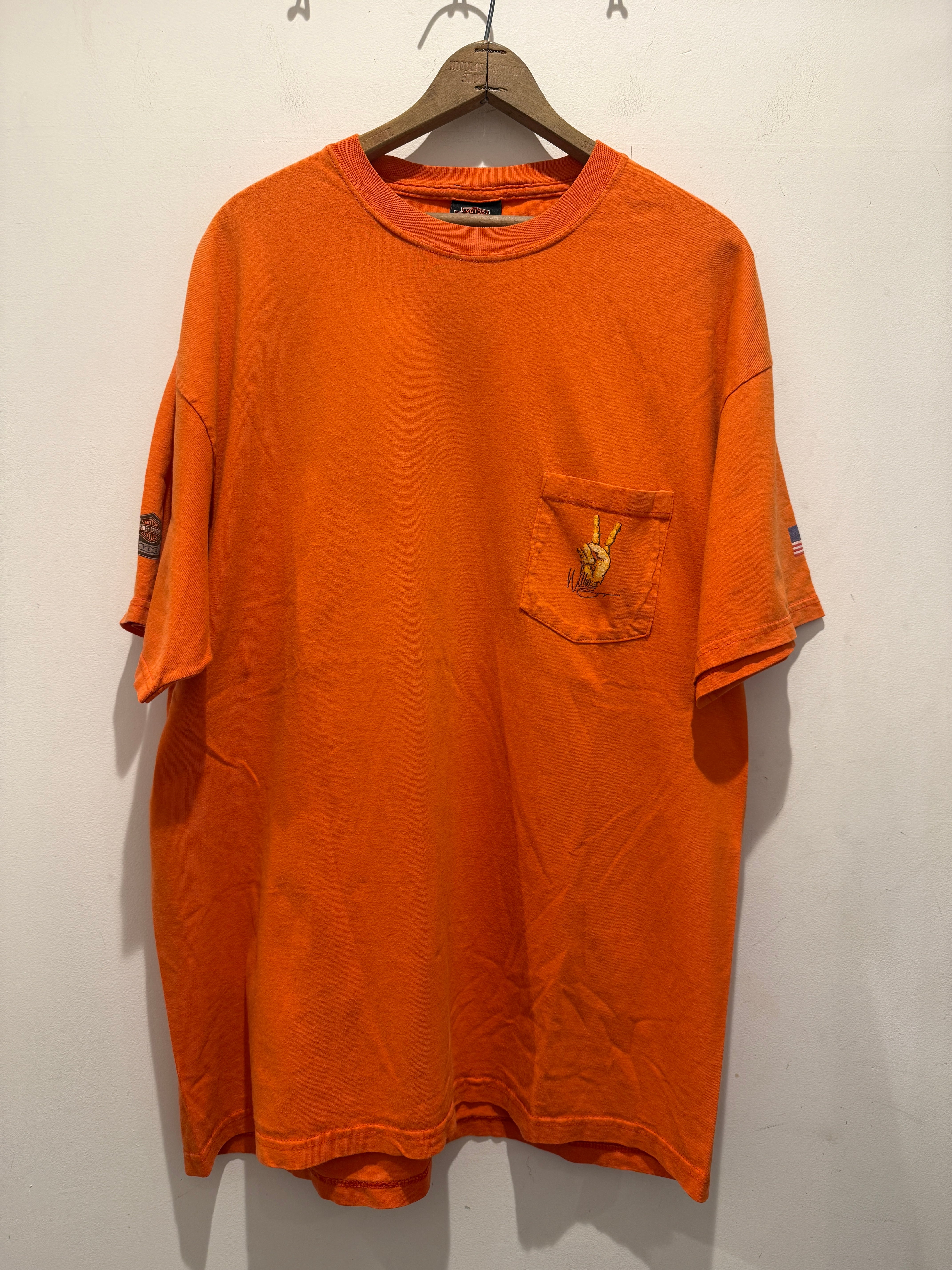 90年代アメリカ製ハーレーダビッドソンのTシャツです。1903年にアメリカのウィスコンシン州ミルウォーキーで設立されたオートバイメーカー(HARLEY-DAVIDSON)通称ハーレーとしてとても有名ですね。こちらは100年記念のTシャツでオレンジボディのポケTタイプとなります。袖、バッグにもプリントが入り良いデザインですね。袖、裾はダブルステッチとなります。少しフェードしたオレンジカラーでボディもヘインズのビーフィーと生地感も良くオススメです。