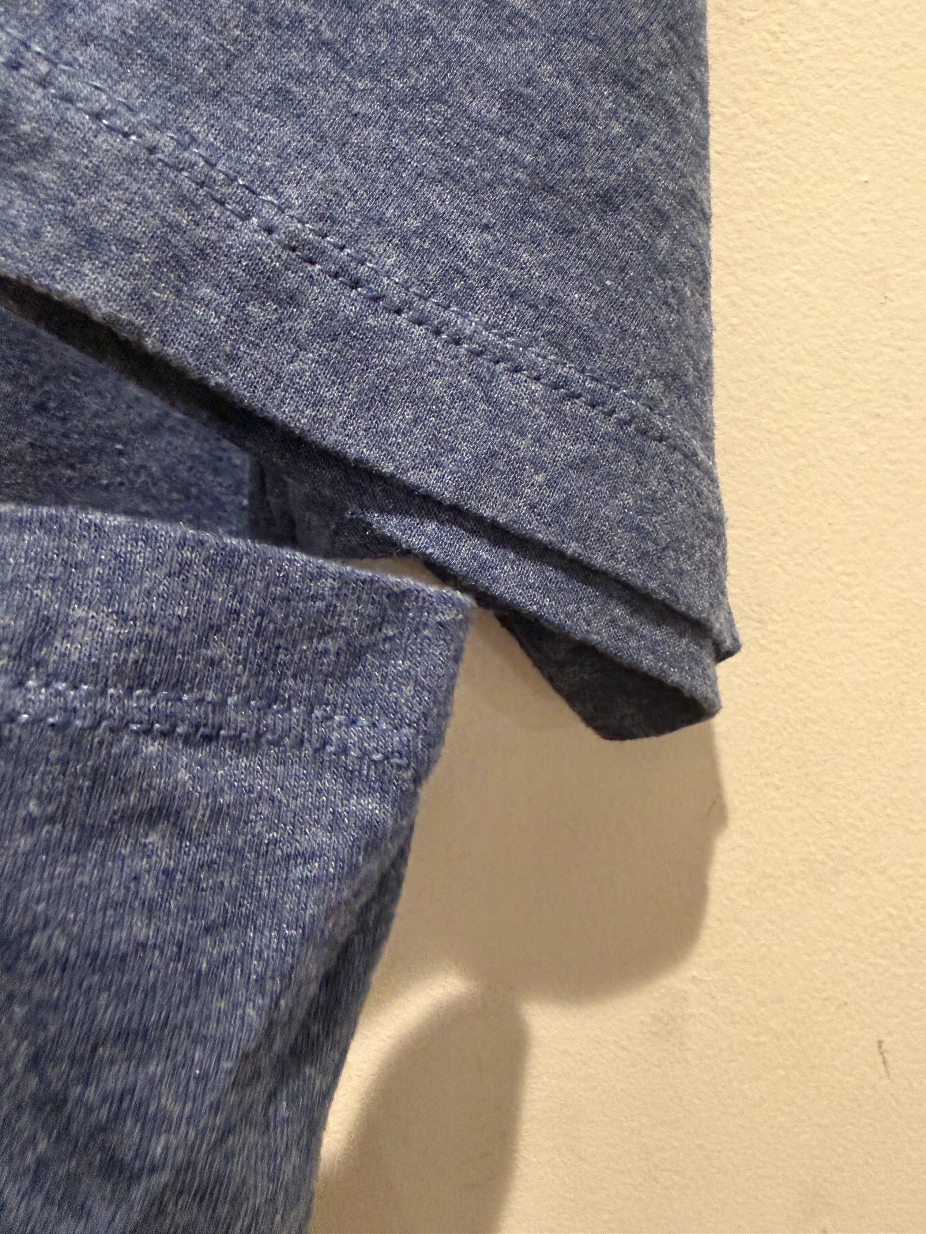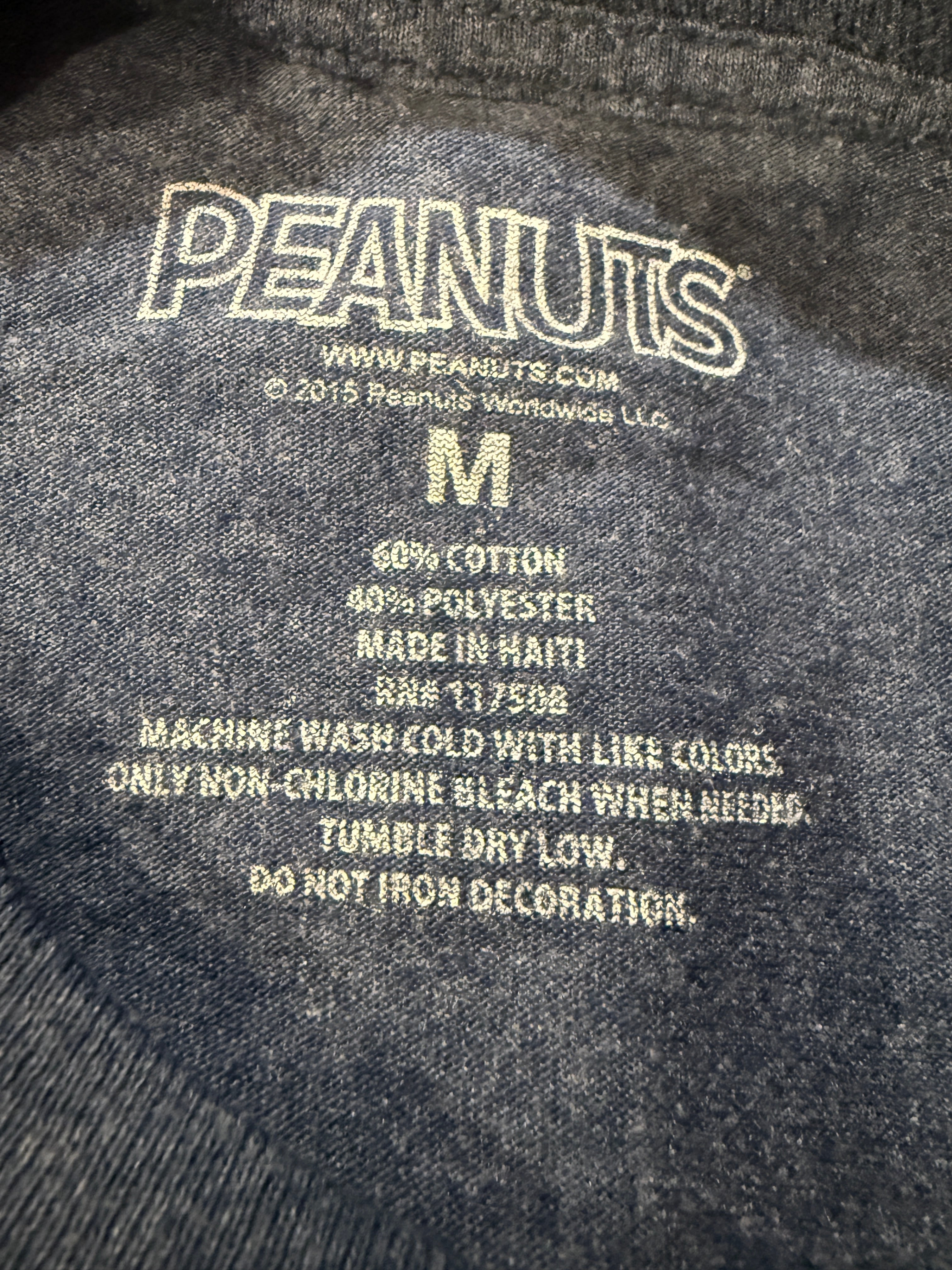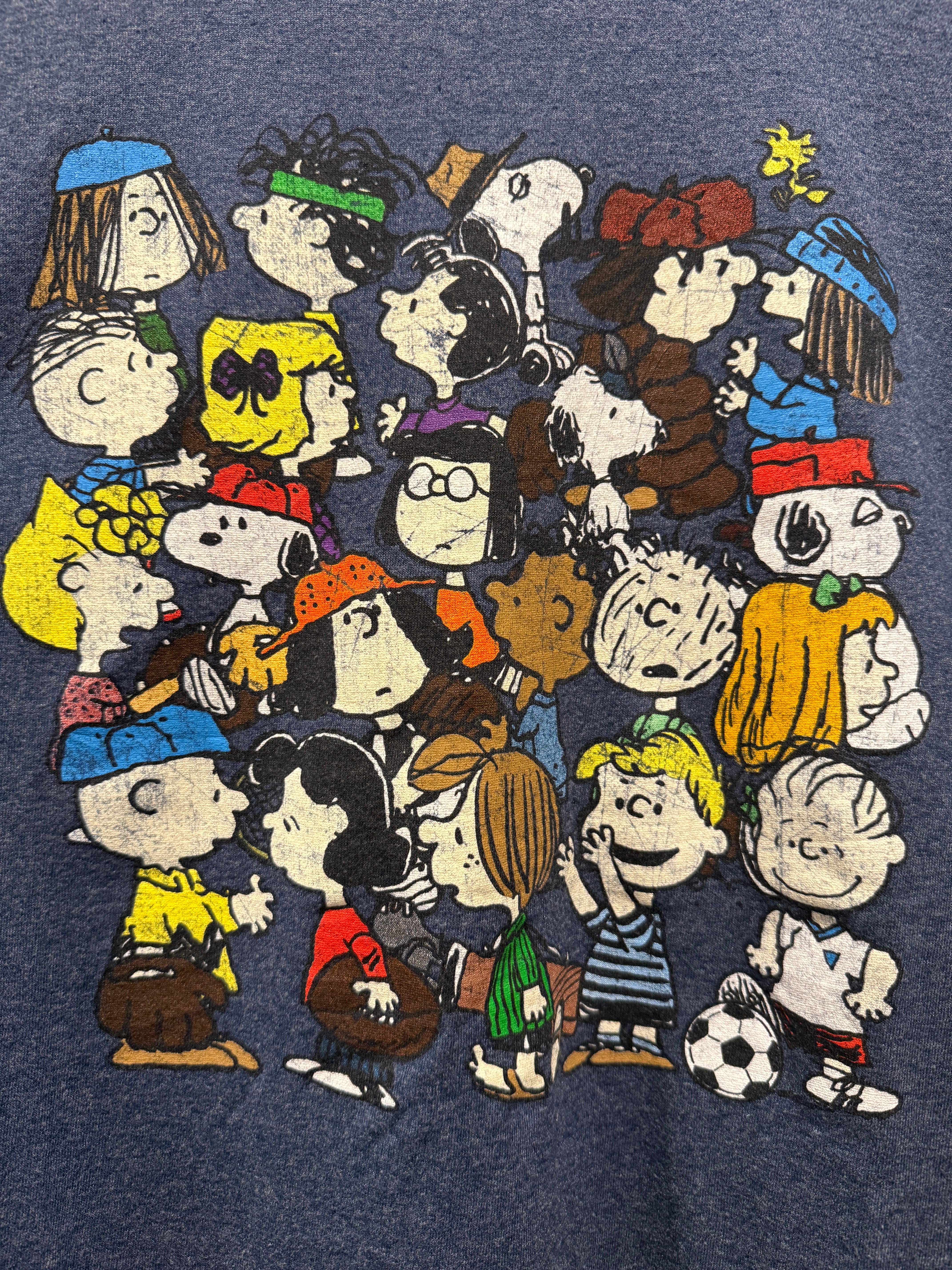2015年ピーナッツのスヌーピーTシャツです。霜降りの様なネイビーボディでピーナッツのキャラクターがプリントされている可愛い1着です。主要キャラはもちろんですがマイナーなキャラクターもデザインされているのがとても良いですね。2015年のコピーライト入りで袖、裾共にダブルステッチとなります。年代は浅いですがデザインも良くユニセックスでオススメなTシャツです。