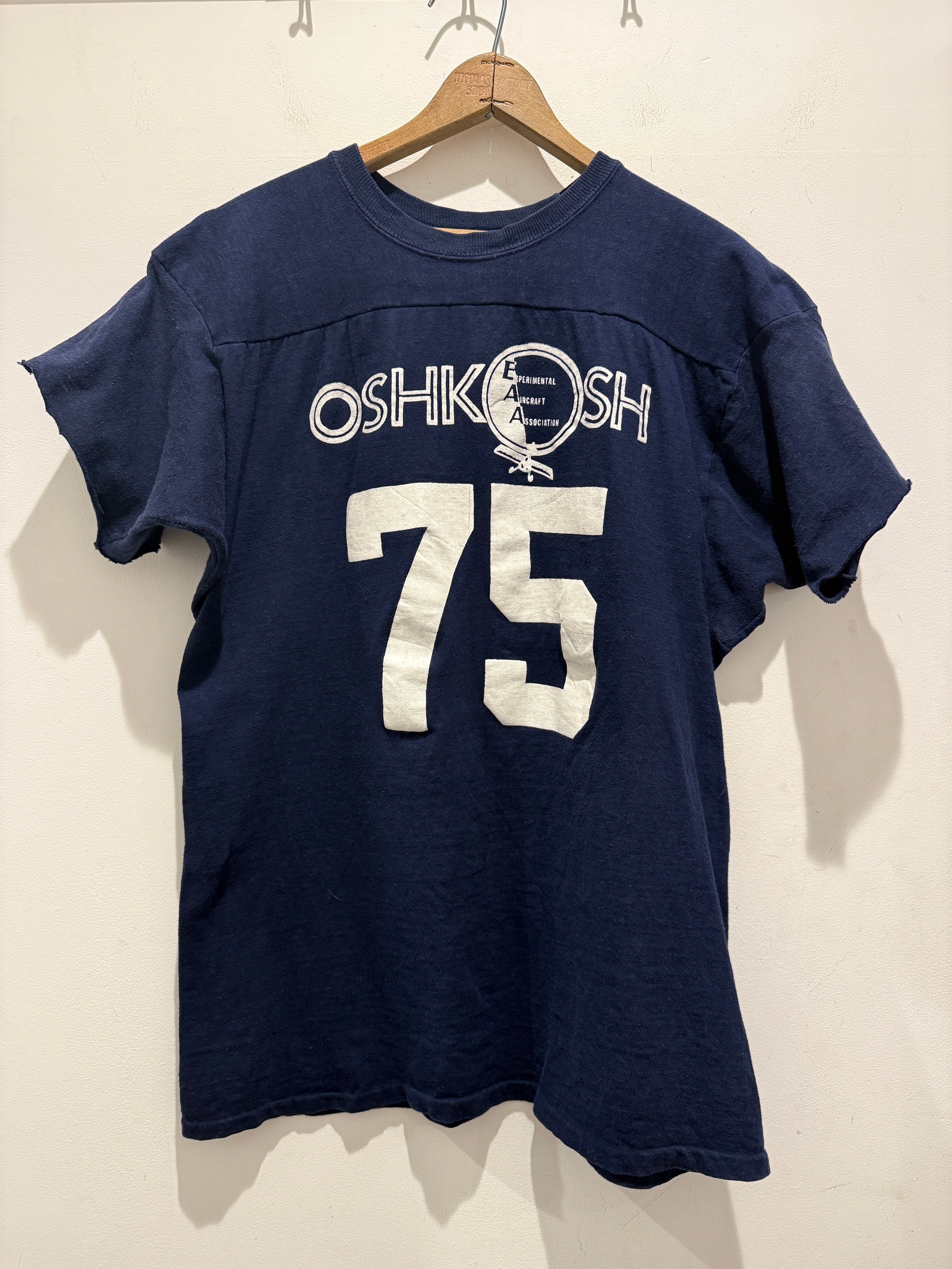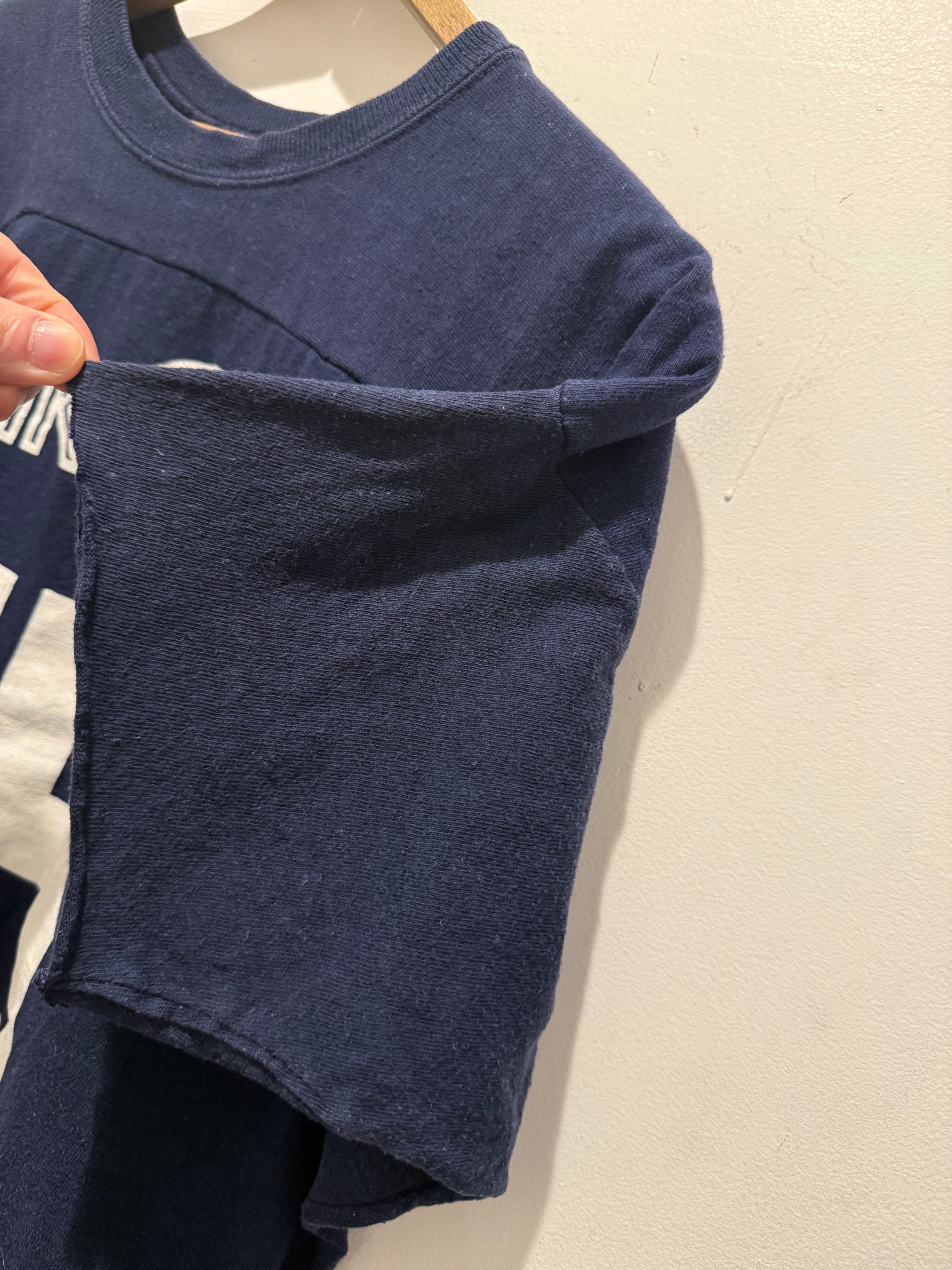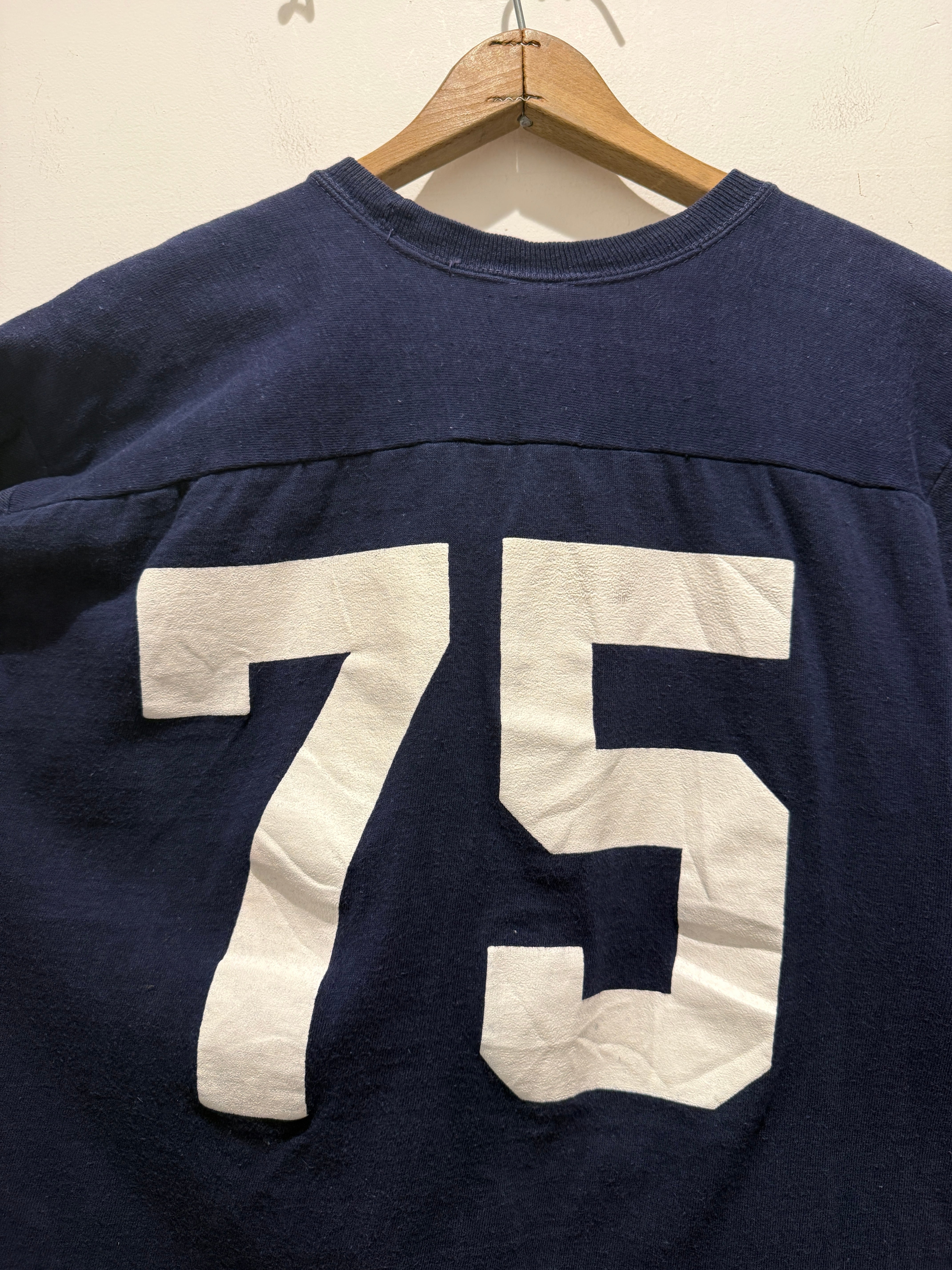 70年代アメリカ製チャンピオンのフットボールTシャツです。ネイビーボディに白のラバープリントとなります。おそらく7分袖のフットボールTが袖をカットオフされていてTシャツの様になっています。生地感もしっかりしているので半袖スウェットとTシャツの間くらいの感覚で着用出来るのも良いですね。プリントのひび割れなども無くコンディションとしては綺麗でオススメです。