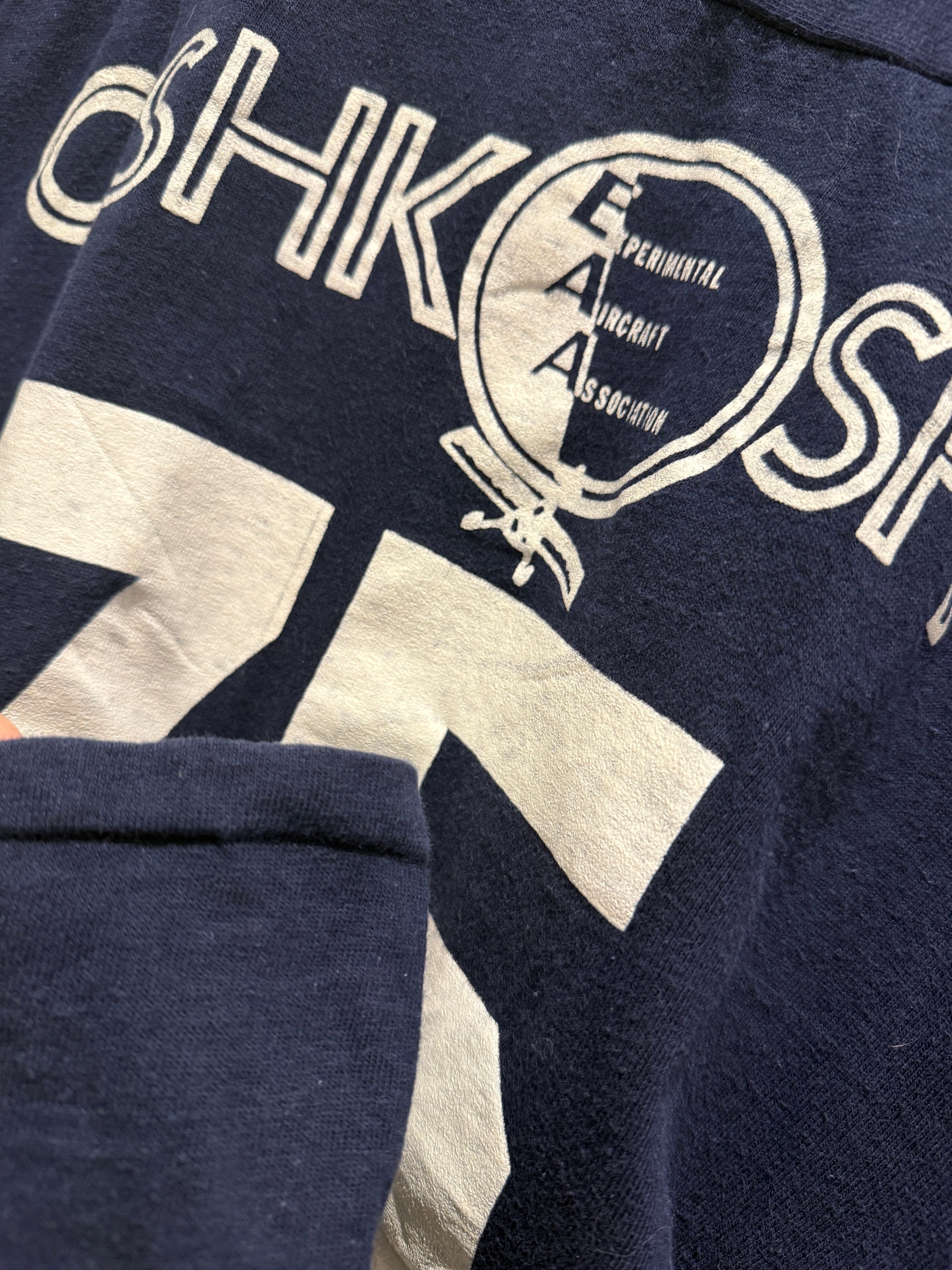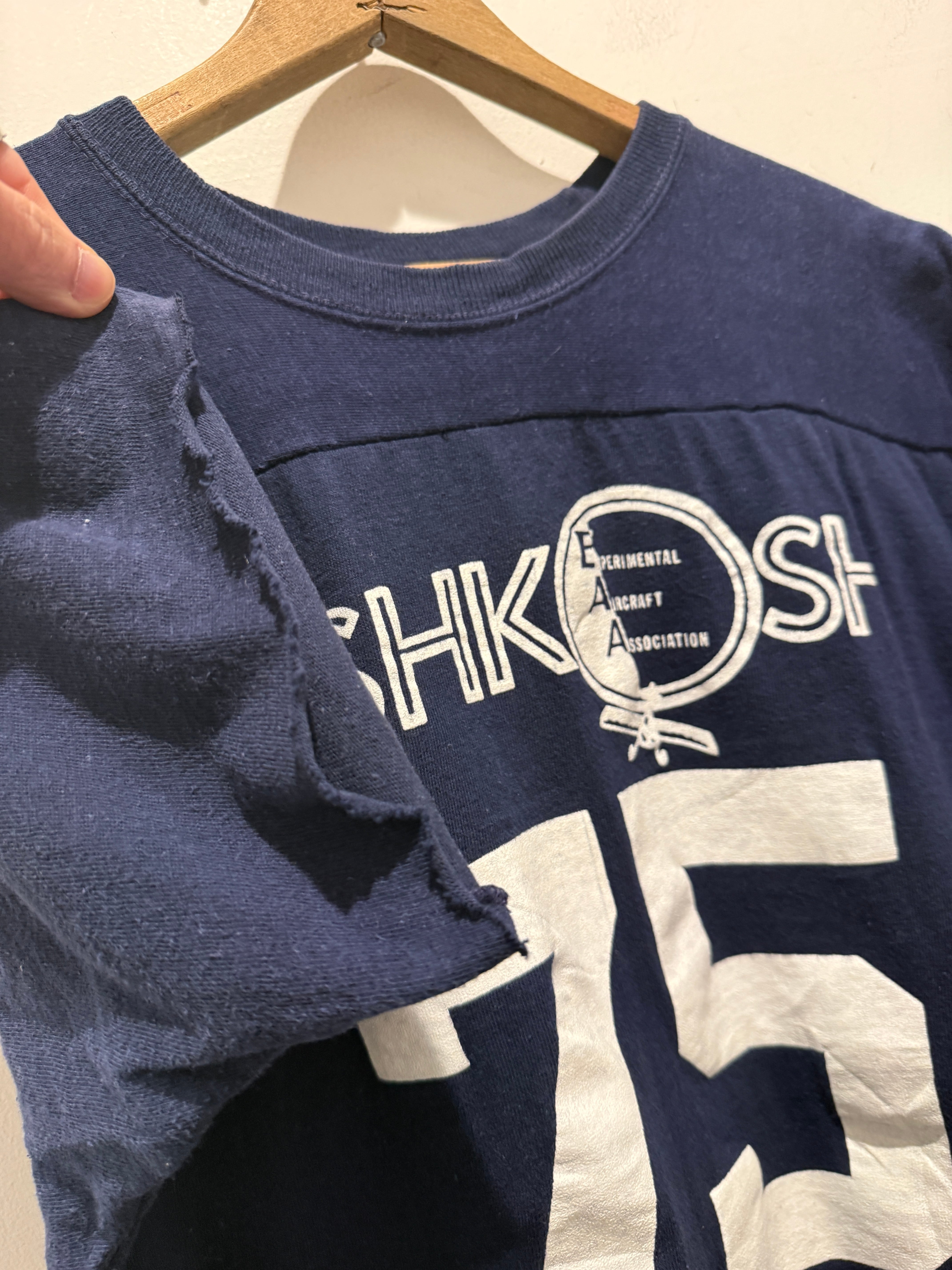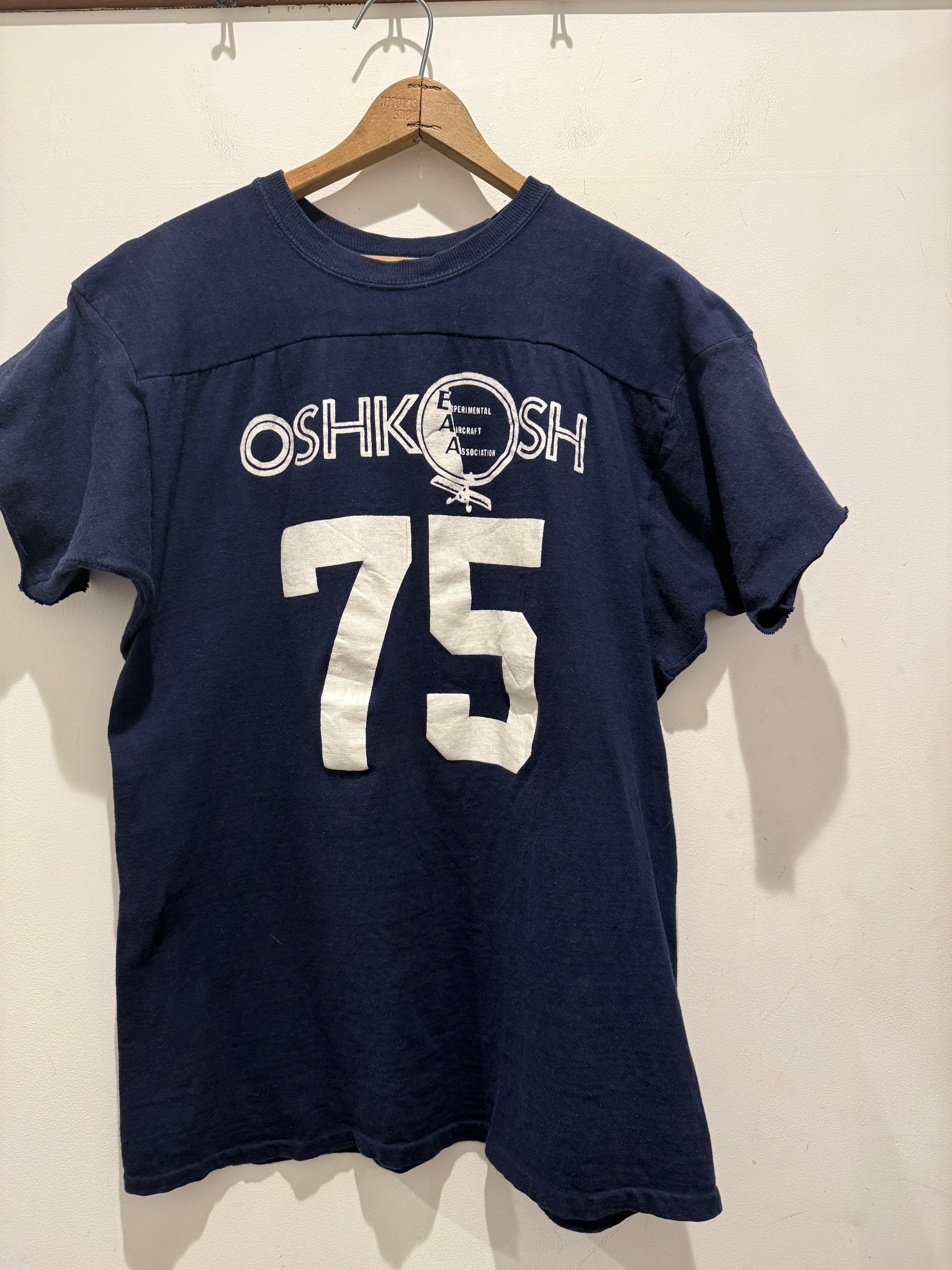 70年代アメリカ製チャンピオンのフットボールTシャツです。ネイビーボディに白のラバープリントとなります。おそらく7分袖のフットボールTが袖をカットオフされていてTシャツの様になっています。生地感もしっかりしているので半袖スウェットとTシャツの間くらいの感覚で着用出来るのも良いですね。プリントのひび割れなども無くコンディションとしては綺麗でオススメです。