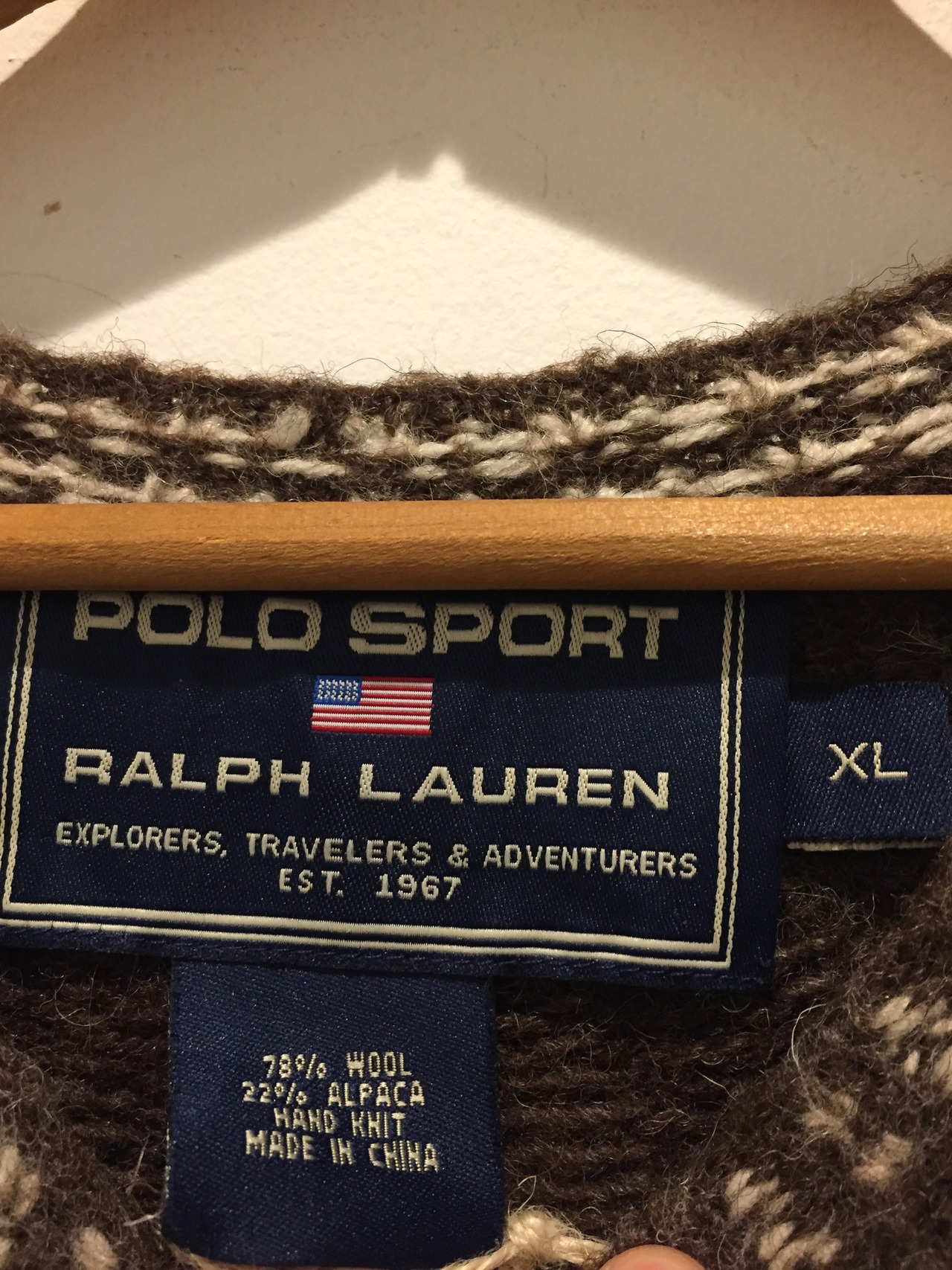 90年代のポロスポーツものでラルフローレンよりも玉数も少なく見つかりづらいですね。こちらは更にUsedで少ないノルディックニットとなります。ナチュラル×ブラウンのカラーリングも良くゆったりしたサイズ感です。また素材にアルパカも入っているので生地感も柔らかく、そして暖かくオススメです。デニムでも良いですし女性はスカートに合わせても良いですね。