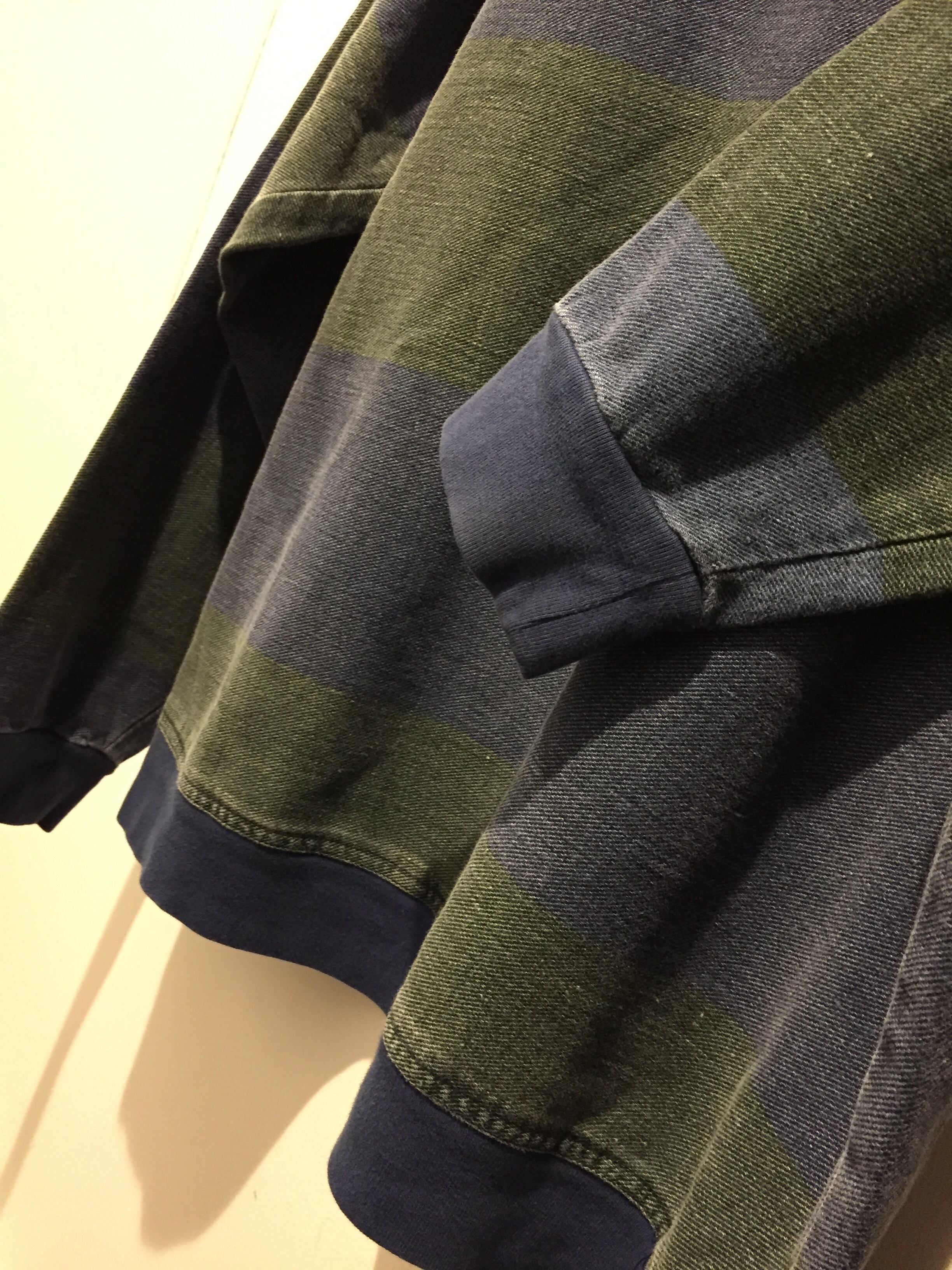 表面がデニム地のような珍しいアイテムです。ブルー×グリーンの太ピッチボーダーで胸にはワッペンが付きシンプルですがオシャレですね。裏地は薄い起毛のような感じで着用しやすくもなっています。90年代らしいゆったりしたサイズ感でアメリカ製というのも嬉しいポイントですね。