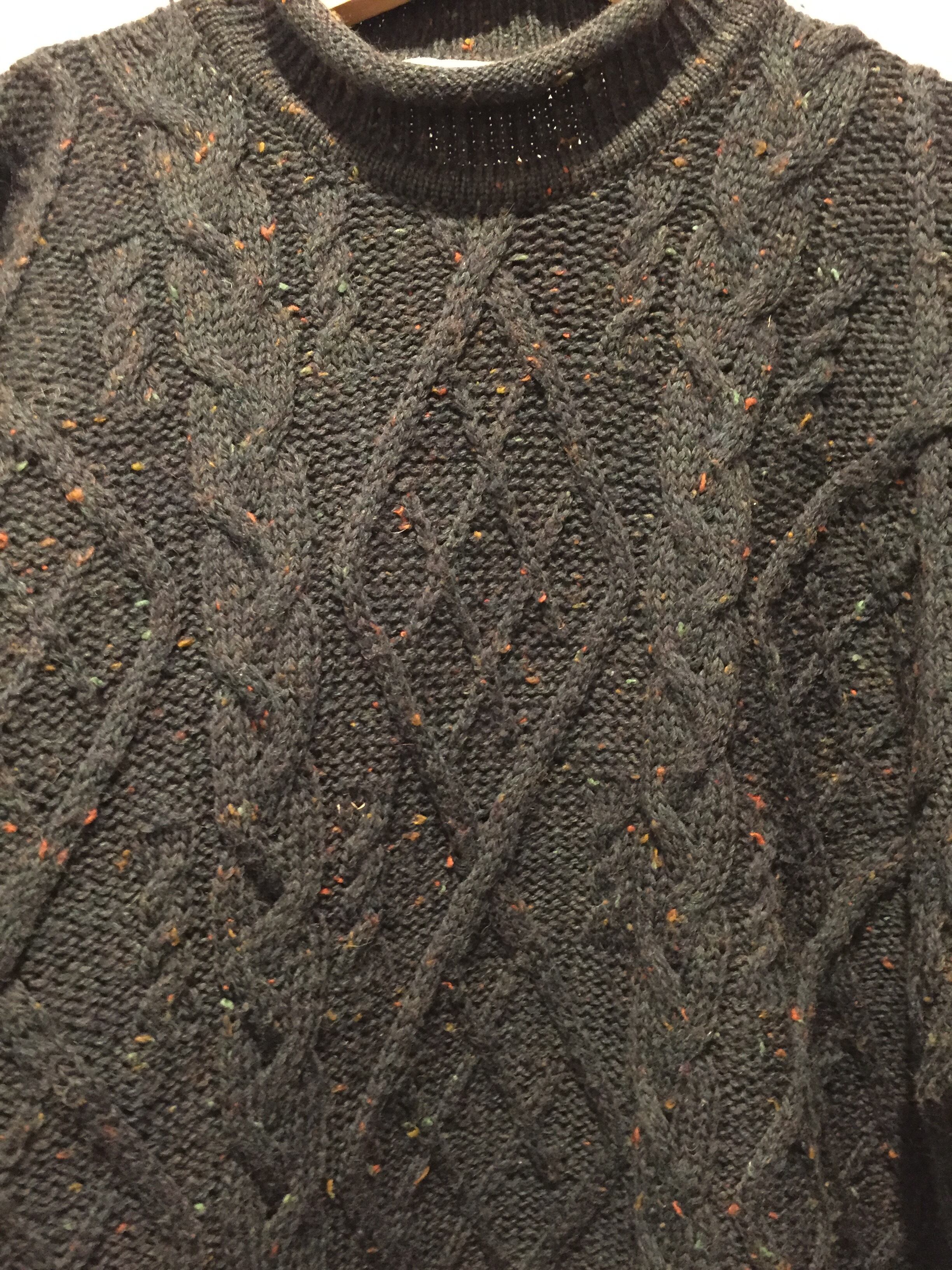 カラーはダークグリーンでネップも入ります。アイボリーカラーが定番ですがこのカラーリングもなかなか見かけなく2着目などにもオススメです。首元はロールネックで暖かさもありつつオシャレですね。肩は落ち感もありリブもすぼまっていなく着用した時のシルエットが良い感じです。女性が大きめに着ても良いですね。