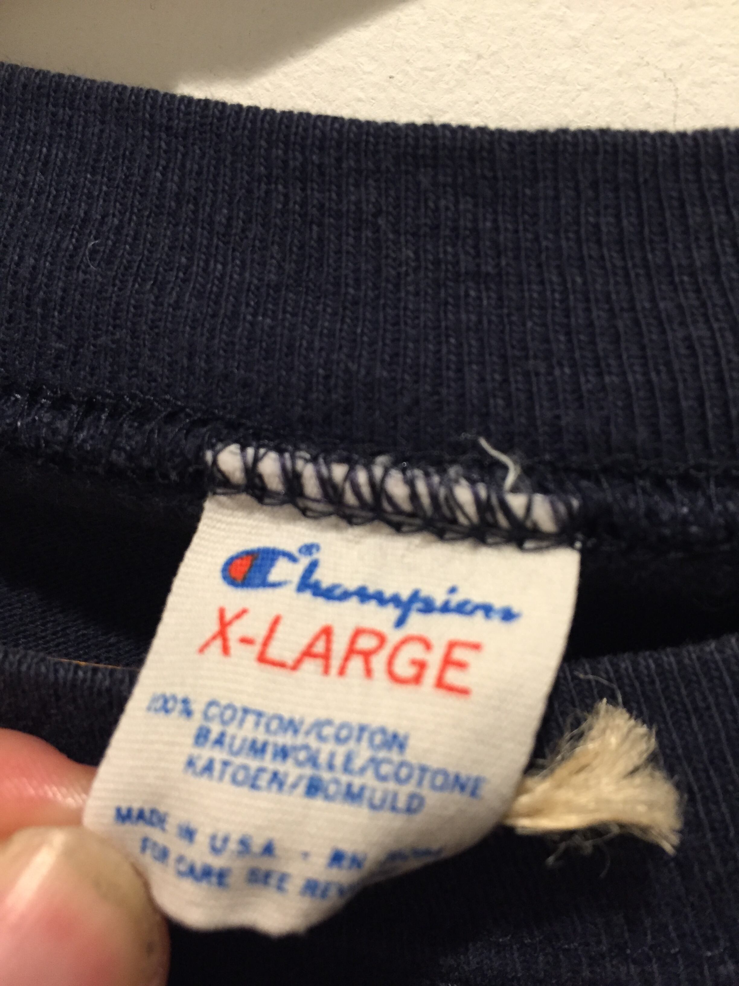 トリコタグが付くアメリカ製のチャンピオンでコットン100%です。カラーはネイビーです。100%コットンのチャンピオンのTシャツは作りが小さめなのでXLは需要があるサイズ感です。袖にプリントが付くのも珍しくフロントの下がる感じのカレッジプリントもかっこいいですね。