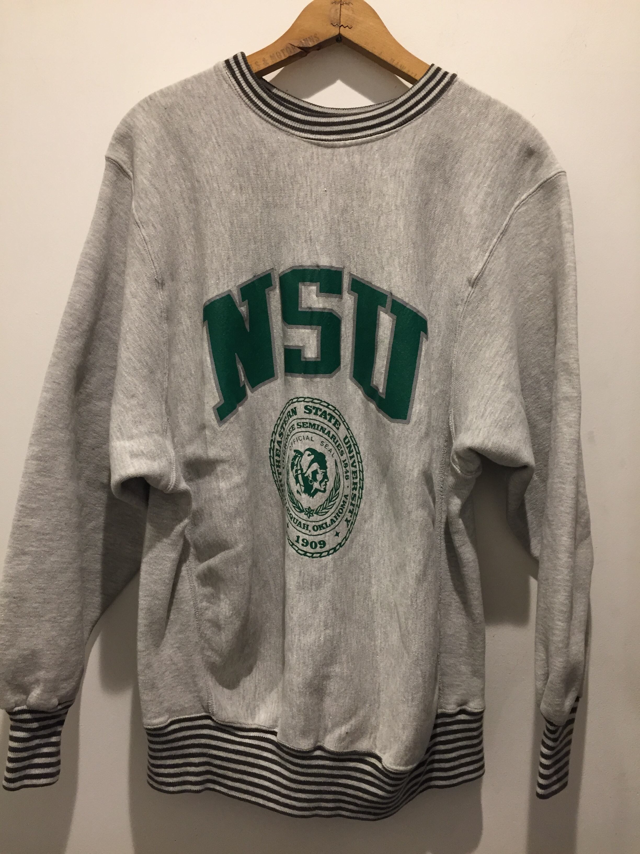 90年代アメリカ製のカレッジスウェットです。カラーはグレーです。90年代のアメリカ製でチャンピオンのリバースウィーブと同じ作りをしています。ただ変わっているのがリブがボーダーになっています。カレッジプリントでインディアンヘッドがデザインされているのもかっこいいですね。