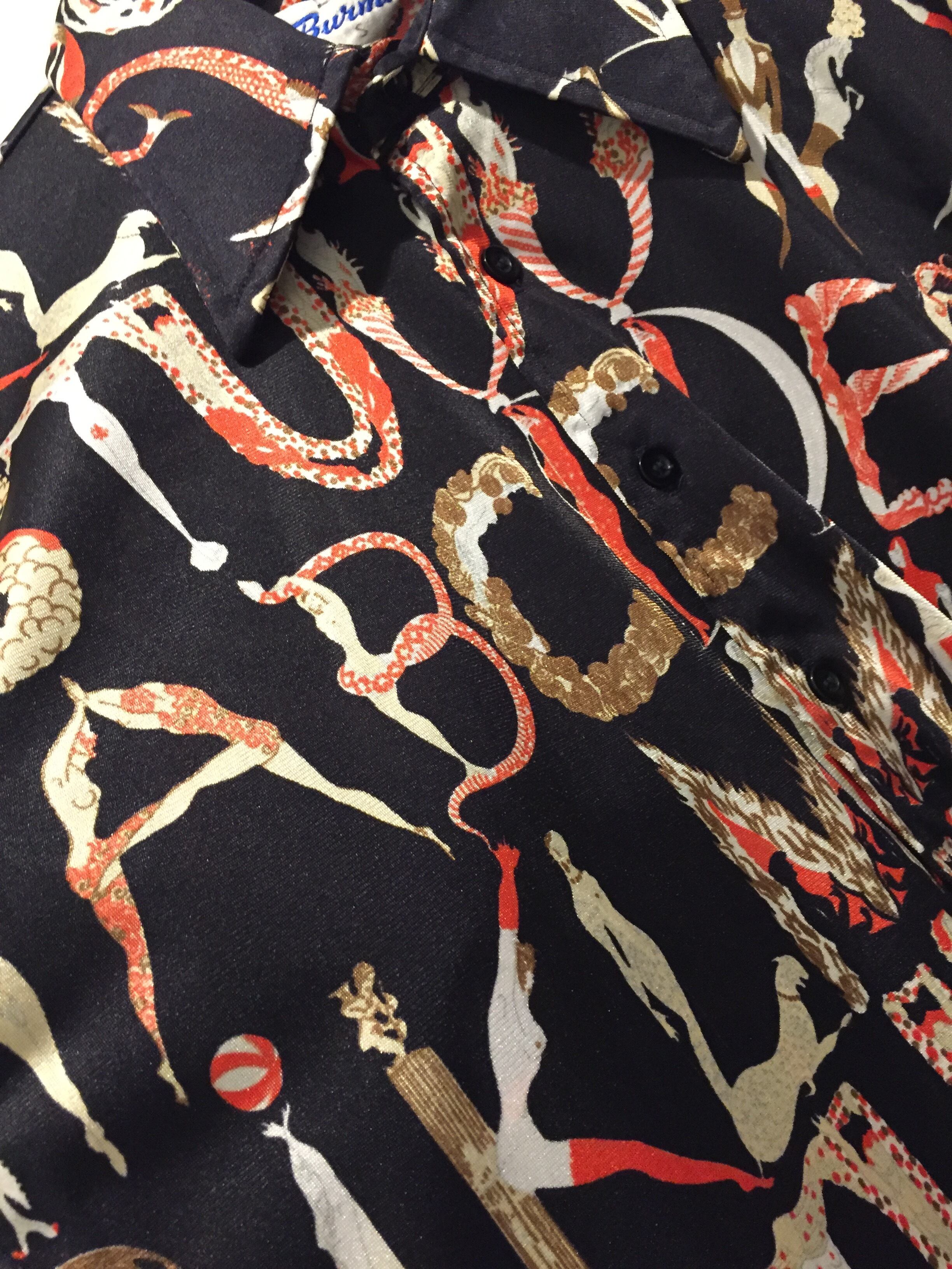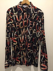 襟が大きめでポリエステル素材の70年代らしいシャツです。カラーはブラックボディでABC...の文字がボーダー状にデザインされているのですがよく見るとスペルが人モチーフになっています。このようなデザインのは無く古着ならではの1着で人と被りたくない方へもオススメです。