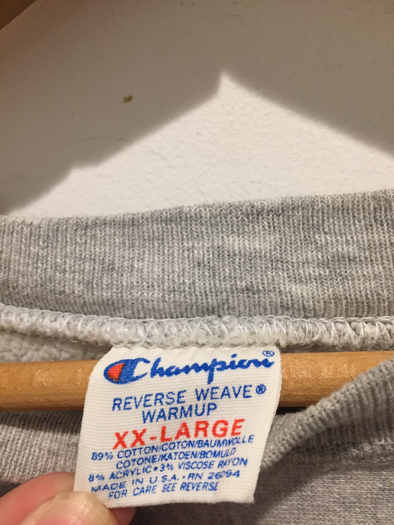 80年代のプリントタグが付くアメリカ製チャンピオンリバースウィーブです。こちらは好きな方も多い目無しで袖にも付かないタイプなので本当の無地です。リブとも若干ですがツートンになっているのもポイントです。首やリブ先の擦れが無いのもコンディションが良くてオススメです。XXLの大きめサイズなのも良いですね。