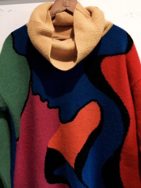 ビビットカラーのクレイジーパターンで人の絵柄のアートがオシャレな1着です。素材もラムウール、アンゴラが入っており、なめらかで着心地も抜群に良いです。