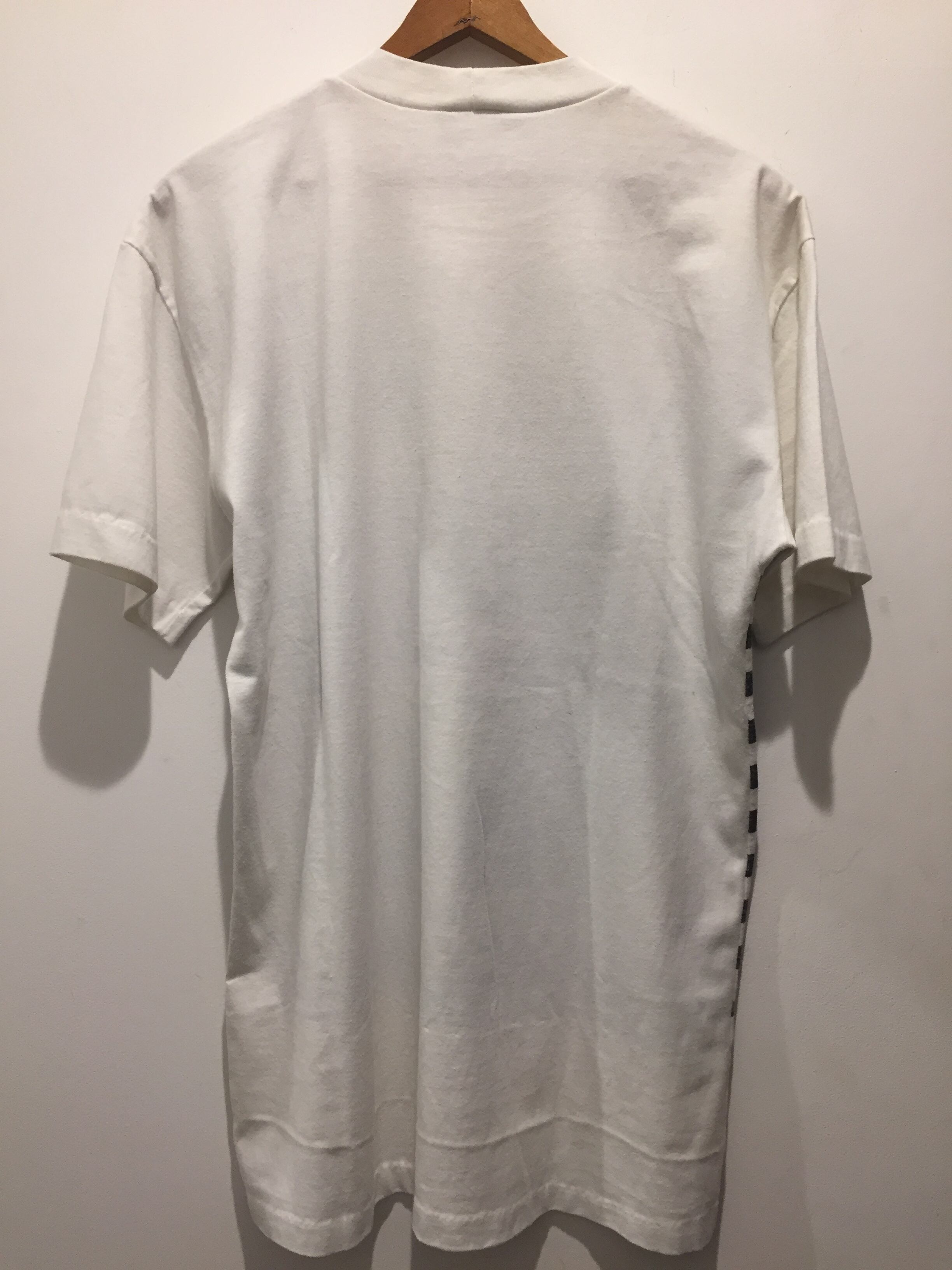 ボディカラーはホワイトです。フロントに英字新聞のデザインがされていてモノトーンですがオシャレな1着です。総柄のニットで同じデザインは何回か見たことがありますがTシャツバージョンはなかなか無いですね。サイズ表記がSですが少し大きめな作りとなっています。袖、裾共にシングルステッチです。