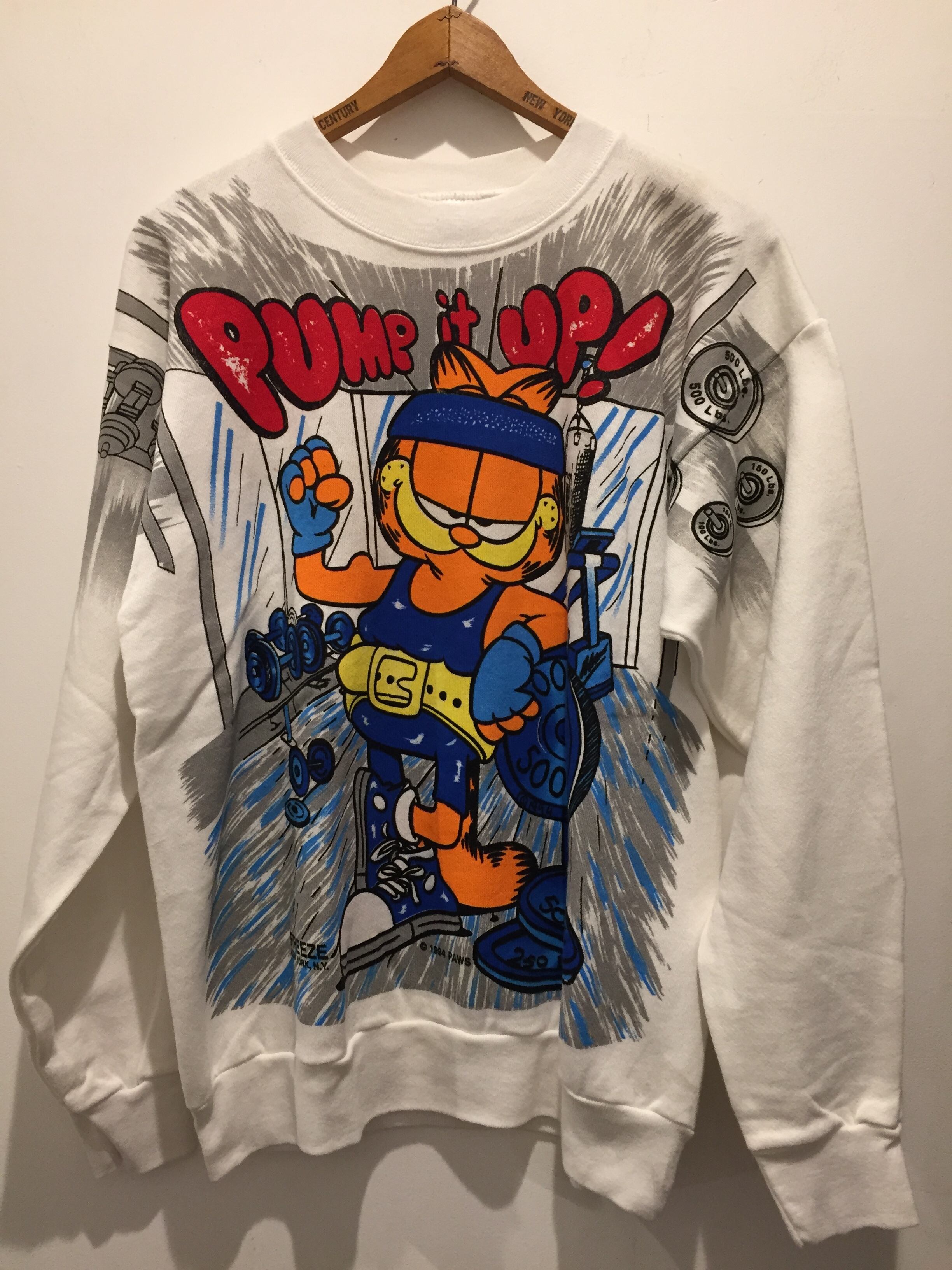 90年代ガーフィールドのスウェットです。アメリカで1978年に登場したガーフィールド。アメリカだけで無く全世界でも人気がありますね。両面プリントのデザインでバッグには「I'LL START TOMORROW」(明日から始めます)とフロントのプリントは想像していただけとストーリーせいもあるのが良いですね。白ボディですがコンディションがとても良く裏起毛もまだフカフカでデッドストックに近く綺麗な1着です。