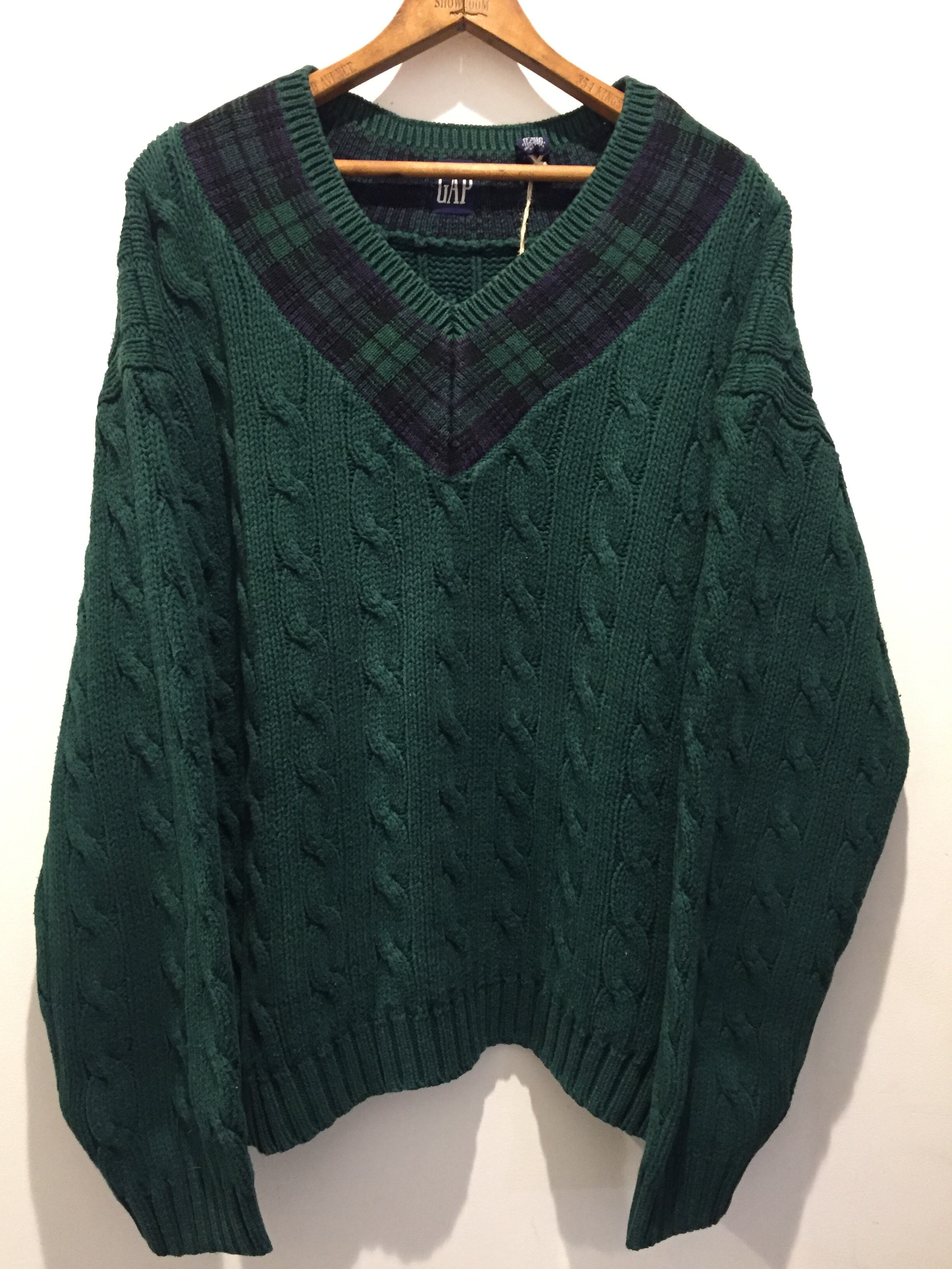 カラーはグリーンです。90年代のOLD GAPはデザインも良く質の良いものが多くありNEXTヴィンテージとしても注目を浴びていますね。こちらのデザインはケーブル編みに首元はVネックでブラックウォッチとお洒落な1着です。コットン素材なのでチクチクしないのも着やすくて良いですね。インナーにクルーネックTやBDシャツをレイヤードしてもオススメです。