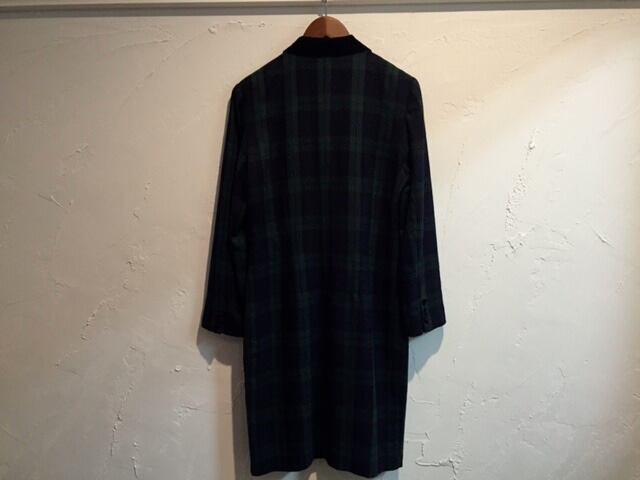 レディースのブラックウォッチロングジャケットです。襟、ポケットの淵、ボタンにベロアも使用していて細かいところもこだわりがあるジャケットです。表がベロアボタン3つ、下の方は裏にボタンが隠れていてすっきり見えるようになっています。